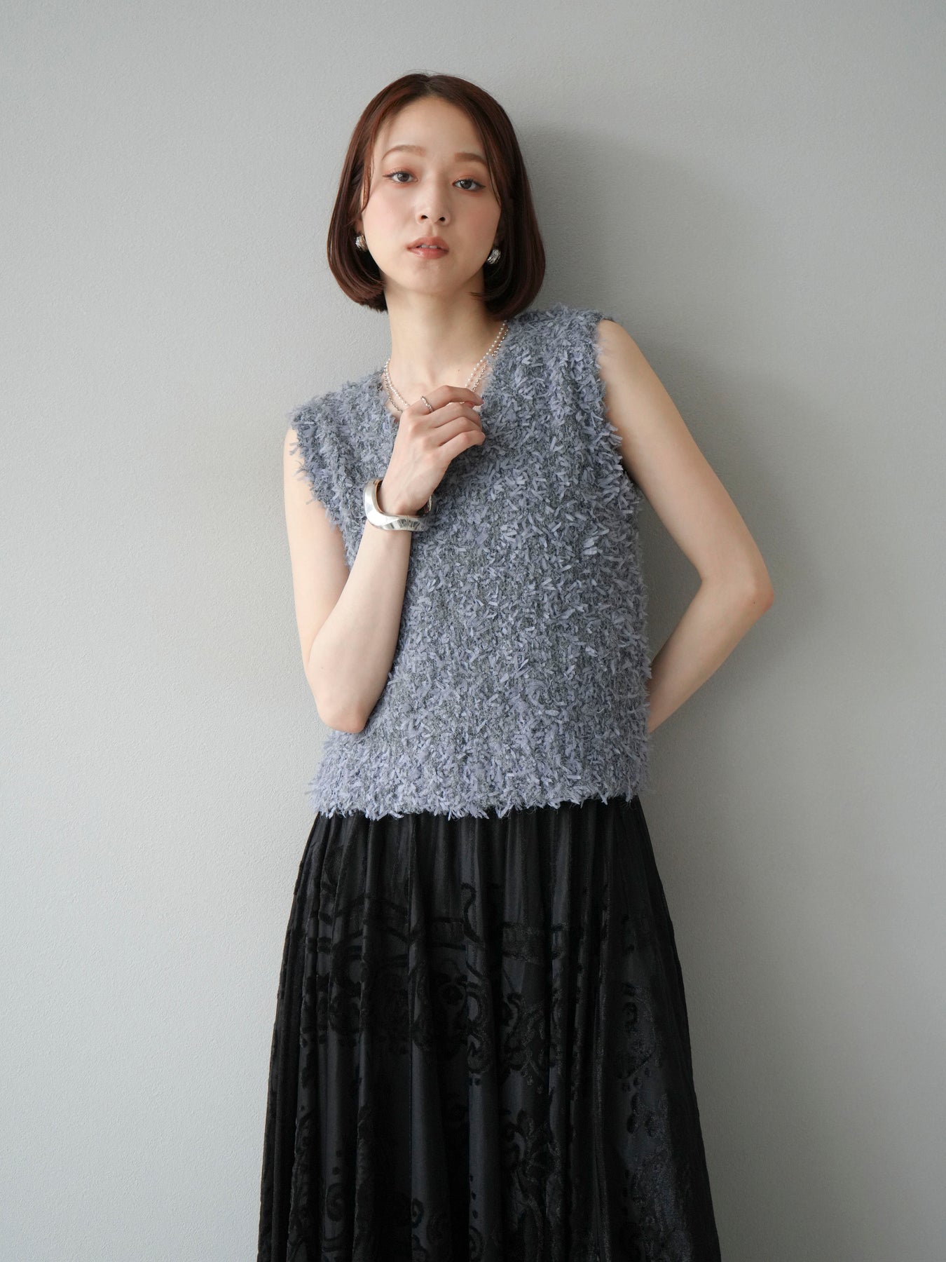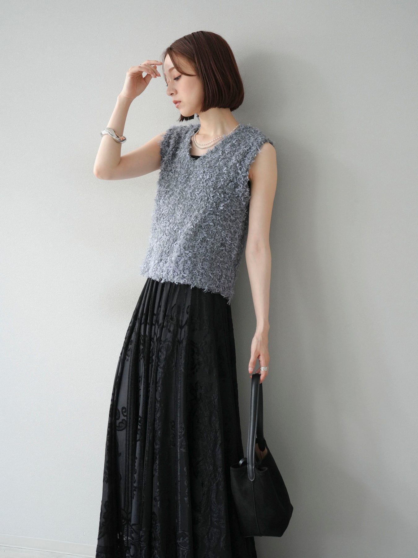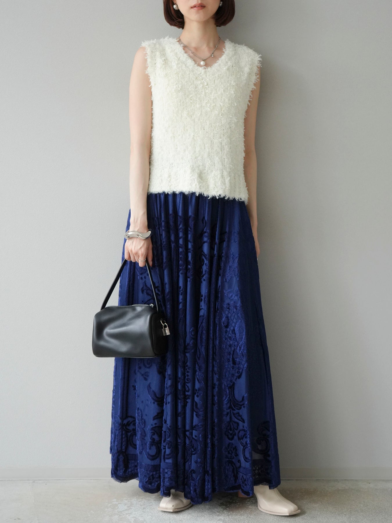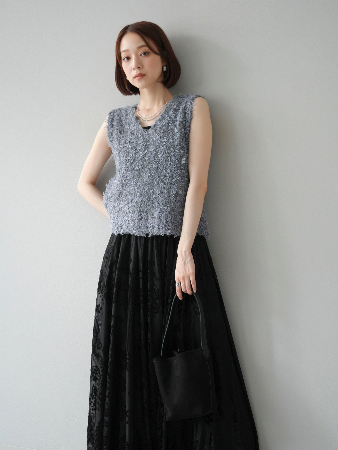[SET]テープヤーンフリンジニットベスト+アンティーク柄フロッキーマキシスカート(2set)