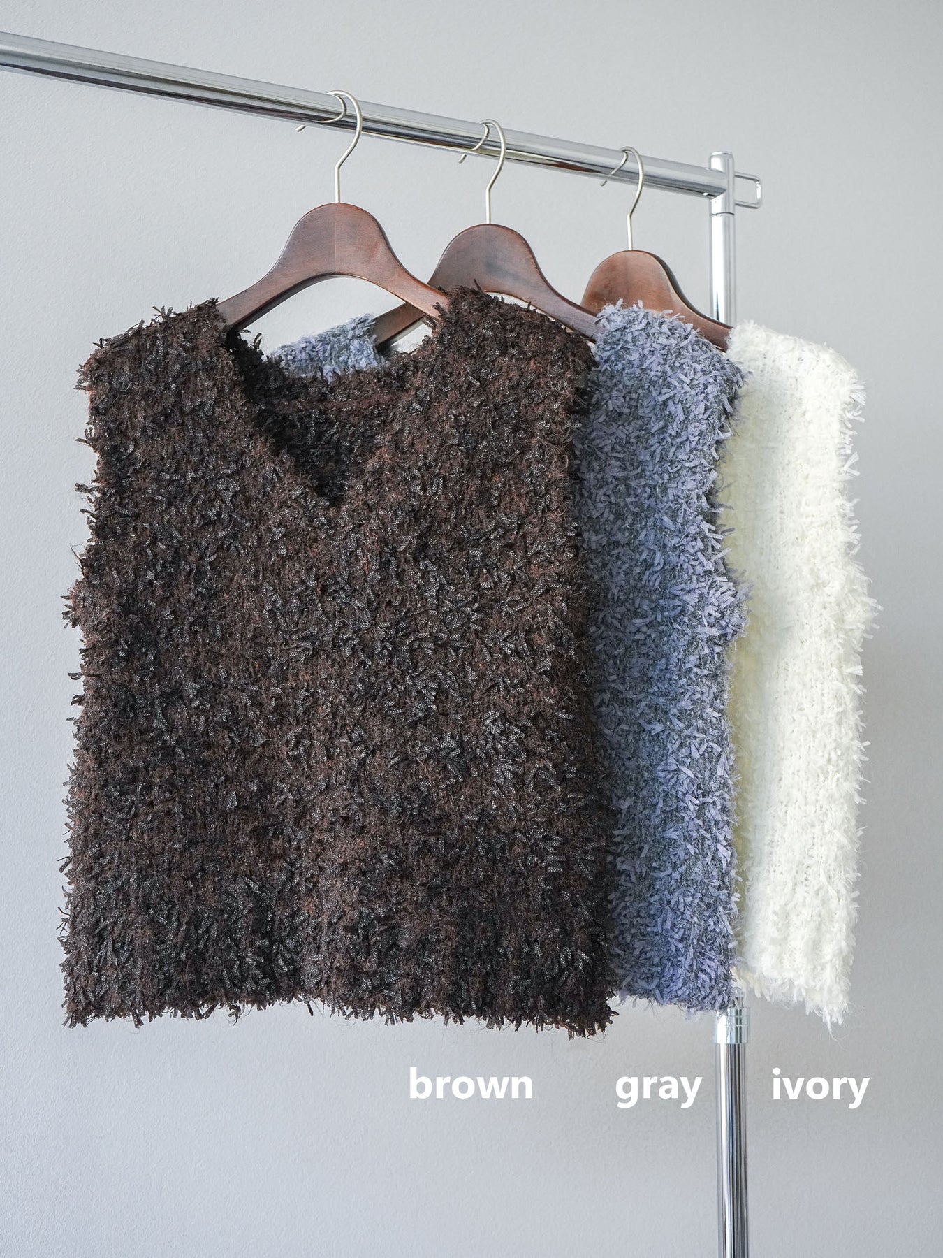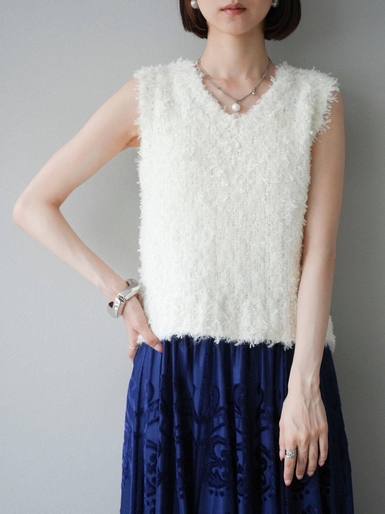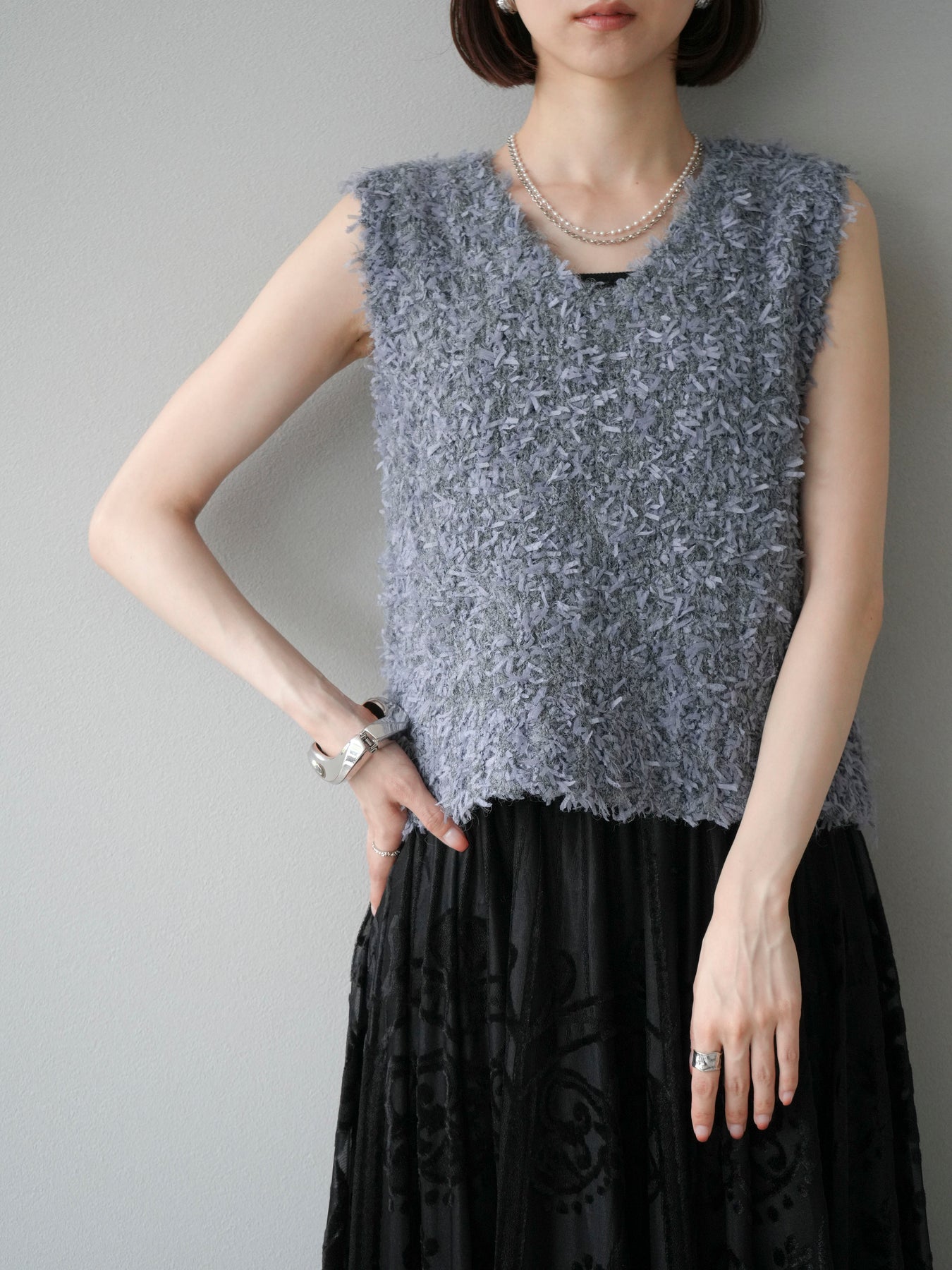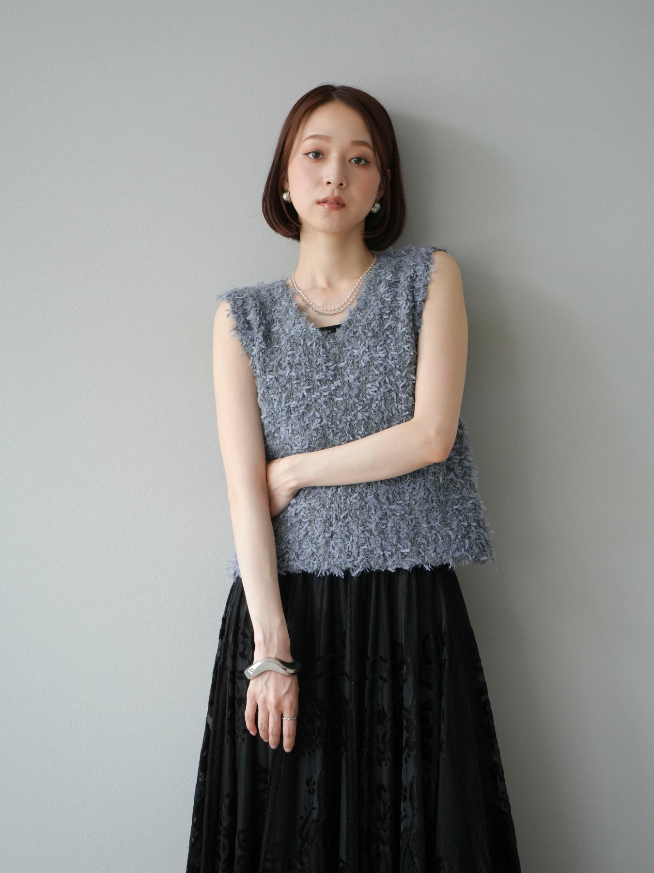 ざっくりと編み立てたテープヤーンにフリンジをミックスした、表情豊かなニットベスト。凹凸感のある編地が存在感を放ち、シンプルなスタイリングに取り入れるだけでトレンド感のある着こなしを演出します。程よい丈感でパンツにもスカートにも合わせやすく、シャツやカットソーとのレイヤードスタイルにも最適。軽やかな着心地でシーズンを通して活躍し、コーディネートに立体感とこなれ感をプラスしてくれる万能アイテムです。 ※ボトムス、キャミソール(インナー)以外の商品は一律でインナーは付属していません。