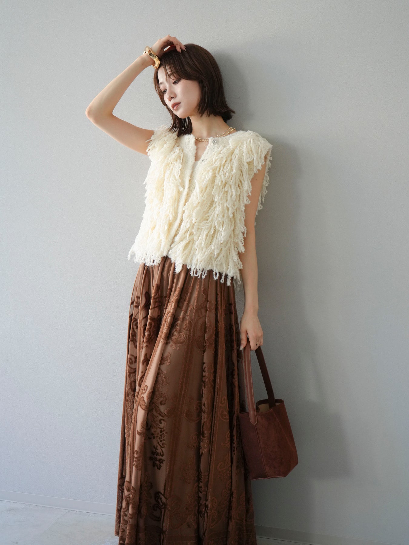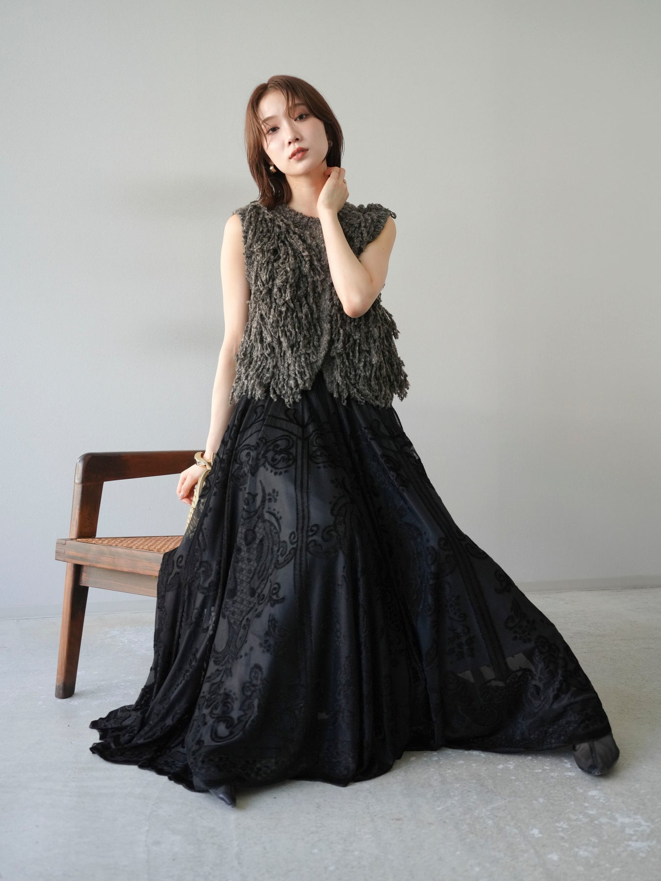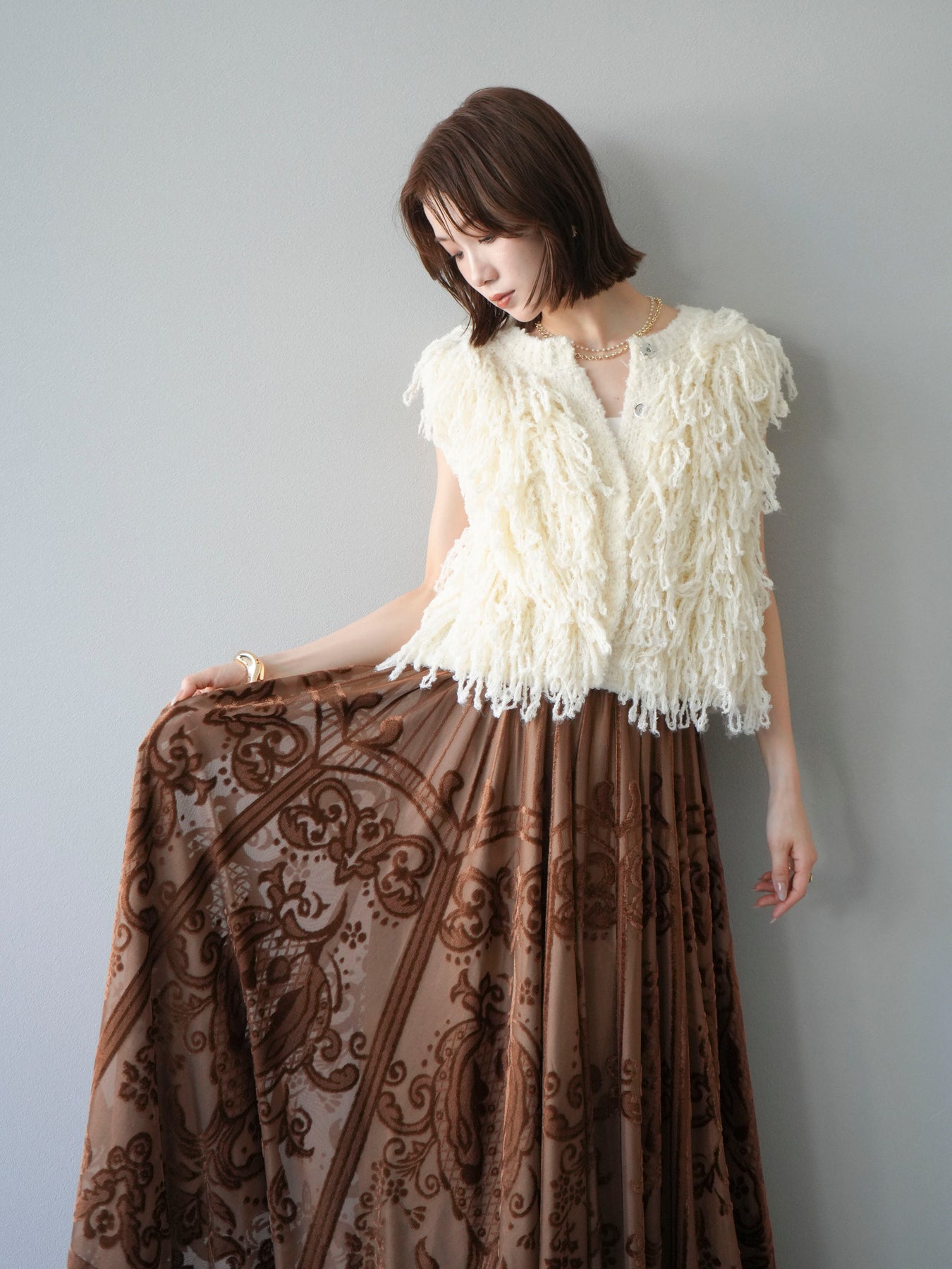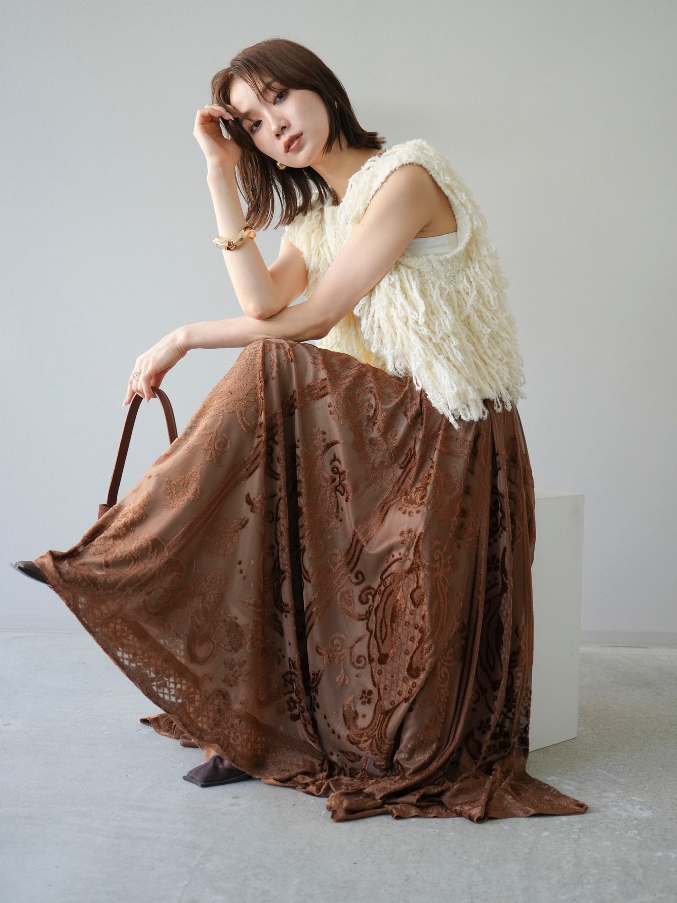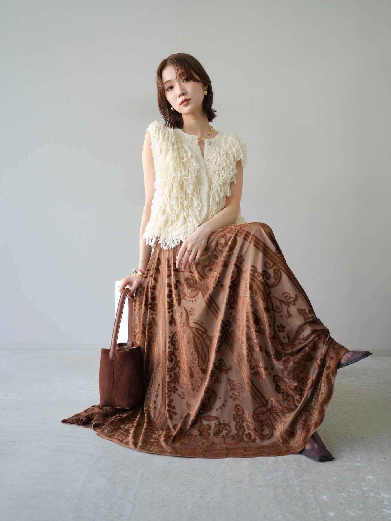 [SET]フリンジループニットベスト+アンティーク柄フロッキーマキシスカート(2set)