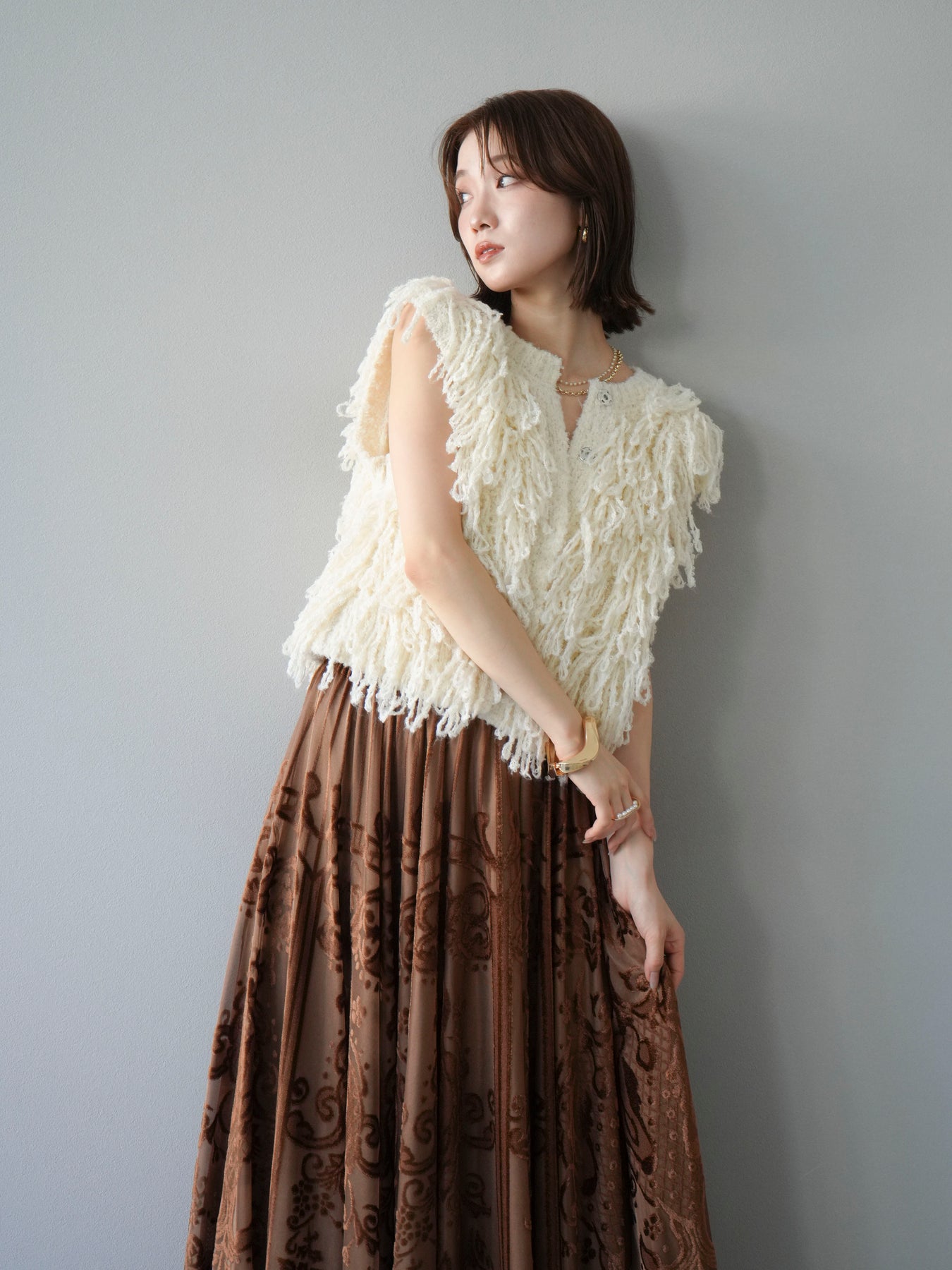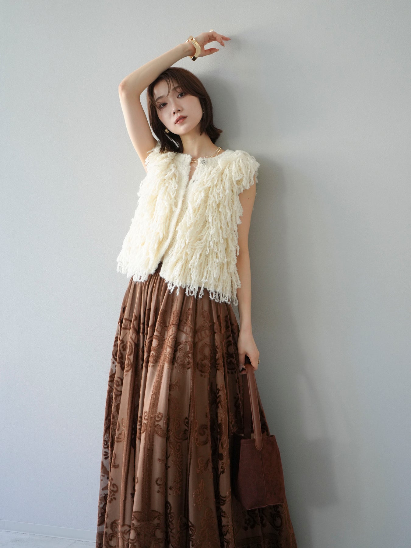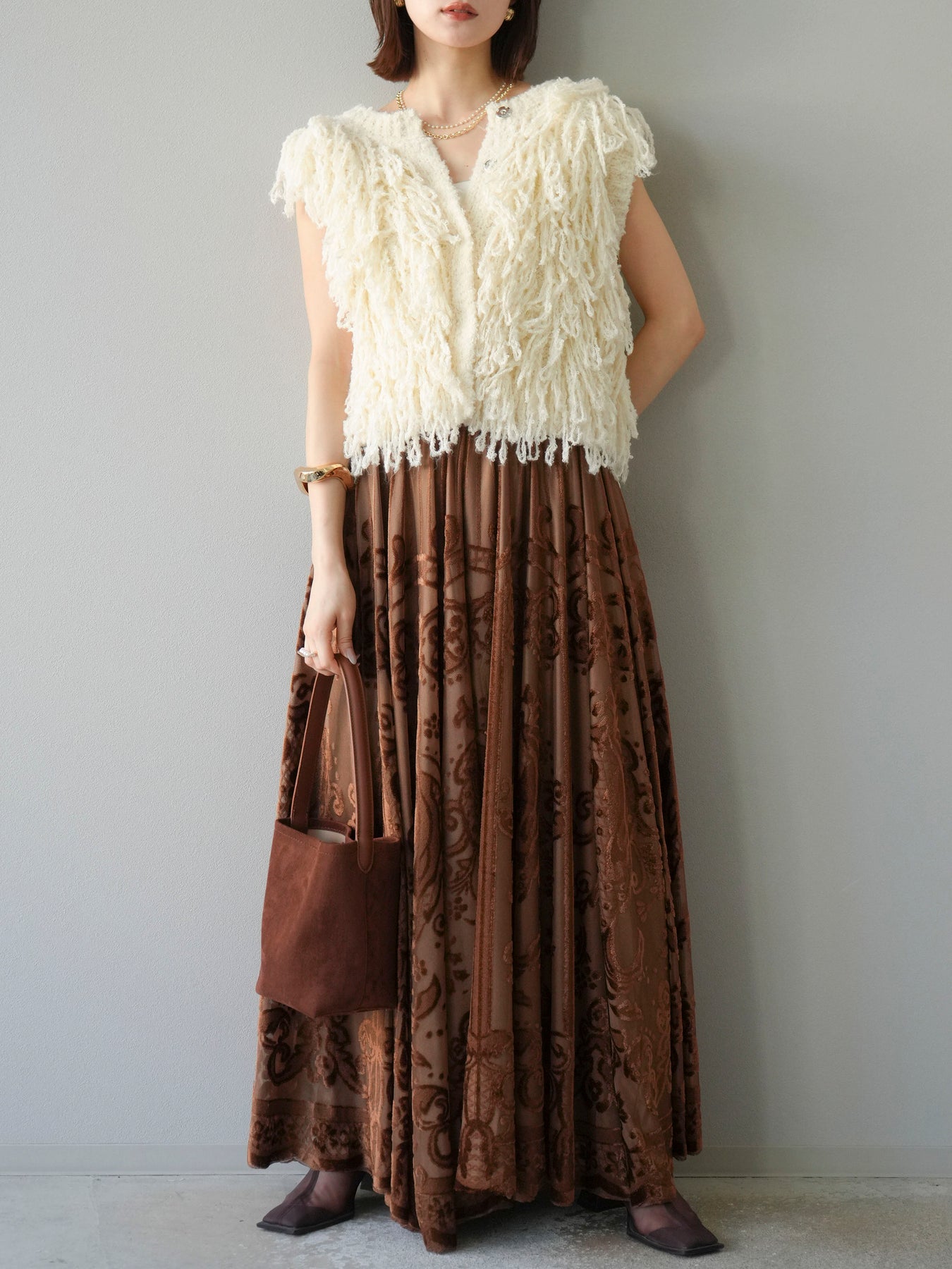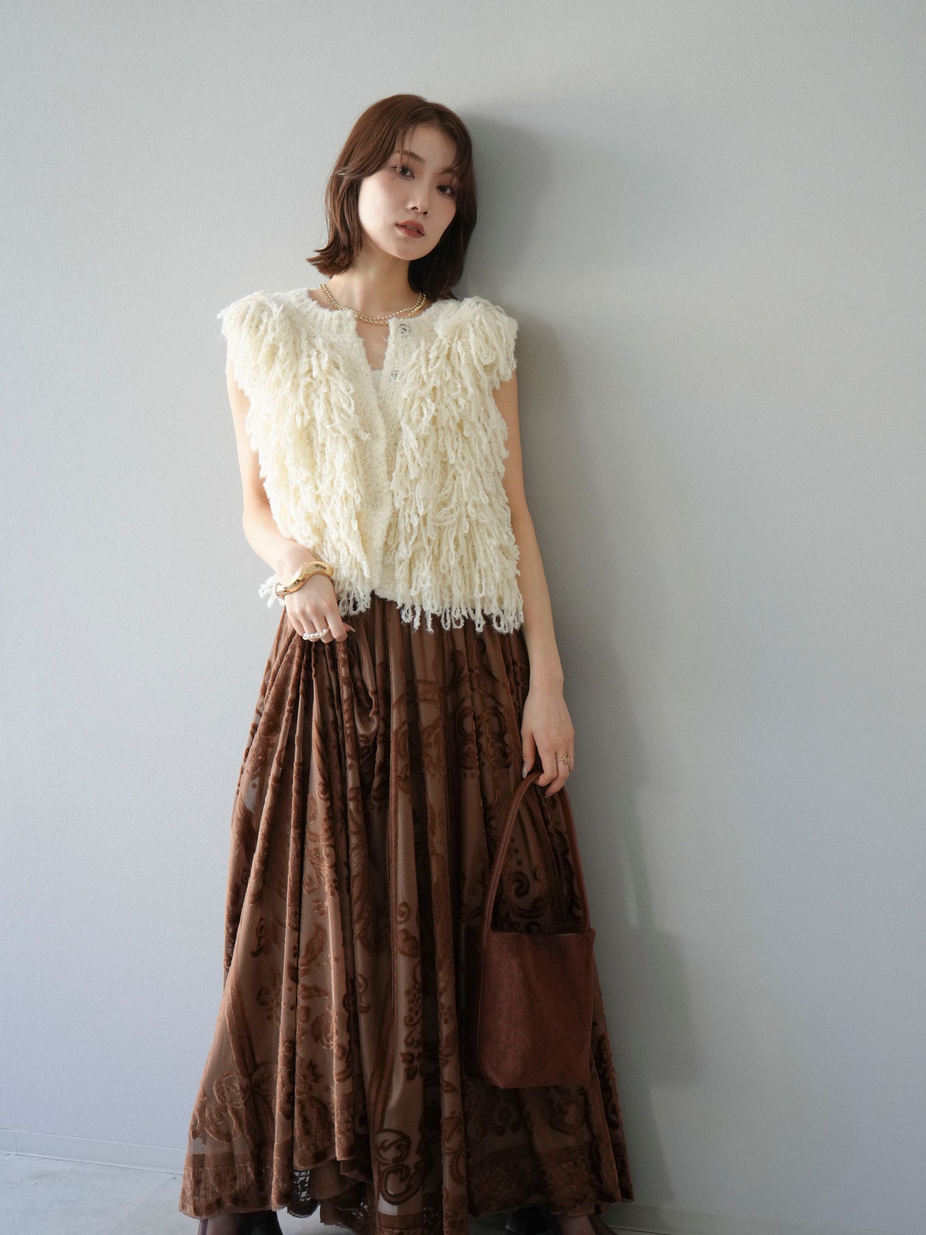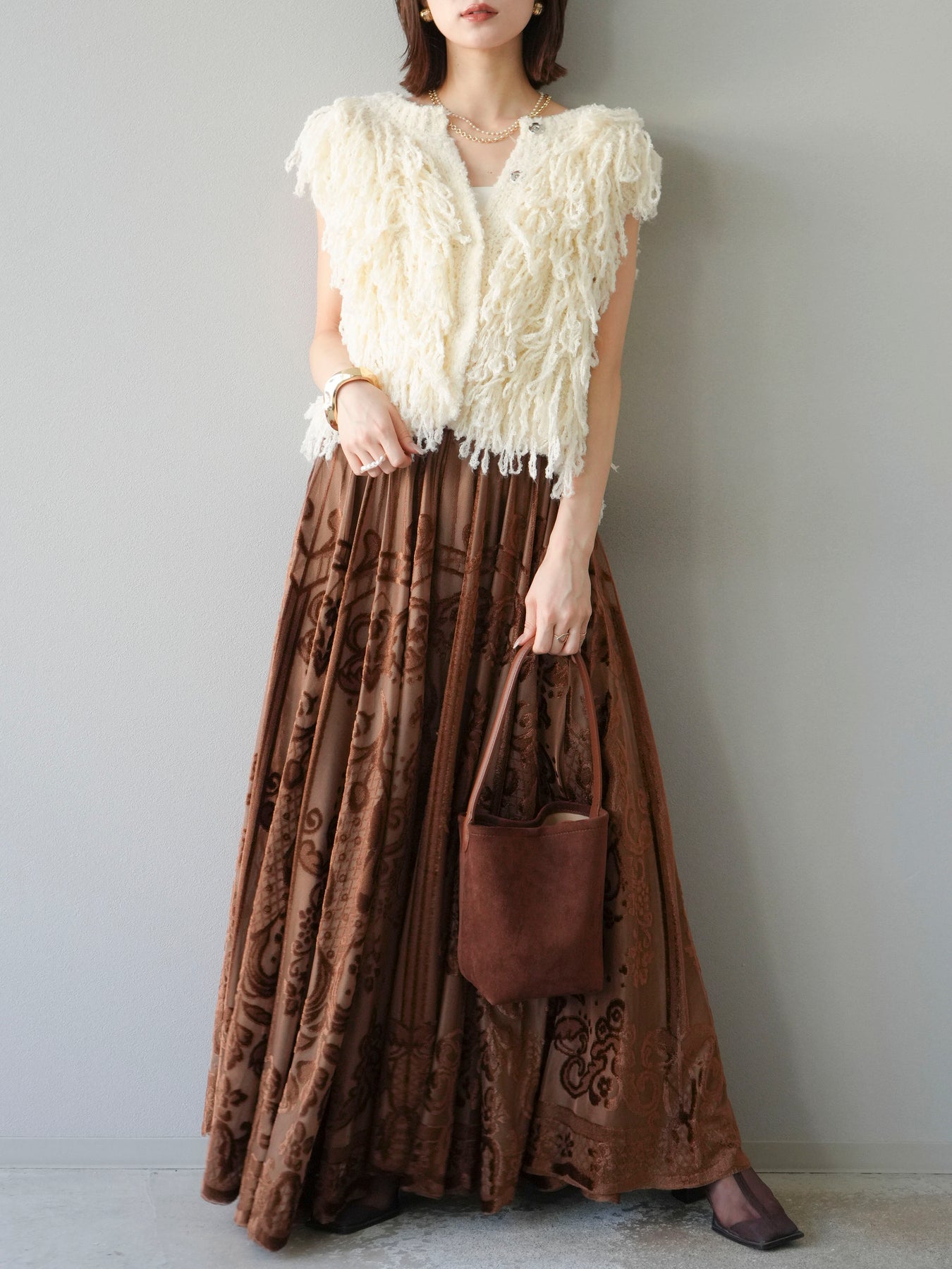 [SET]フリンジループニットベスト+アンティーク柄フロッキーマキシスカート(2set)