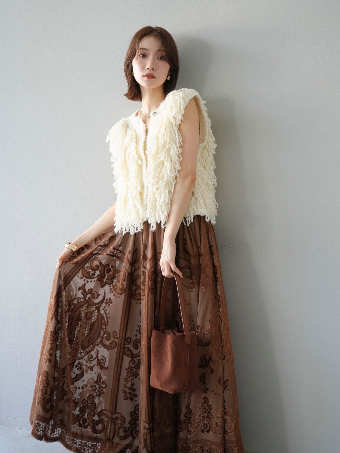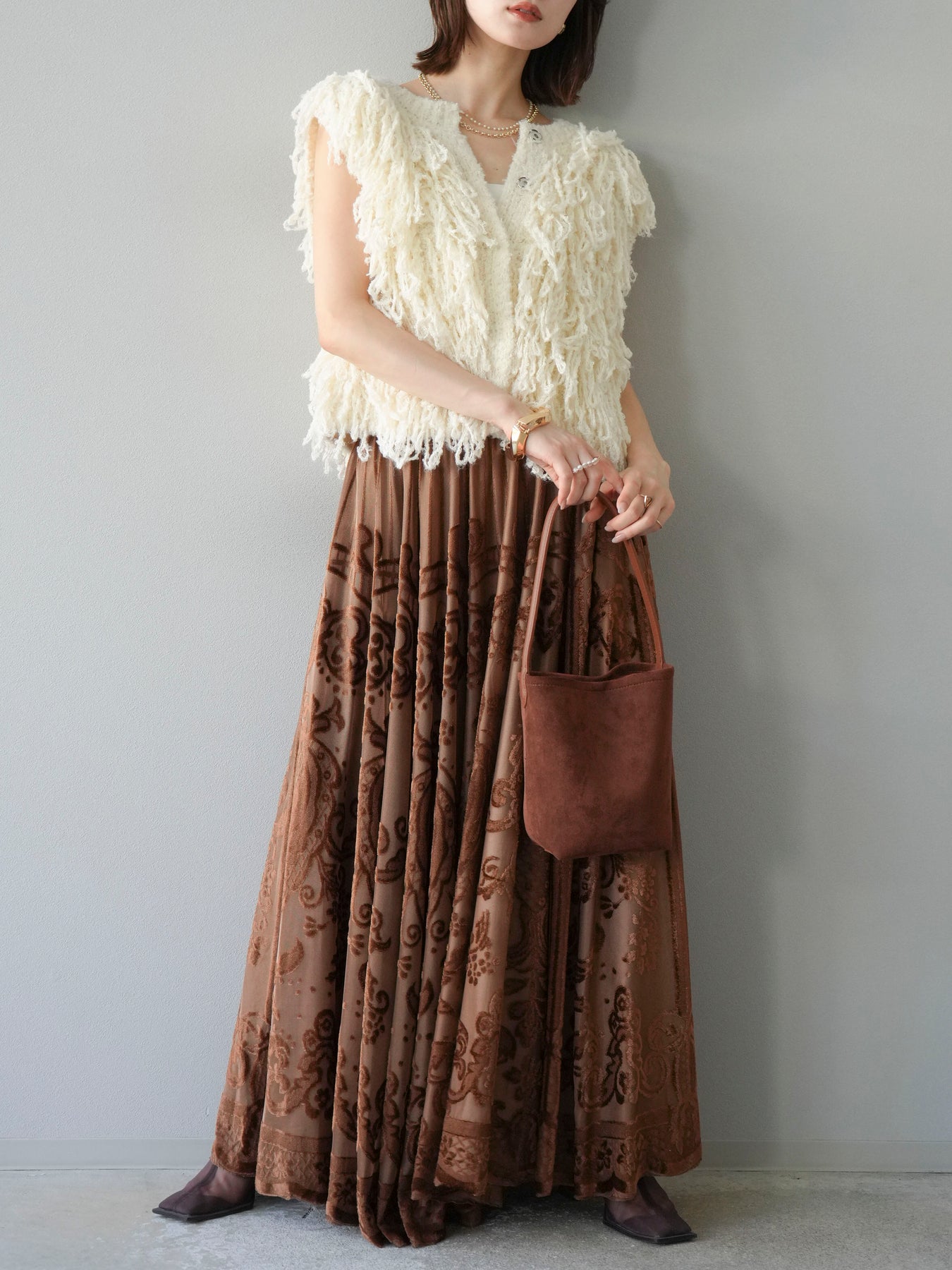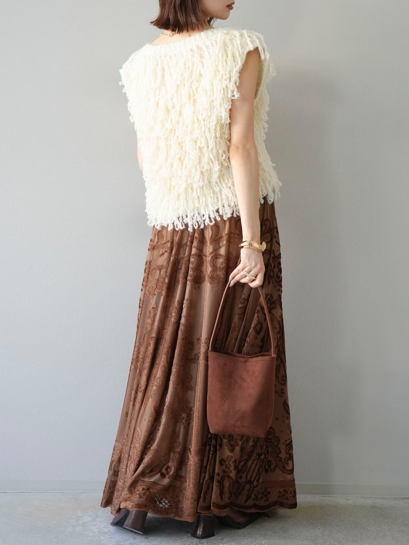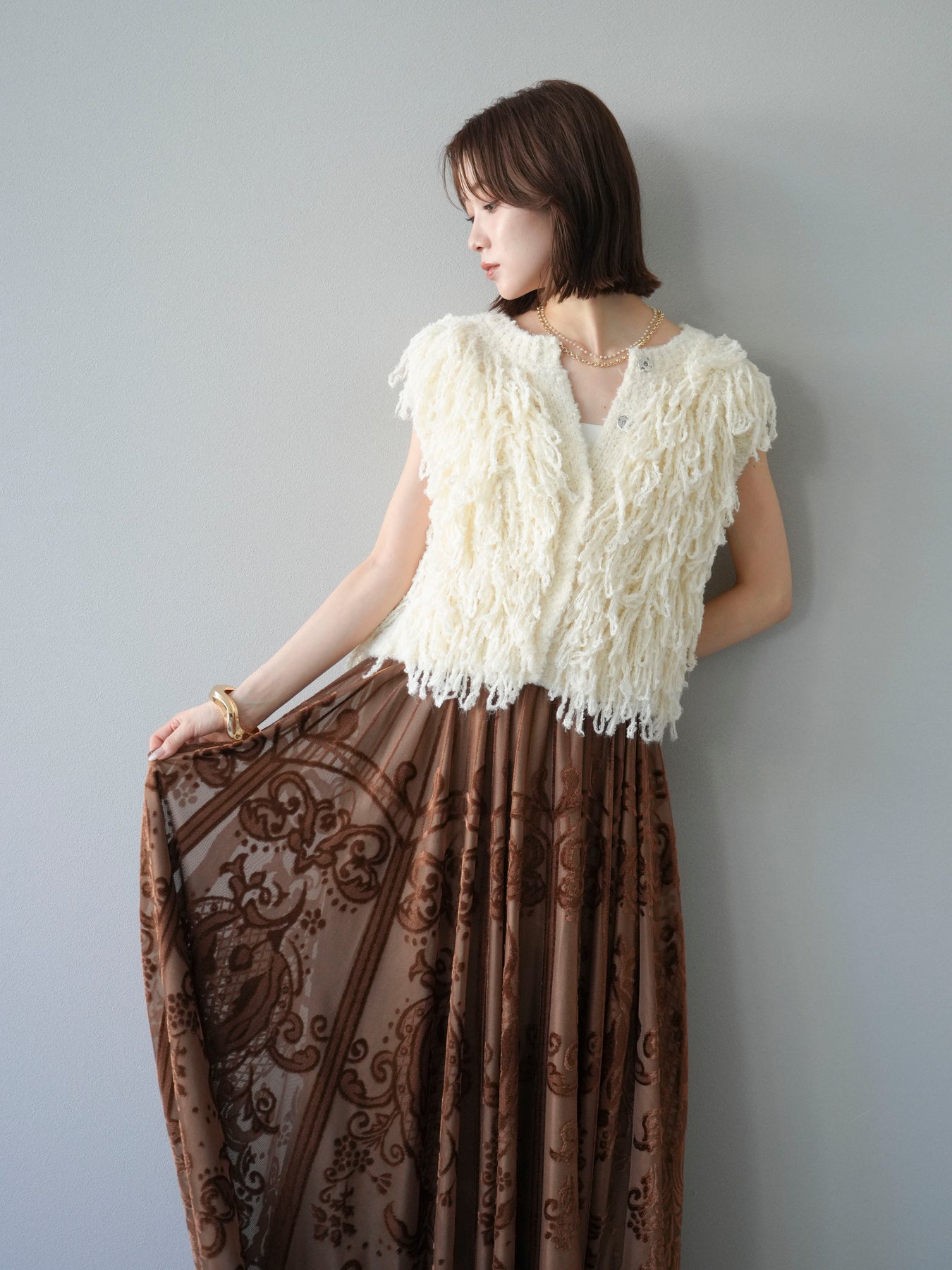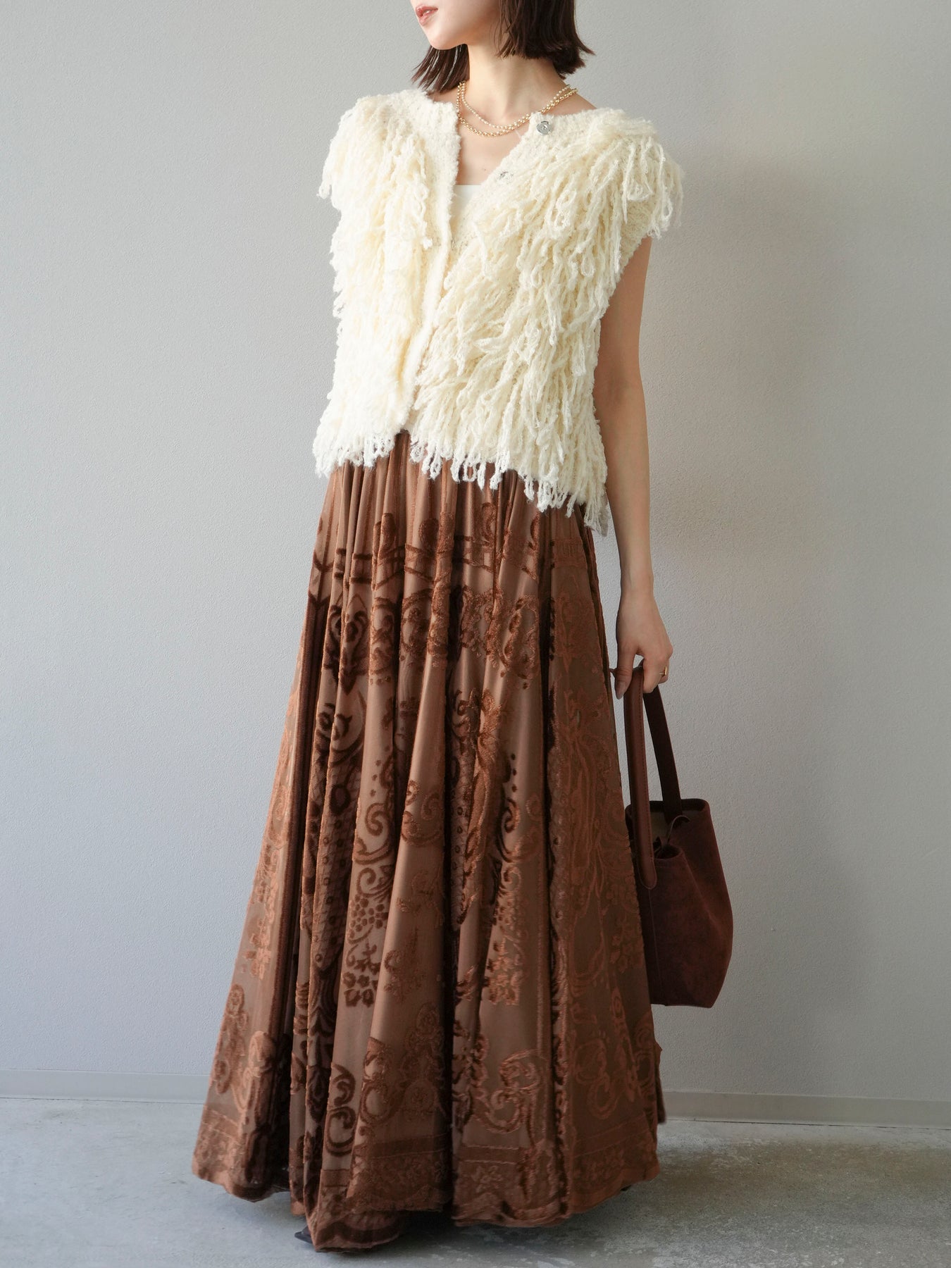 [SET]フリンジループニットベスト+アンティーク柄フロッキーマキシスカート(2set)