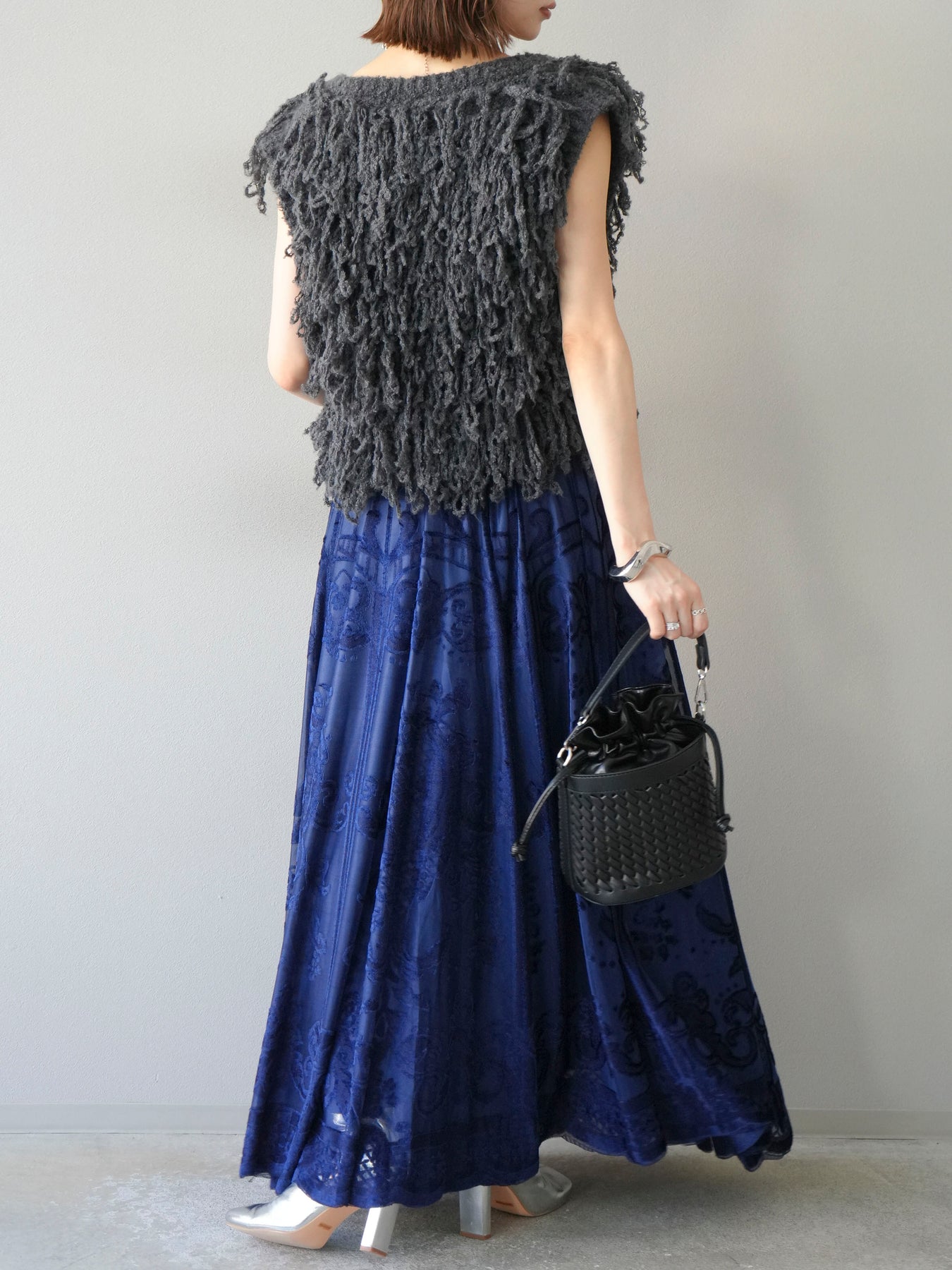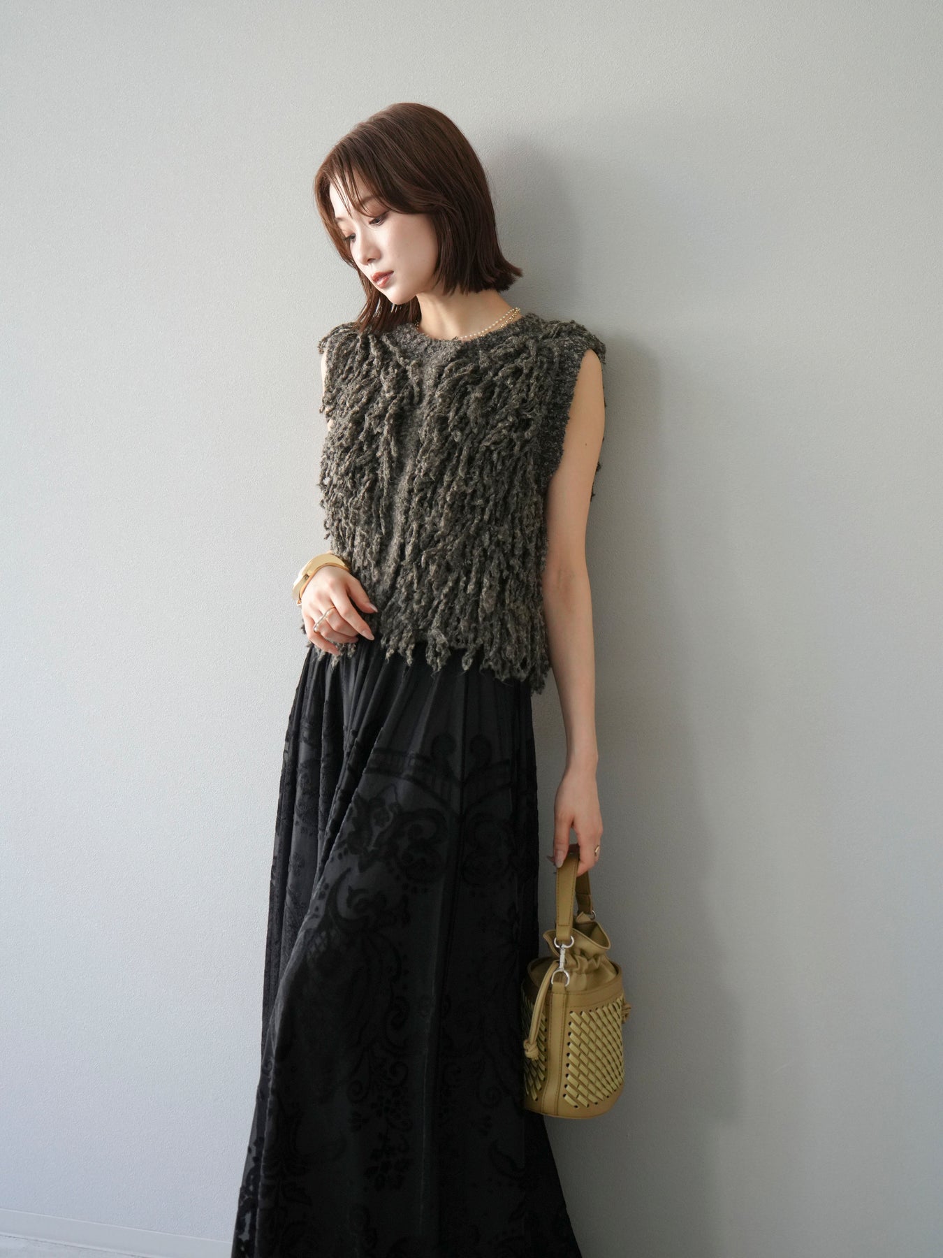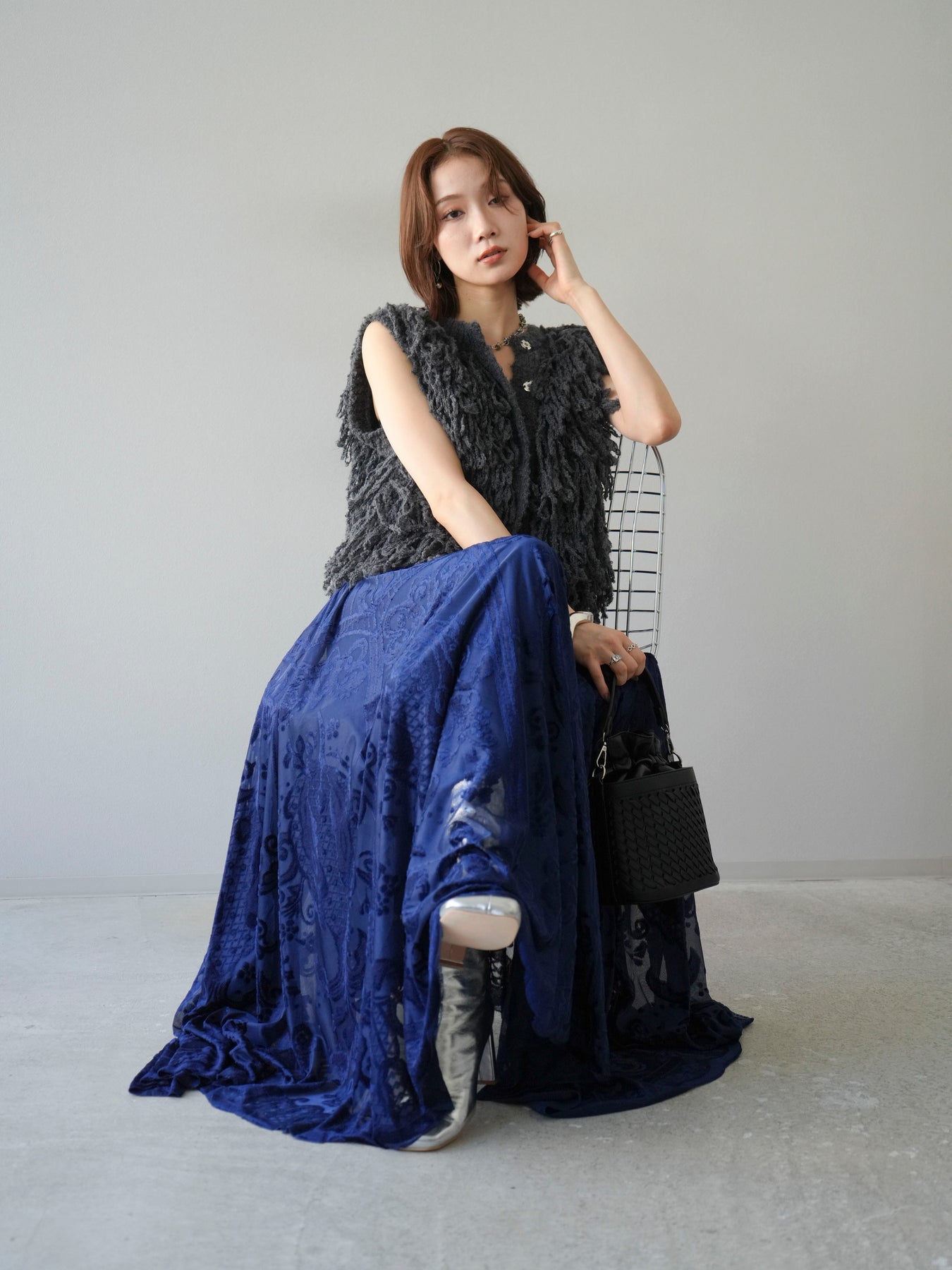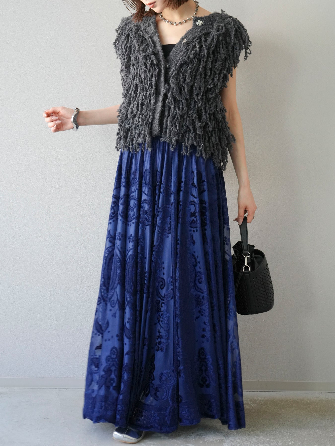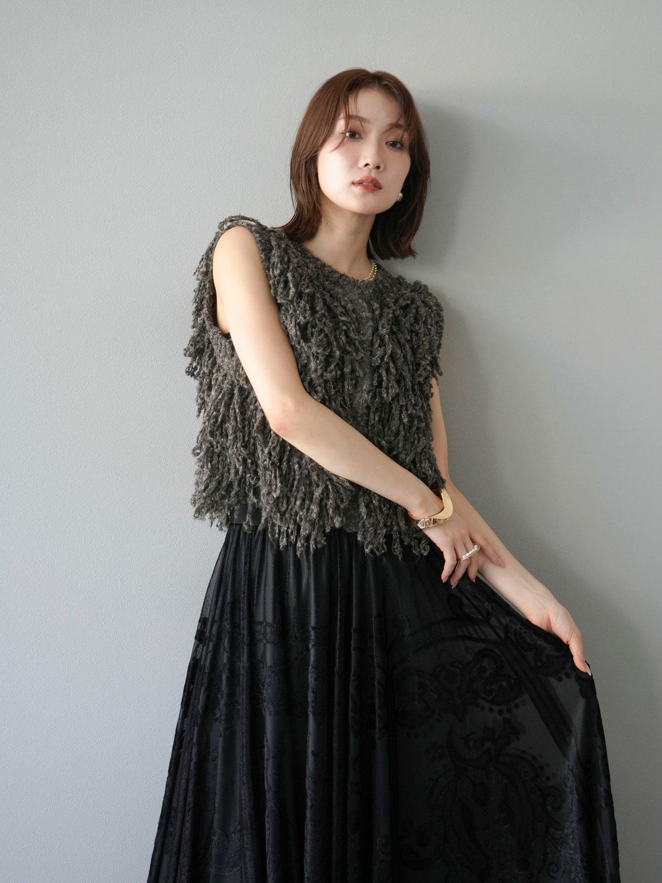 [SET]フリンジループニットベスト+アンティーク柄フロッキーマキシスカート(2set)