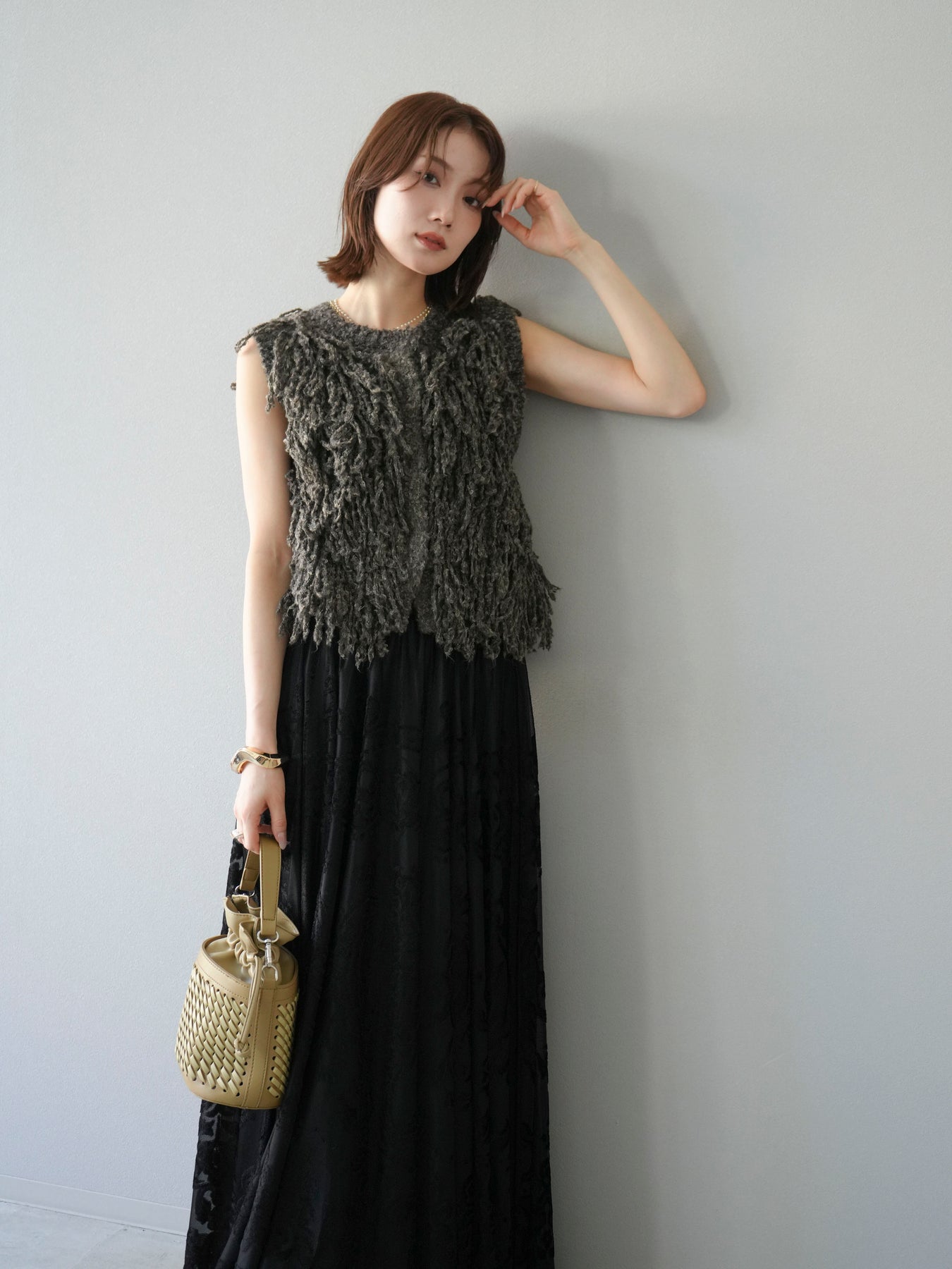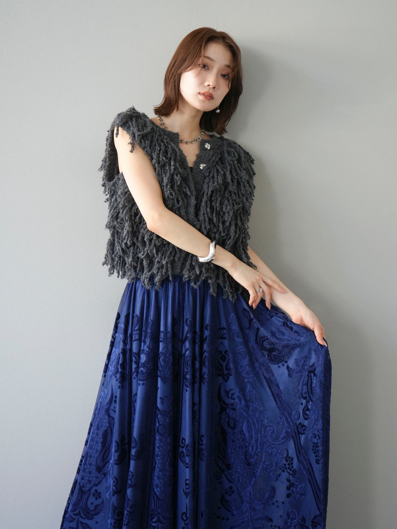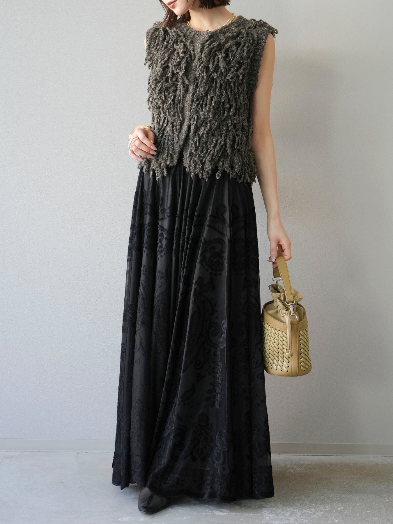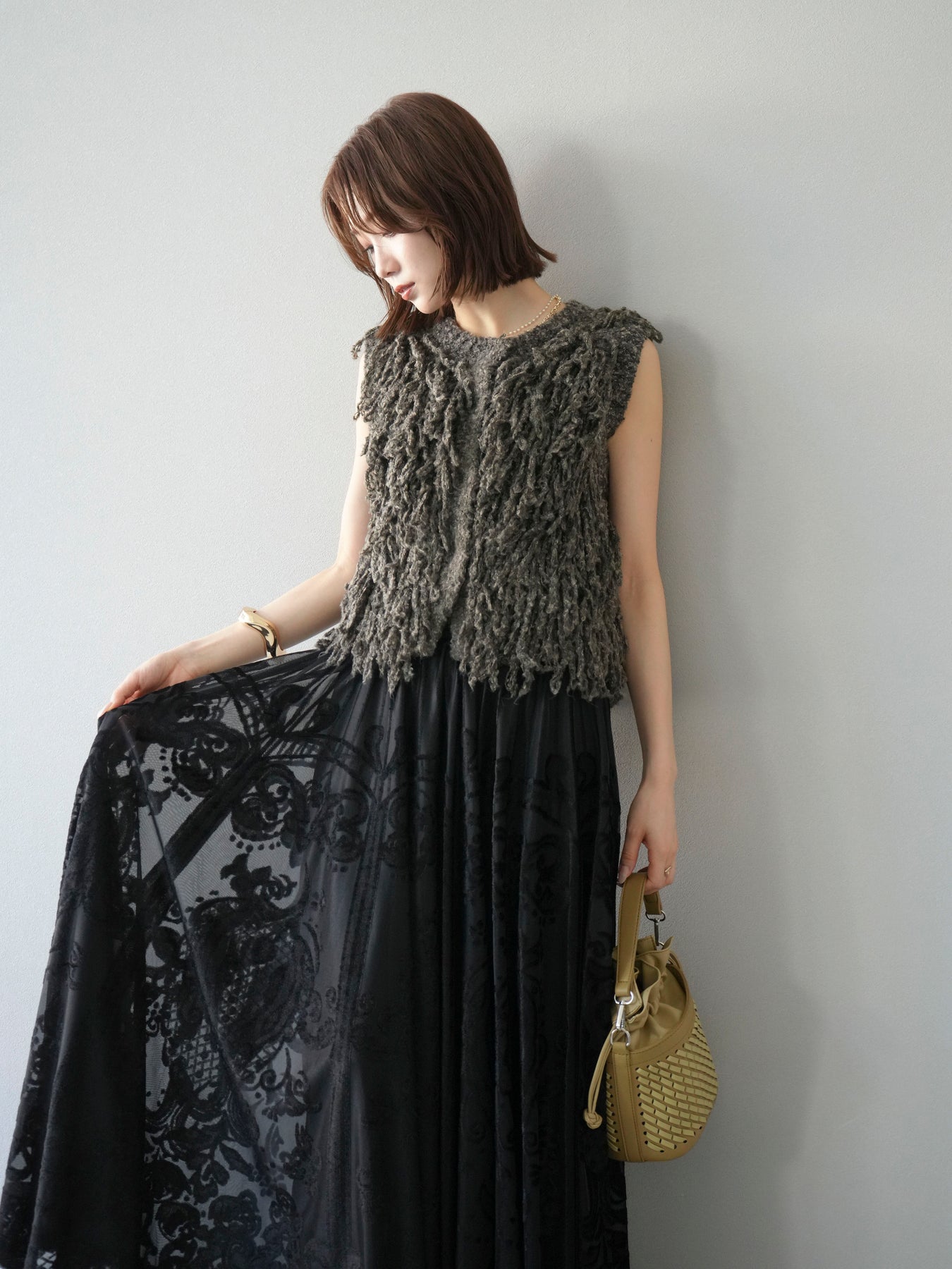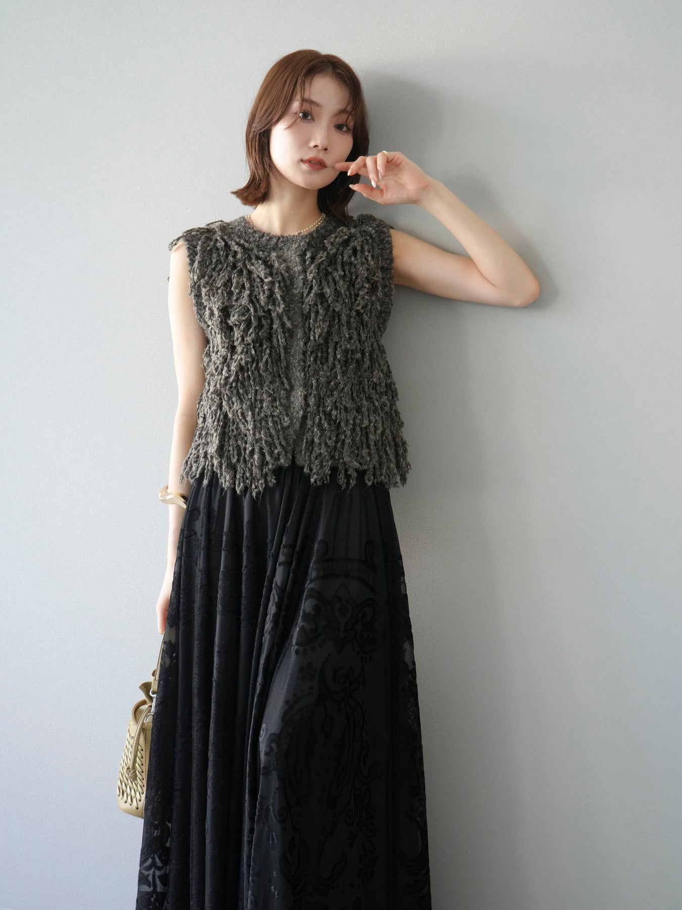 [SET]フリンジループニットベスト+アンティーク柄フロッキーマキシスカート(2set)