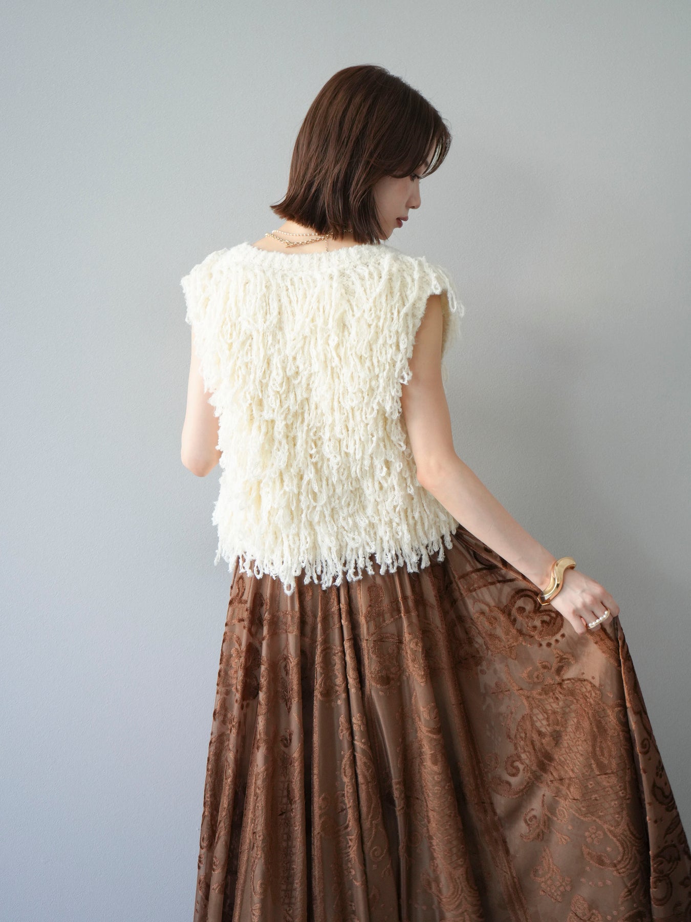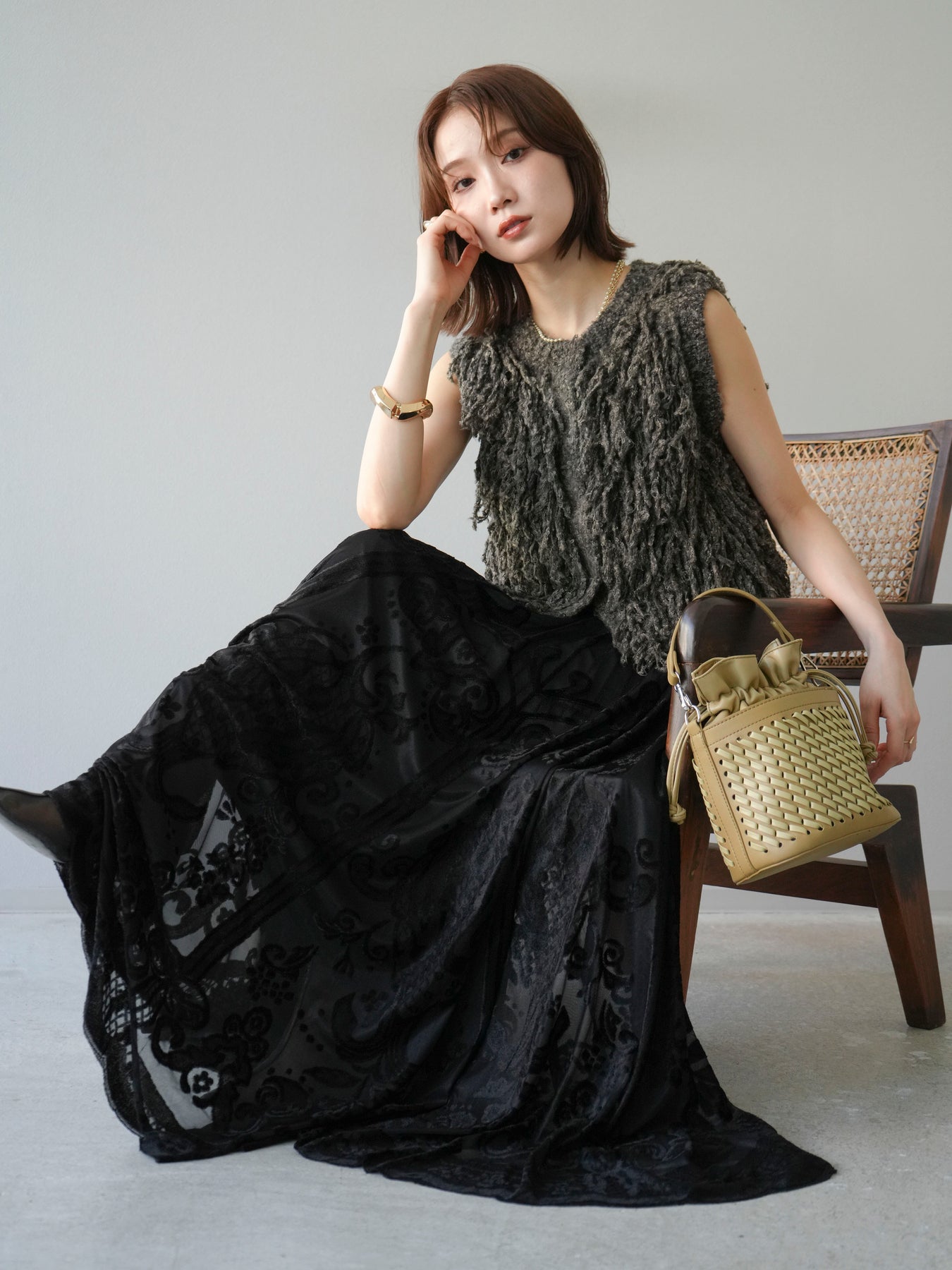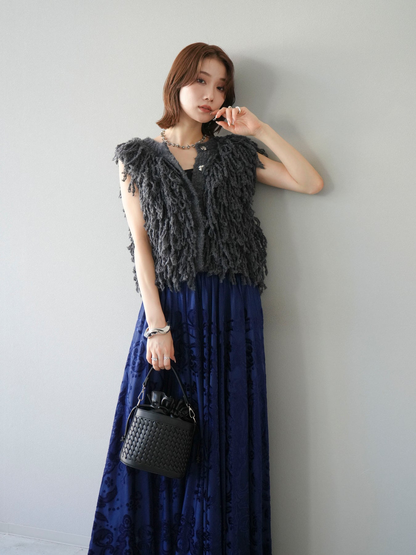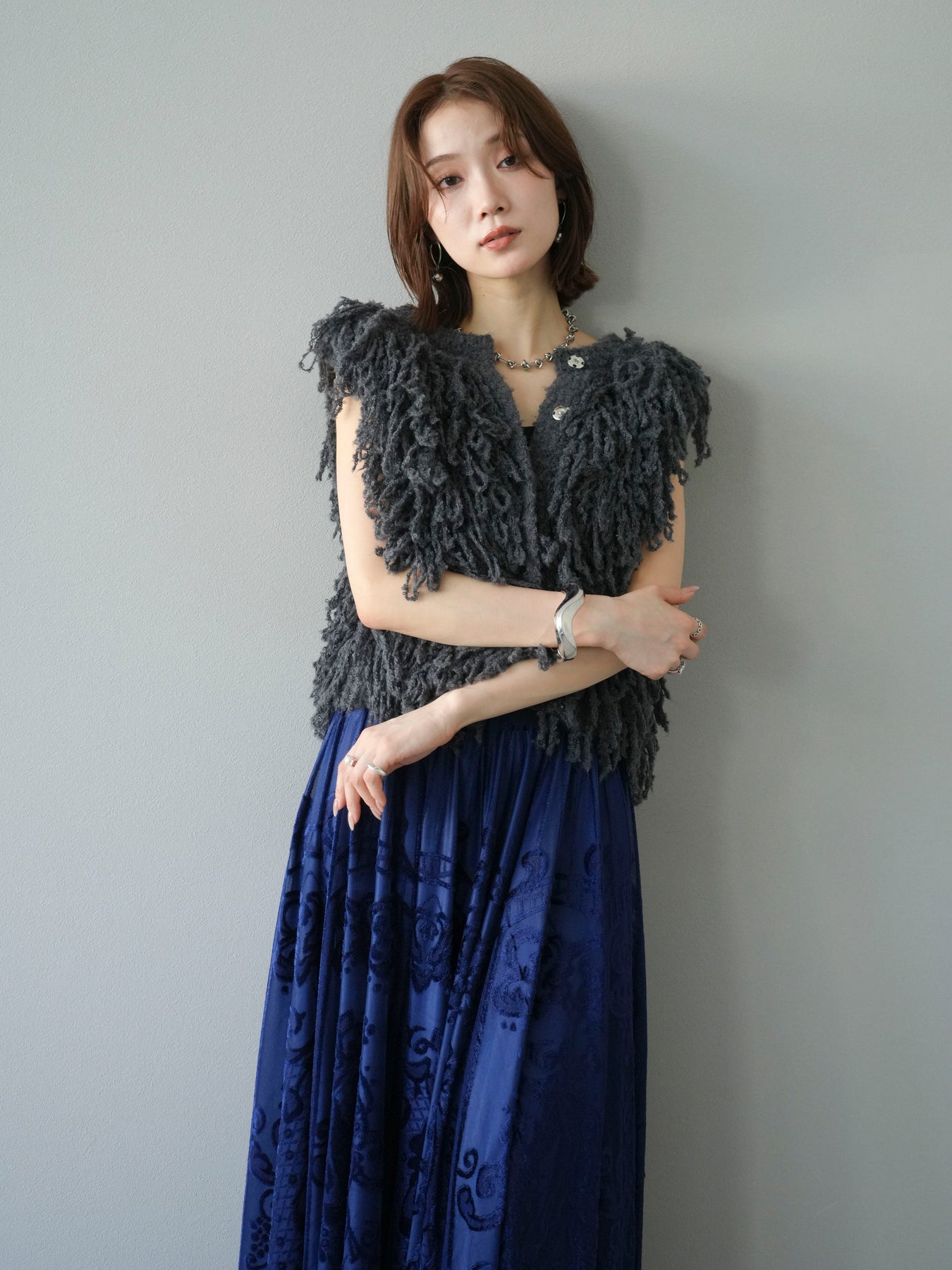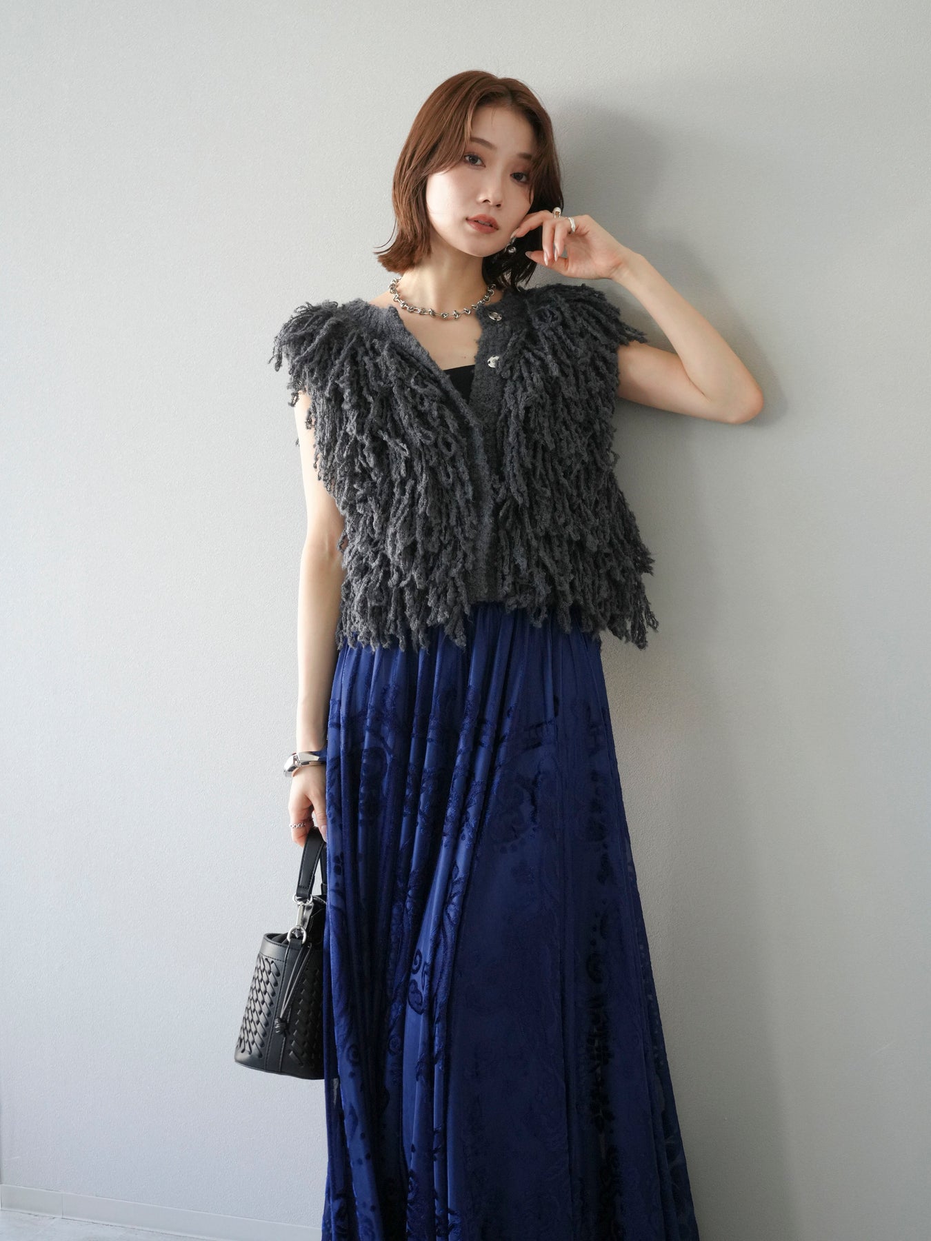 [SET]フリンジループニットベスト+アンティーク柄フロッキーマキシスカート(2set)