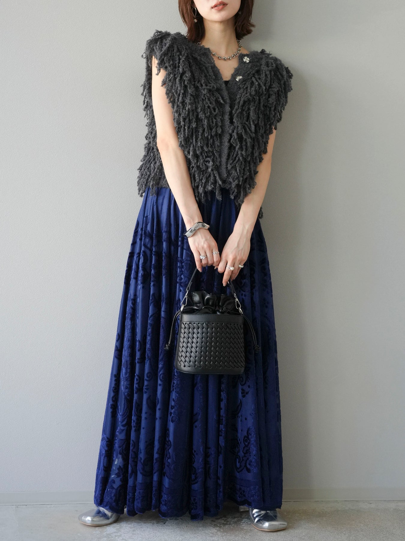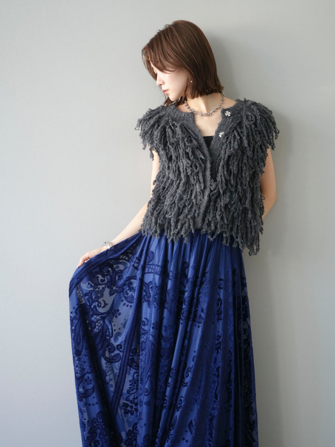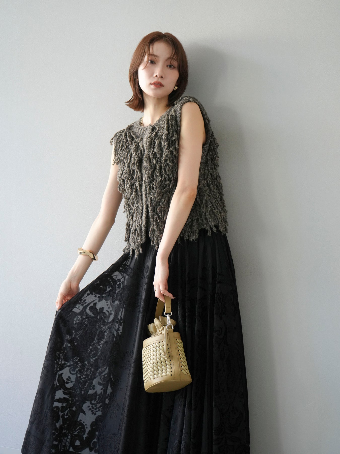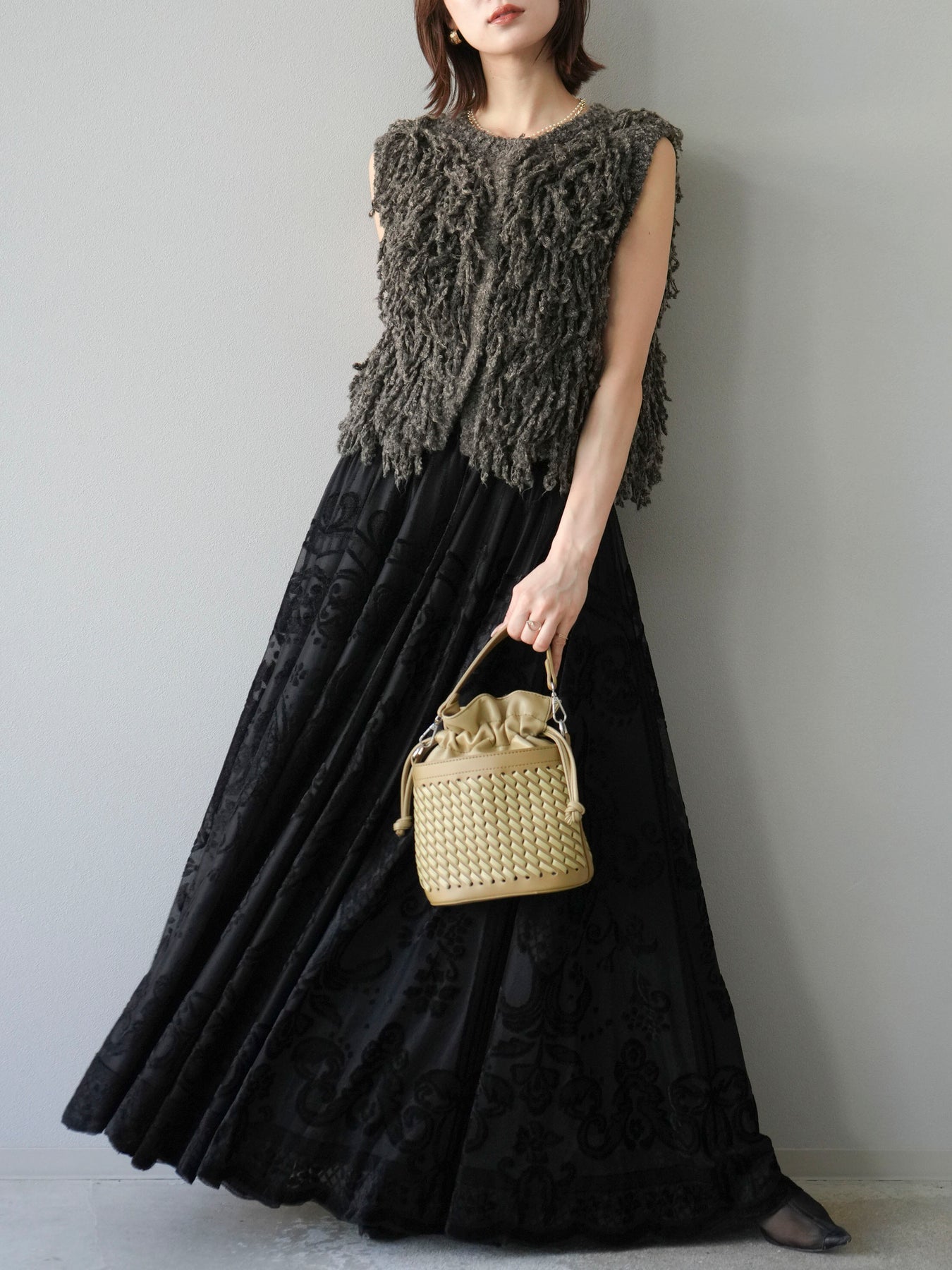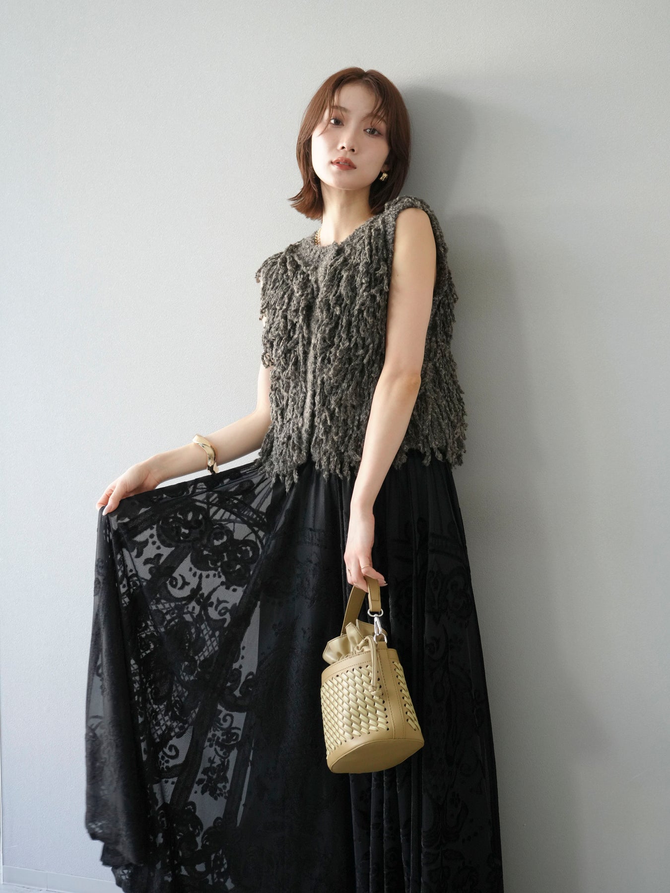 [SET]フリンジループニットベスト+アンティーク柄フロッキーマキシスカート(2set)