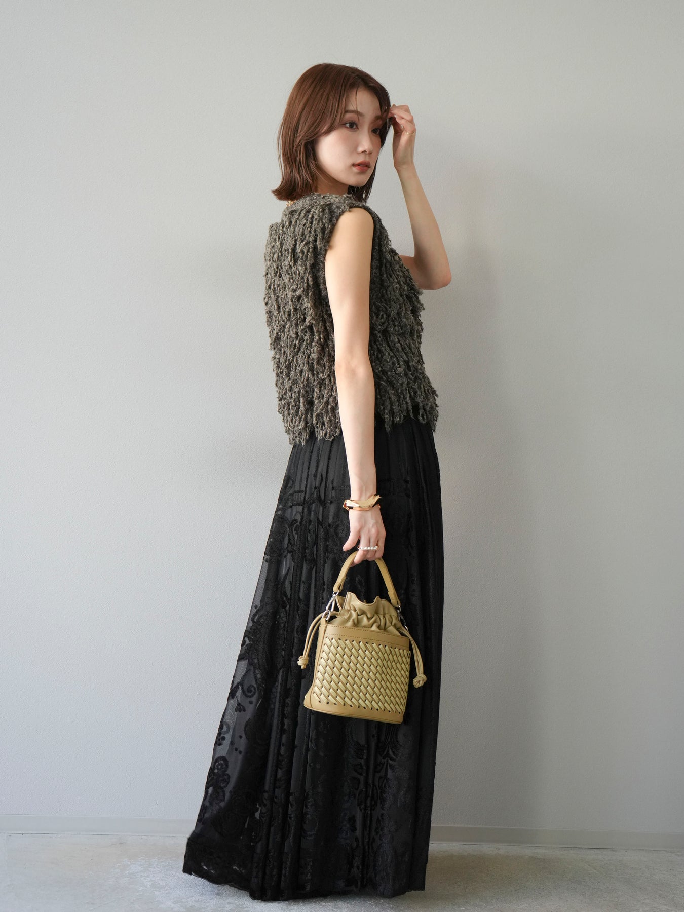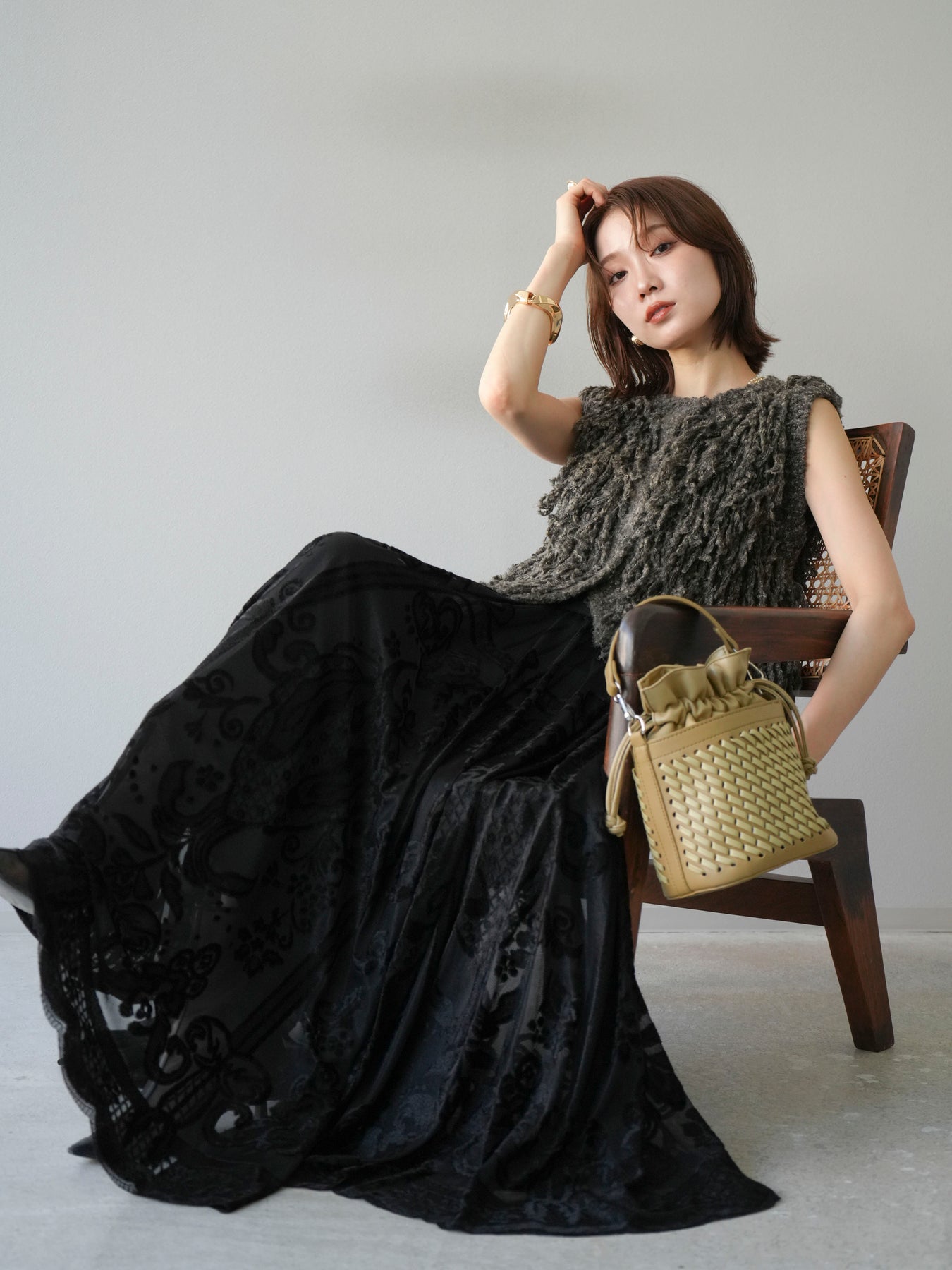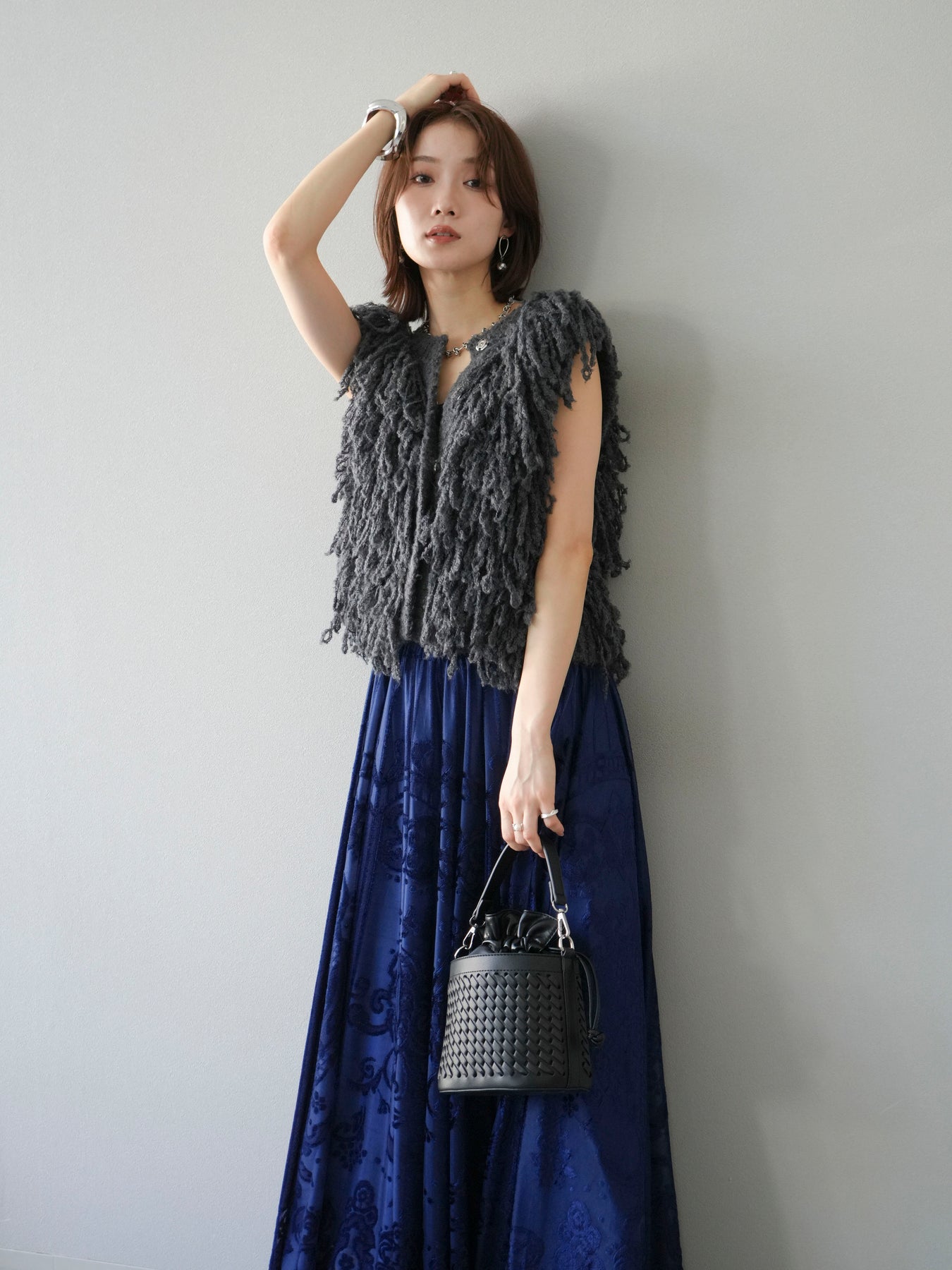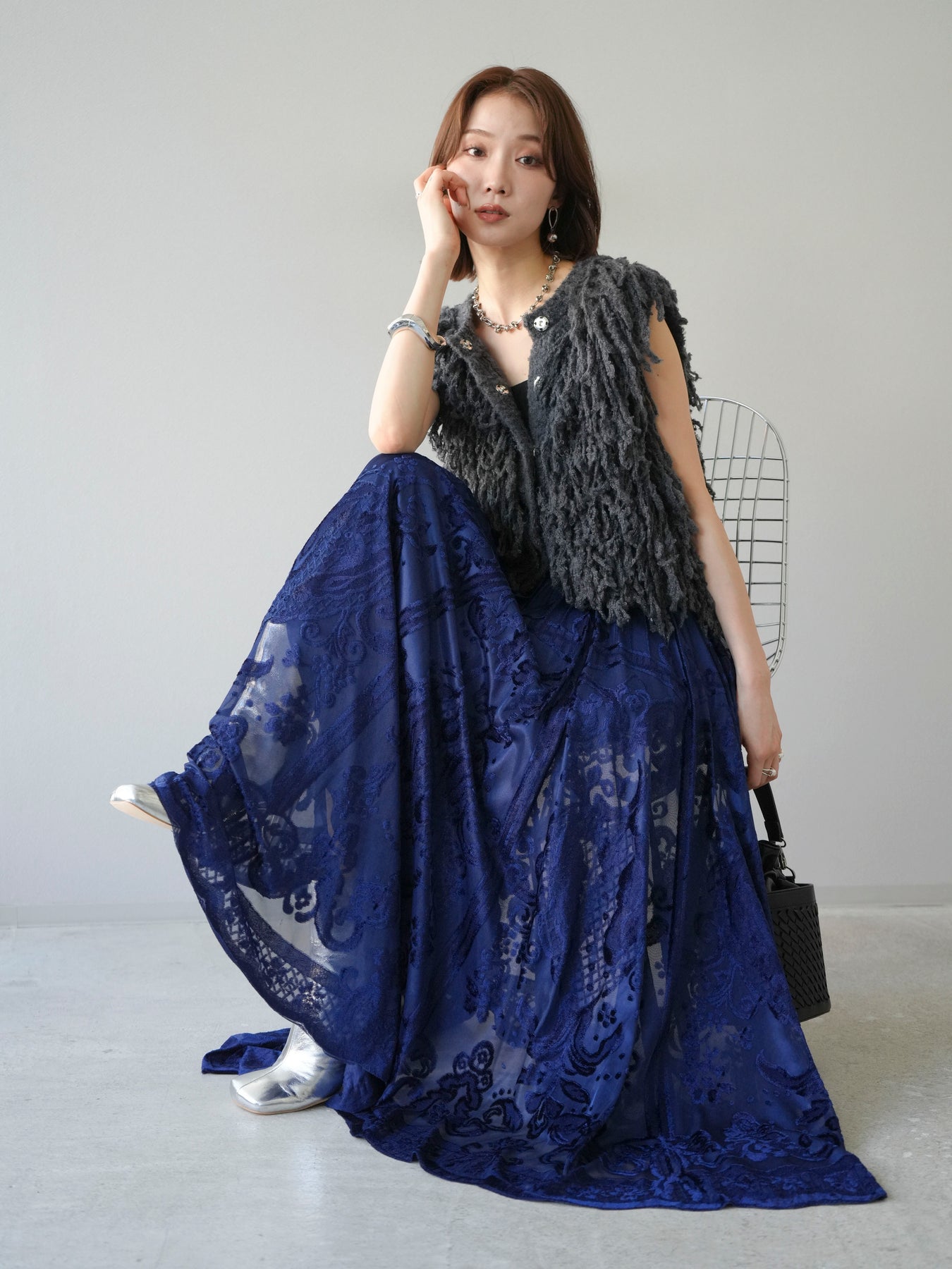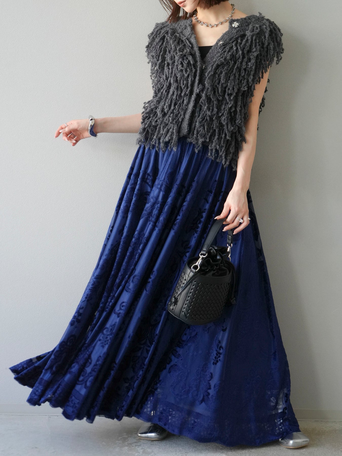 [SET]フリンジループニットベスト+アンティーク柄フロッキーマキシスカート(2set)