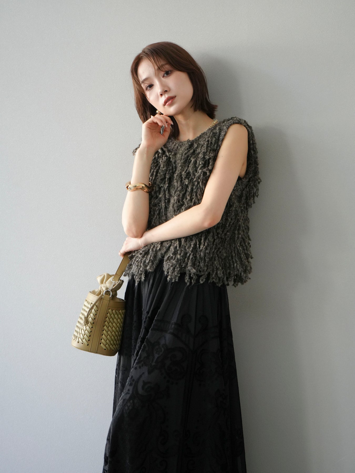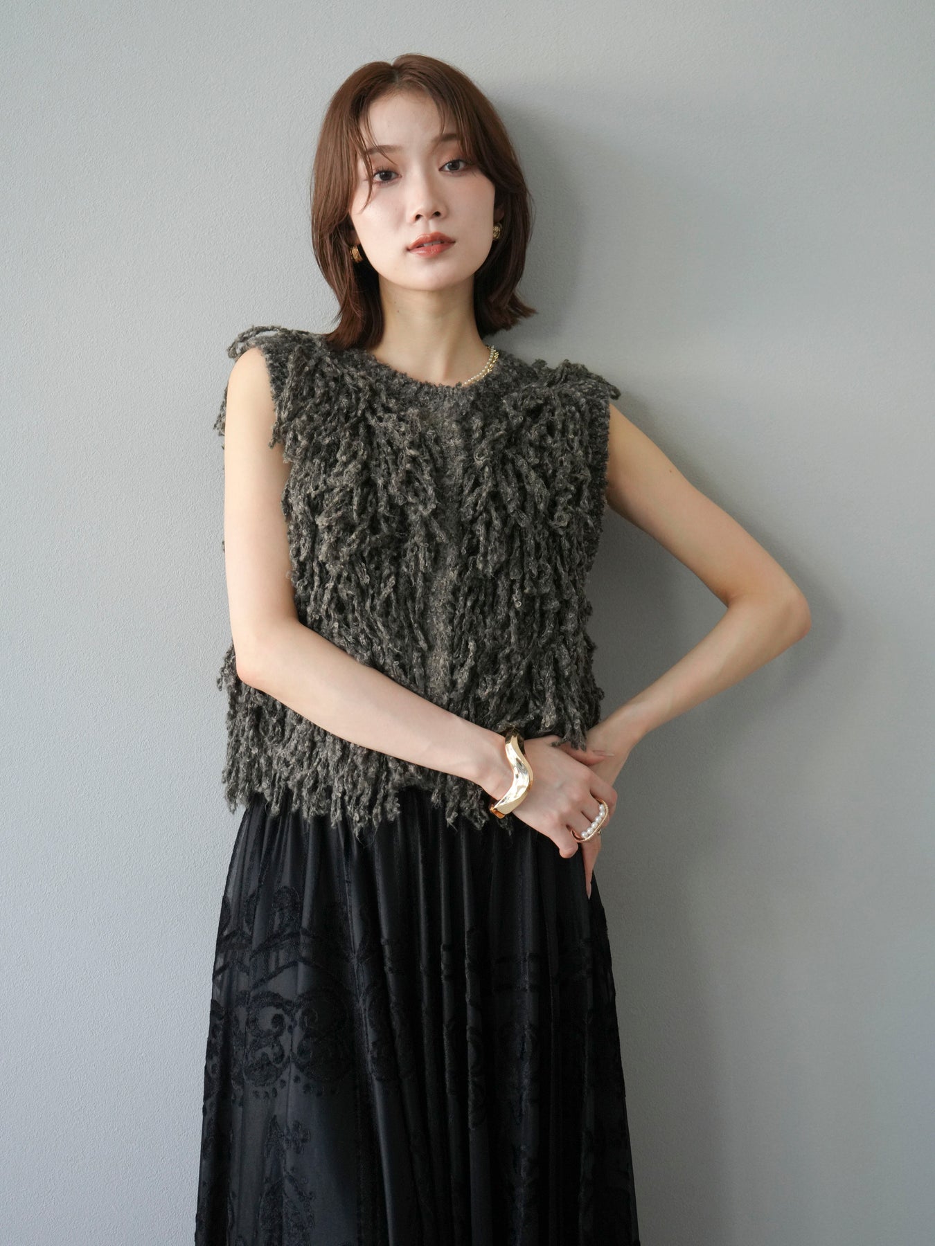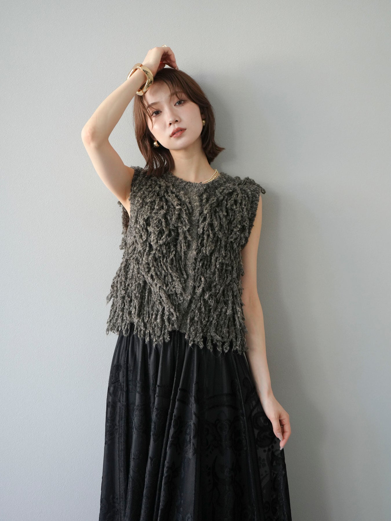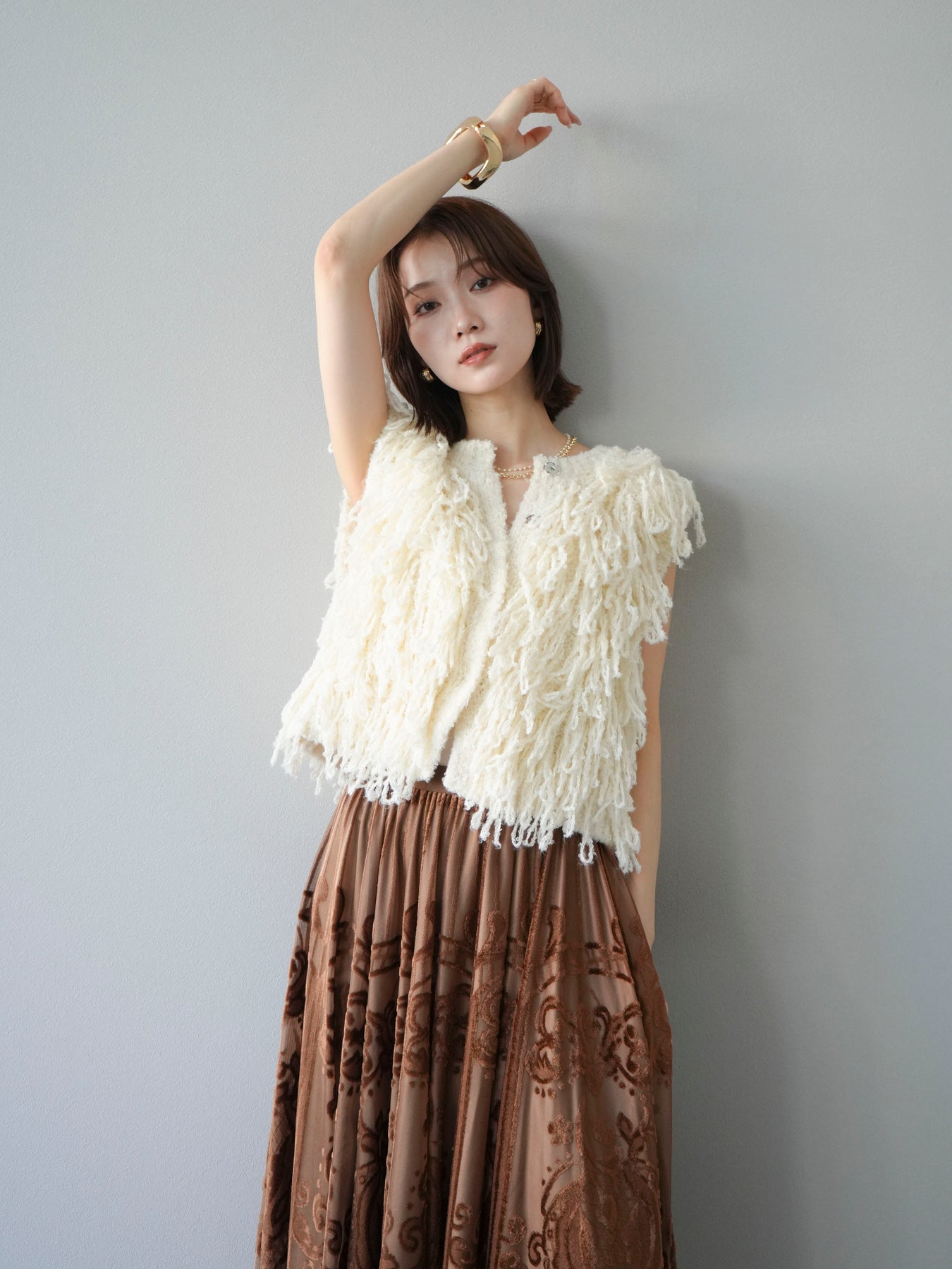 ループ状のフリンジを全体にあしらったデザイン性の高いニットベスト。立体感のある編地が存在感を放ち、シンプルなコーディネートにプラスするだけで華やぎを与えてくれます。程よくコンパクトな丈感でボトムスとのバランスが取りやすく、パンツスタイルにもスカートにも好相性。シャツやカットソーにレイヤードすることで季節を問わず活躍し、トレンド感あふれるスタイリングが完成します。軽やかな着心地で、アクセサリーとの相性も良く、着こなしをアップデートしてくれる一枚です。 ※ボトムス、キャミソール(インナー)以外の商品は一律でインナーは付属していません。
