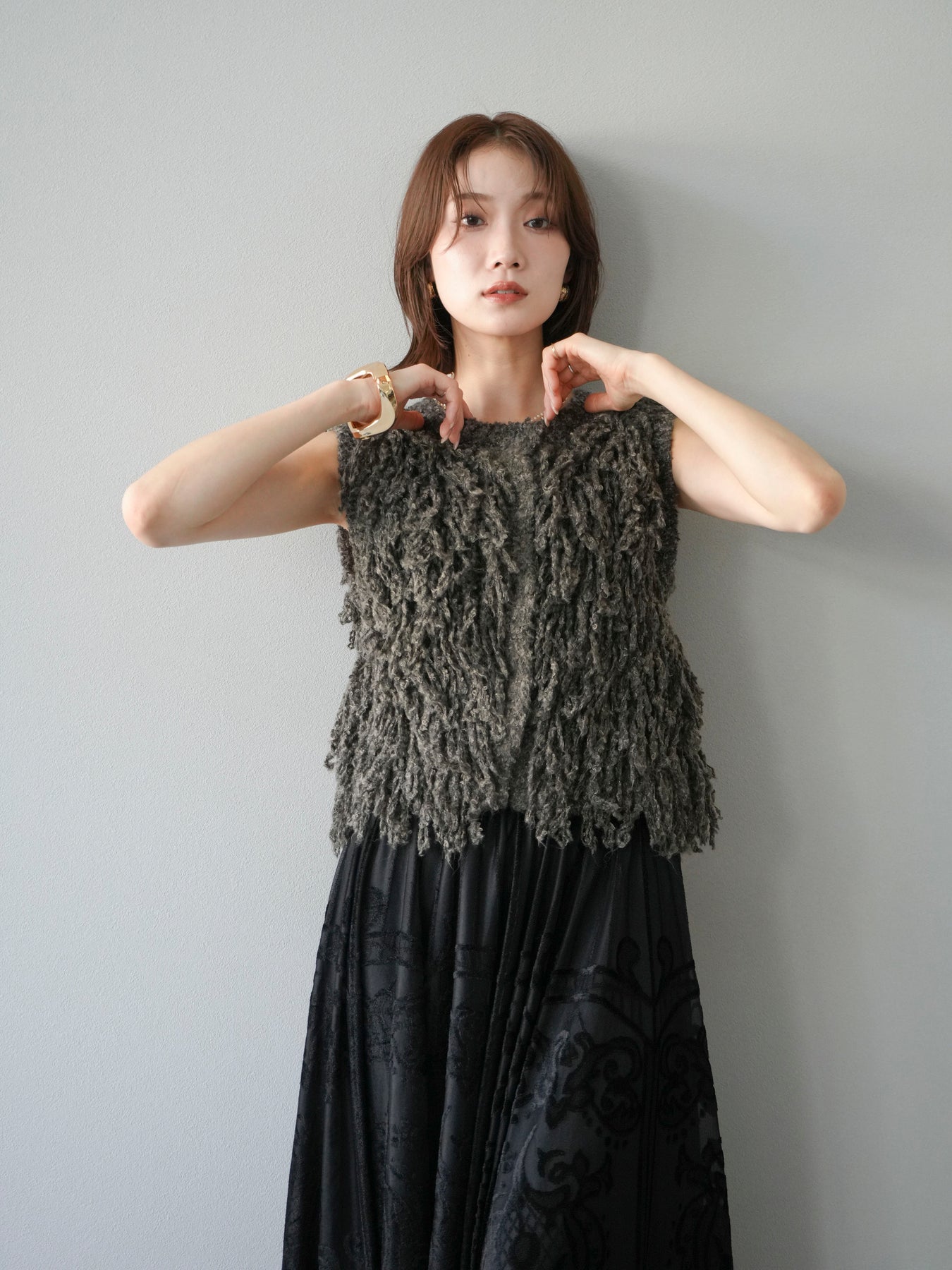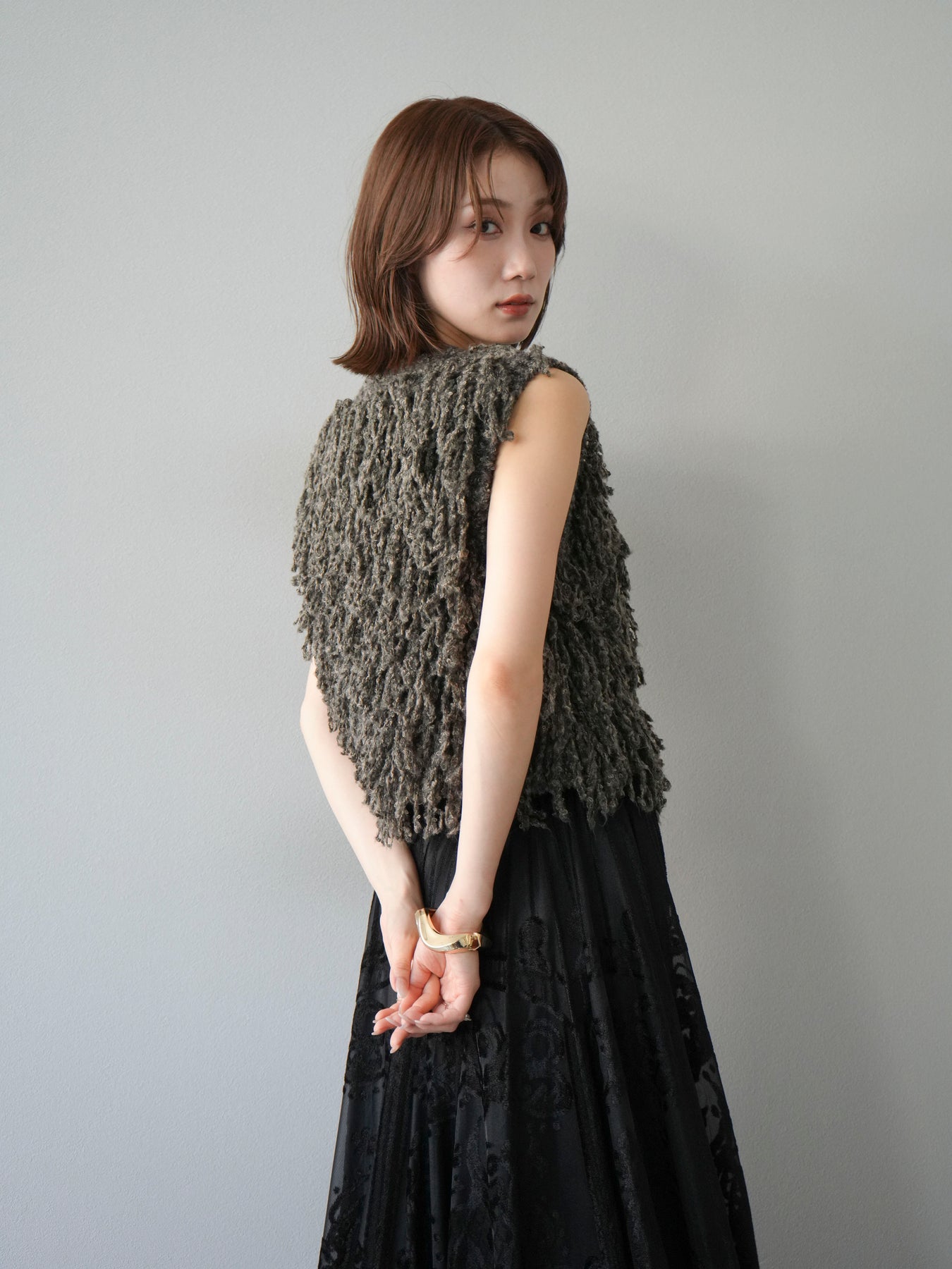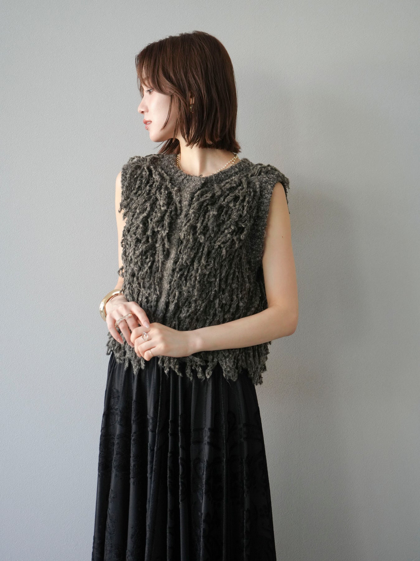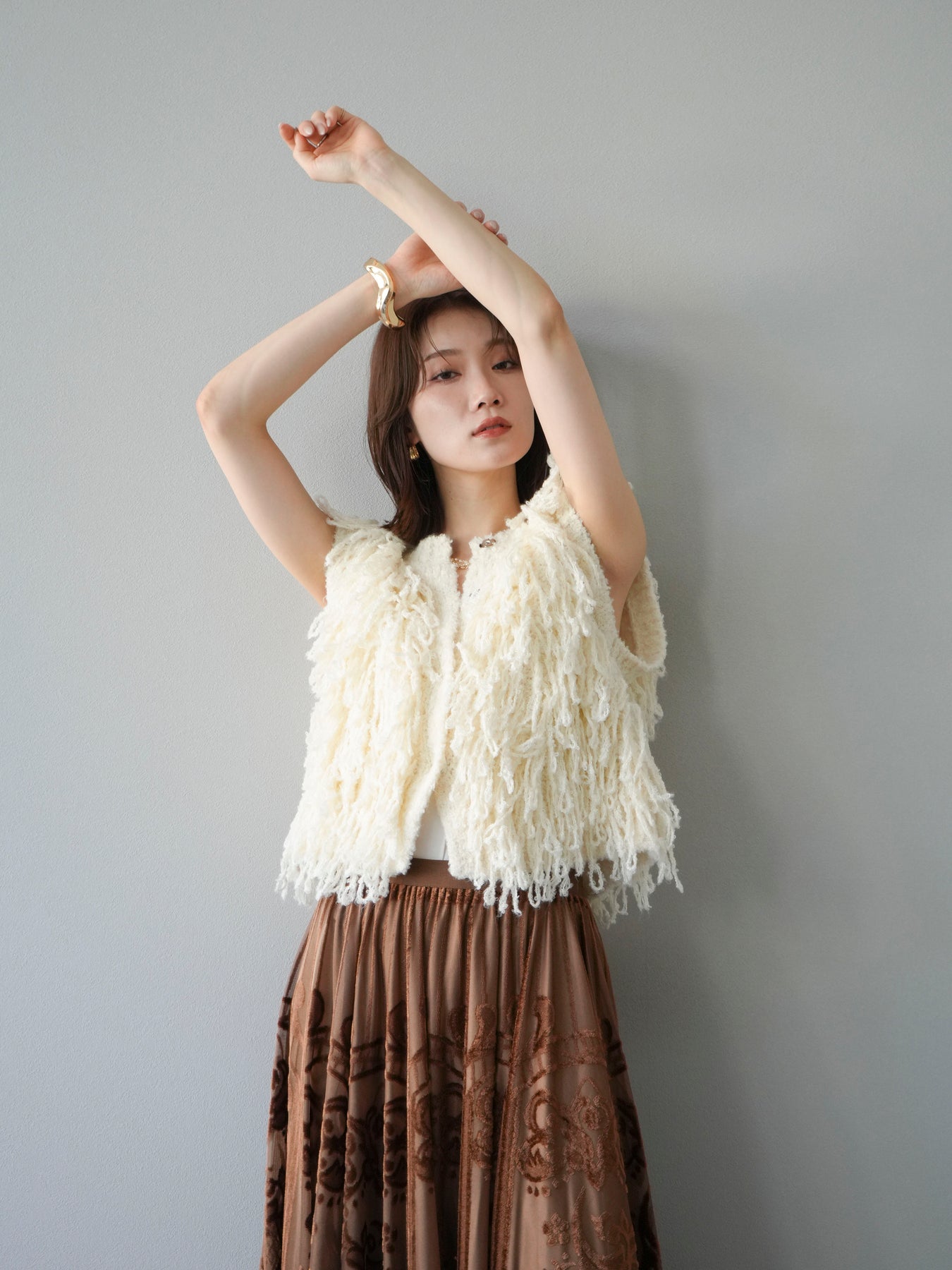 ループ状のフリンジを全体にあしらったデザイン性の高いニットベスト。立体感のある編地が存在感を放ち、シンプルなコーディネートにプラスするだけで華やぎを与えてくれます。程よくコンパクトな丈感でボトムスとのバランスが取りやすく、パンツスタイルにもスカートにも好相性。シャツやカットソーにレイヤードすることで季節を問わず活躍し、トレンド感あふれるスタイリングが完成します。軽やかな着心地で、アクセサリーとの相性も良く、着こなしをアップデートしてくれる一枚です。 ※ボトムス、キャミソール(インナー)以外の商品は一律でインナーは付属していません。