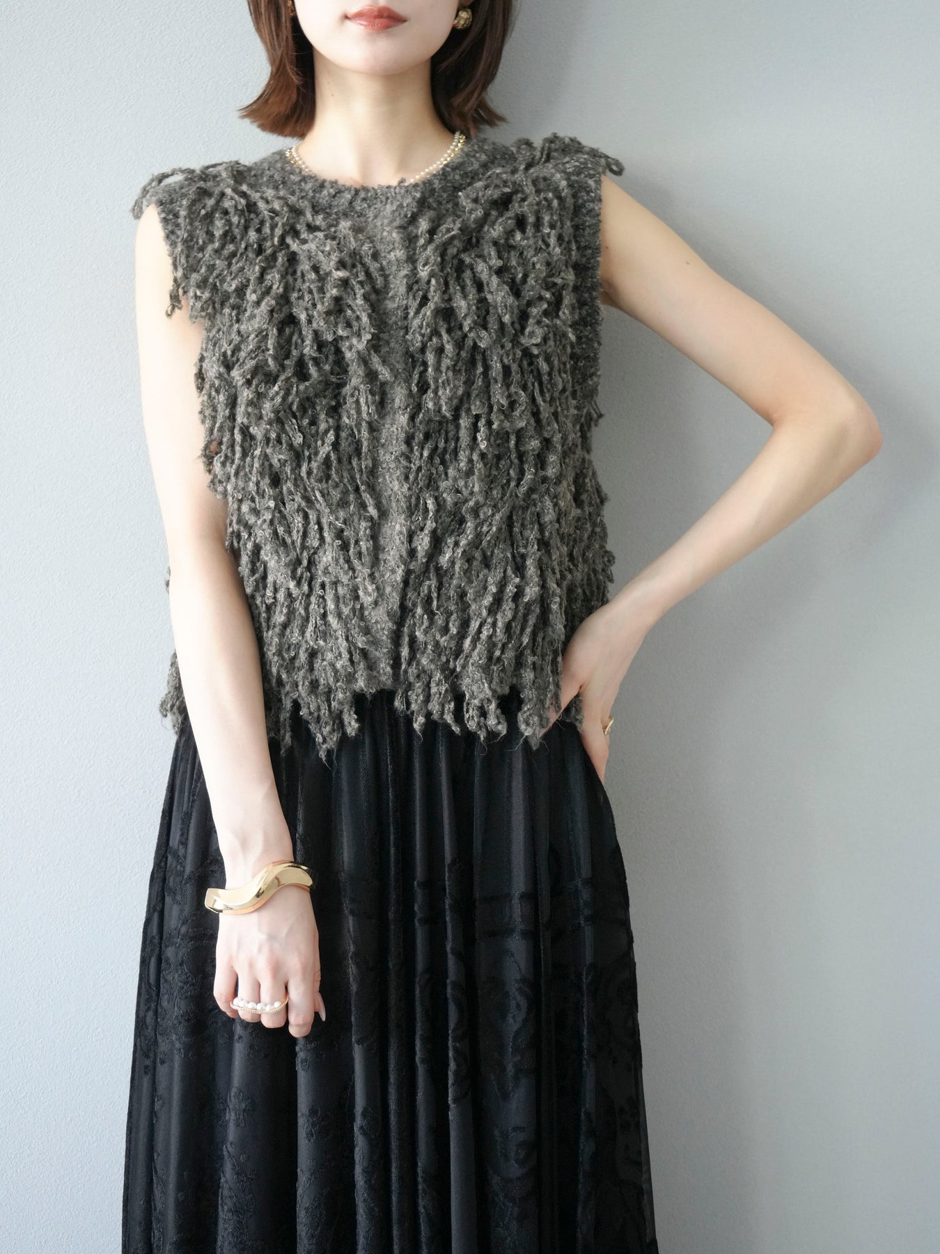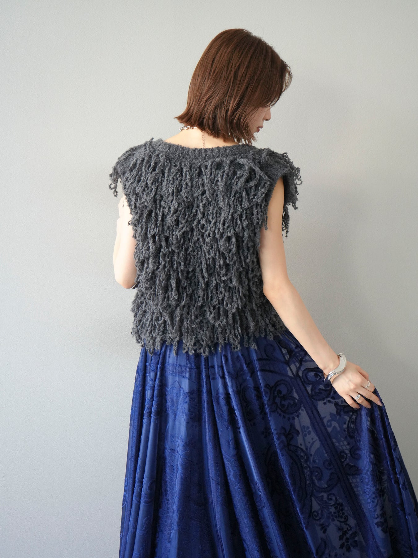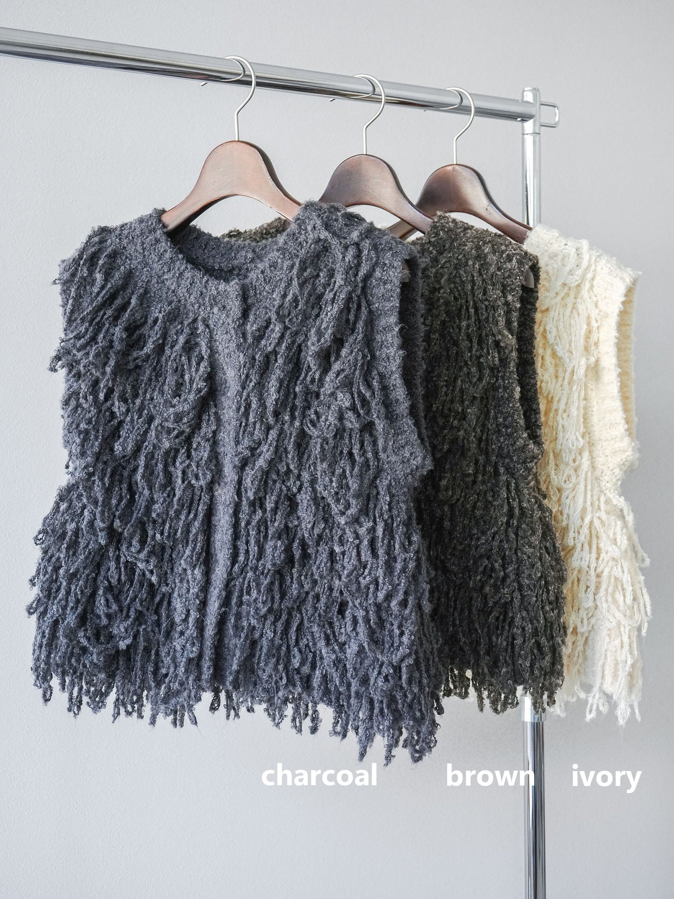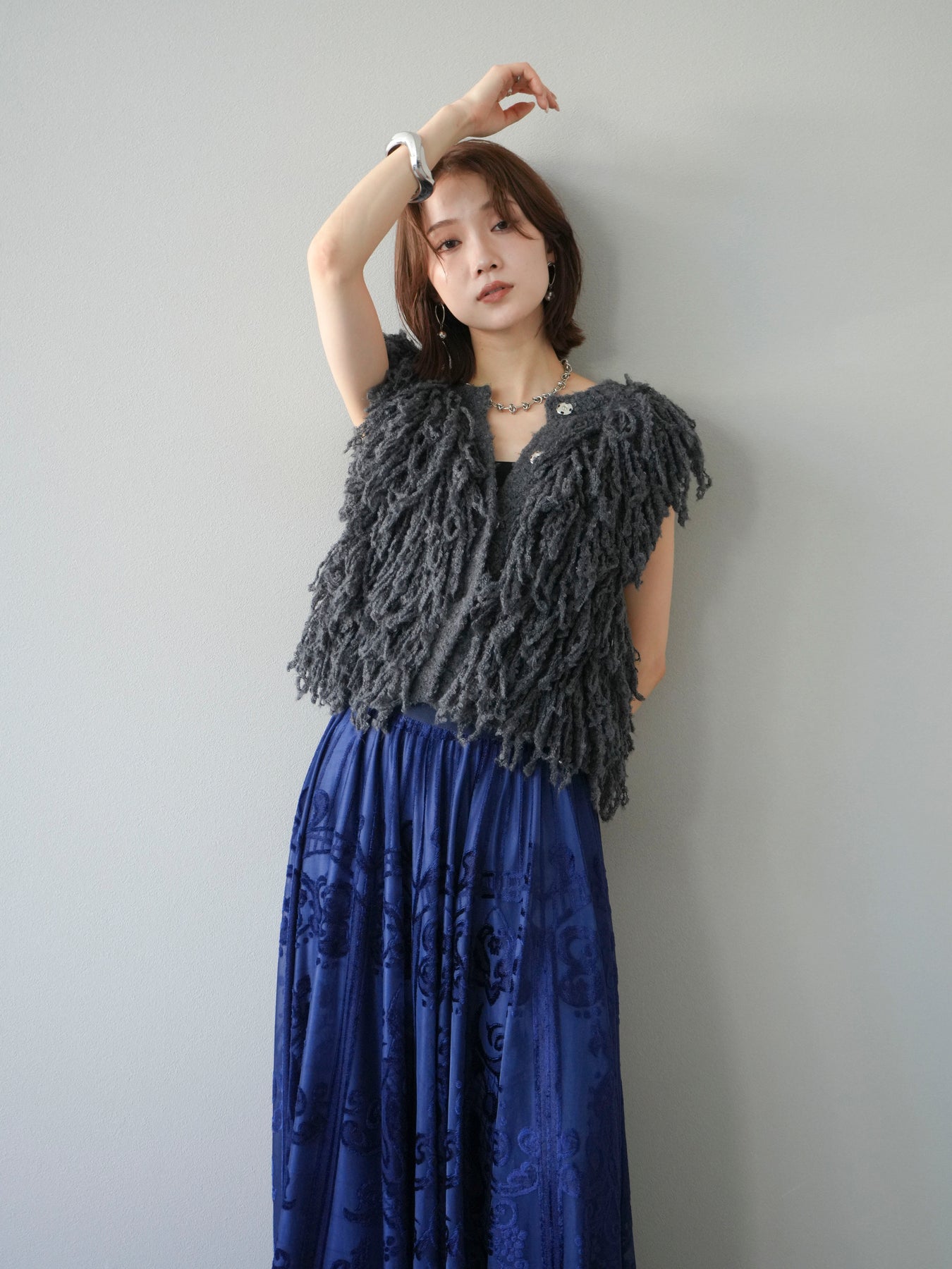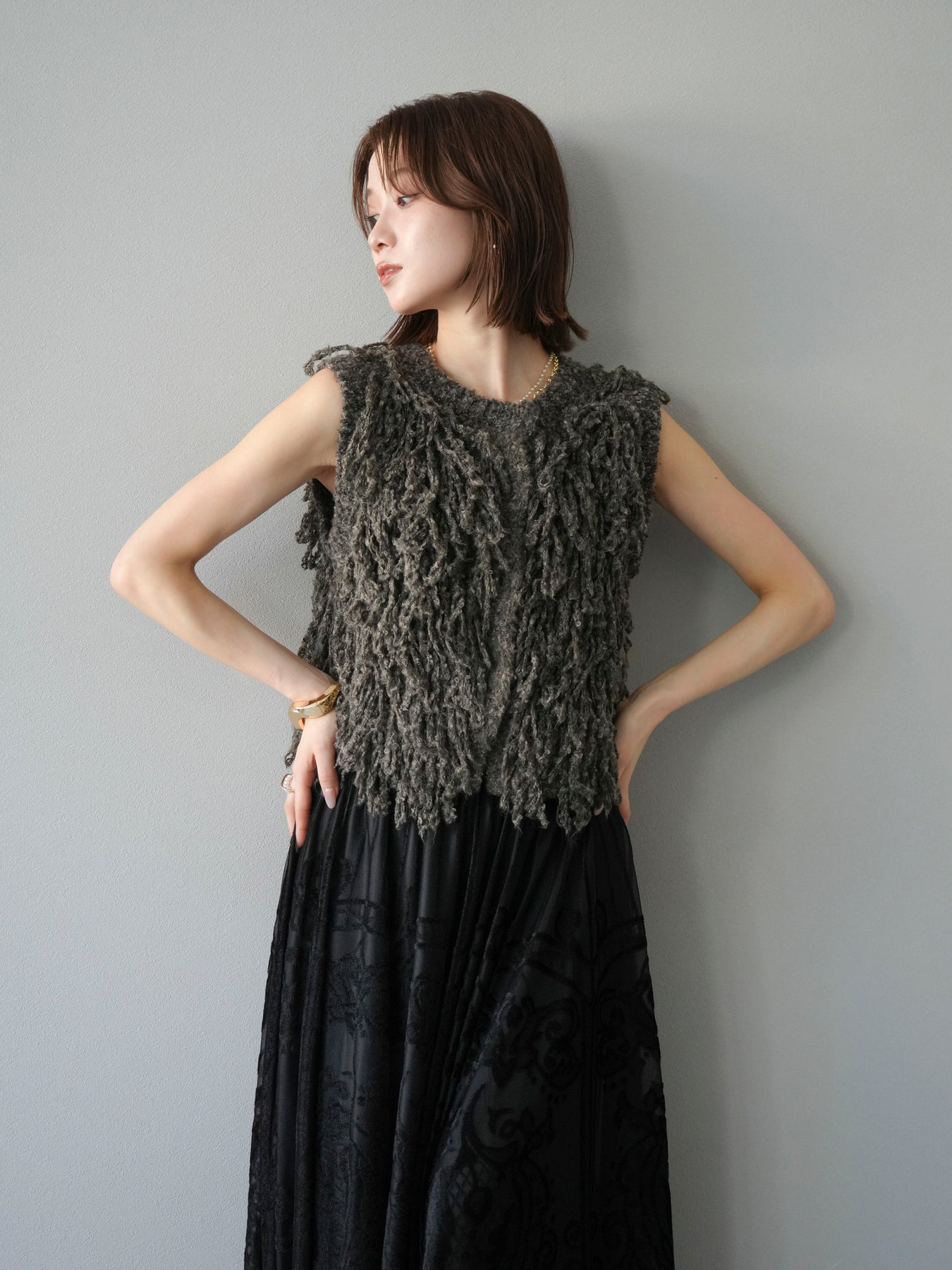 ループ状のフリンジを全体にあしらったデザイン性の高いニットベスト。立体感のある編地が存在感を放ち、シンプルなコーディネートにプラスするだけで華やぎを与えてくれます。程よくコンパクトな丈感でボトムスとのバランスが取りやすく、パンツスタイルにもスカートにも好相性。シャツやカットソーにレイヤードすることで季節を問わず活躍し、トレンド感あふれるスタイリングが完成します。軽やかな着心地で、アクセサリーとの相性も良く、着こなしをアップデートしてくれる一枚です。 ※ボトムス、キャミソール(インナー)以外の商品は一律でインナーは付属していません。