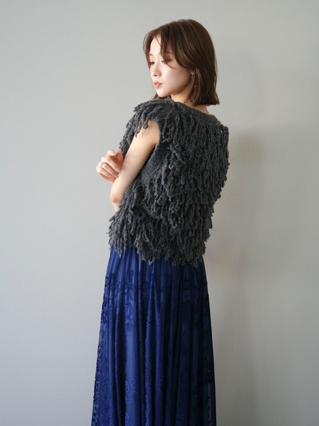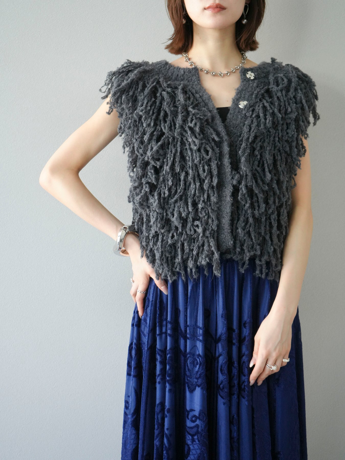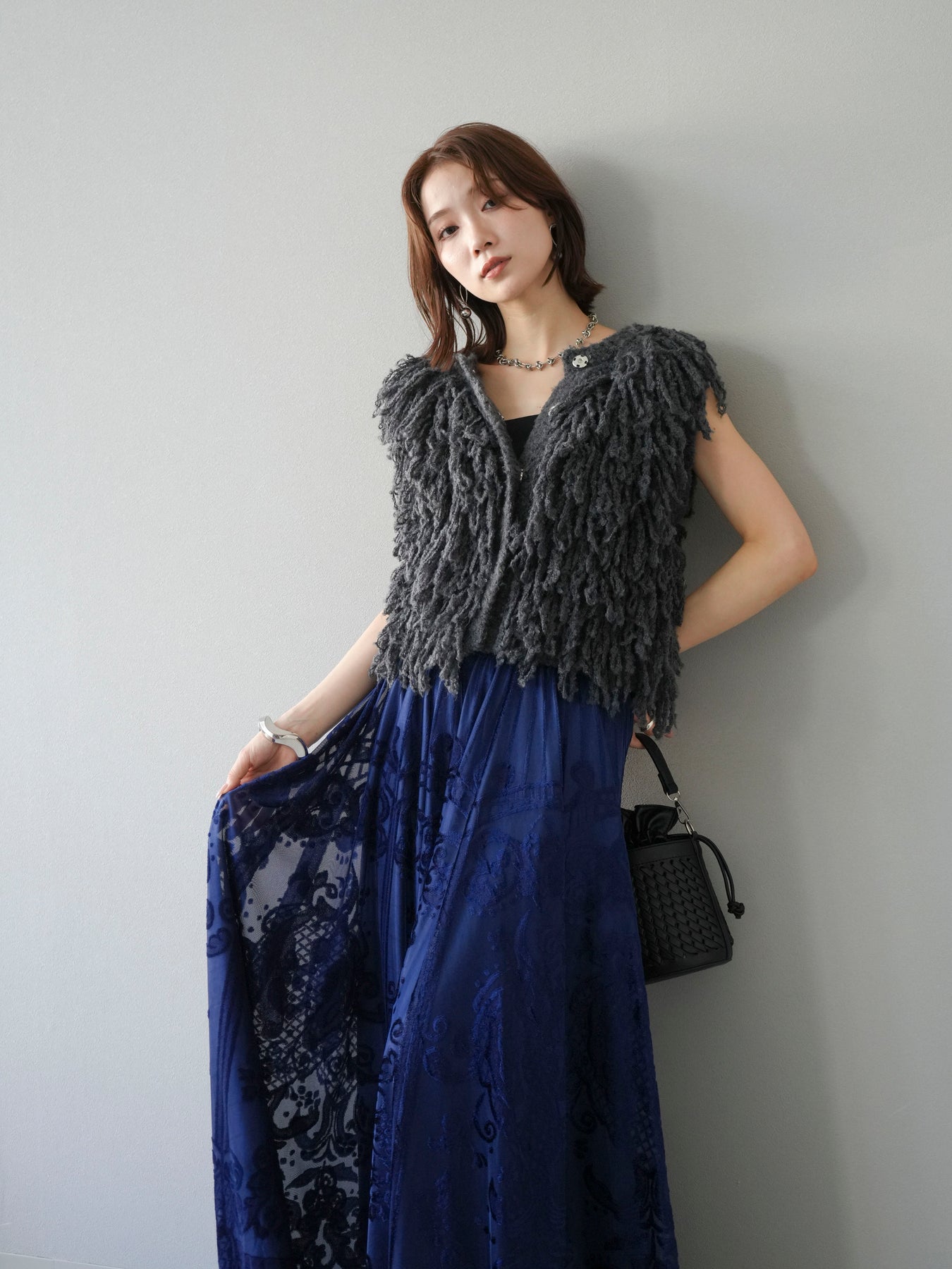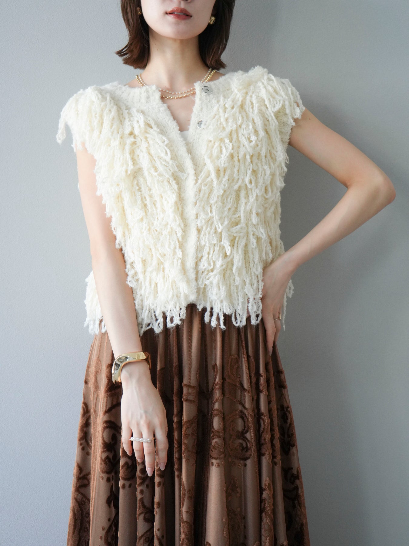 ループ状のフリンジを全体にあしらったデザイン性の高いニットベスト。立体感のある編地が存在感を放ち、シンプルなコーディネートにプラスするだけで華やぎを与えてくれます。程よくコンパクトな丈感でボトムスとのバランスが取りやすく、パンツスタイルにもスカートにも好相性。シャツやカットソーにレイヤードすることで季節を問わず活躍し、トレンド感あふれるスタイリングが完成します。軽やかな着心地で、アクセサリーとの相性も良く、着こなしをアップデートしてくれる一枚です。 ※ボトムス、キャミソール(インナー)以外の商品は一律でインナーは付属していません。