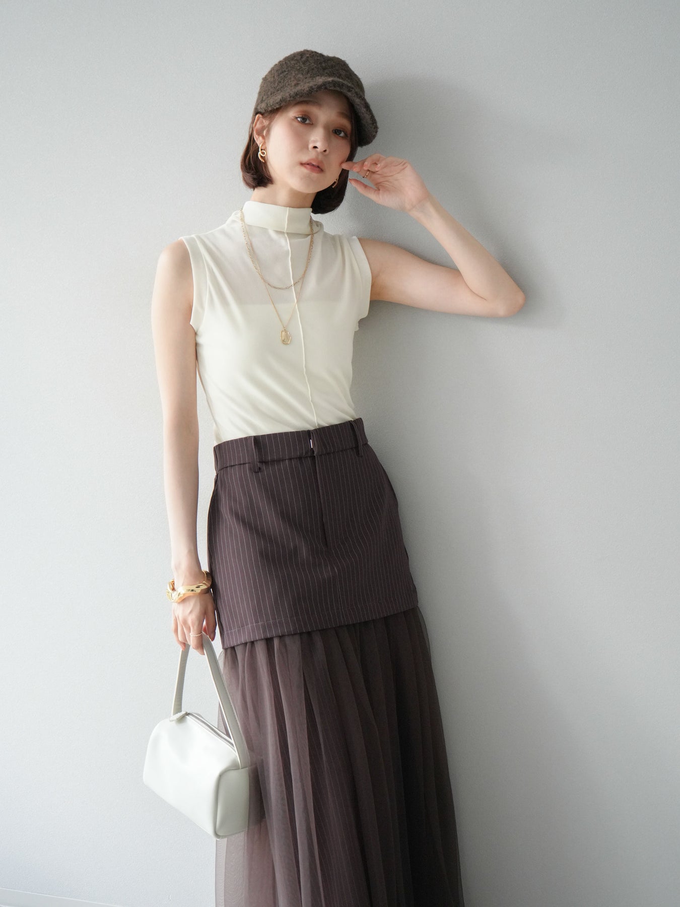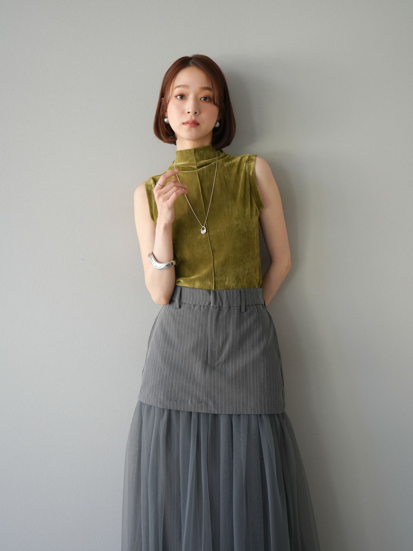 光沢感のあるベロア素材にシアー感をプラスしたプチネックトップス。首元を程よく覆うデザインが上品さを引き立て、コンパクトなシルエットでレイヤードにも重宝します。ノースリーブ仕様で抜け感があり、1枚での着用はもちろん、ジャケットやカーディガンのインナーとしても映える万能アイテム。素材の持つリッチな質感が女性らしい雰囲気を演出し、デイリーから特別なシーンまで幅広く活躍します。シンプルながらも着こなしに奥行きを与えてくれる一枚です。 ※ボトムス、キャミソール(インナー)以外の商品は一律でインナーは付属していません。