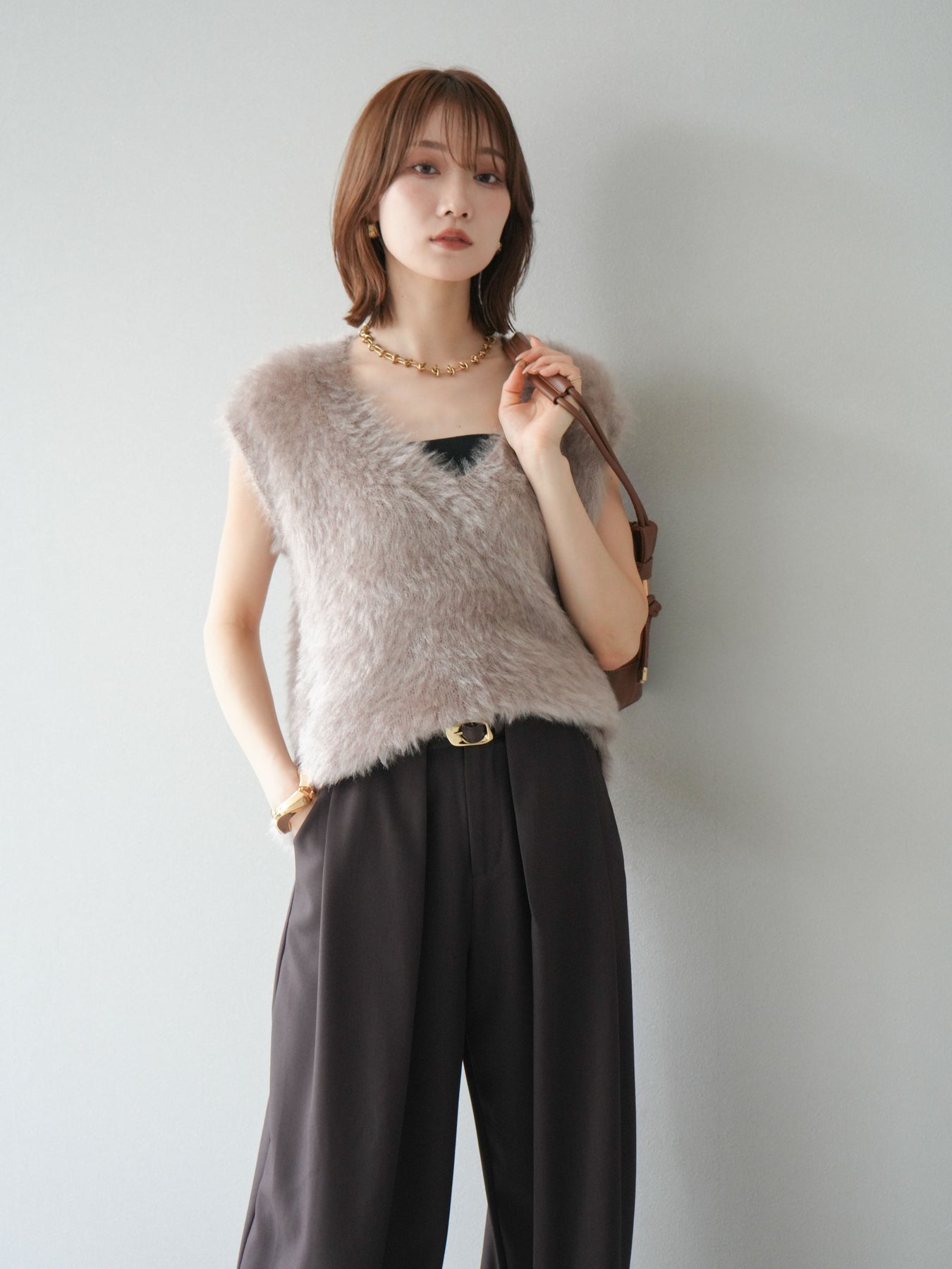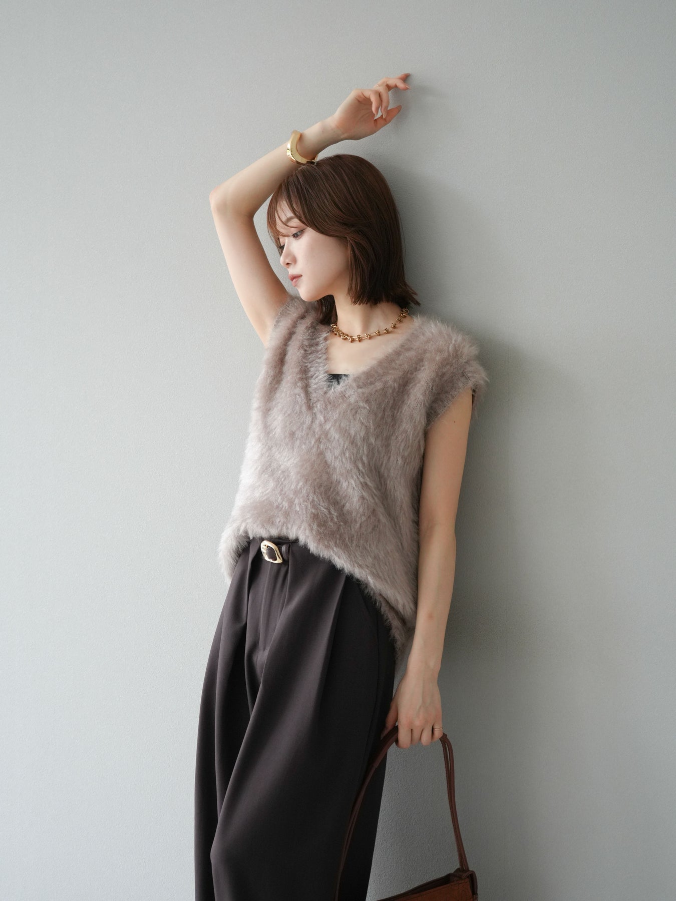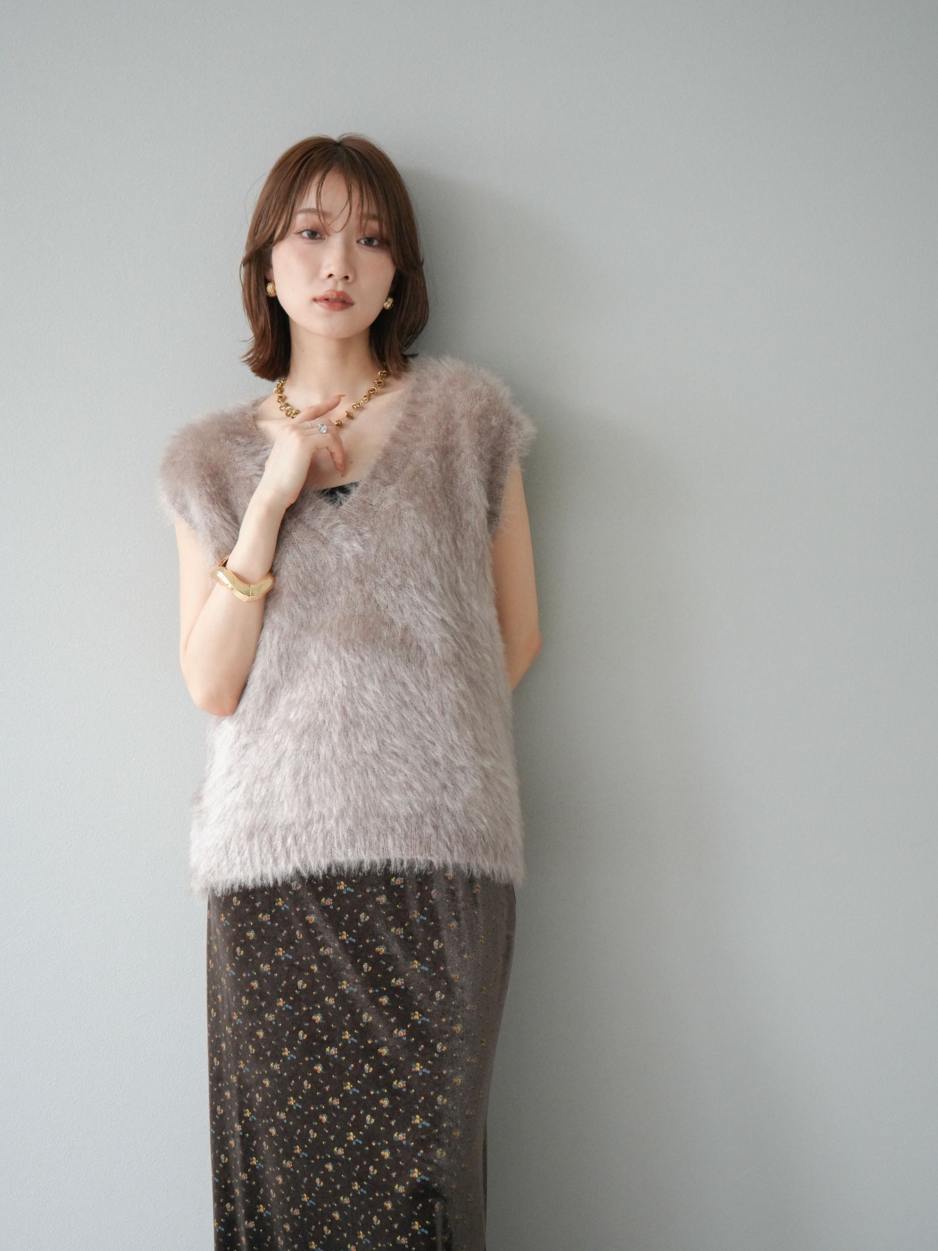 毛足の長いシャギー素材にラメ糸を織り交ぜ、華やかな表情を加えたVネックニットベスト。ふんわりとした風合いがシーズンムードを高め、着るだけでスタイリングに存在感をプラスします。深めのVネックが顔まわりをすっきりと見せ、シャツやカットソーとのレイヤードにも最適。程よい丈感でボトムスを選ばず、パンツにもスカートにも好相性です。カジュアルからフェミニンまで幅広く活躍し、デイリーコーデを格上げしてくれるアイテムです。 ※ボトムス、キャミソール(インナー)以外の商品は一律でインナーは付属していません。