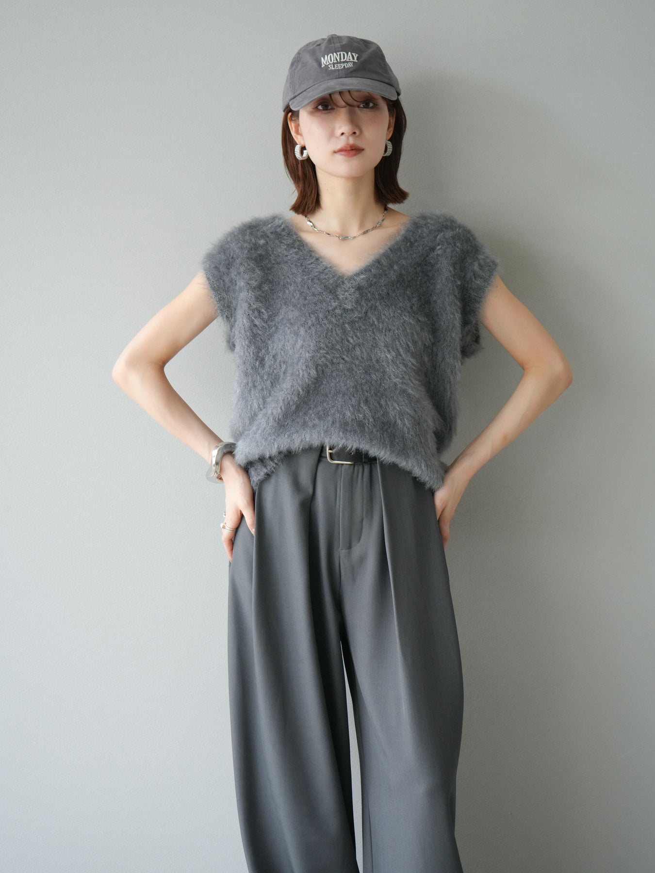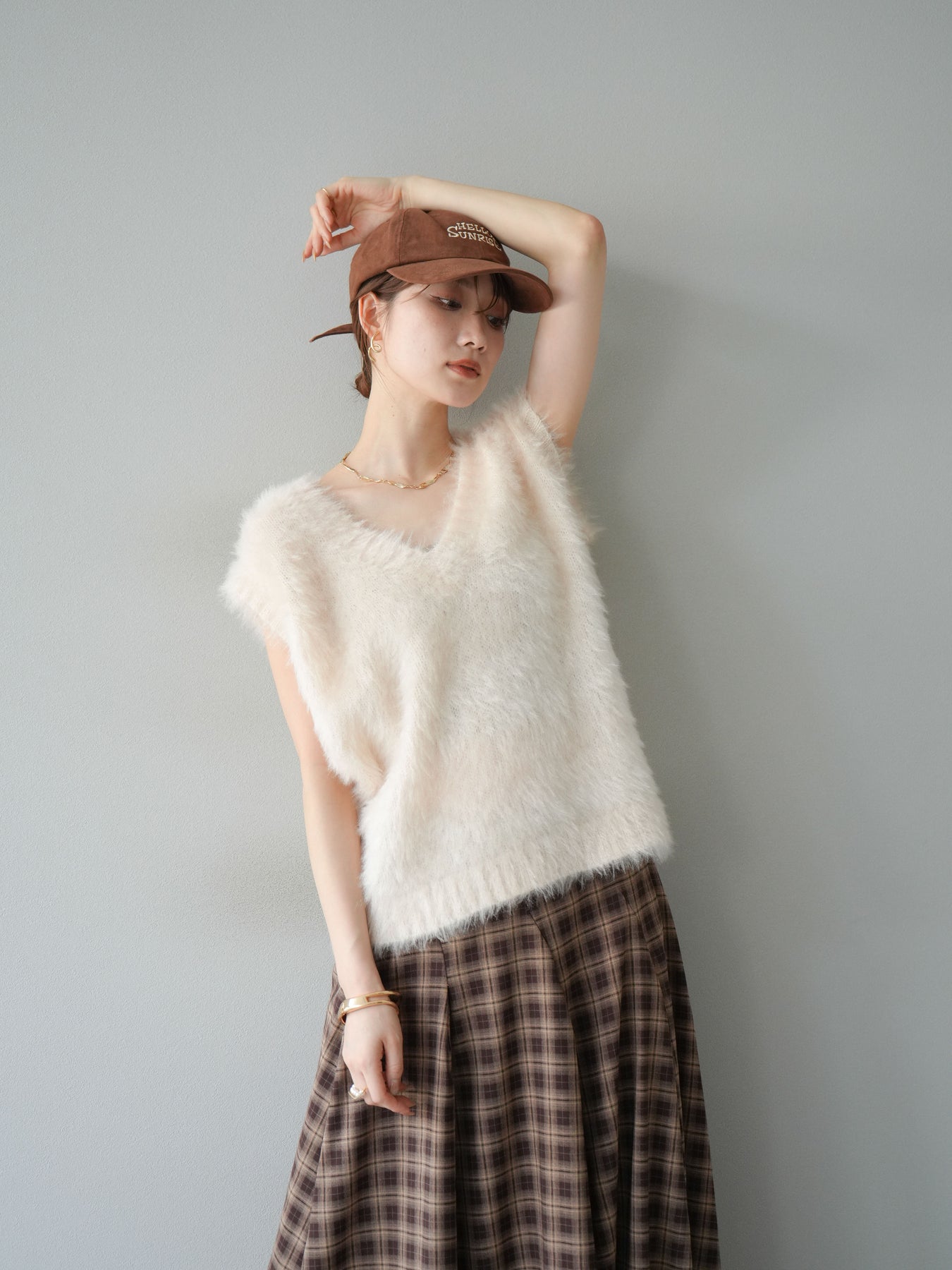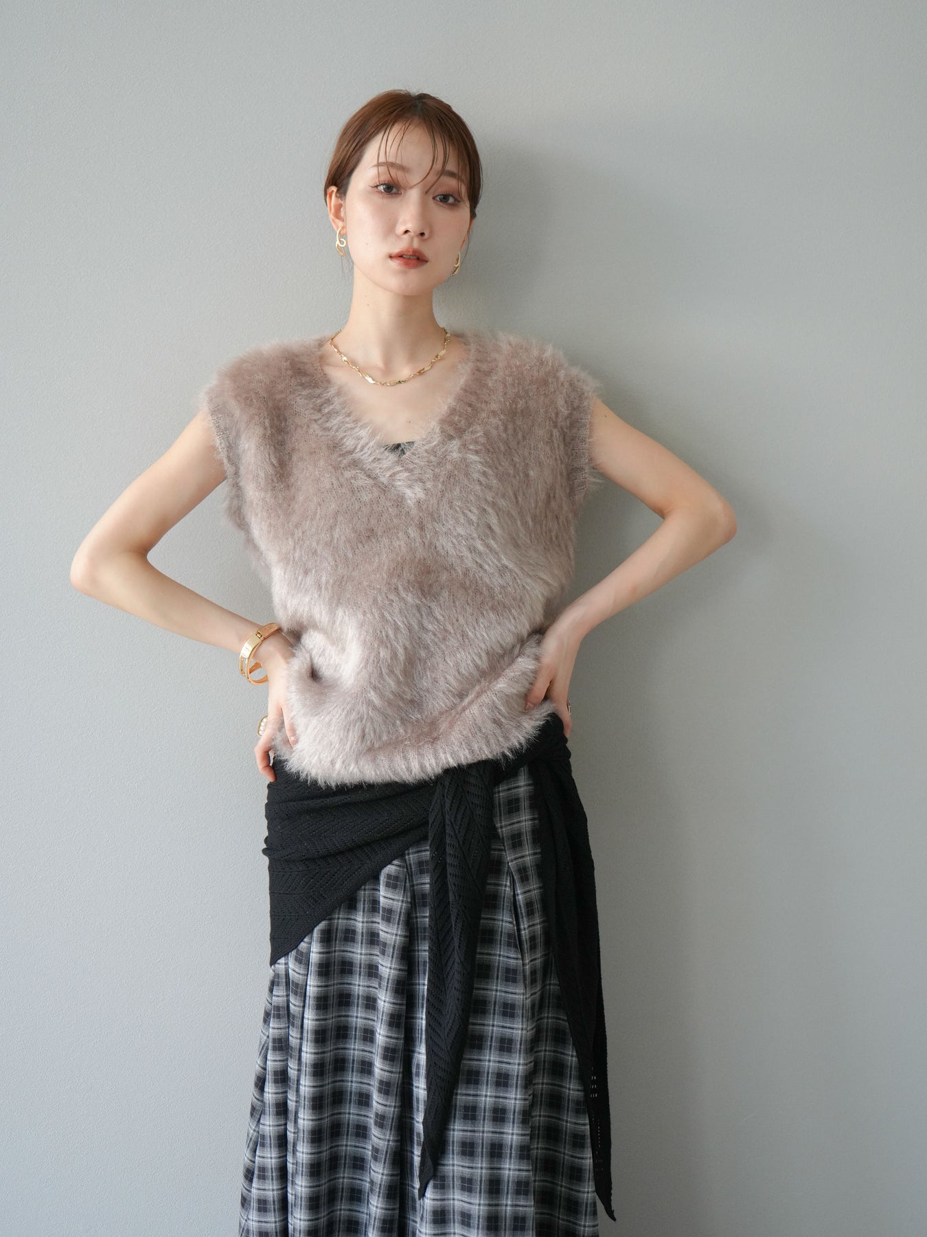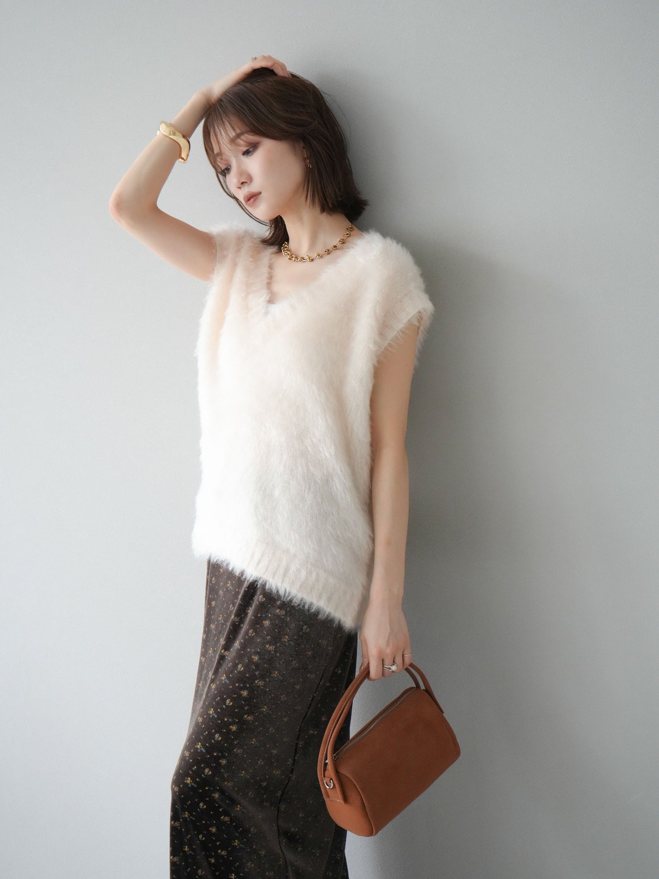 毛足の長いシャギー素材にラメ糸を織り交ぜ、華やかな表情を加えたVネックニットベスト。ふんわりとした風合いがシーズンムードを高め、着るだけでスタイリングに存在感をプラスします。深めのVネックが顔まわりをすっきりと見せ、シャツやカットソーとのレイヤードにも最適。程よい丈感でボトムスを選ばず、パンツにもスカートにも好相性です。カジュアルからフェミニンまで幅広く活躍し、デイリーコーデを格上げしてくれるアイテムです。 ※ボトムス、キャミソール(インナー)以外の商品は一律でインナーは付属していません。