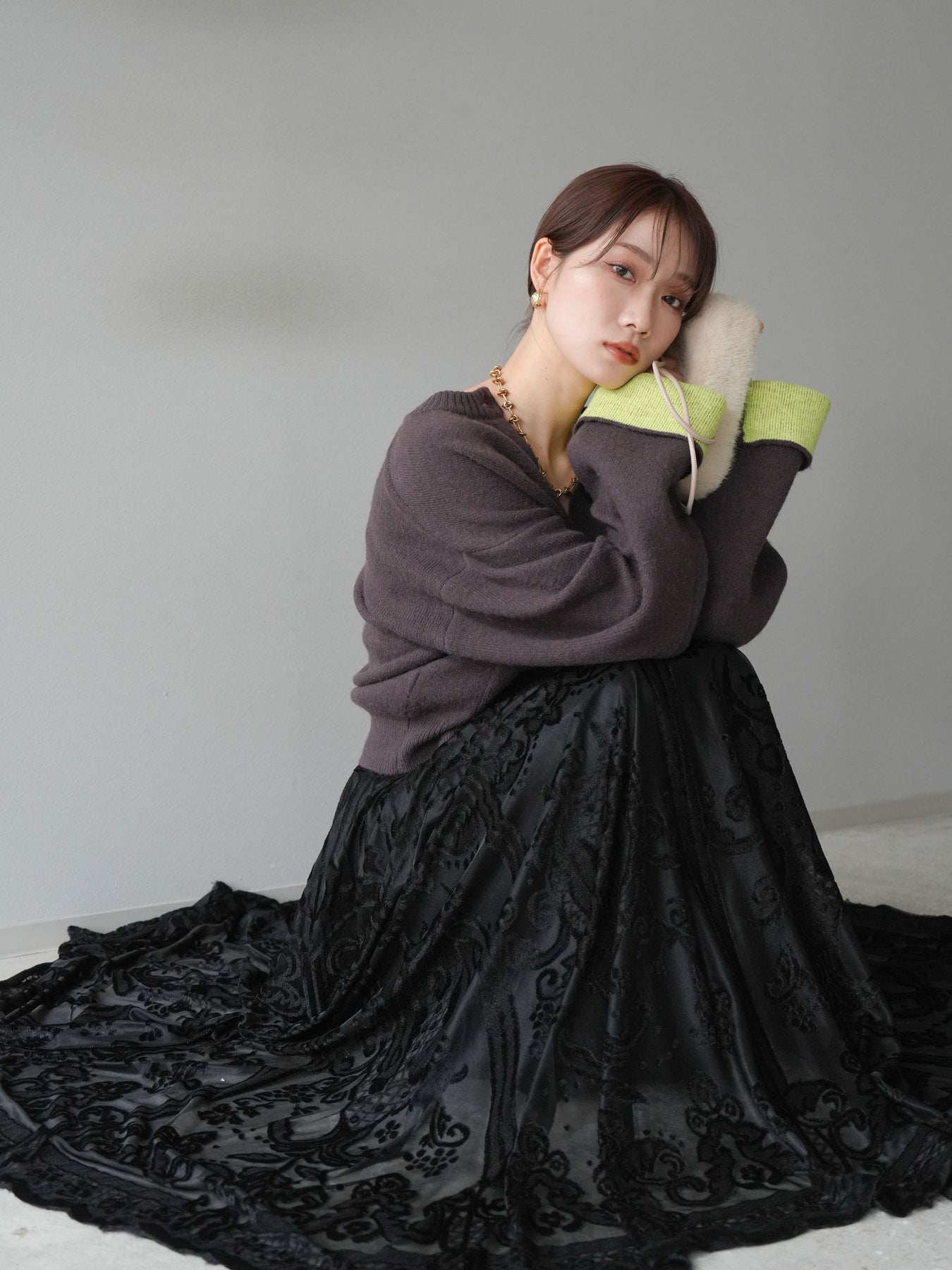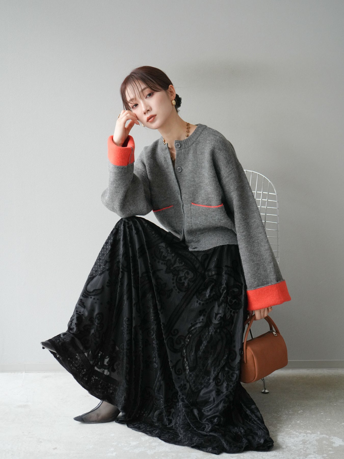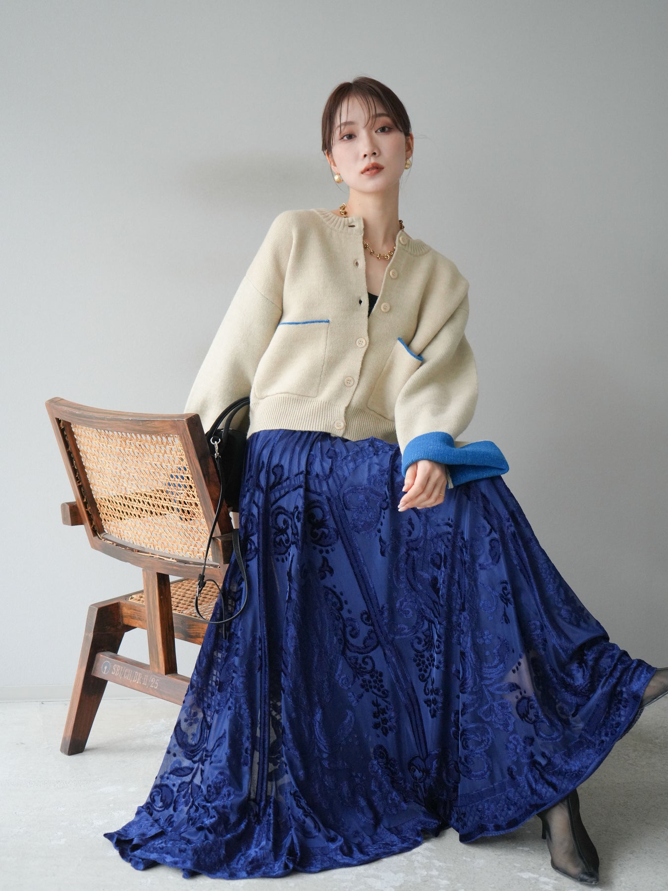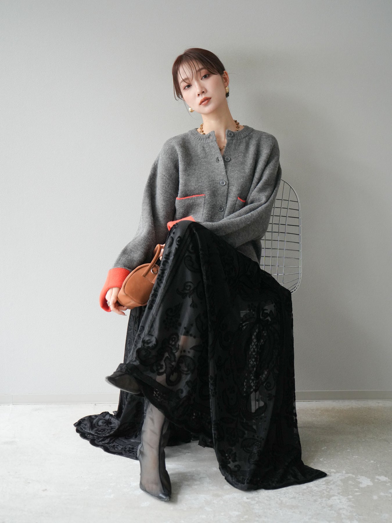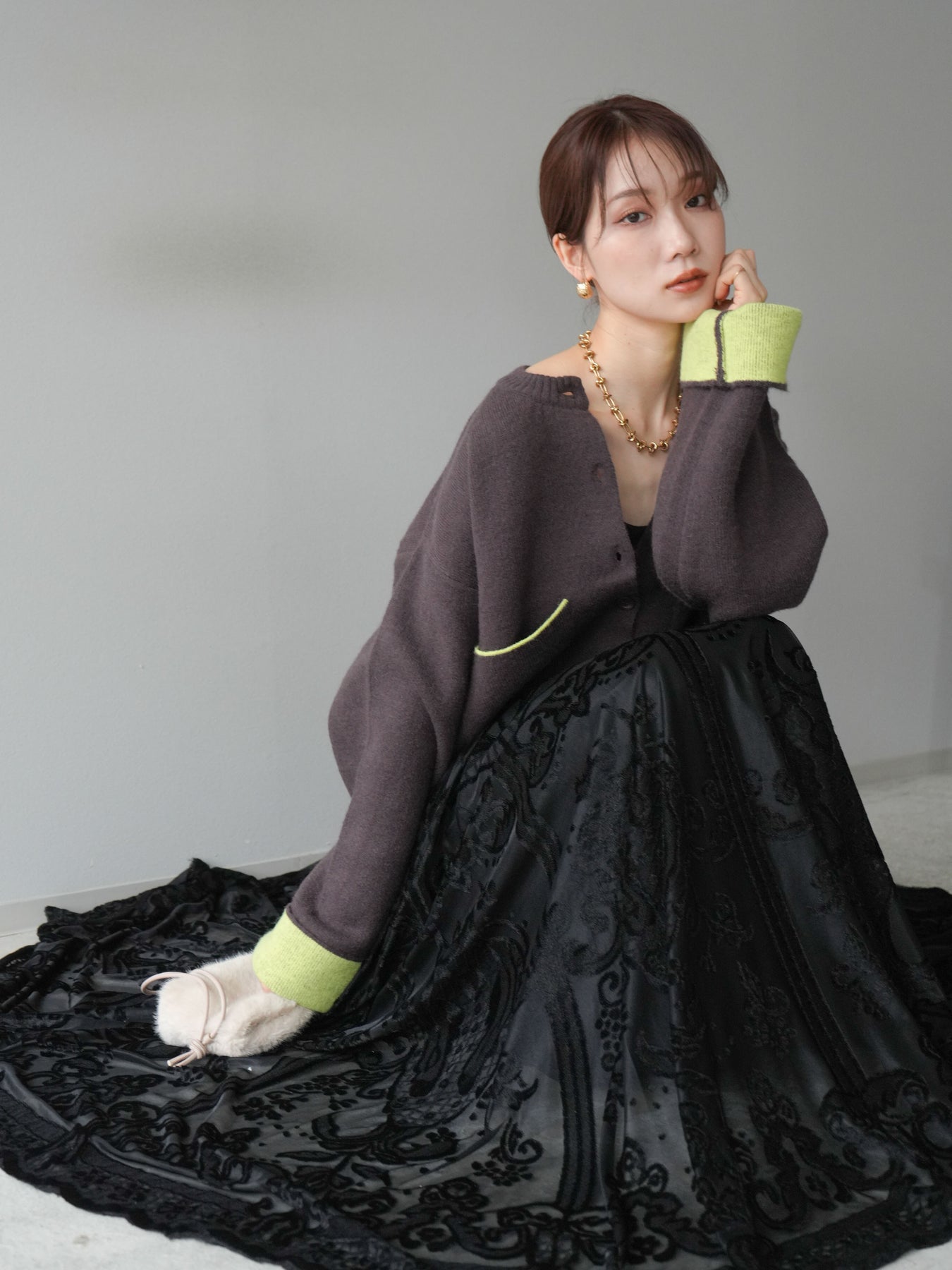 [SET]バイカラーオーバーニットカーディガン+アンティーク柄フロッキーマキシスカート(2set)