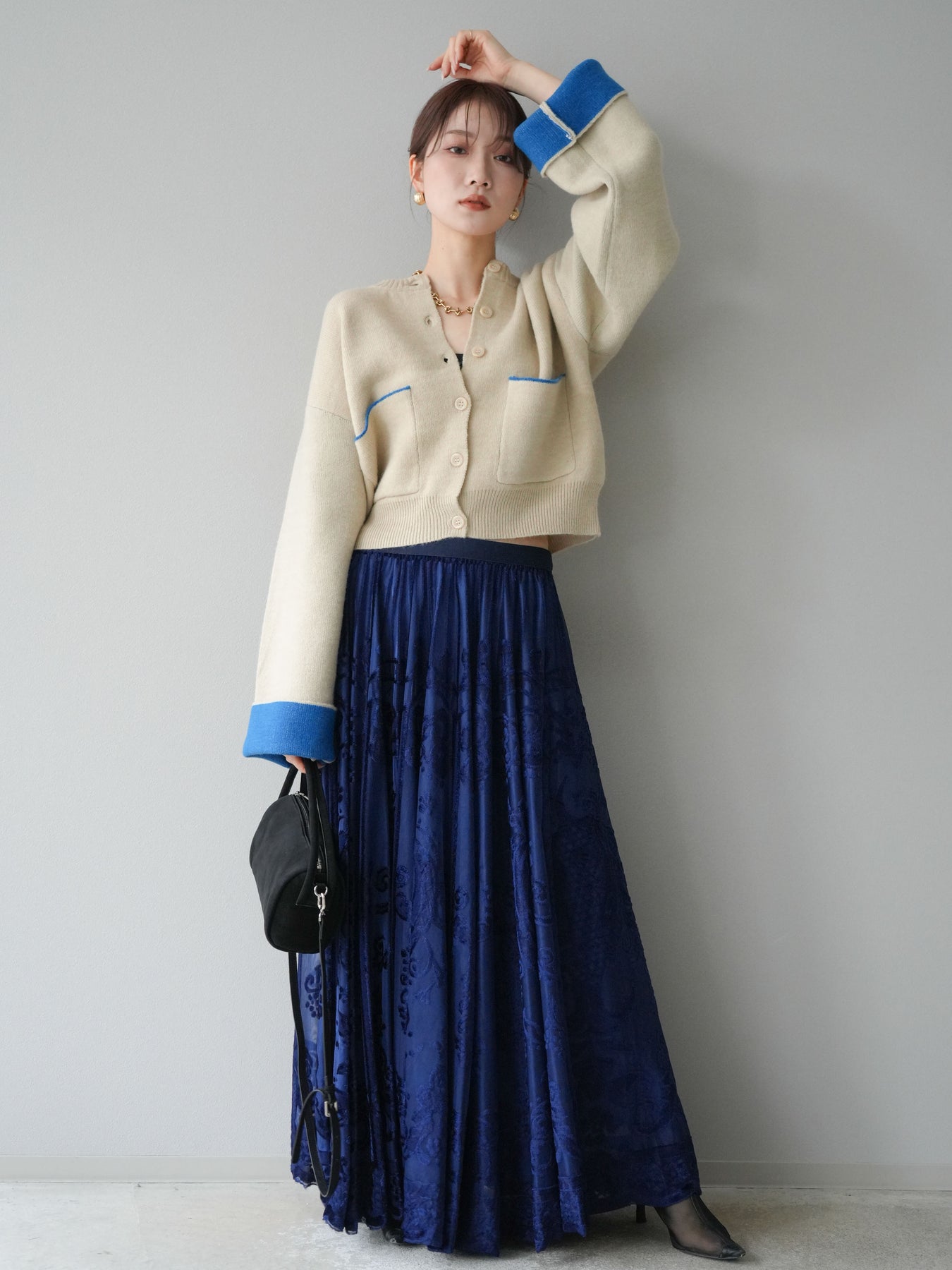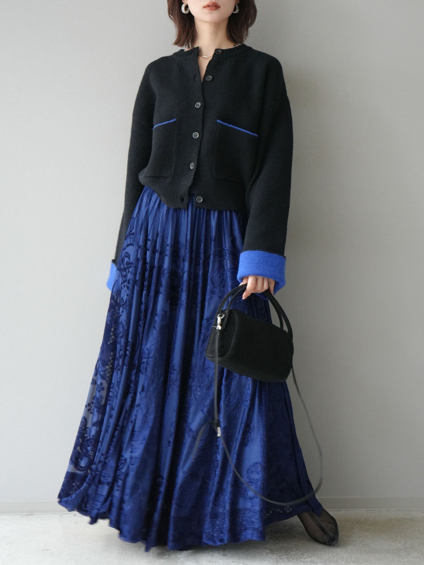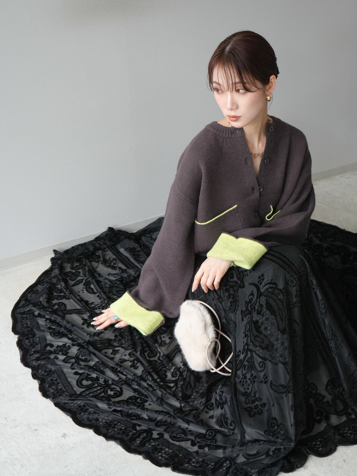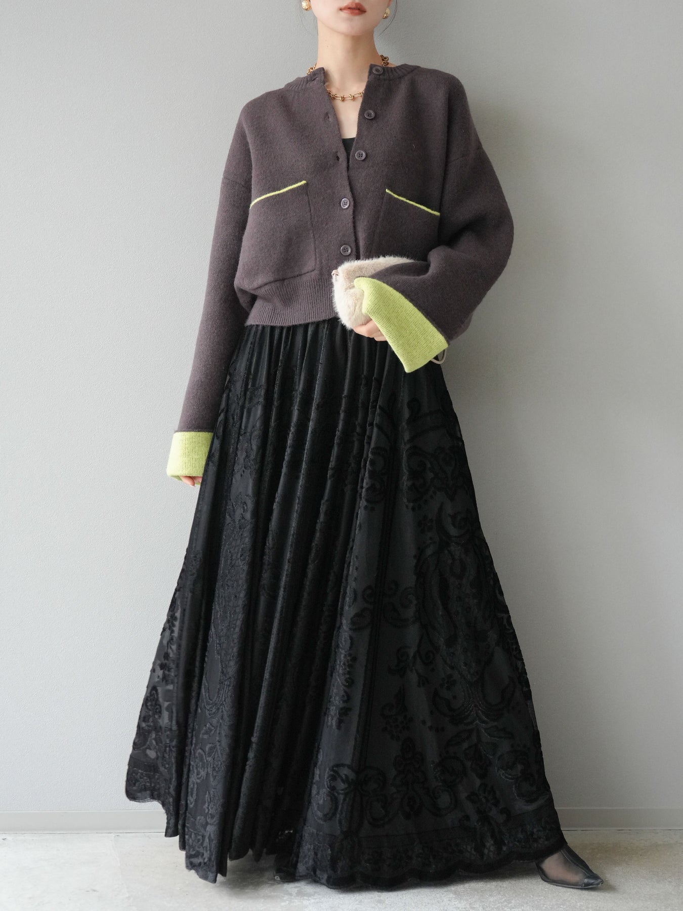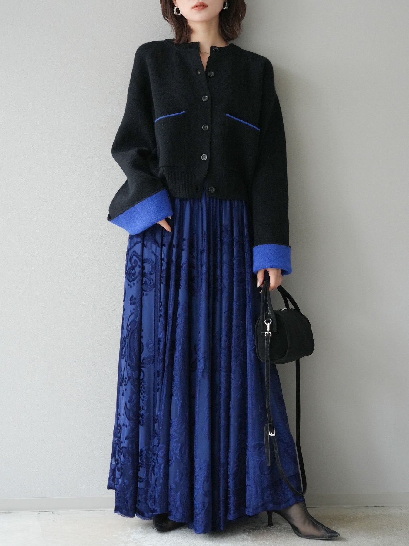 [SET]バイカラーオーバーニットカーディガン+アンティーク柄フロッキーマキシスカート(2set)