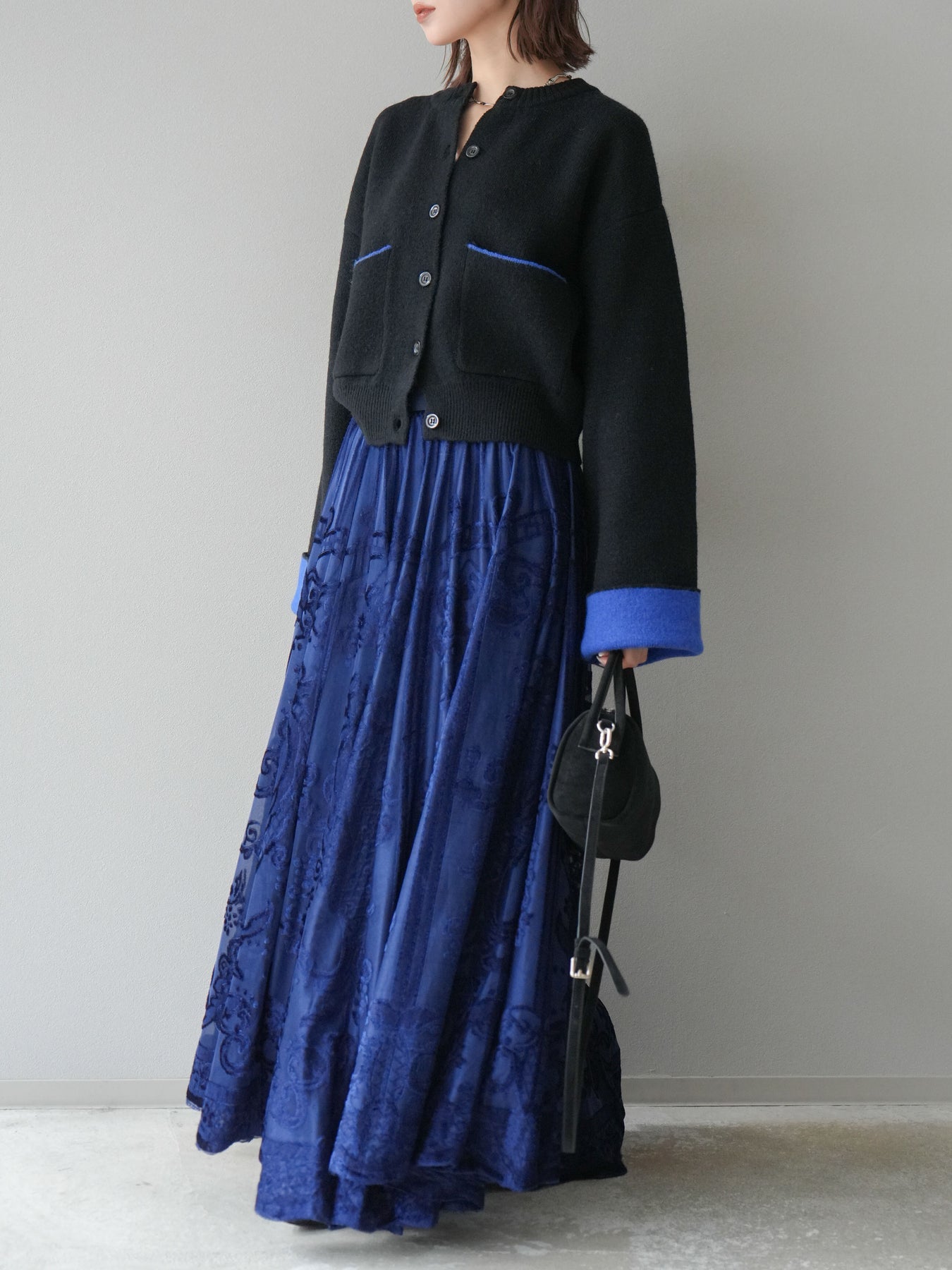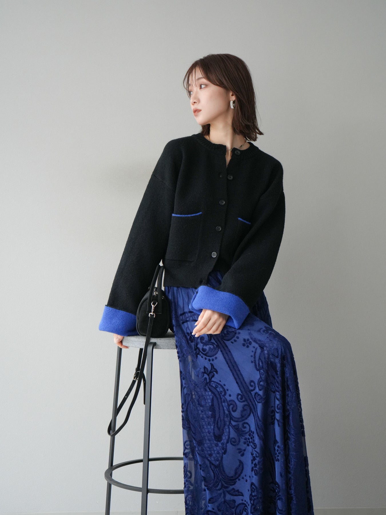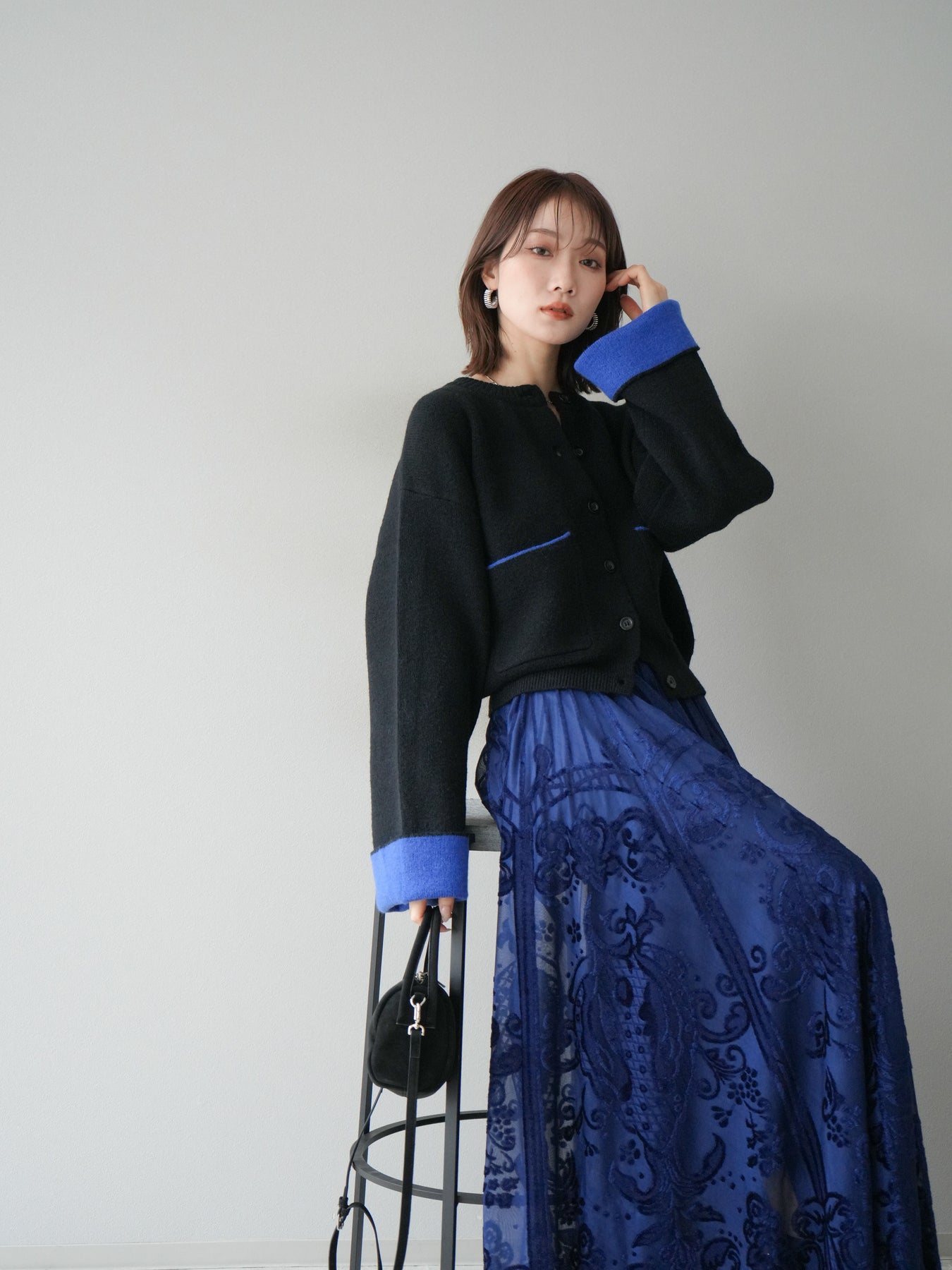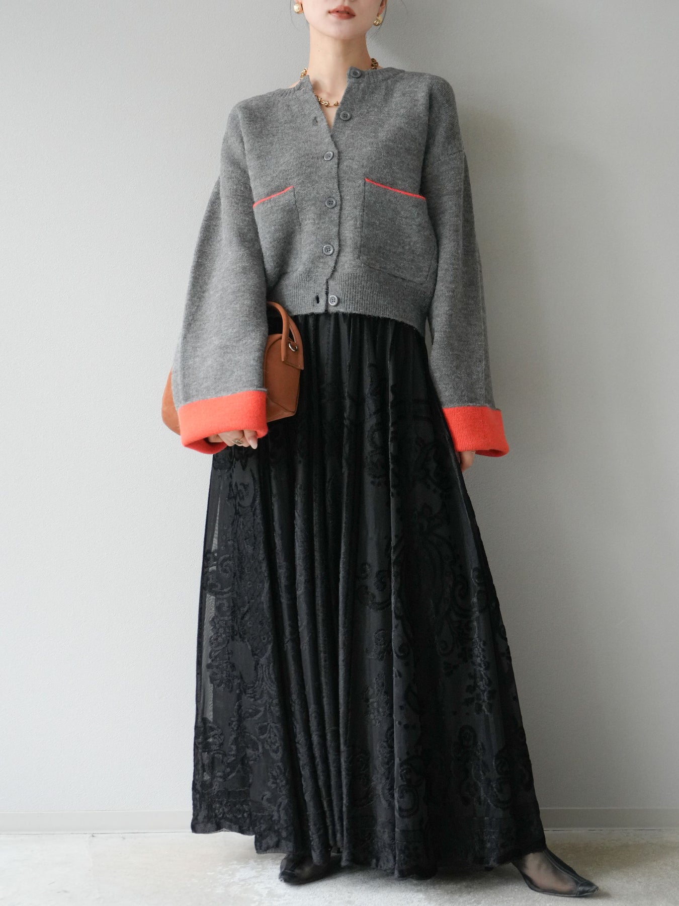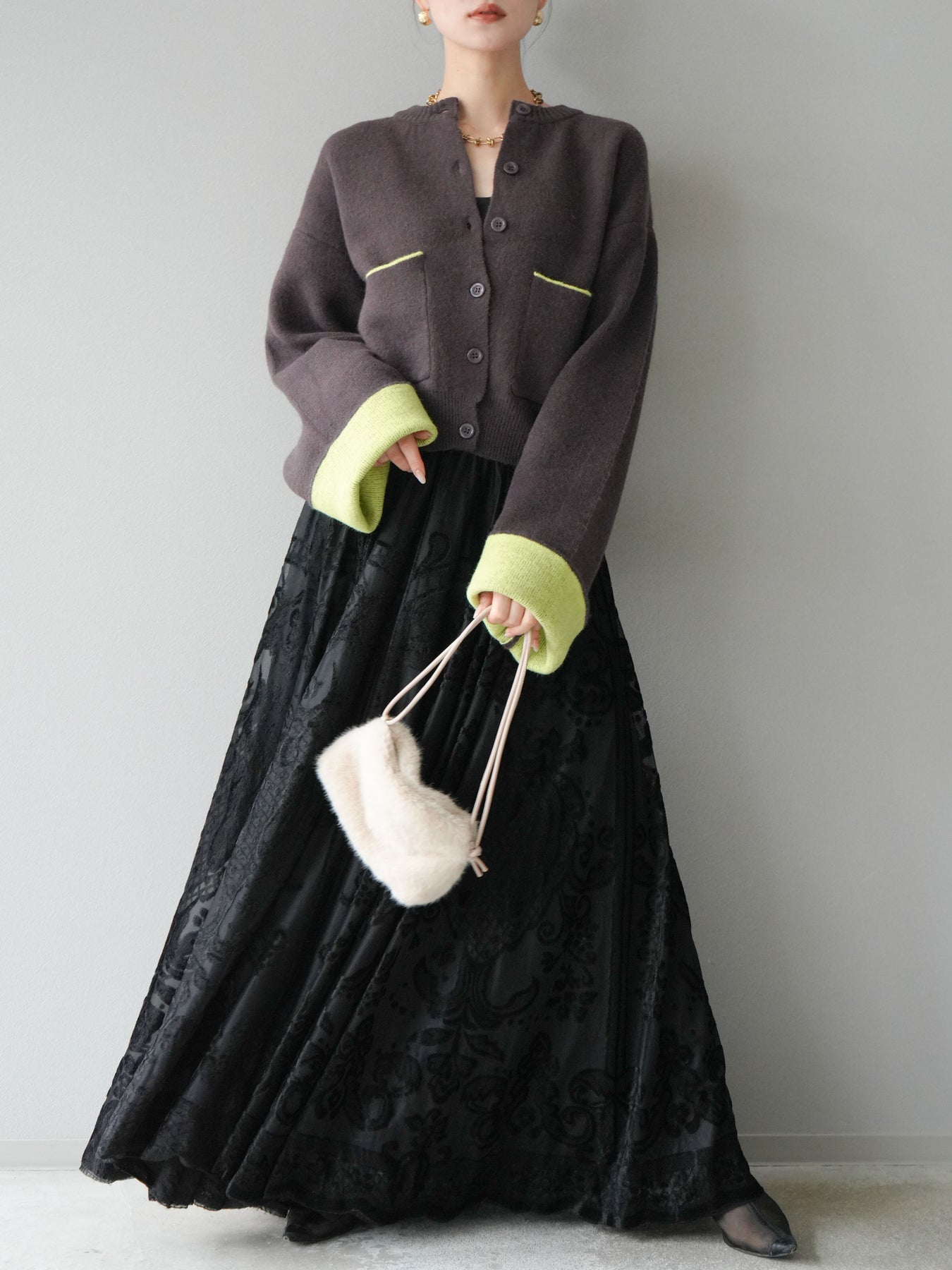 [SET]バイカラーオーバーニットカーディガン+アンティーク柄フロッキーマキシスカート(2set)