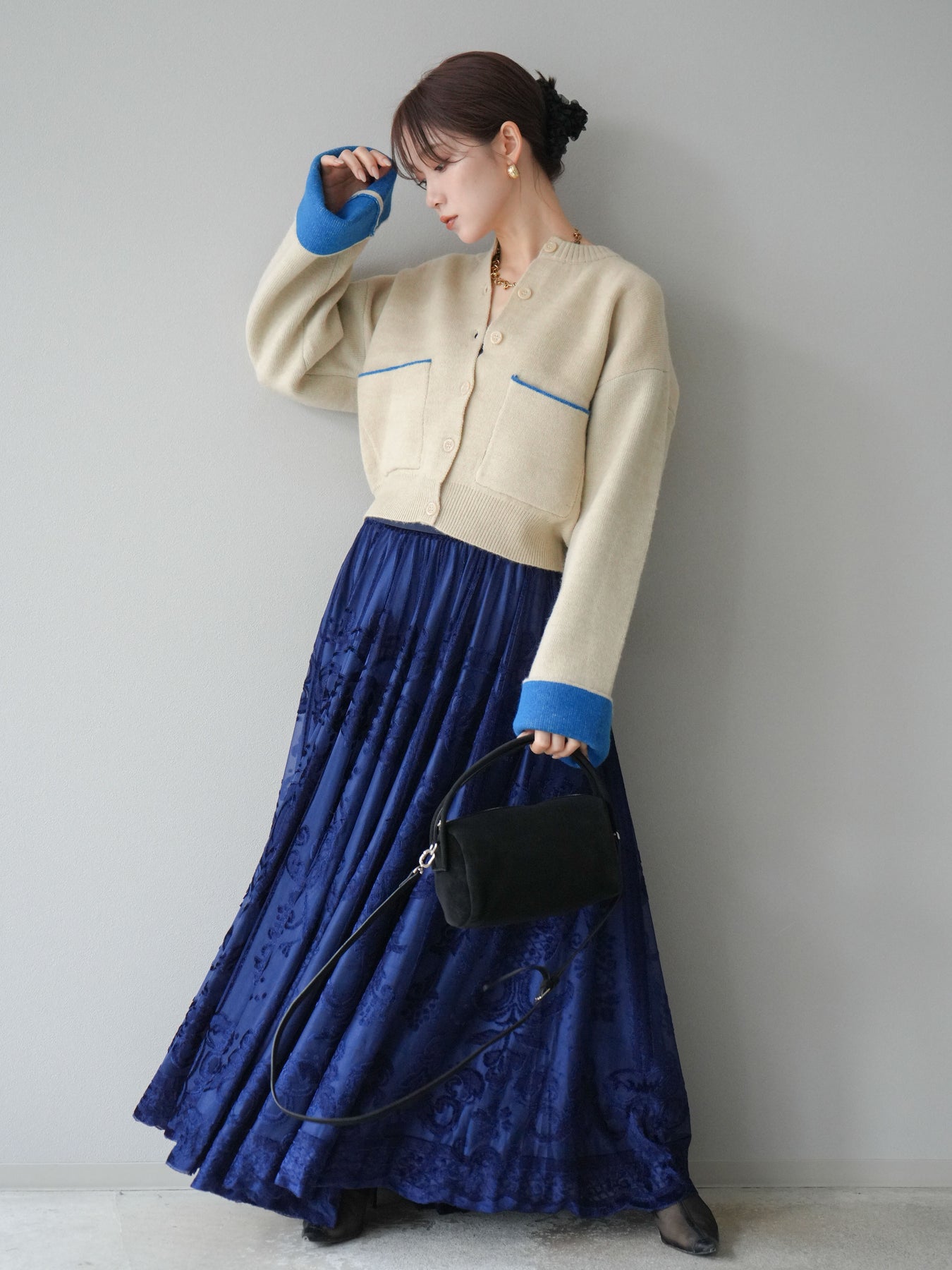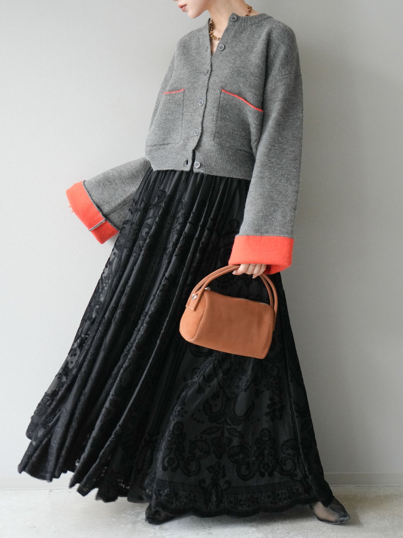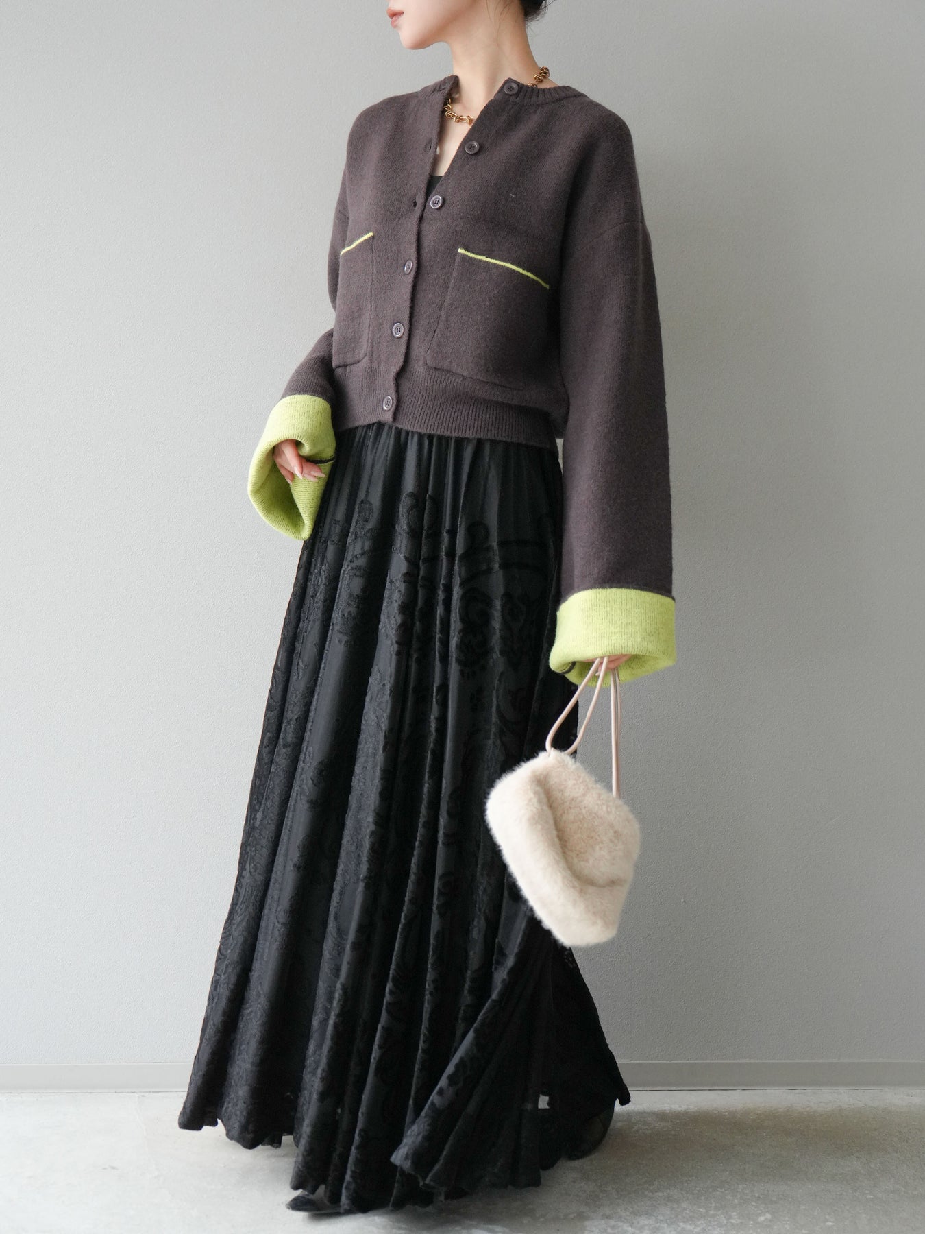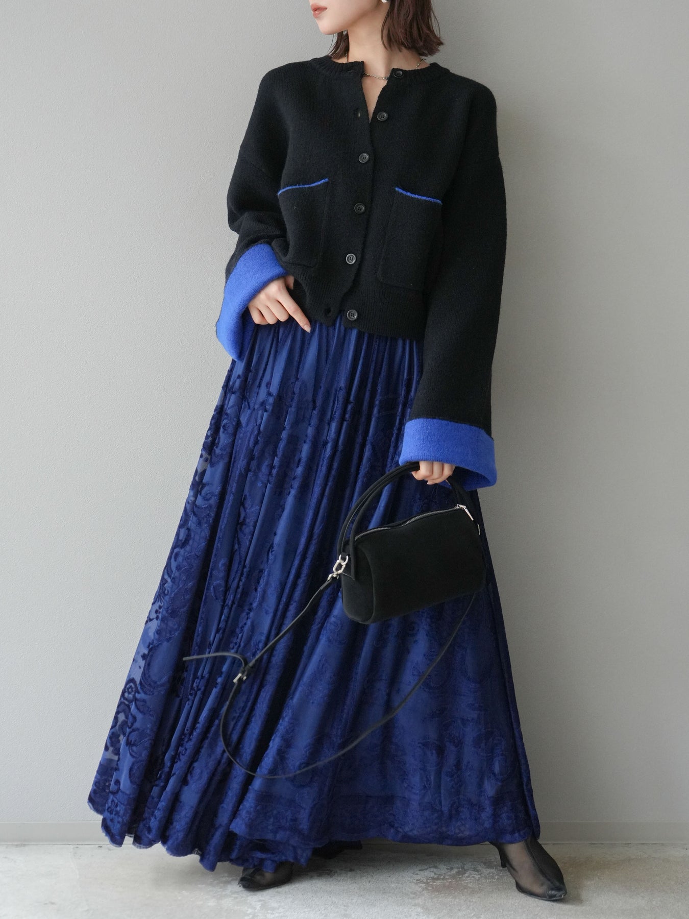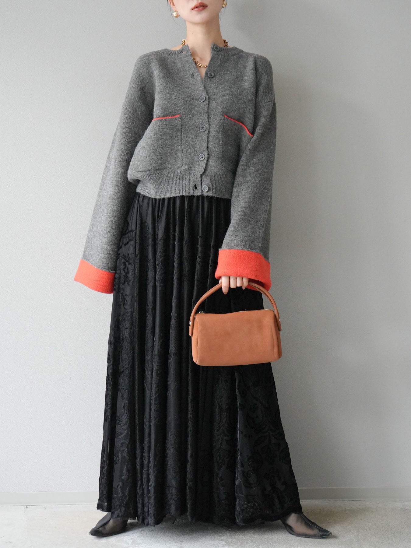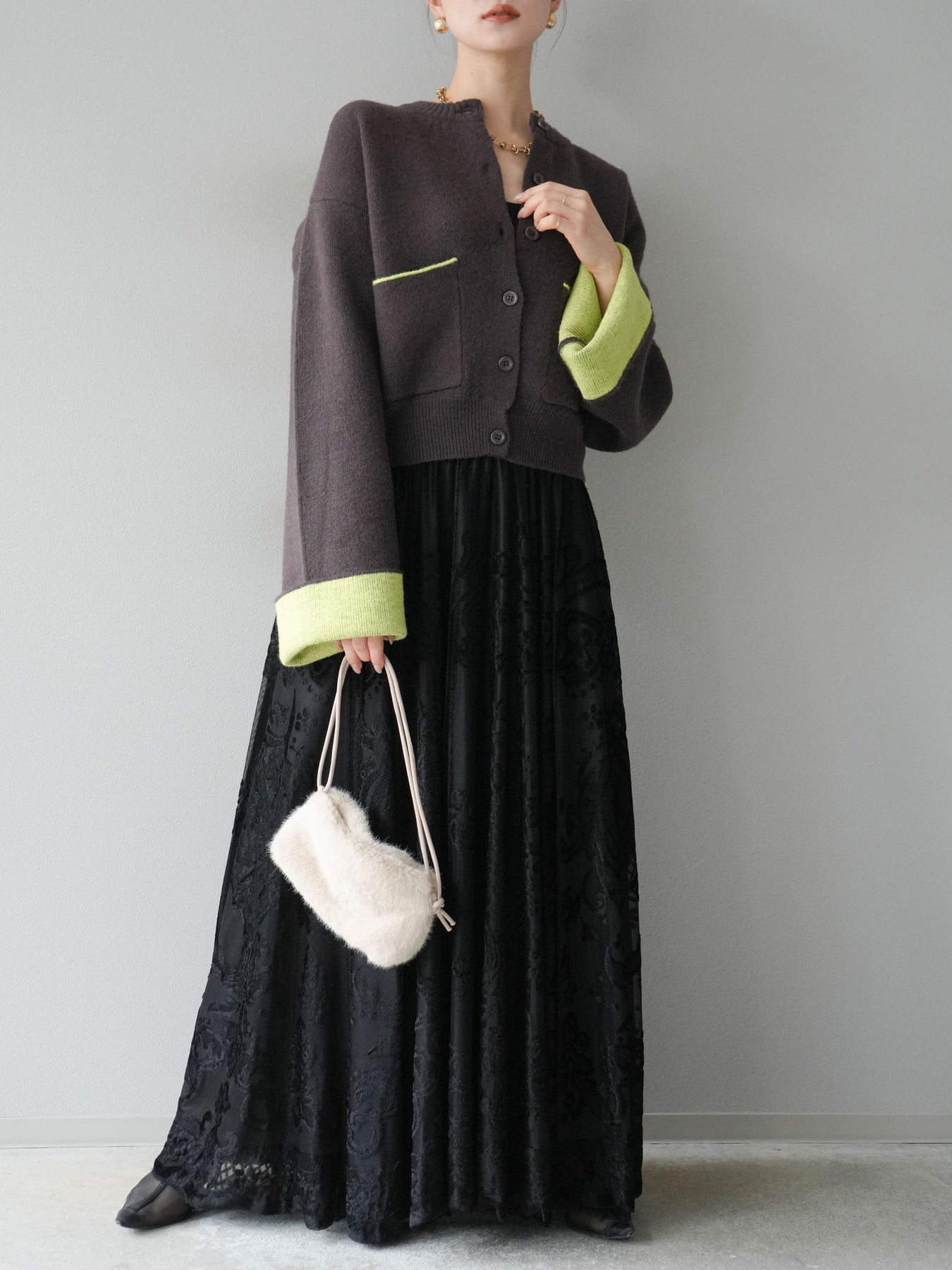 [SET]バイカラーオーバーニットカーディガン+アンティーク柄フロッキーマキシスカート(2set)