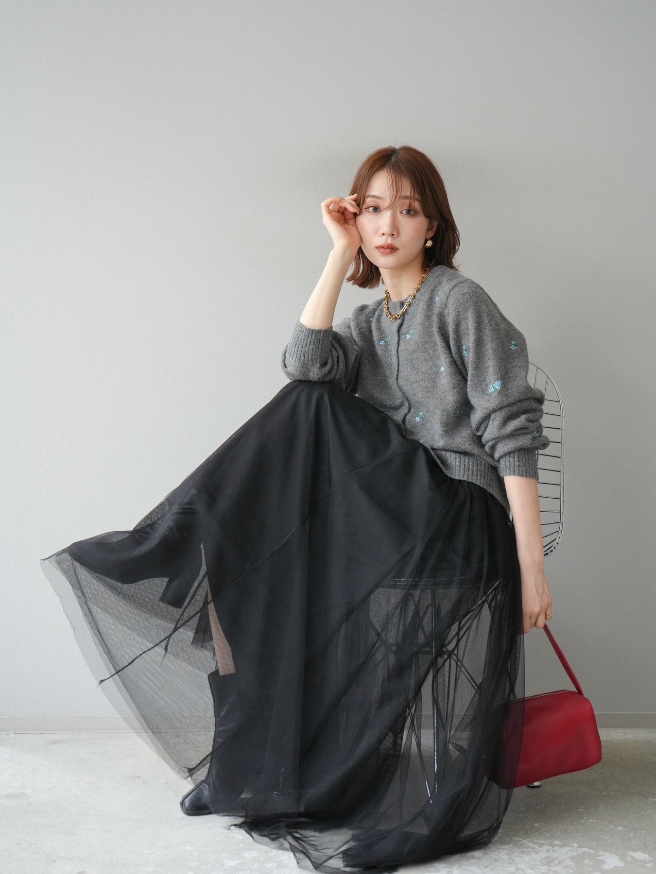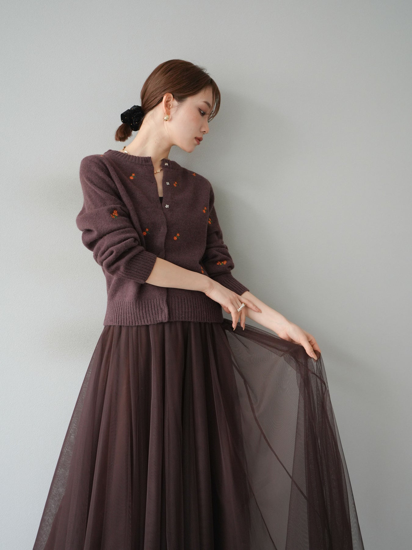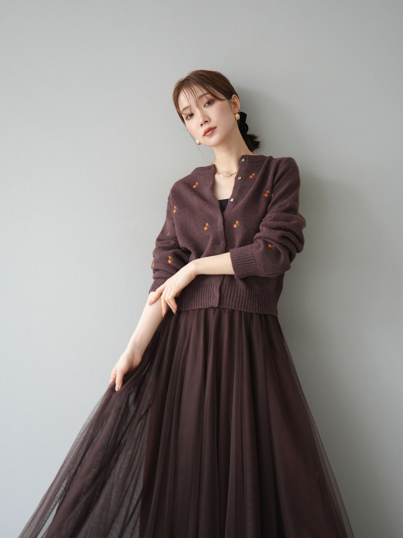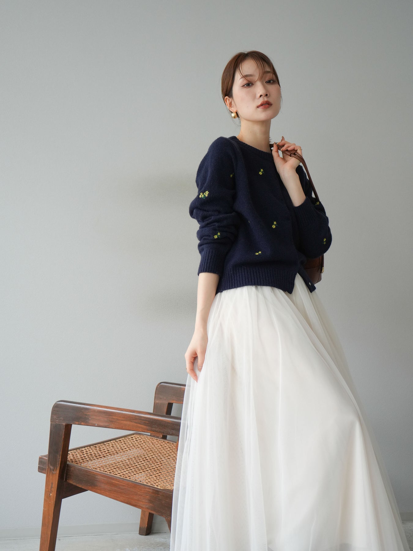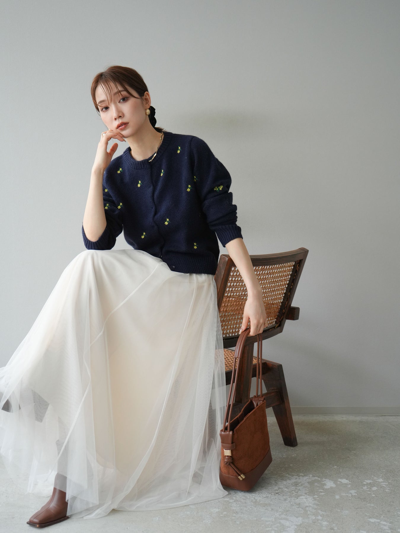 [SET]フラワー刺繍ニットカーディガン+チュールボリュームスカート(2set)