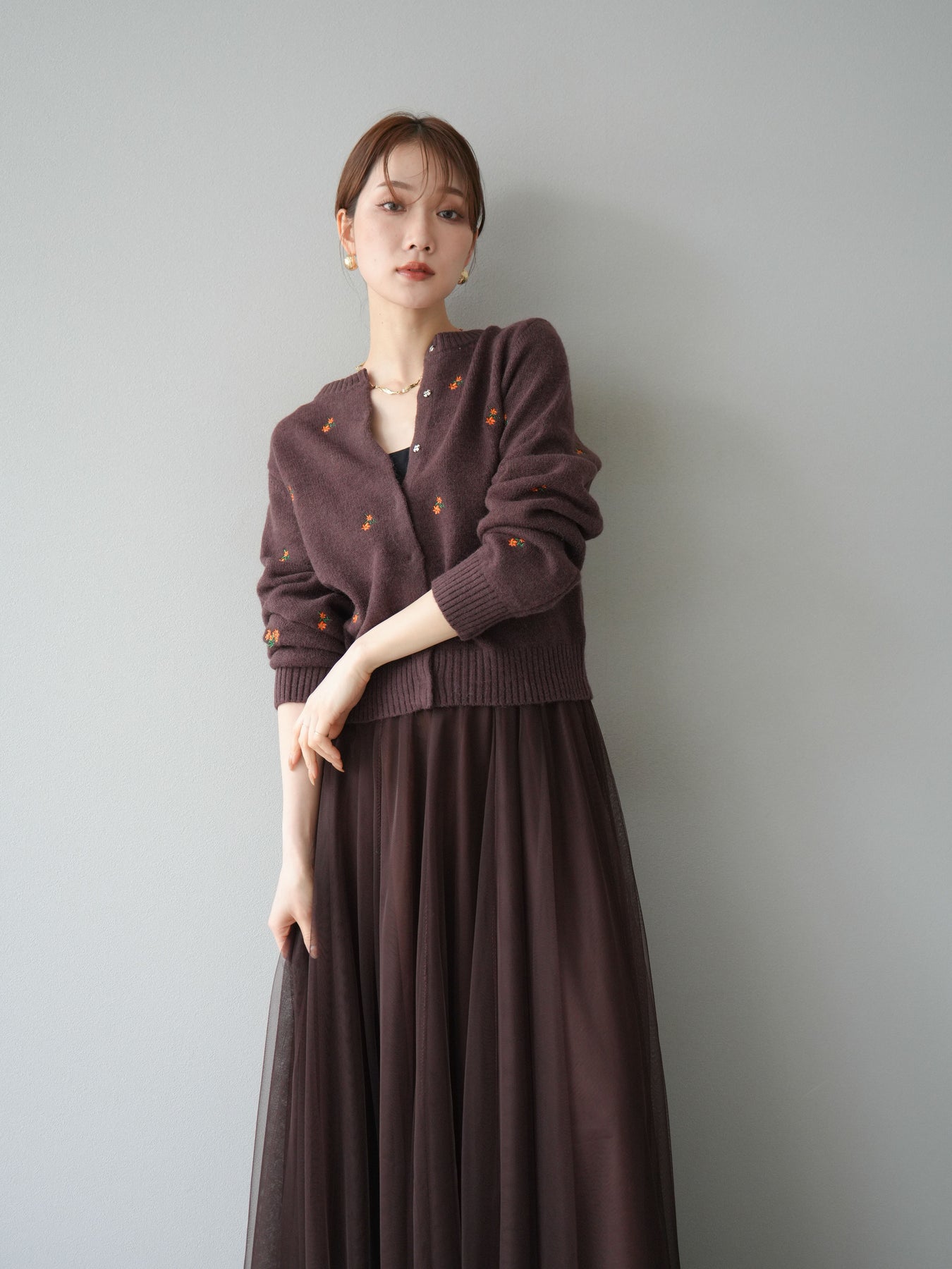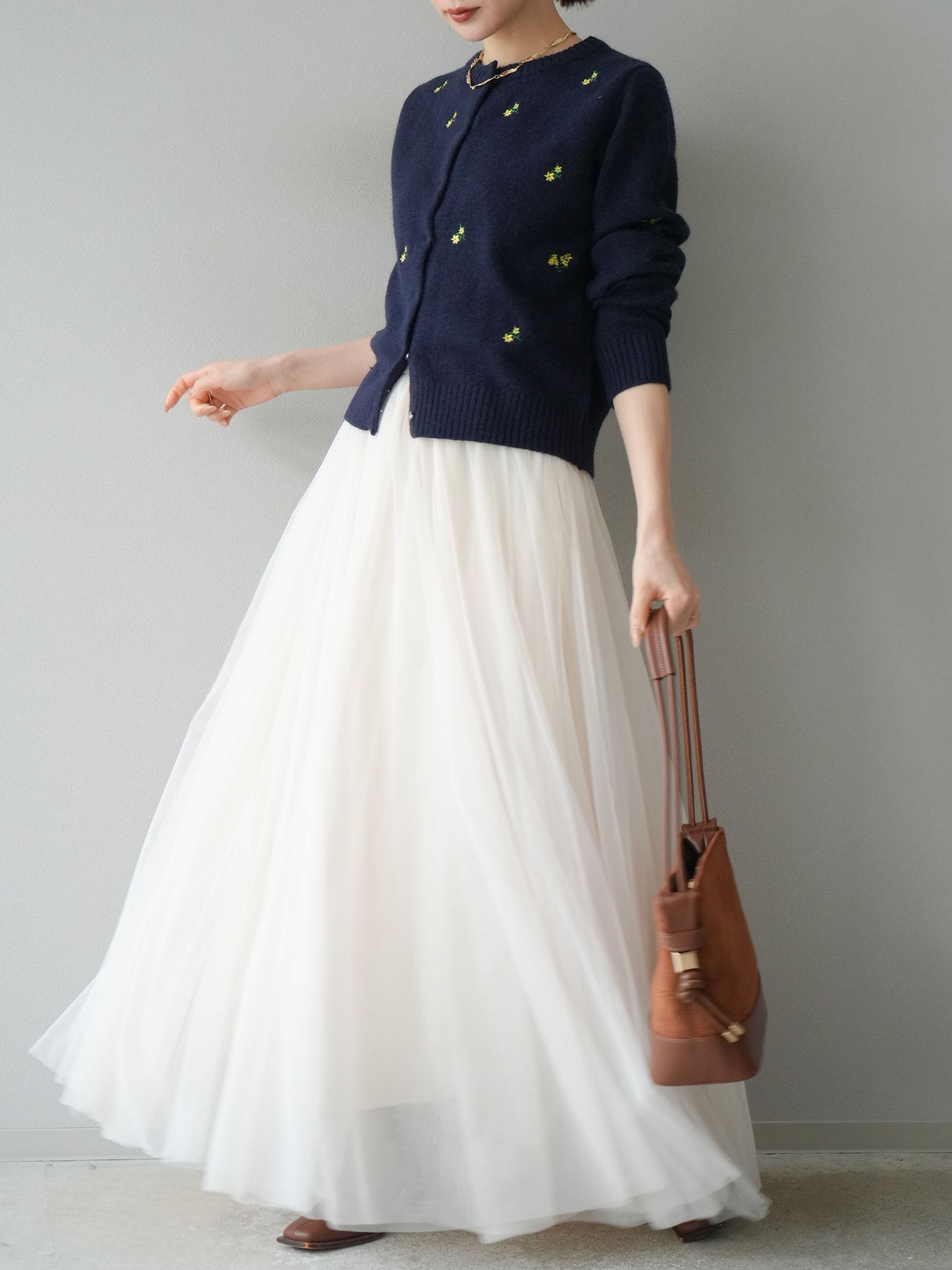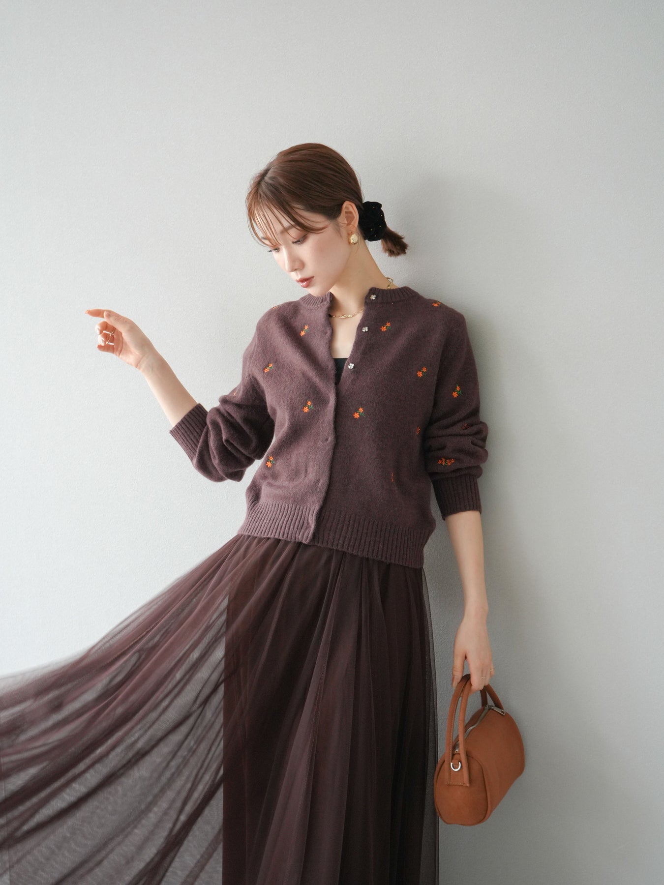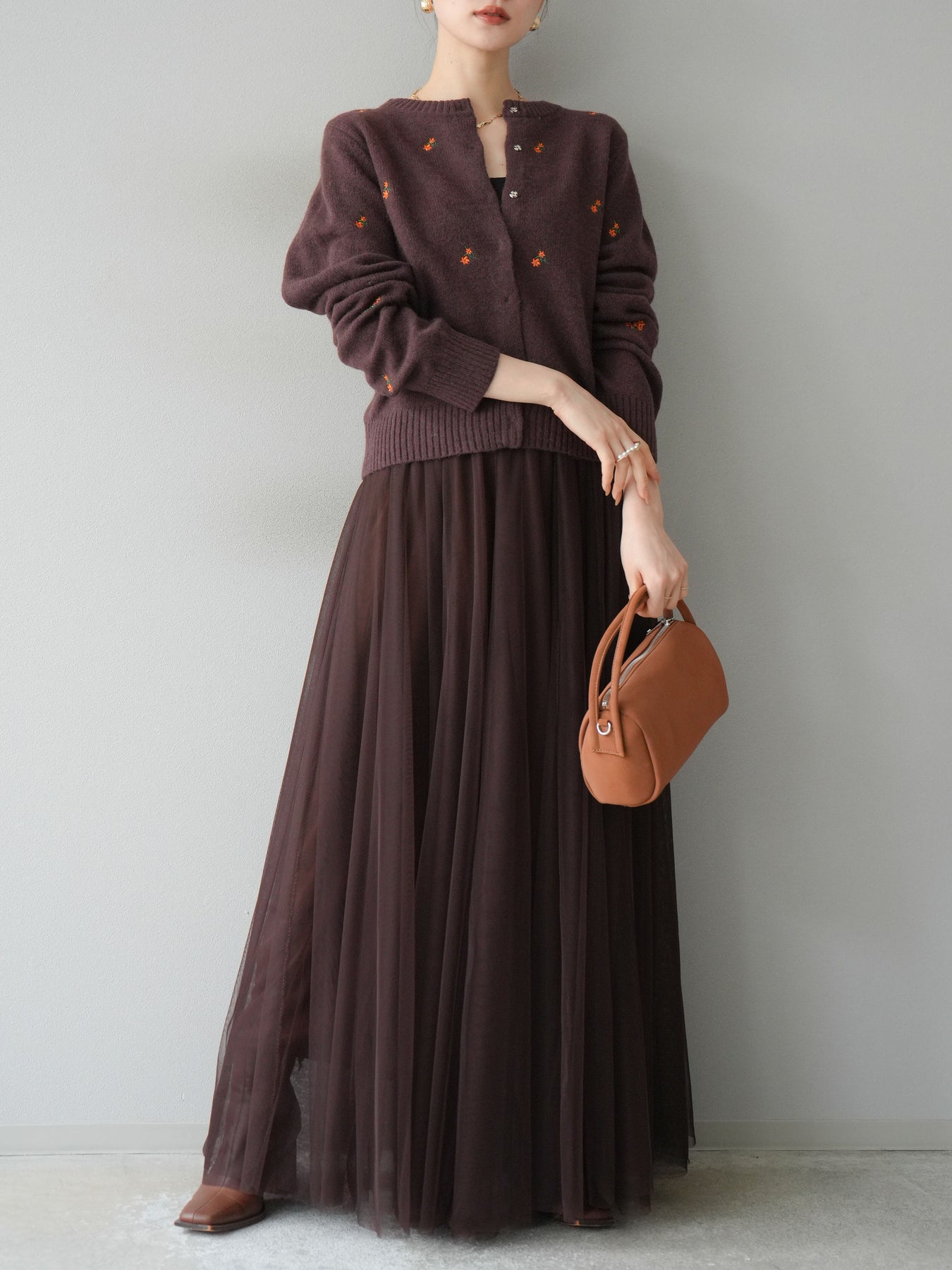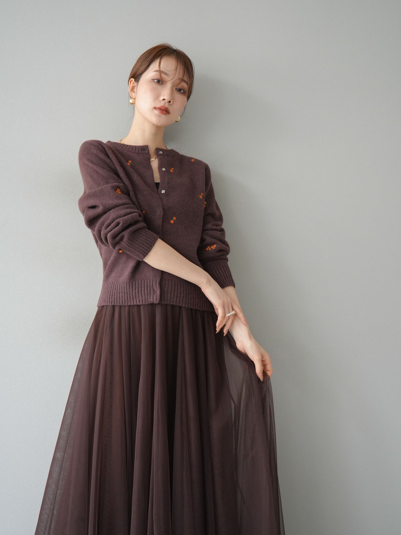 [SET]フラワー刺繍ニットカーディガン+チュールボリュームスカート(2set)