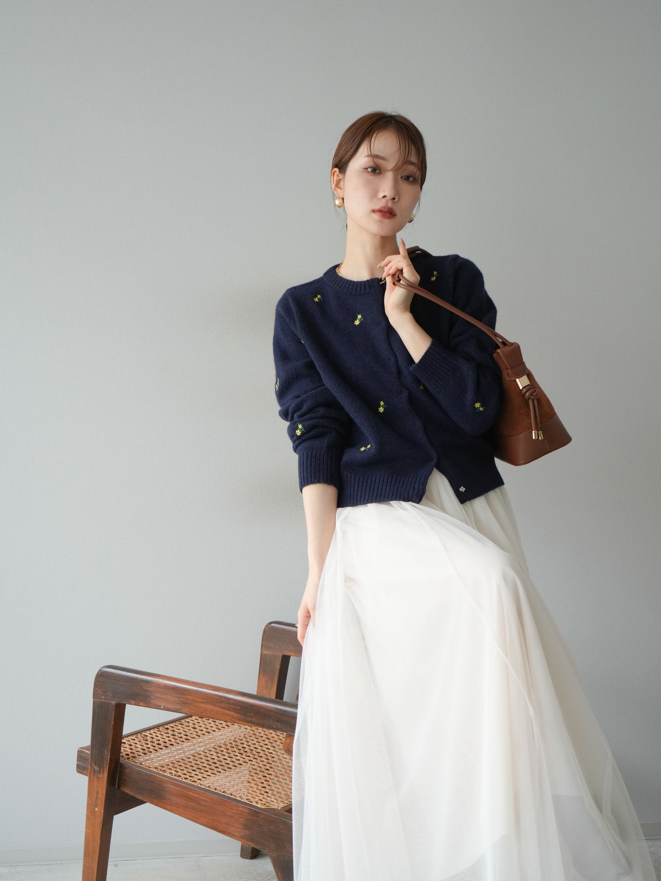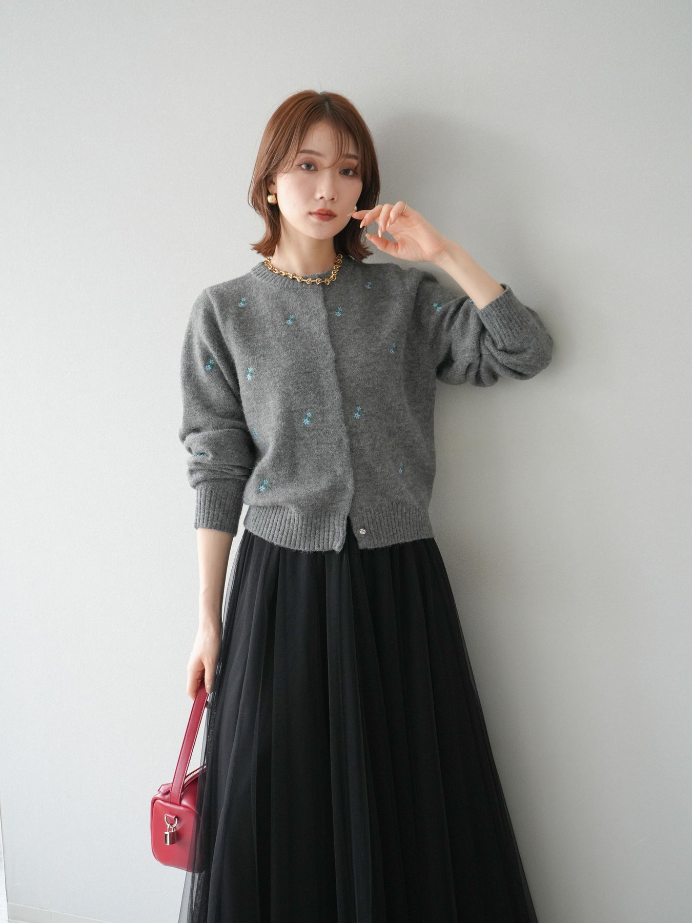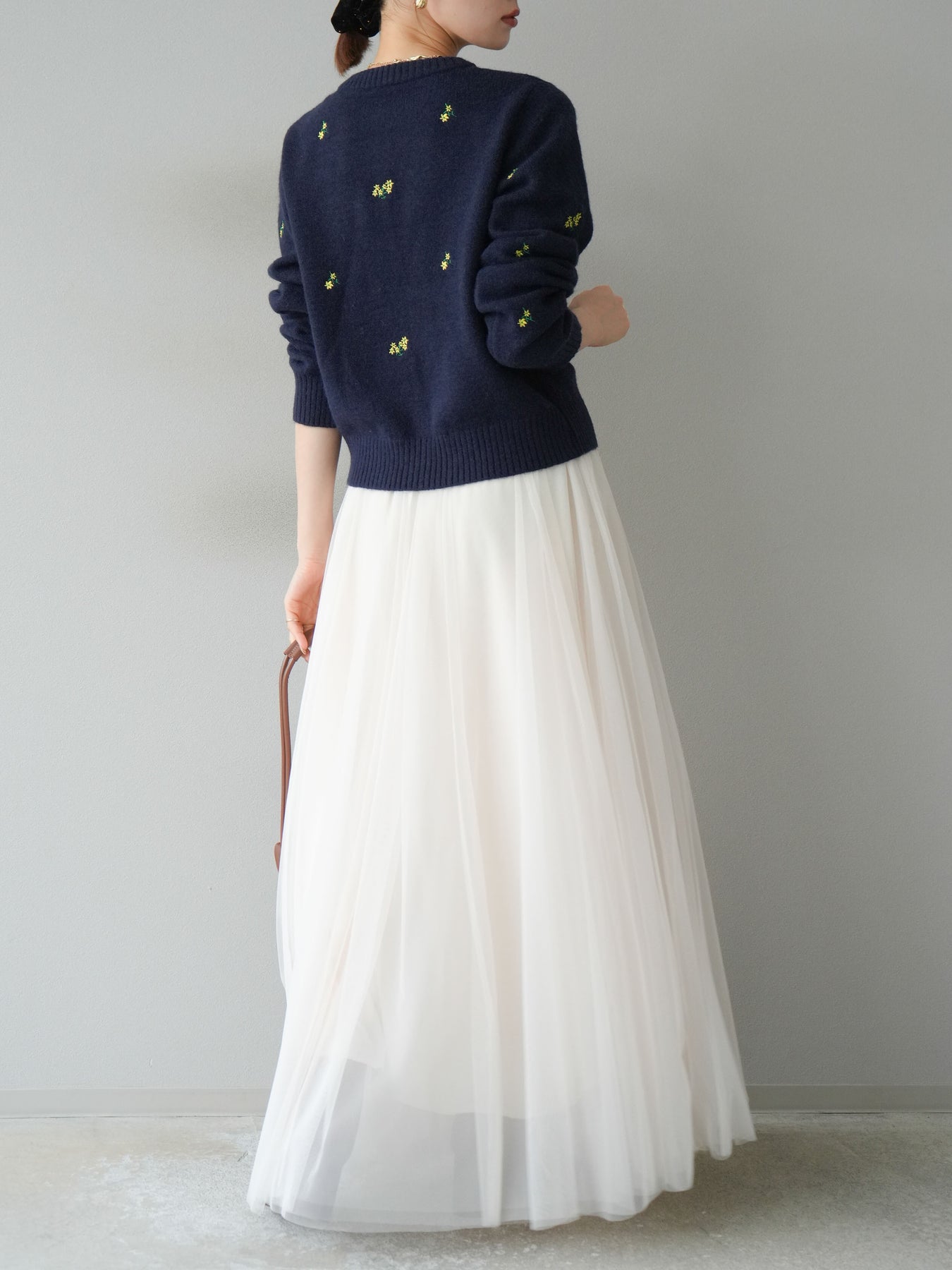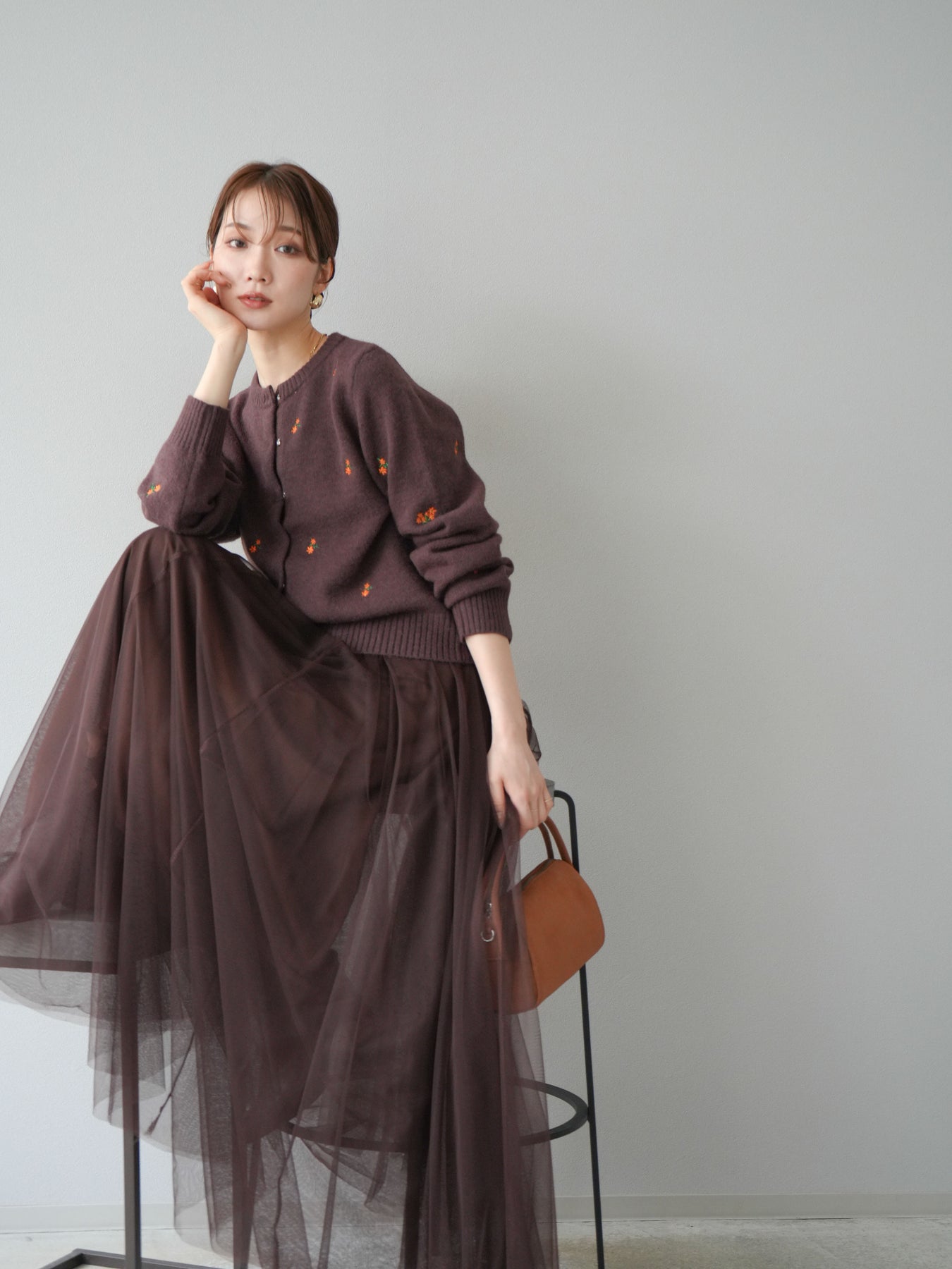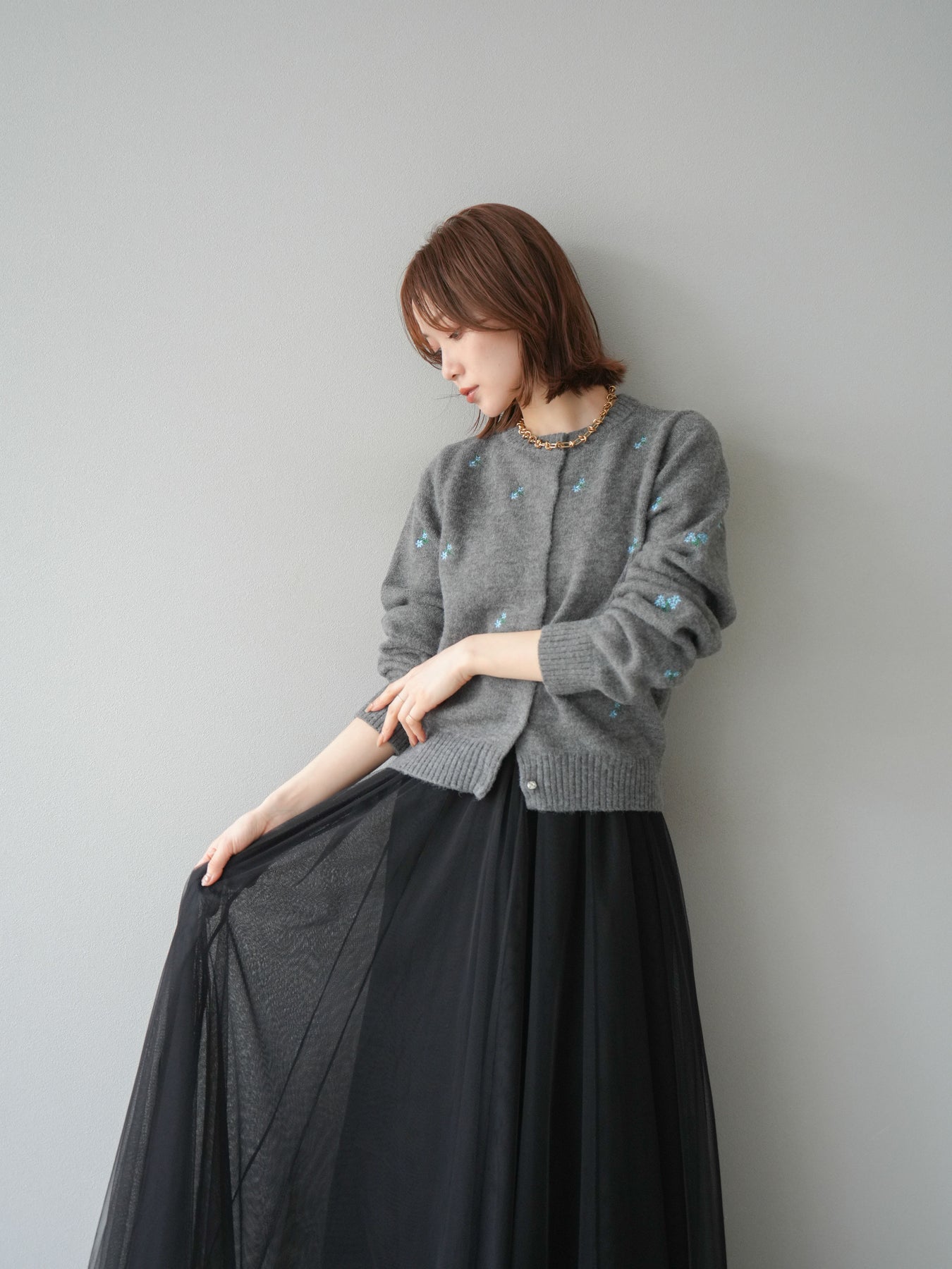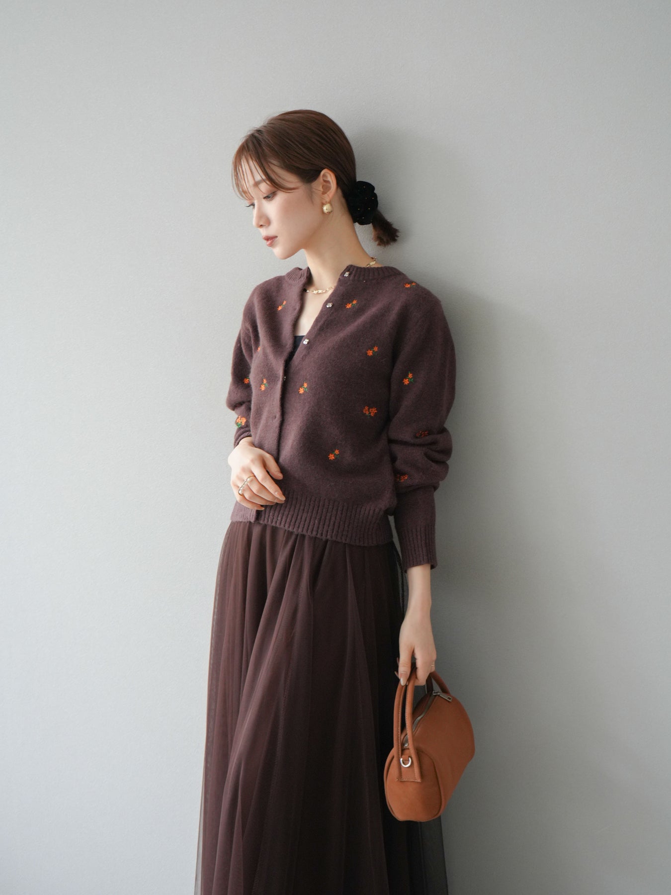 [SET]フラワー刺繍ニットカーディガン+チュールボリュームスカート(2set)