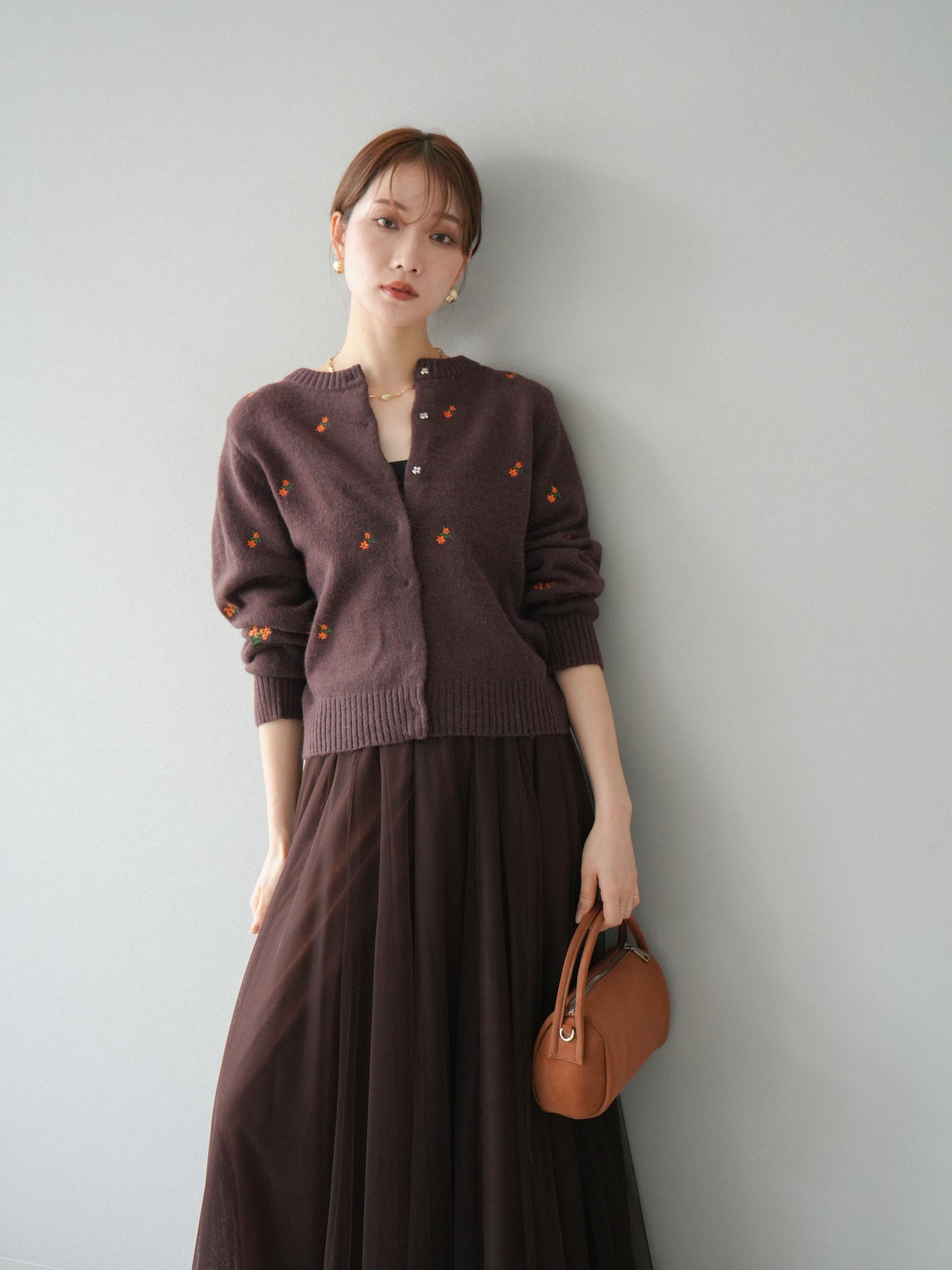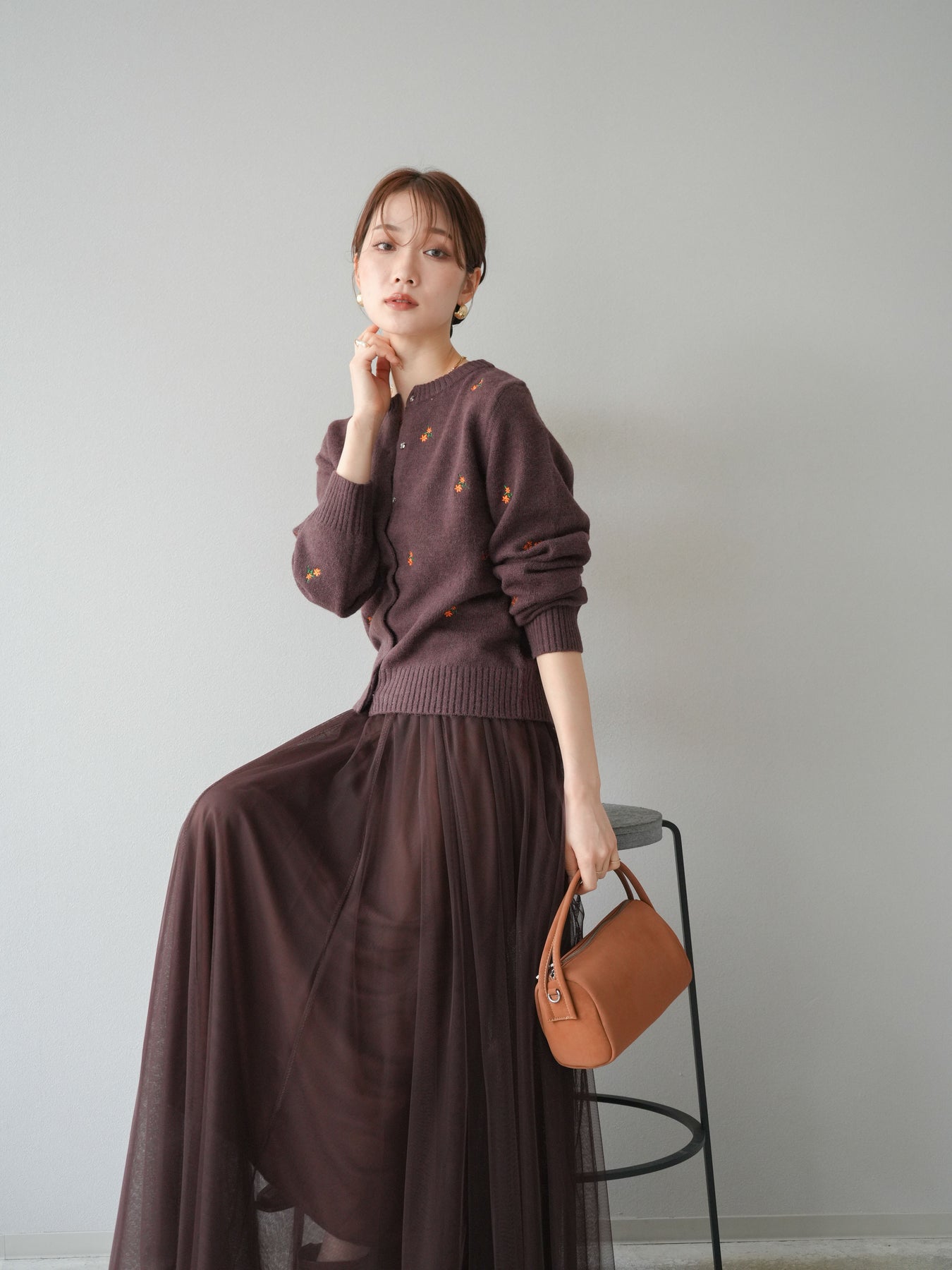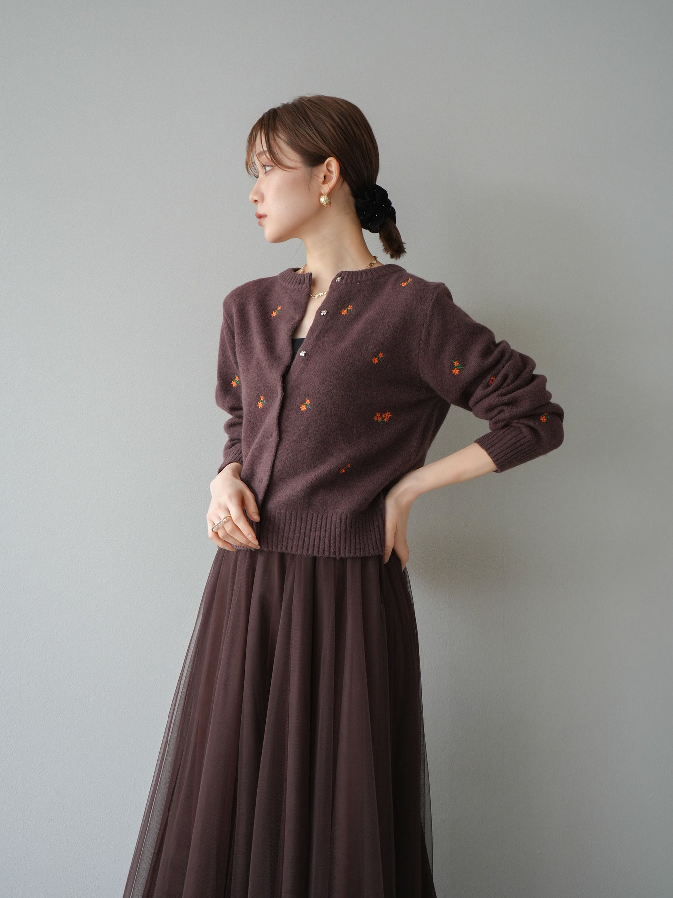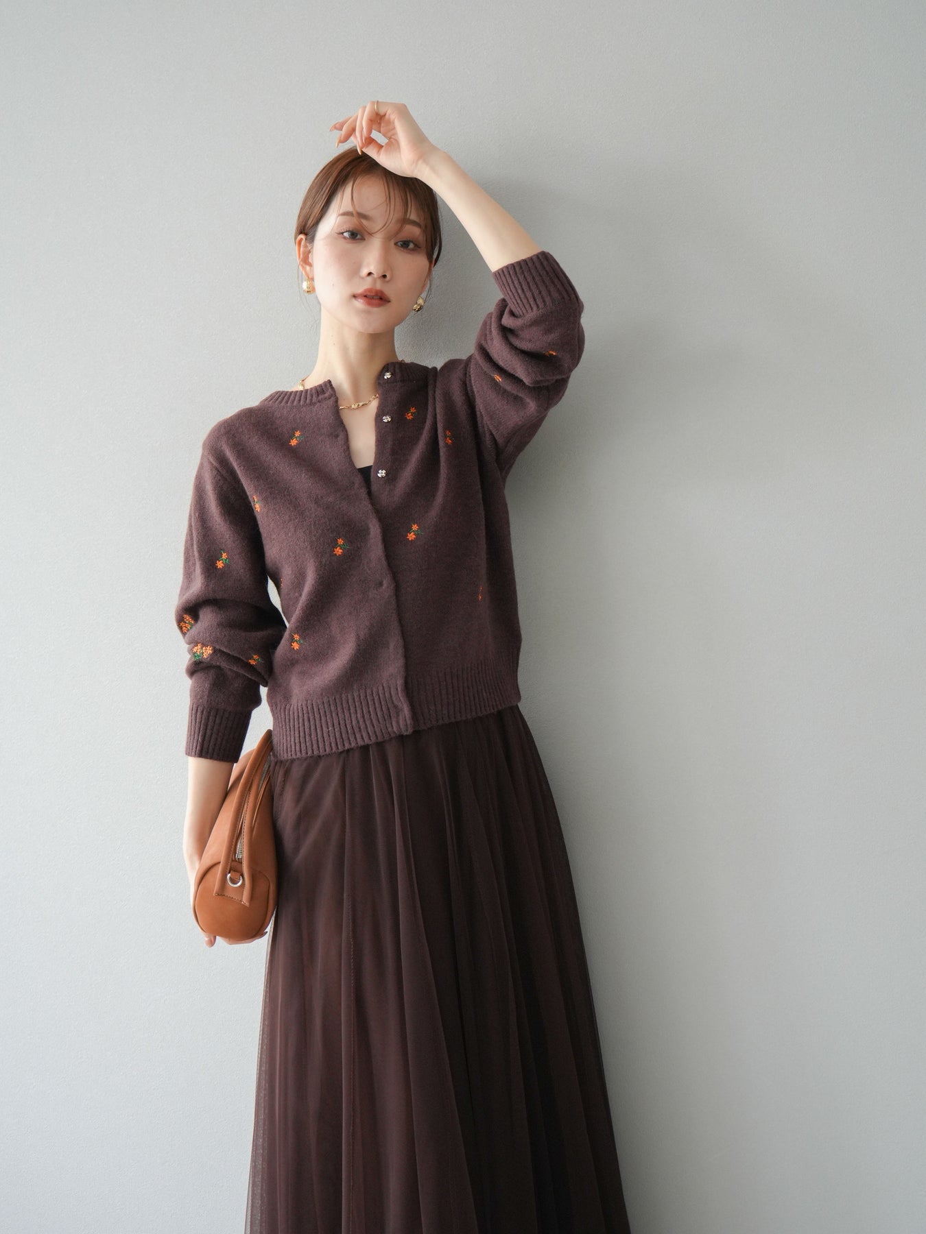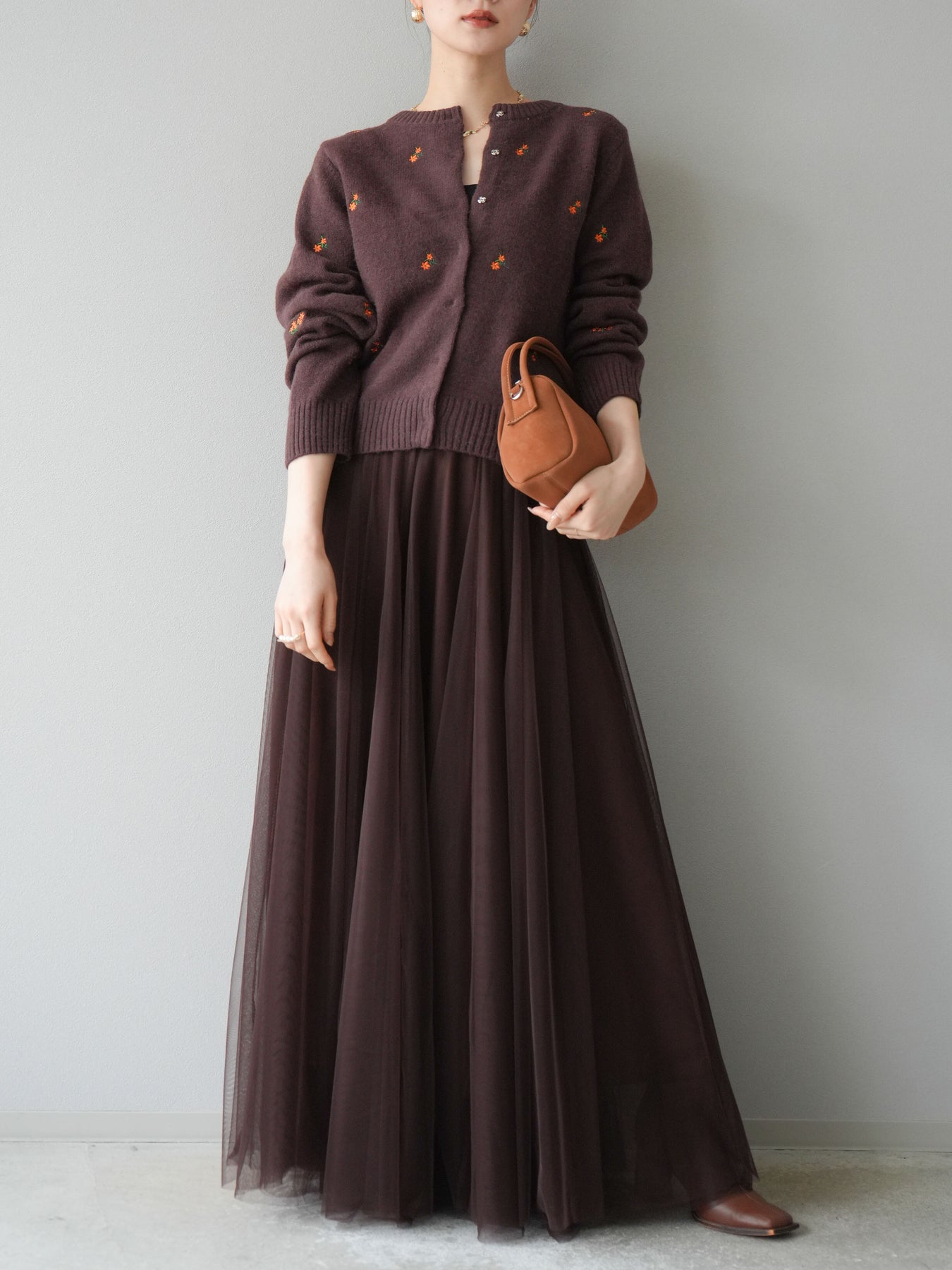 [SET]フラワー刺繍ニットカーディガン+チュールボリュームスカート(2set)