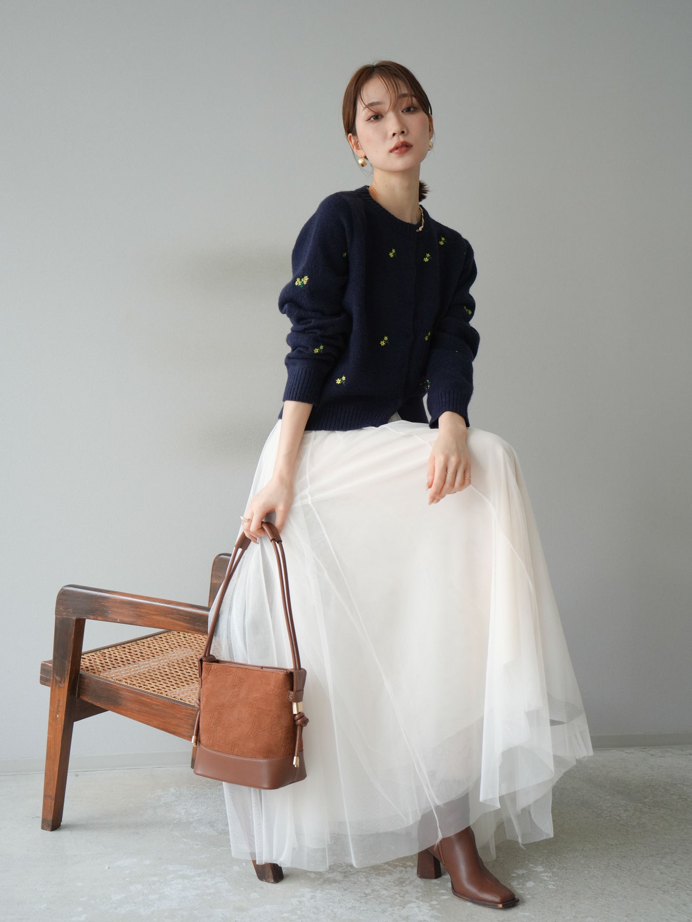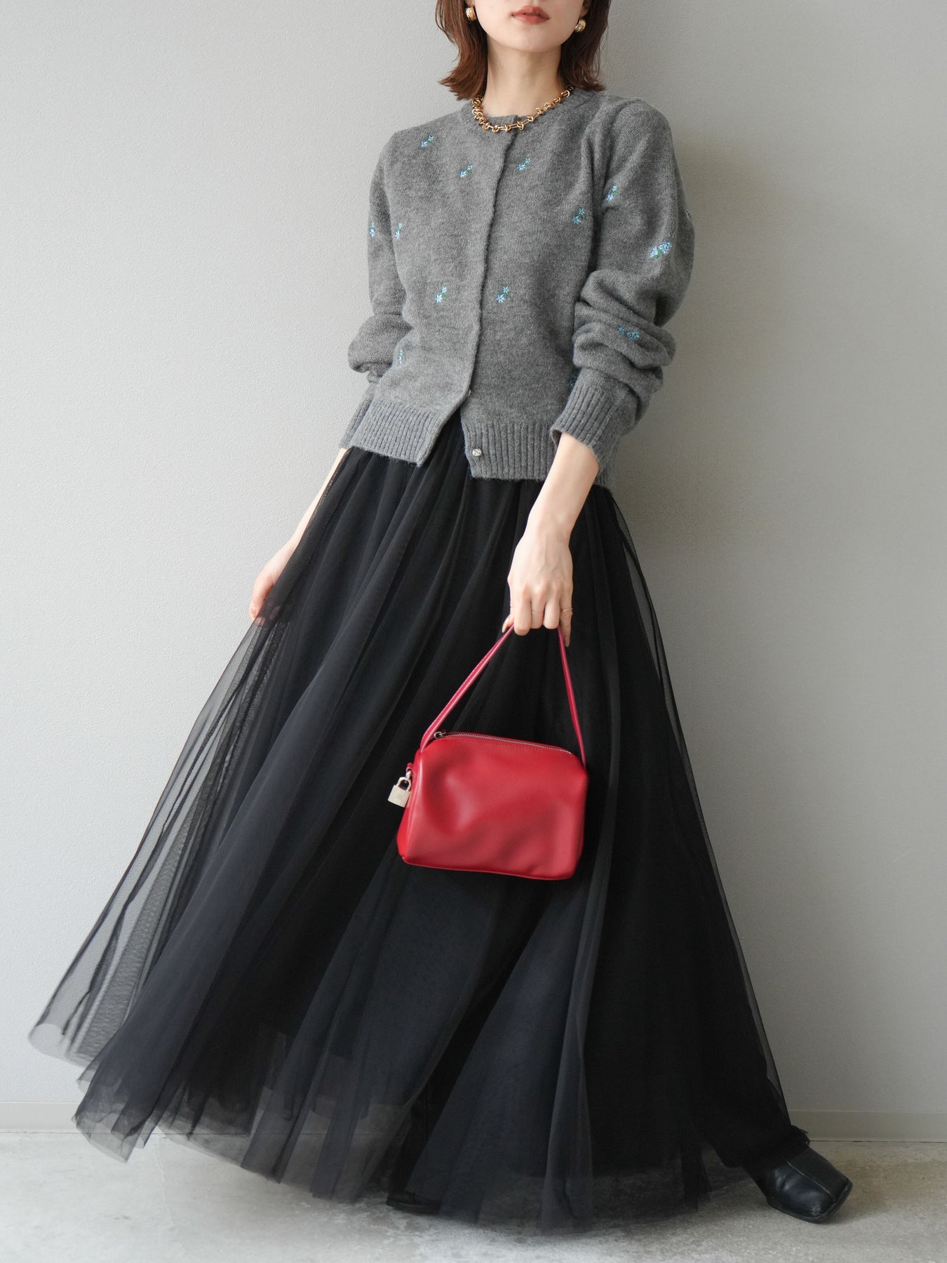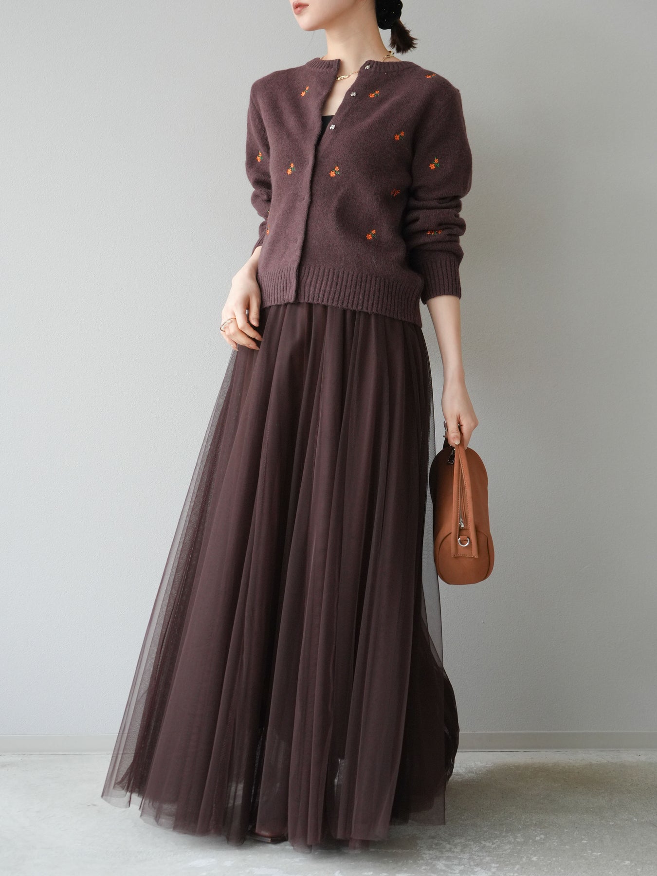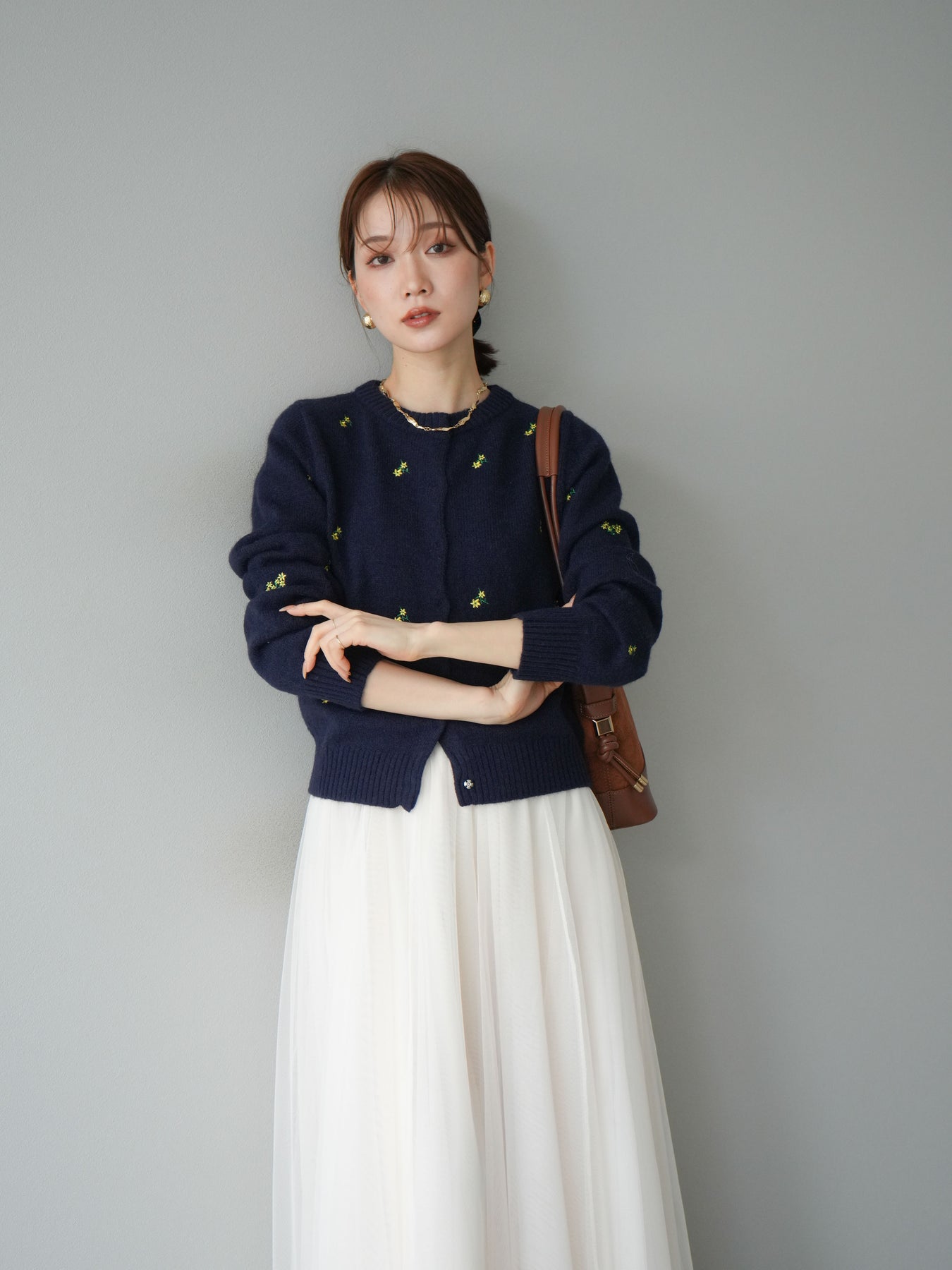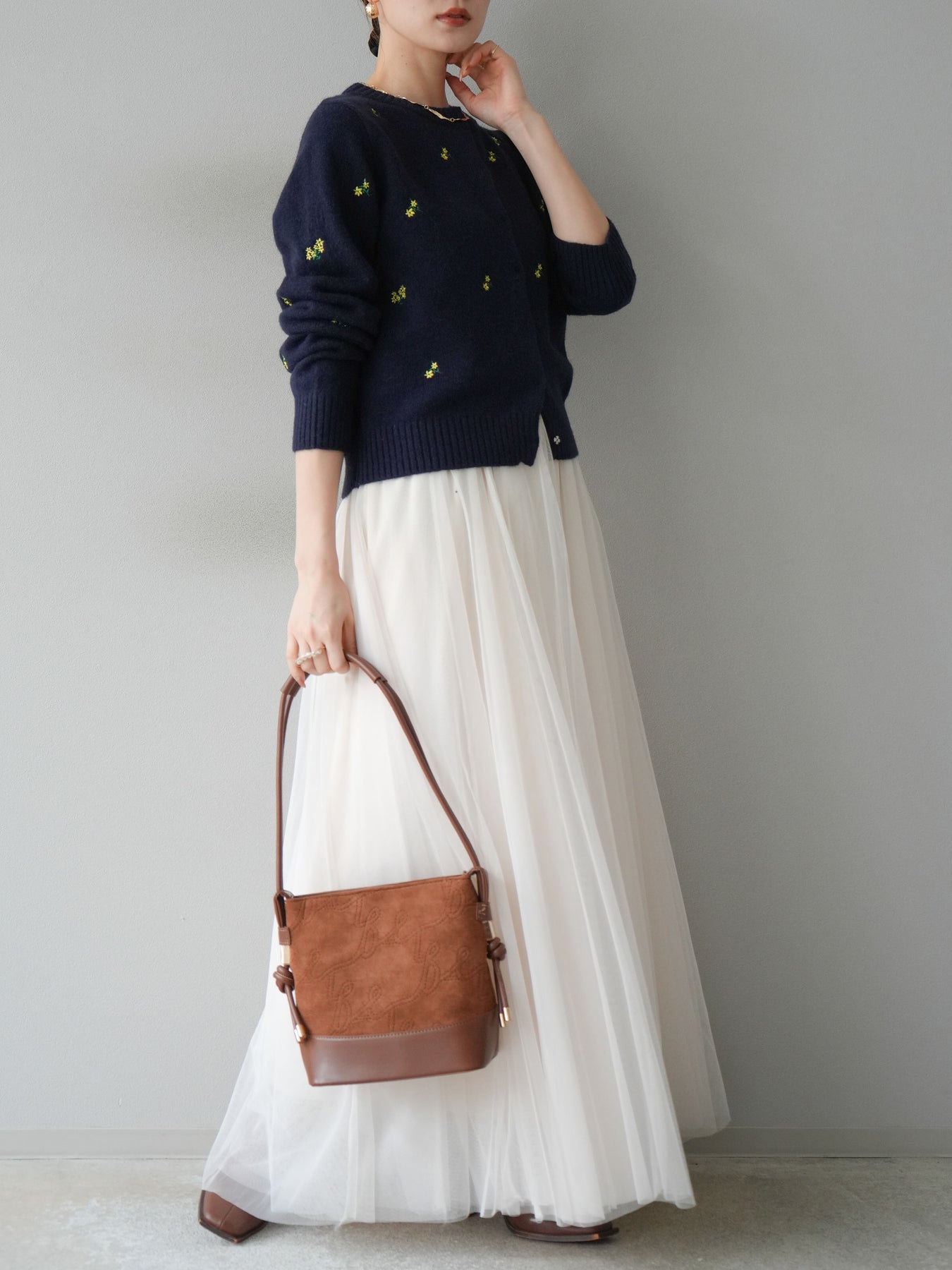 [SET]フラワー刺繍ニットカーディガン+チュールボリュームスカート(2set)