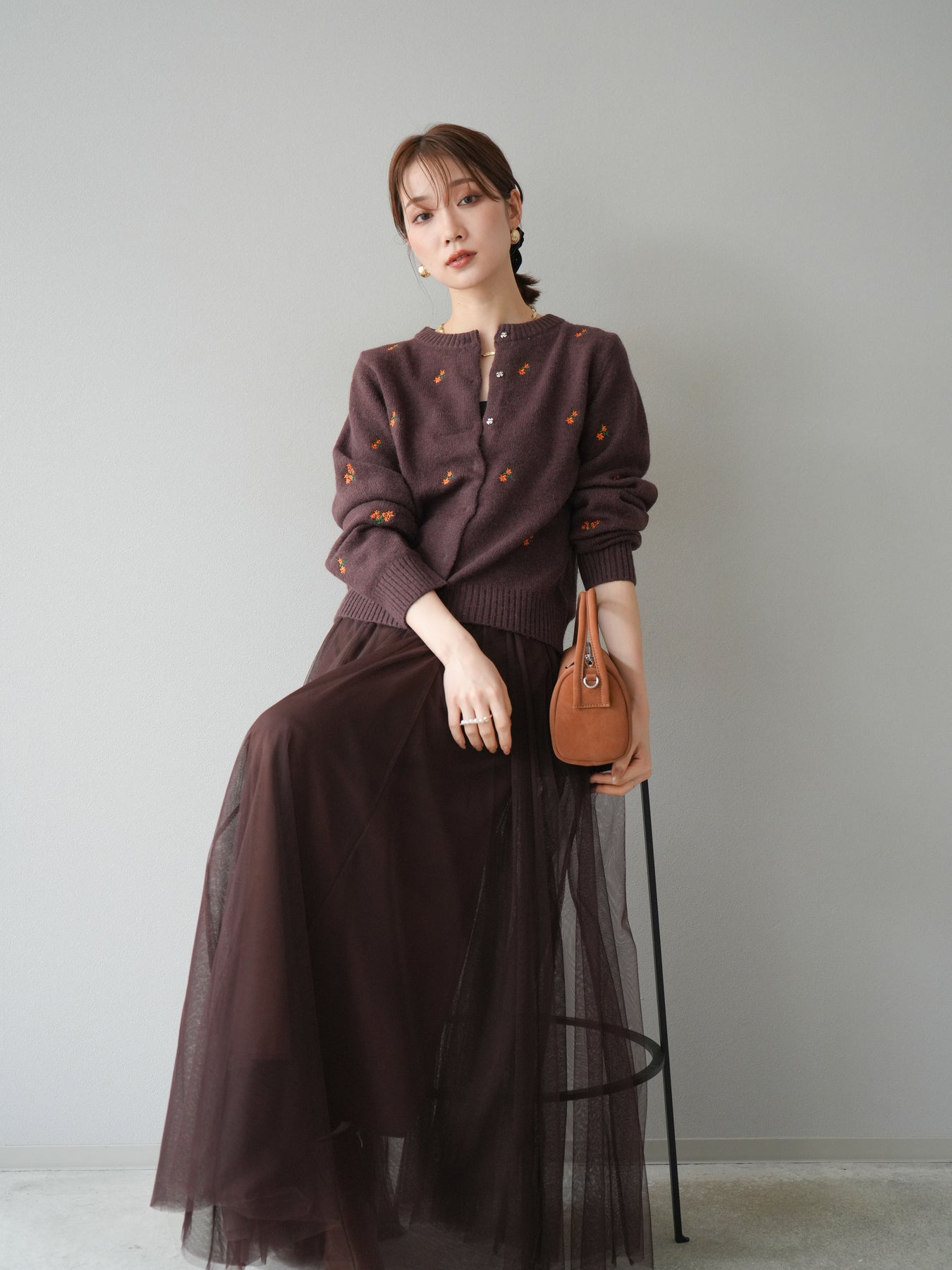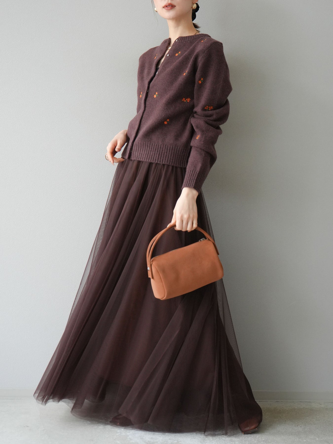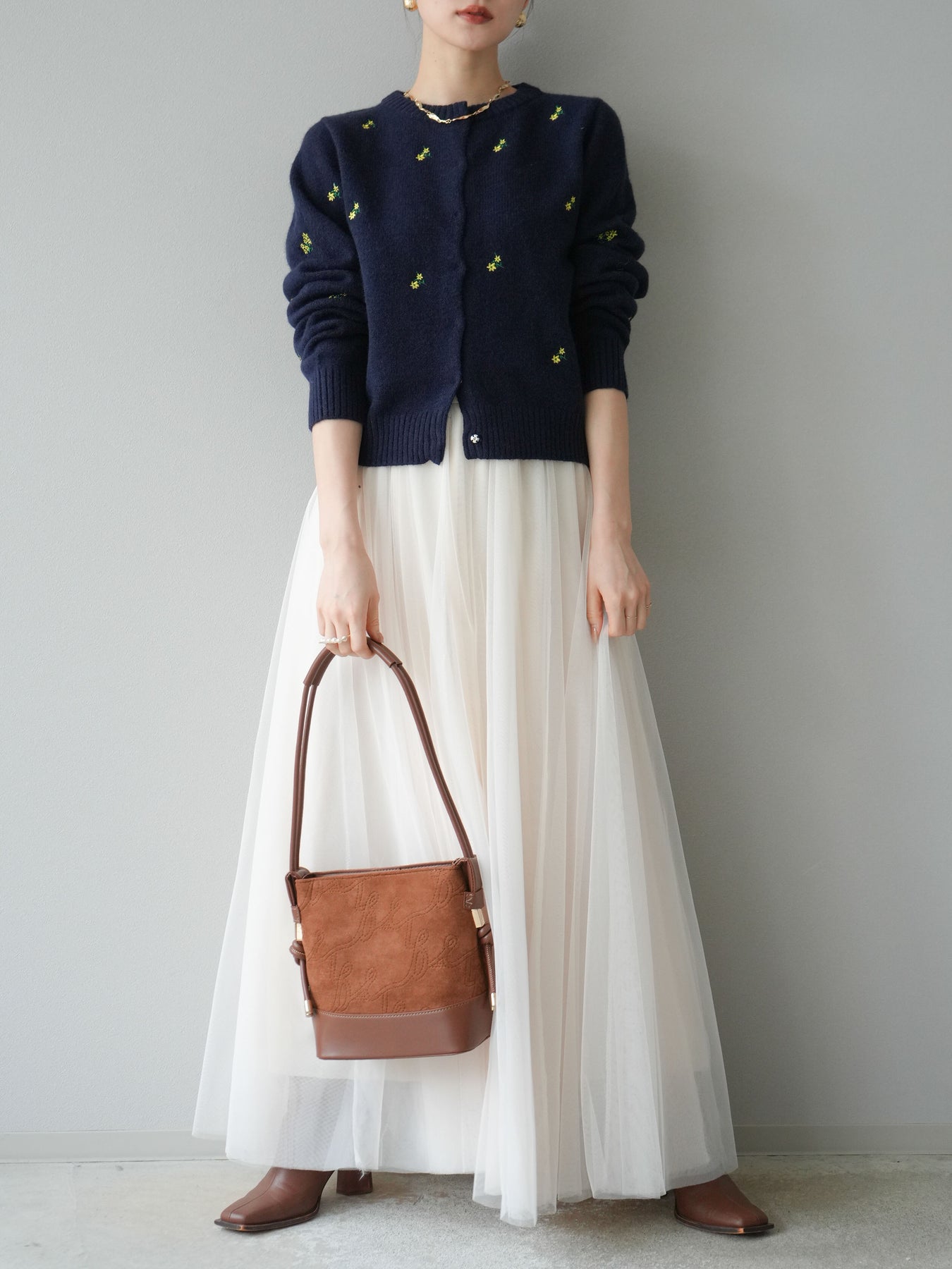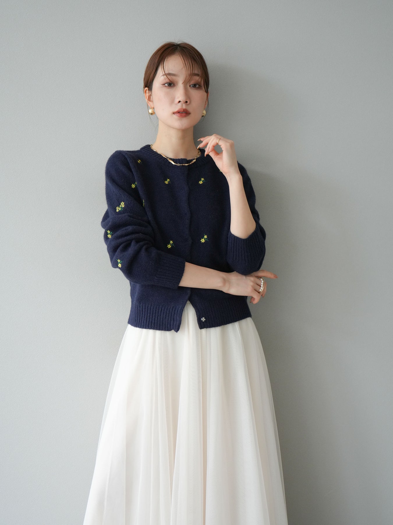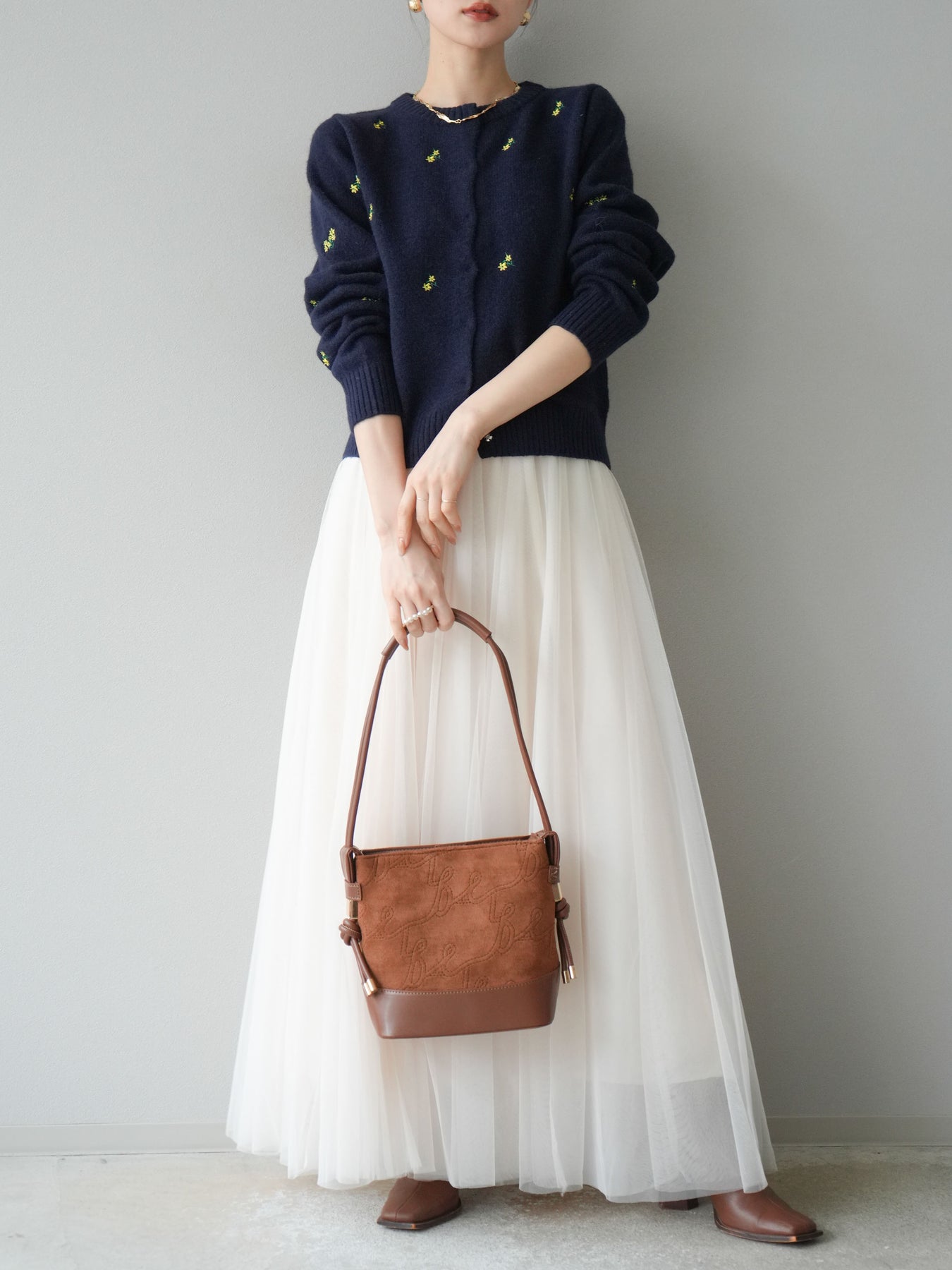 [SET]フラワー刺繍ニットカーディガン+チュールボリュームスカート(2set)