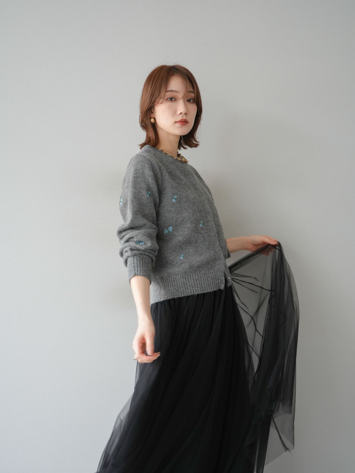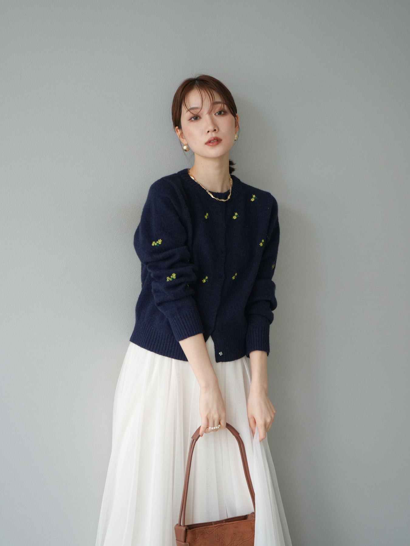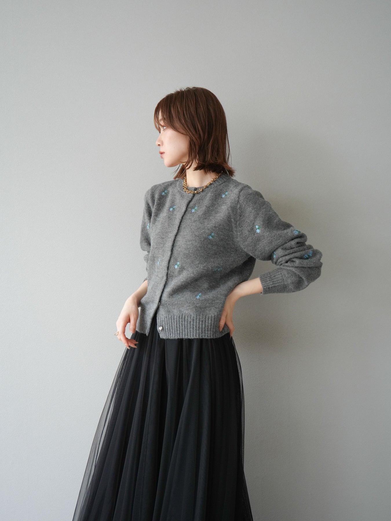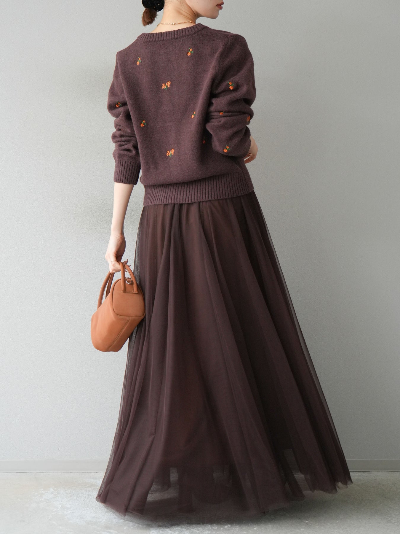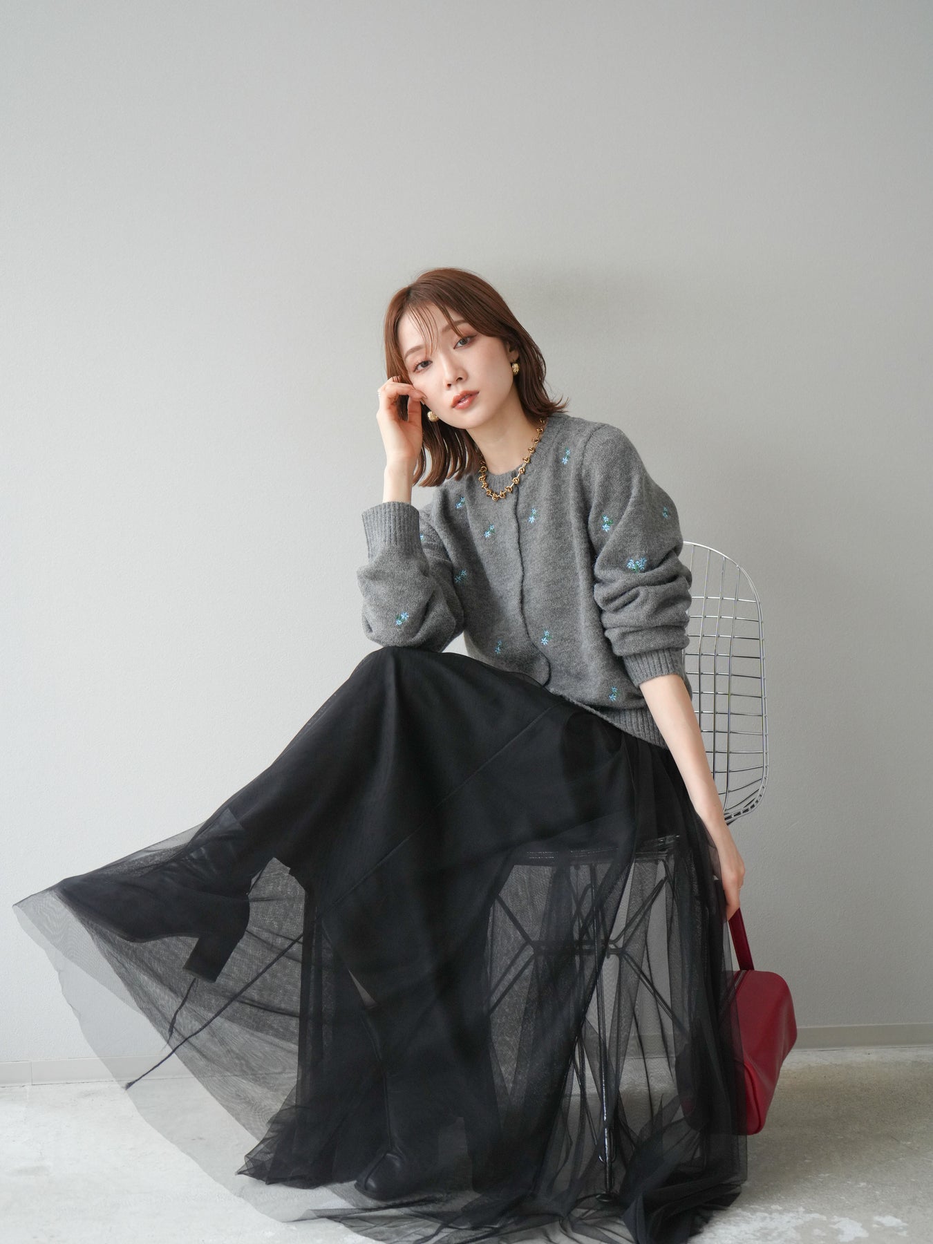 [SET]フラワー刺繍ニットカーディガン+チュールボリュームスカート(2set)
