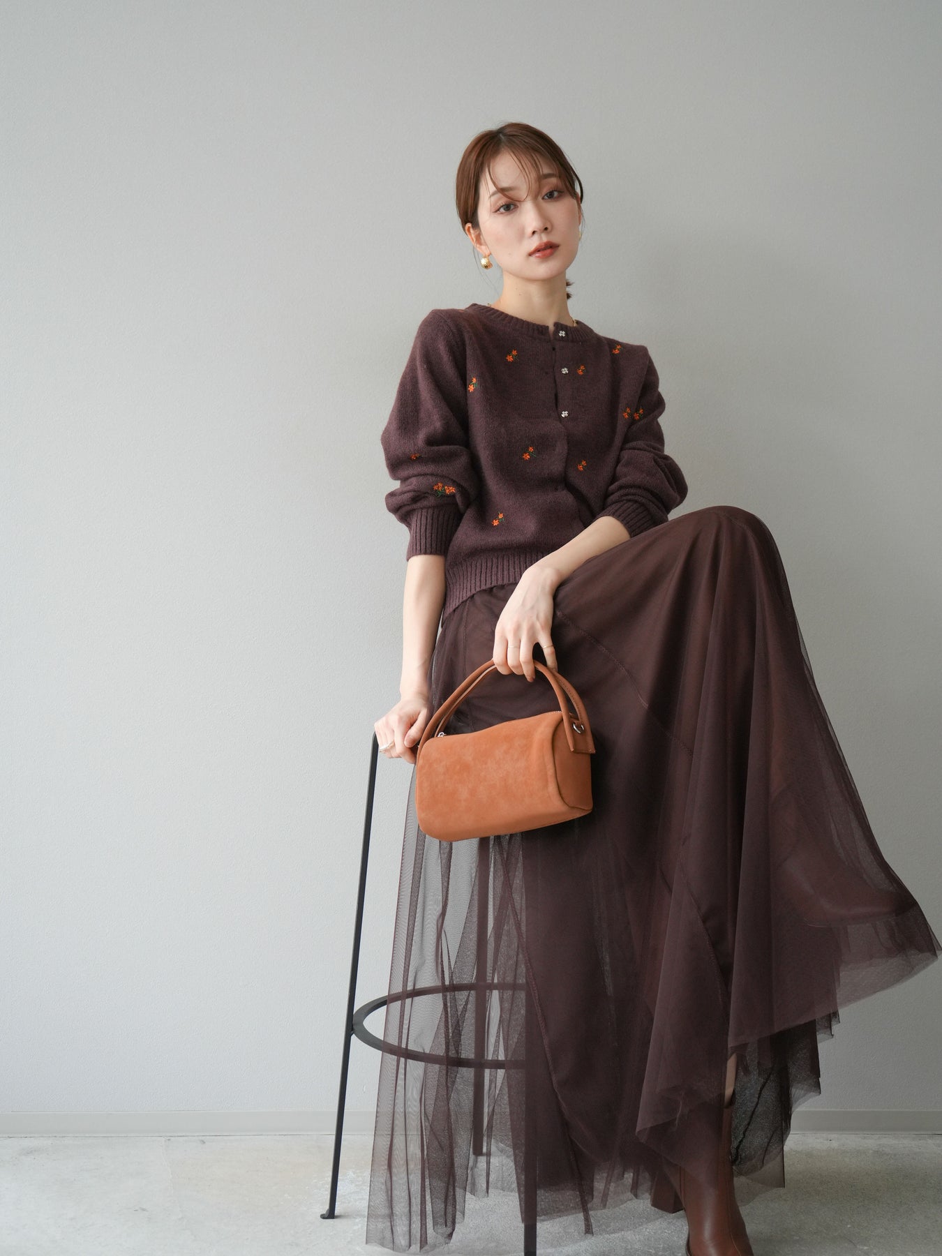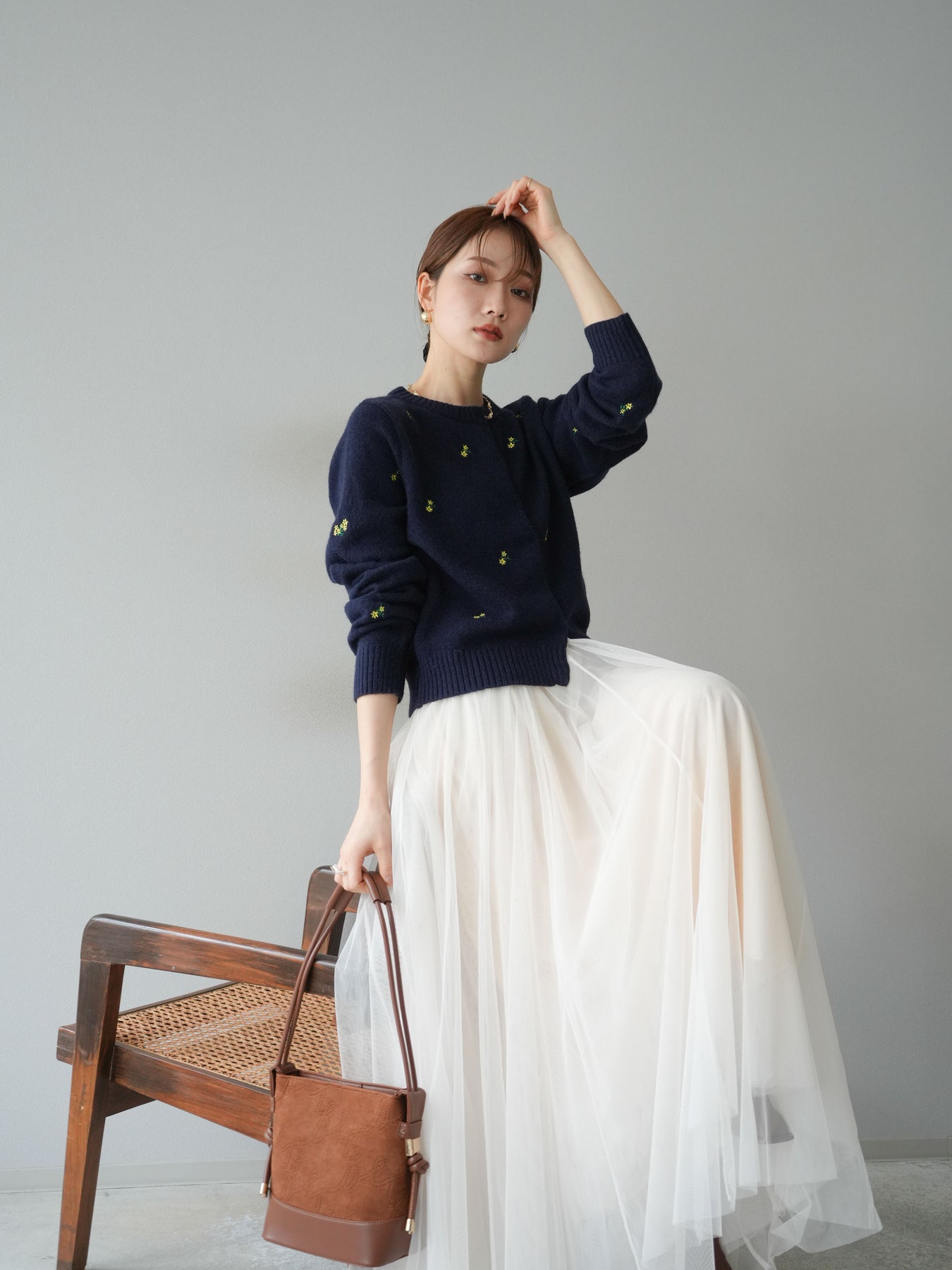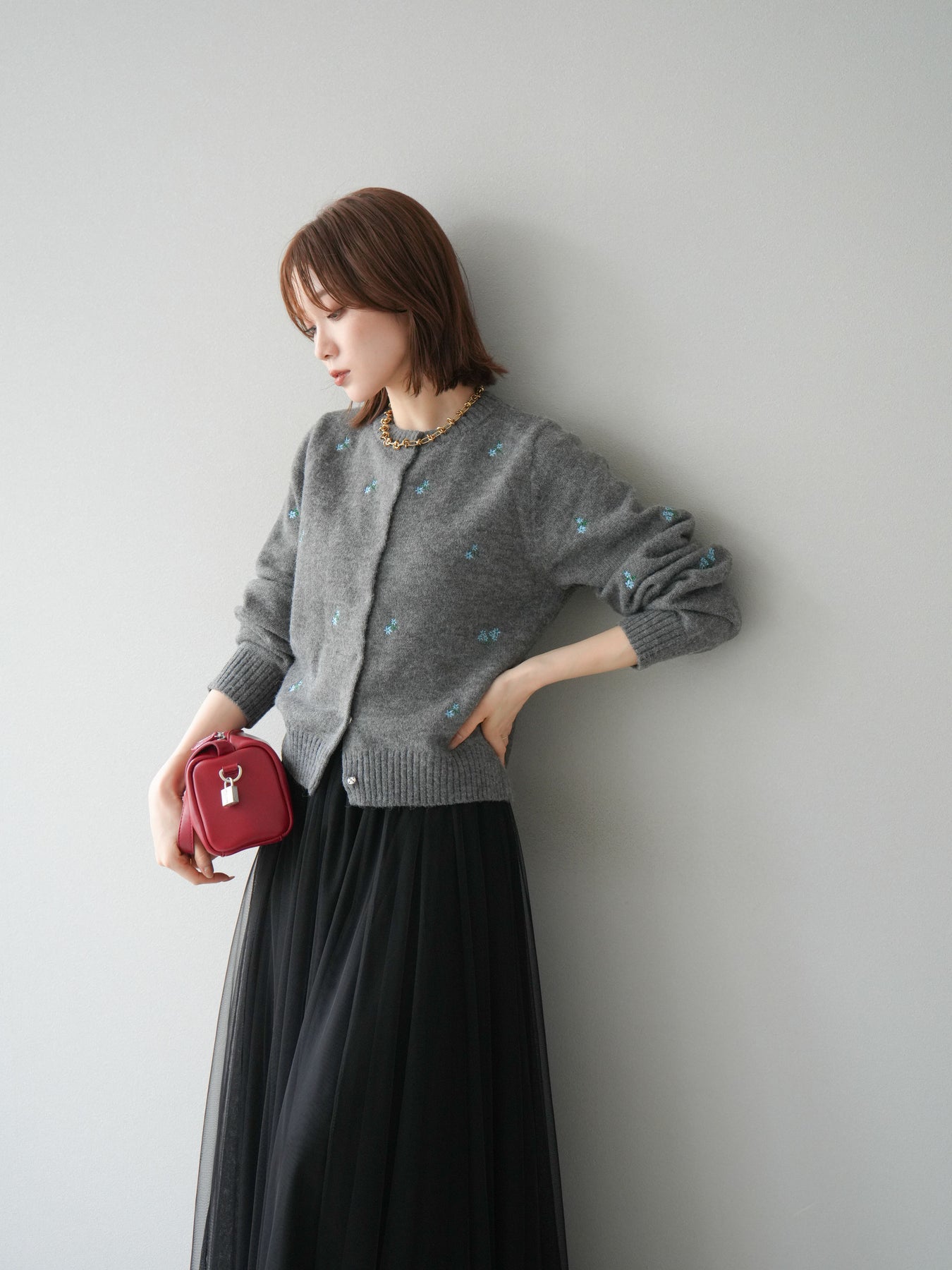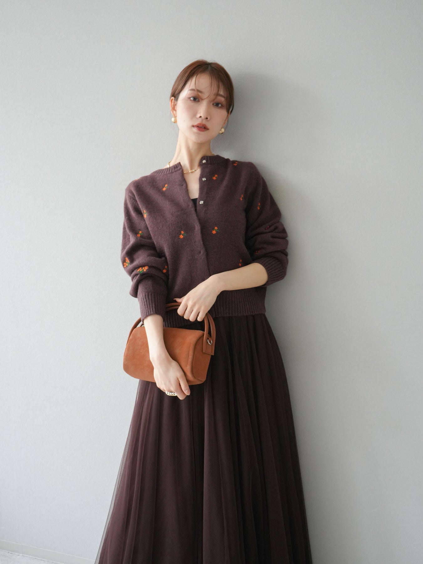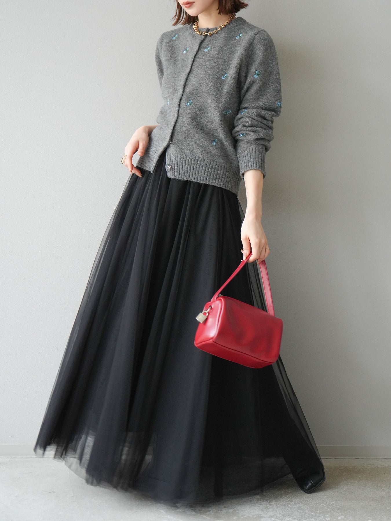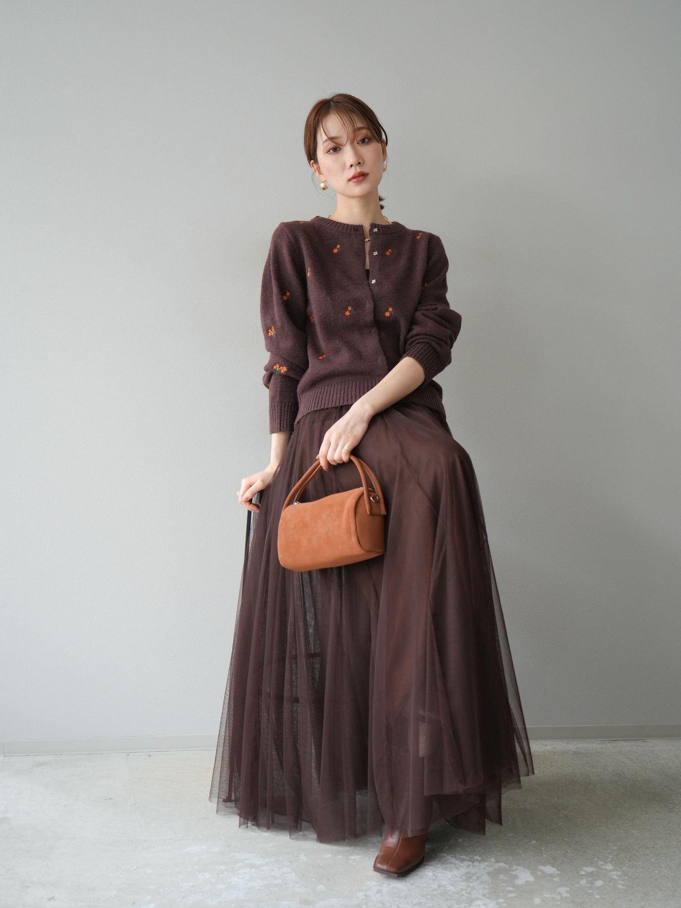 [SET]フラワー刺繍ニットカーディガン+チュールボリュームスカート(2set)