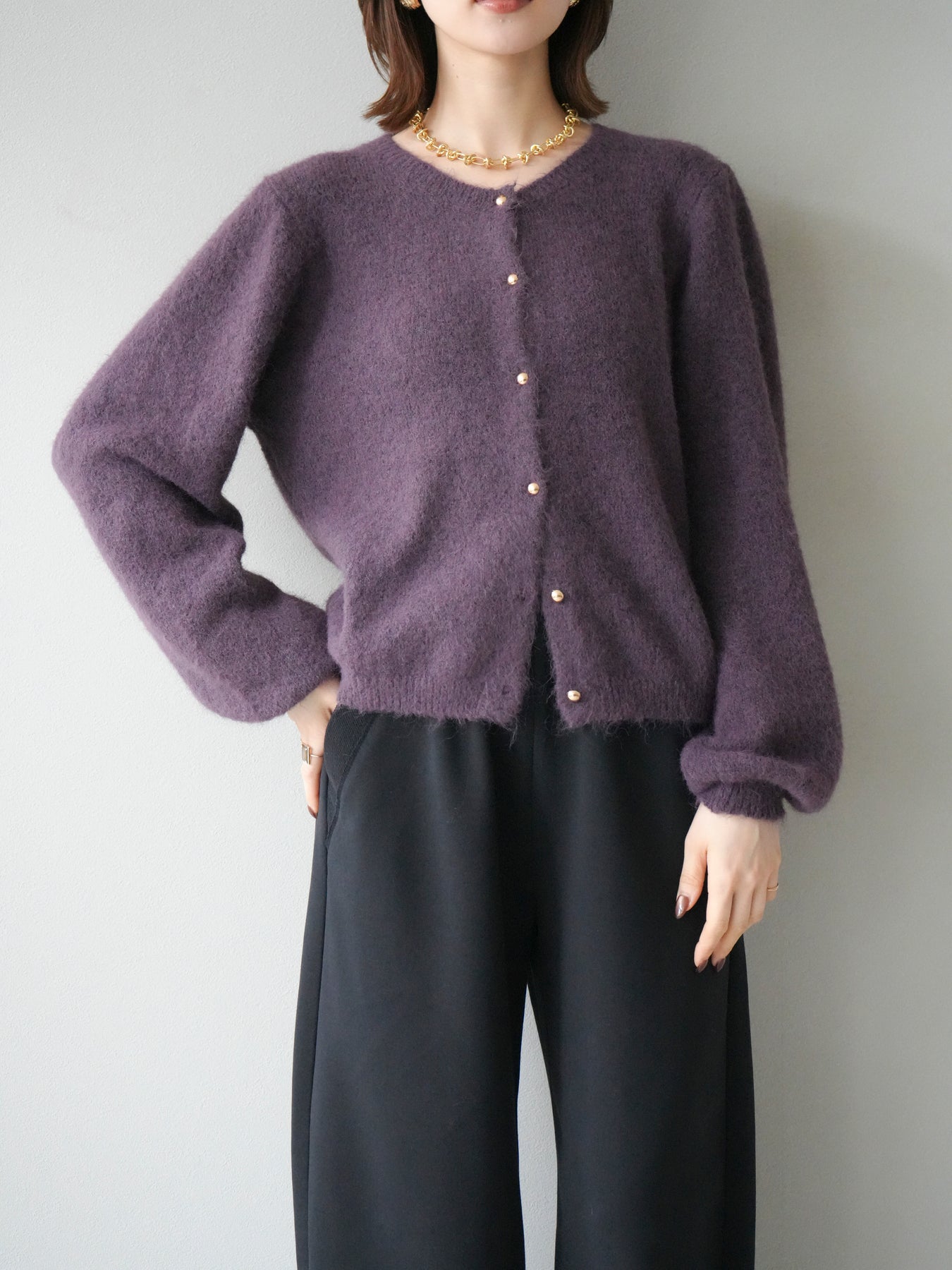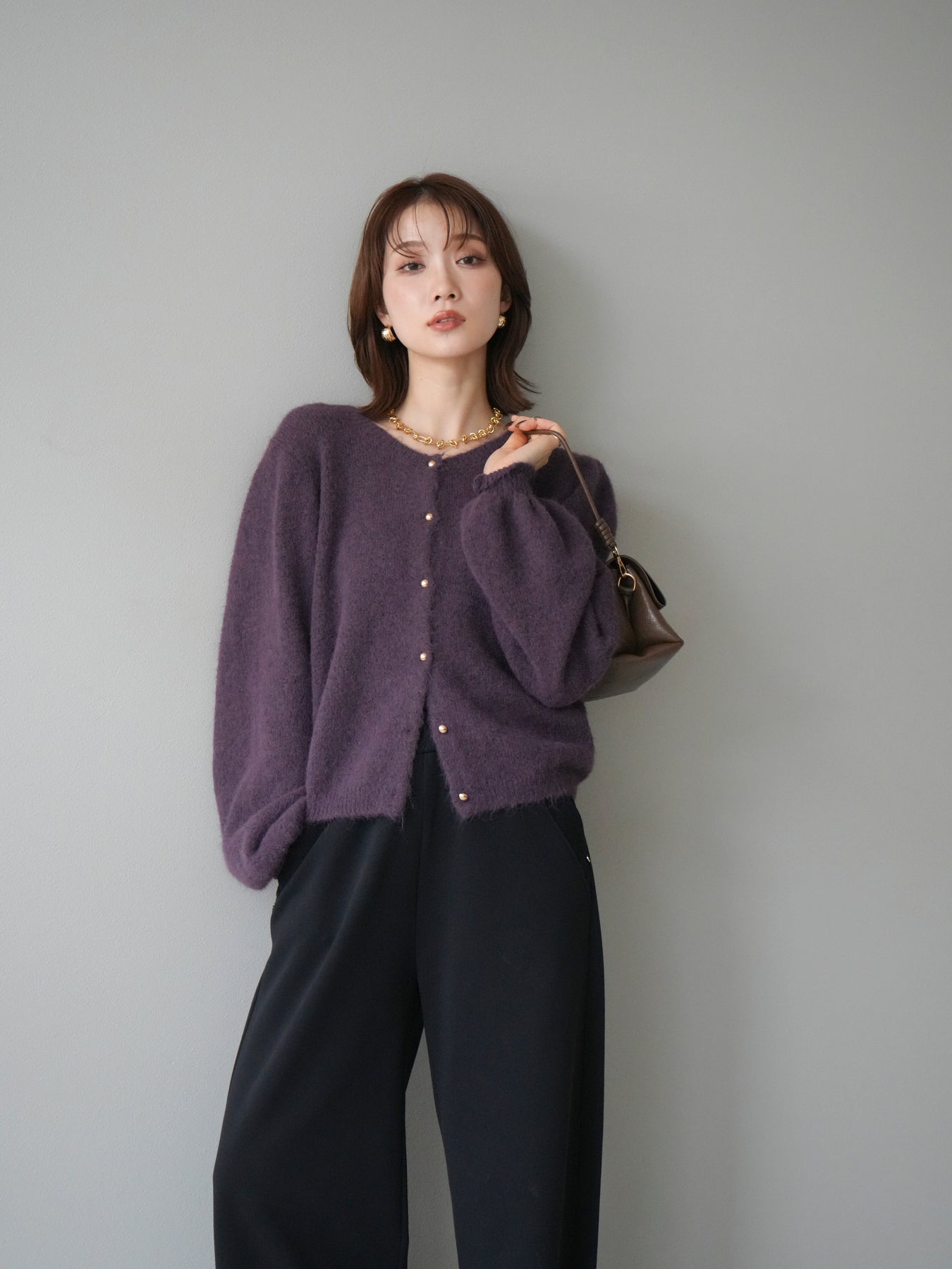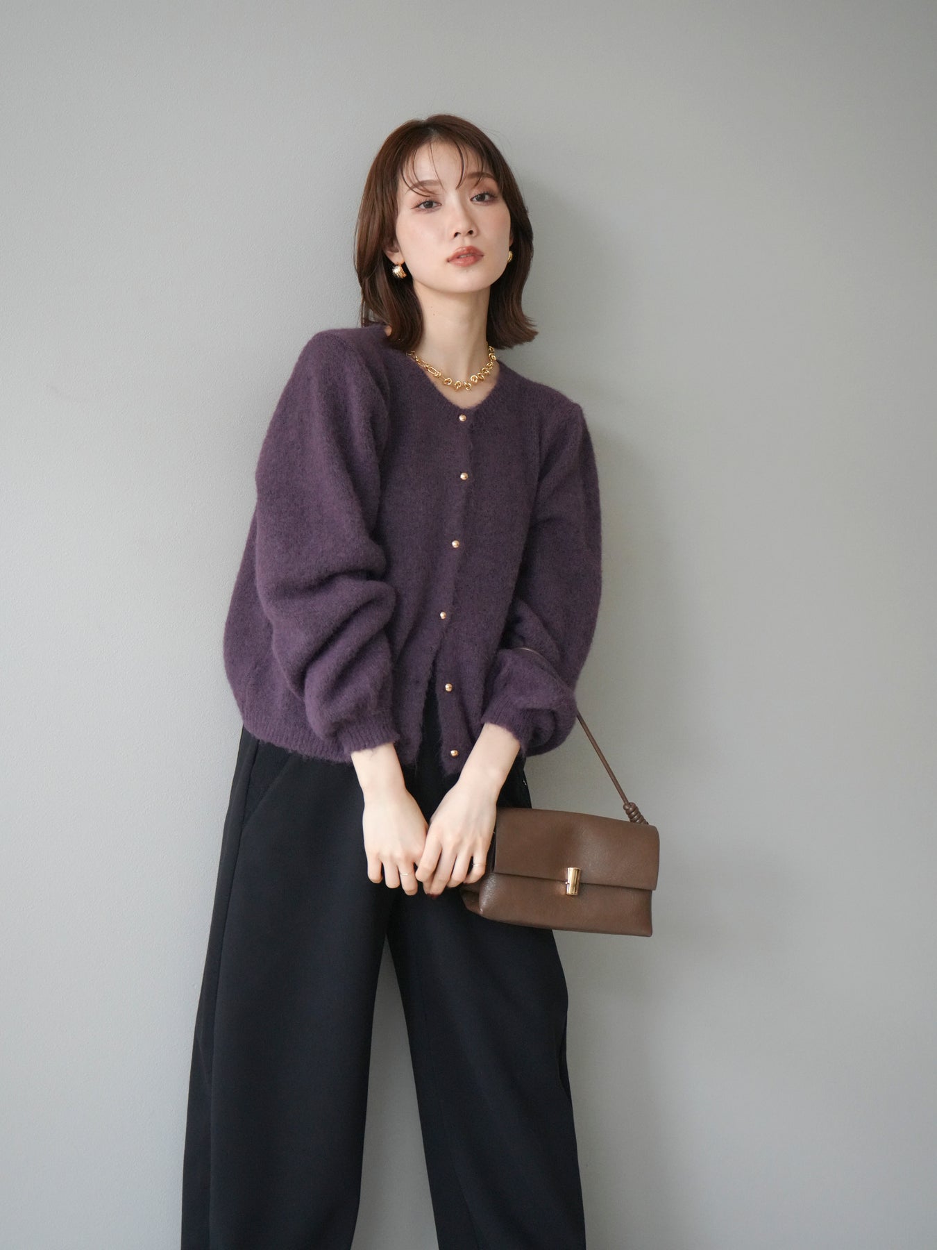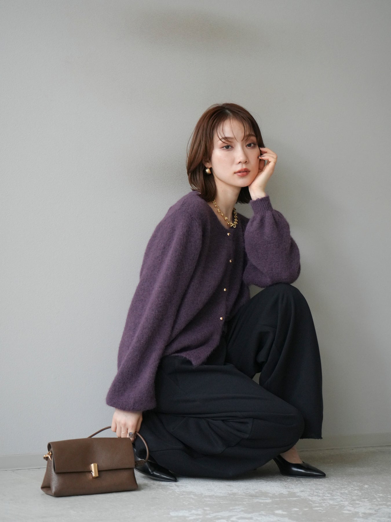 柔らかなタッチの起毛ニットを使用したカーディガン。ボリュームスリーブやゴールドボタンがアクセントになり、1枚で女性らしい印象に仕上がります。フロントを閉じてプルオーバー風にも、開けて羽織りとしても着用でき、着こなしの幅が広がる1着。