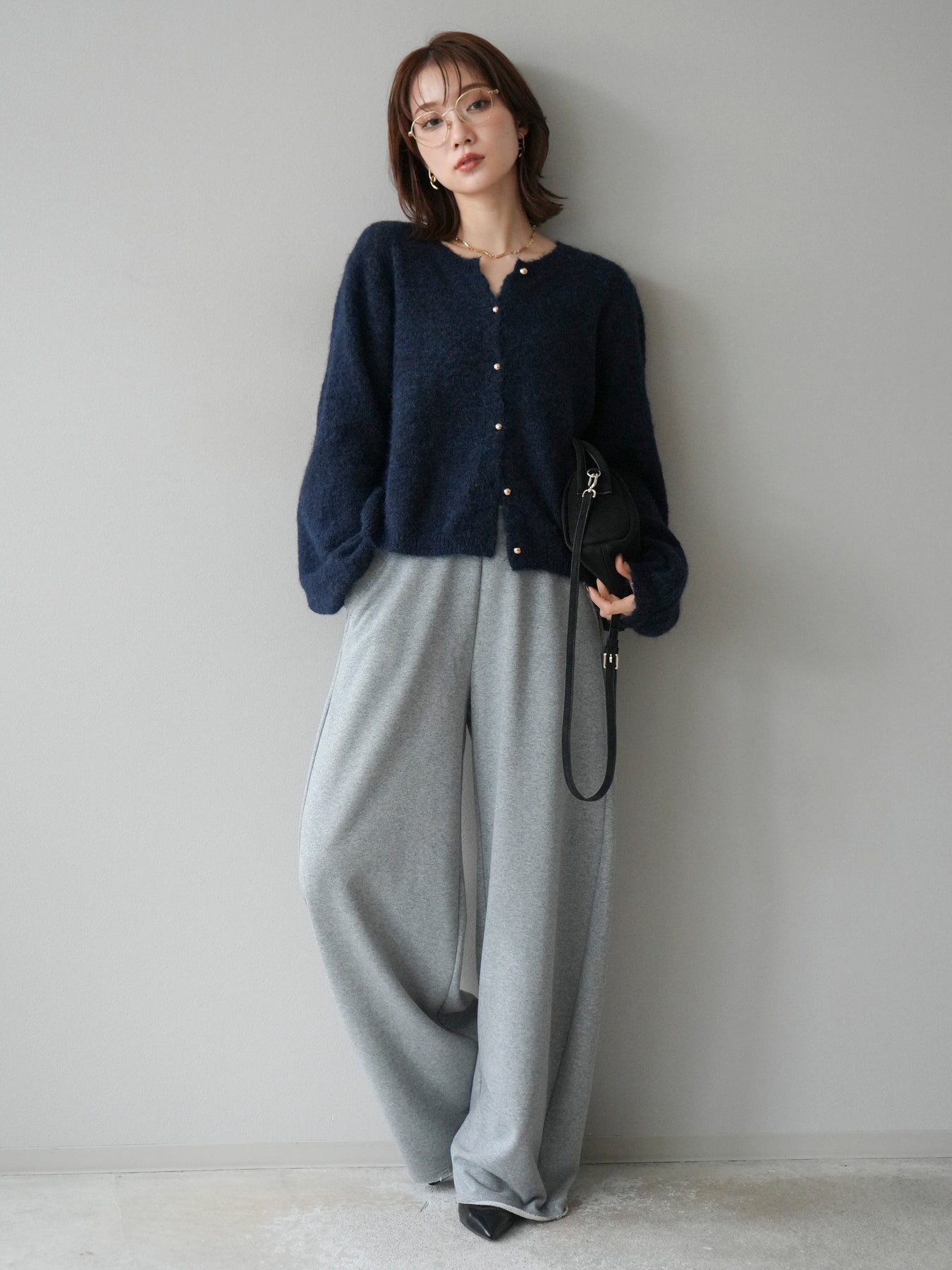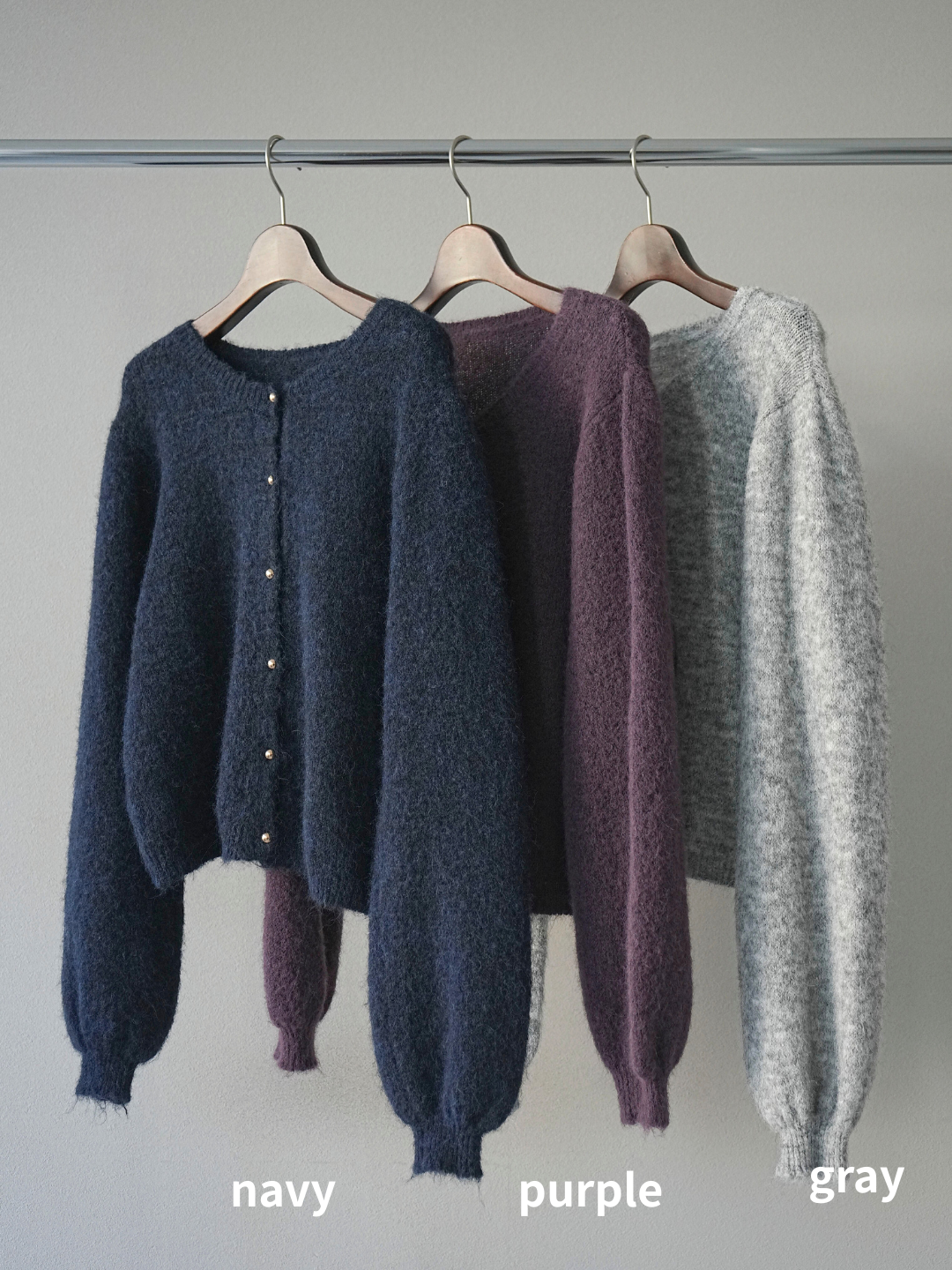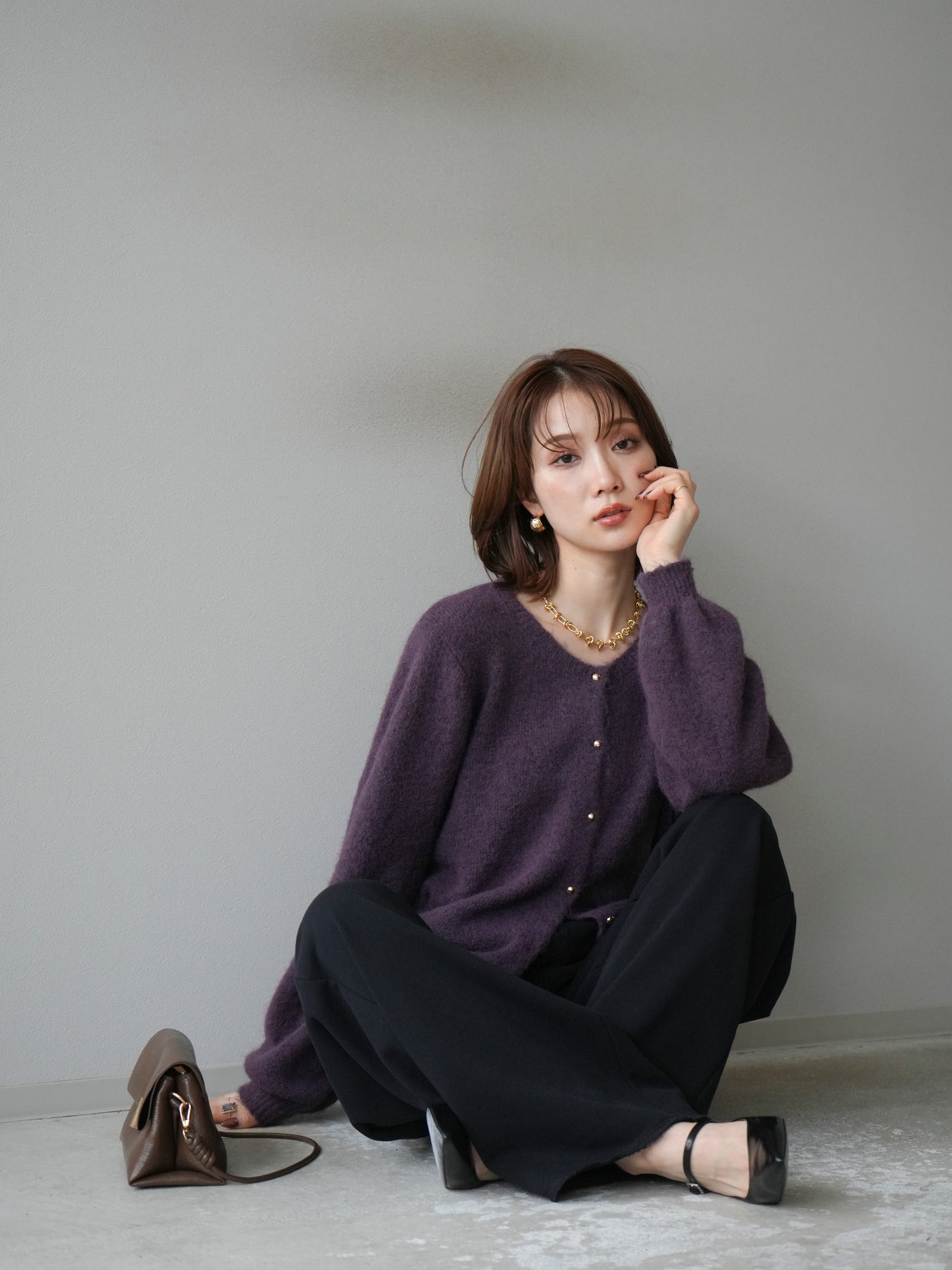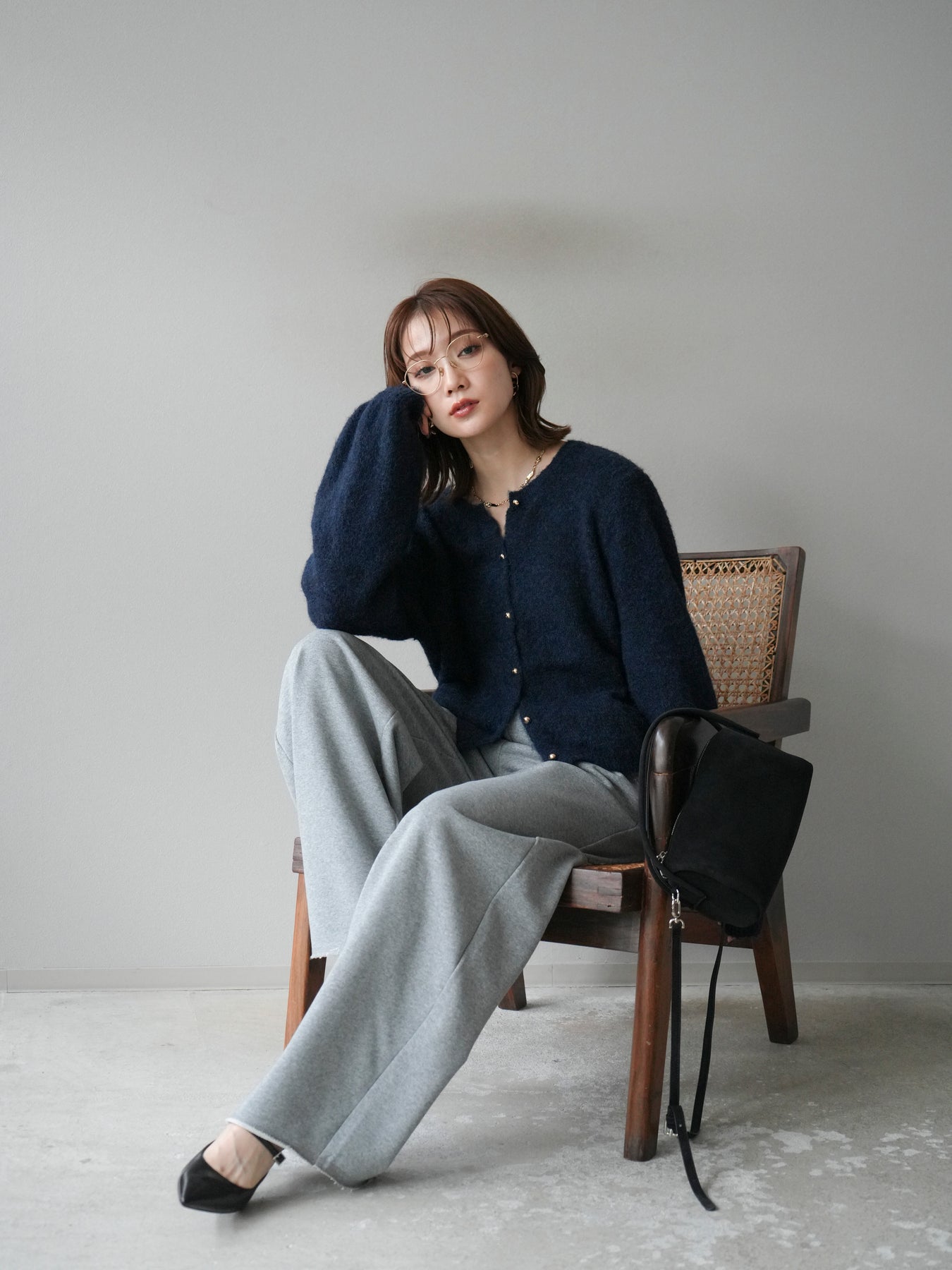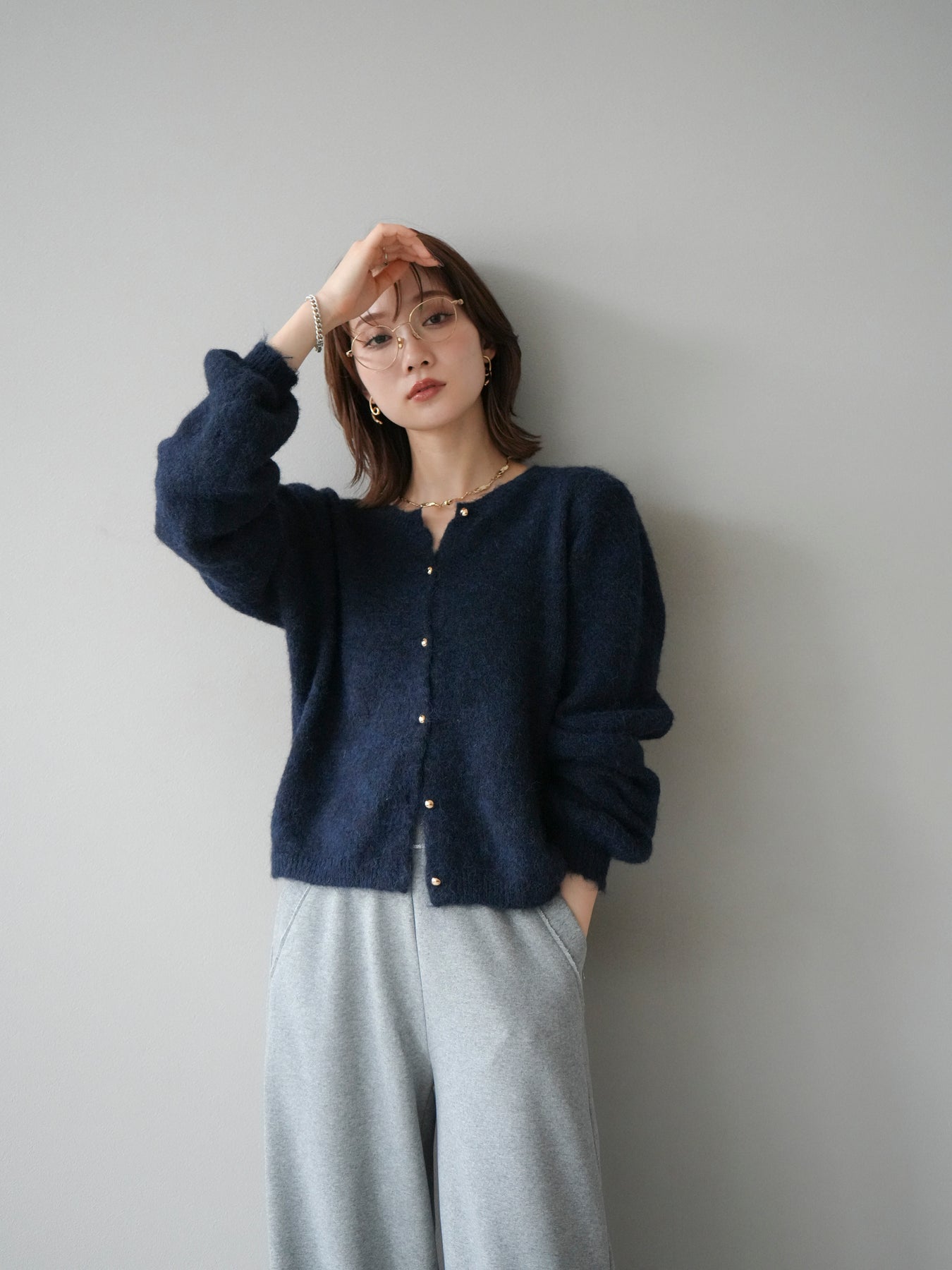 柔らかなタッチの起毛ニットを使用したカーディガン。ボリュームスリーブやゴールドボタンがアクセントになり、1枚で女性らしい印象に仕上がります。フロントを閉じてプルオーバー風にも、開けて羽織りとしても着用でき、着こなしの幅が広がる1着。