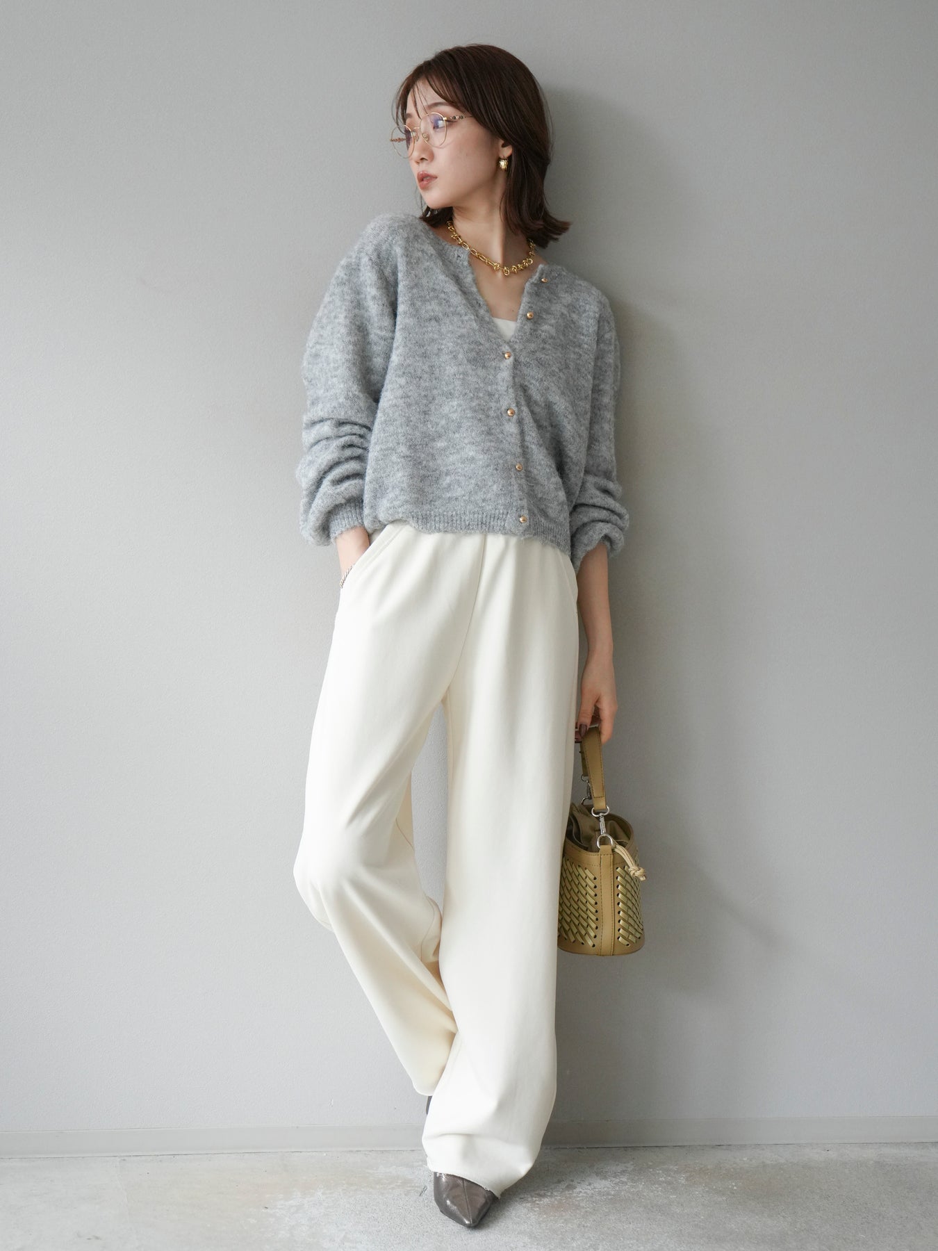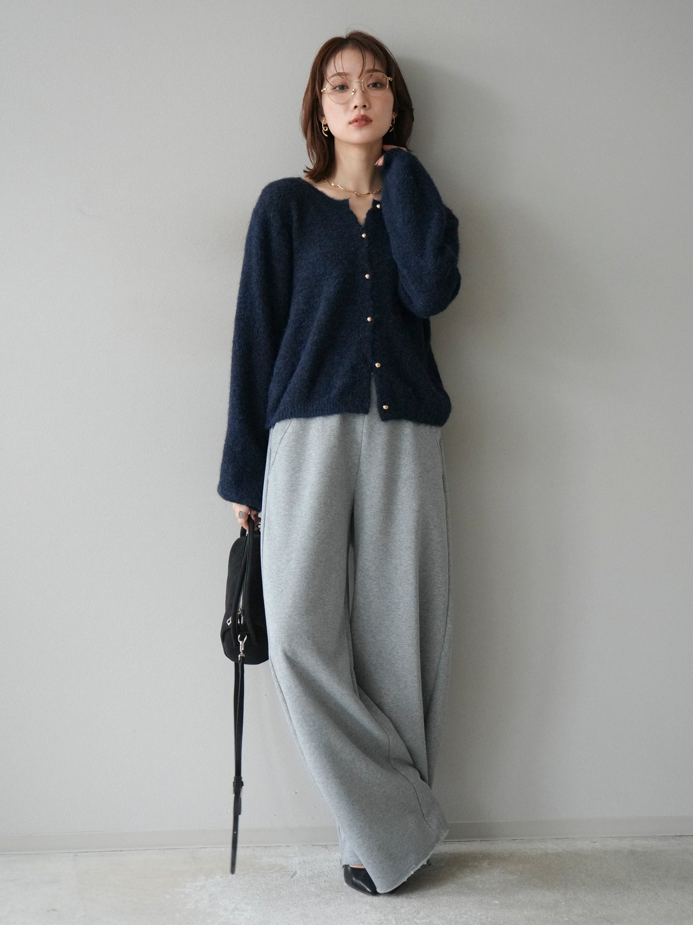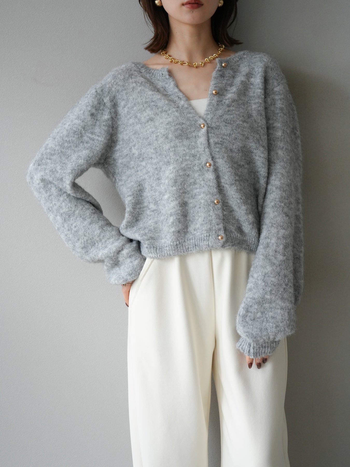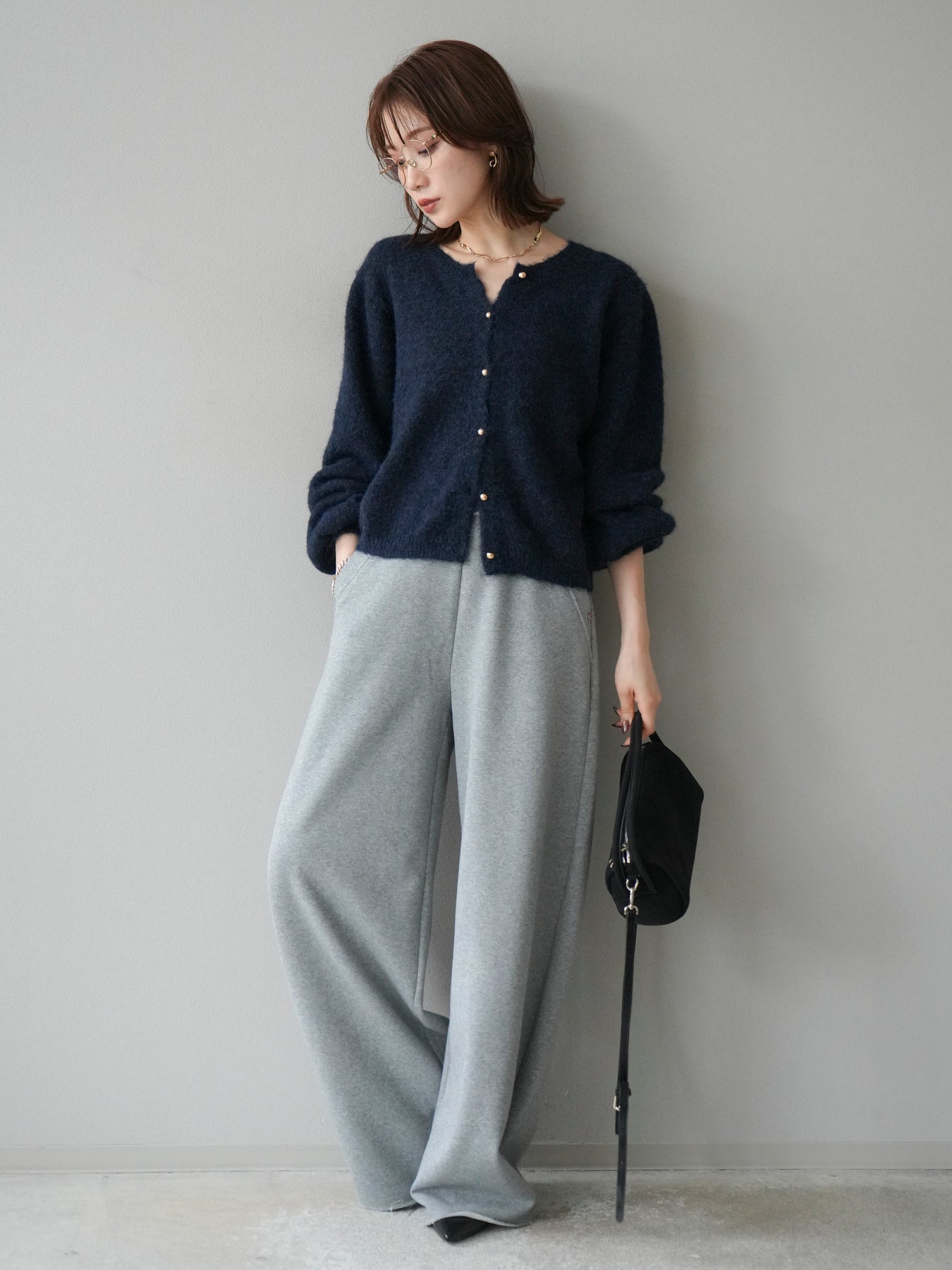 柔らかなタッチの起毛ニットを使用したカーディガン。ボリュームスリーブやゴールドボタンがアクセントになり、1枚で女性らしい印象に仕上がります。フロントを閉じてプルオーバー風にも、開けて羽織りとしても着用でき、着こなしの幅が広がる1着。