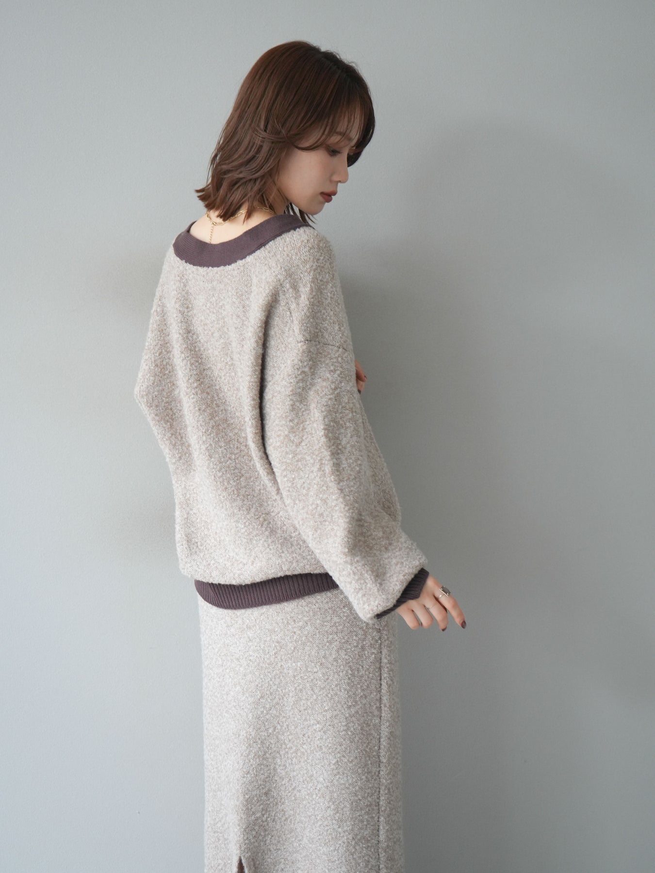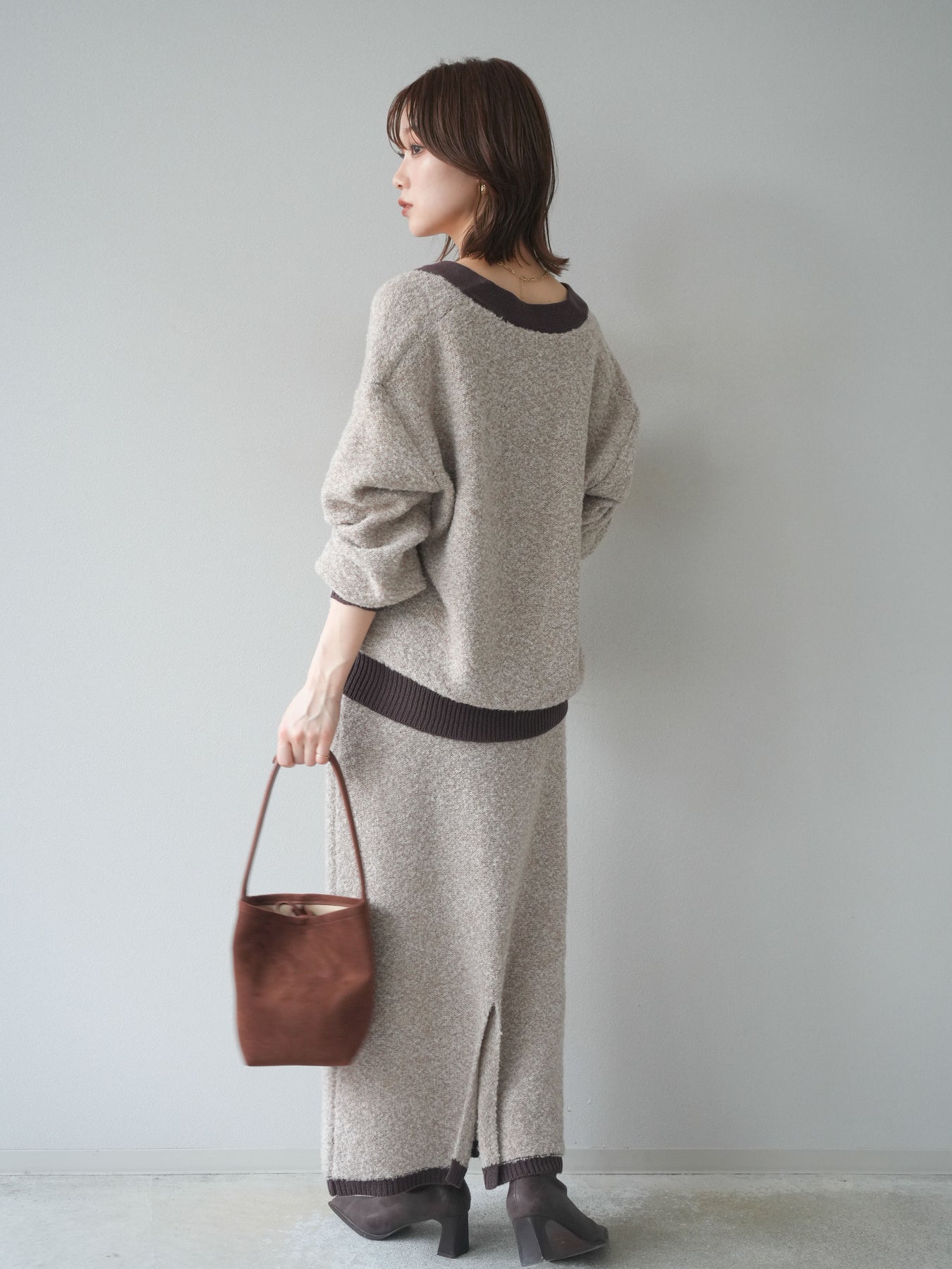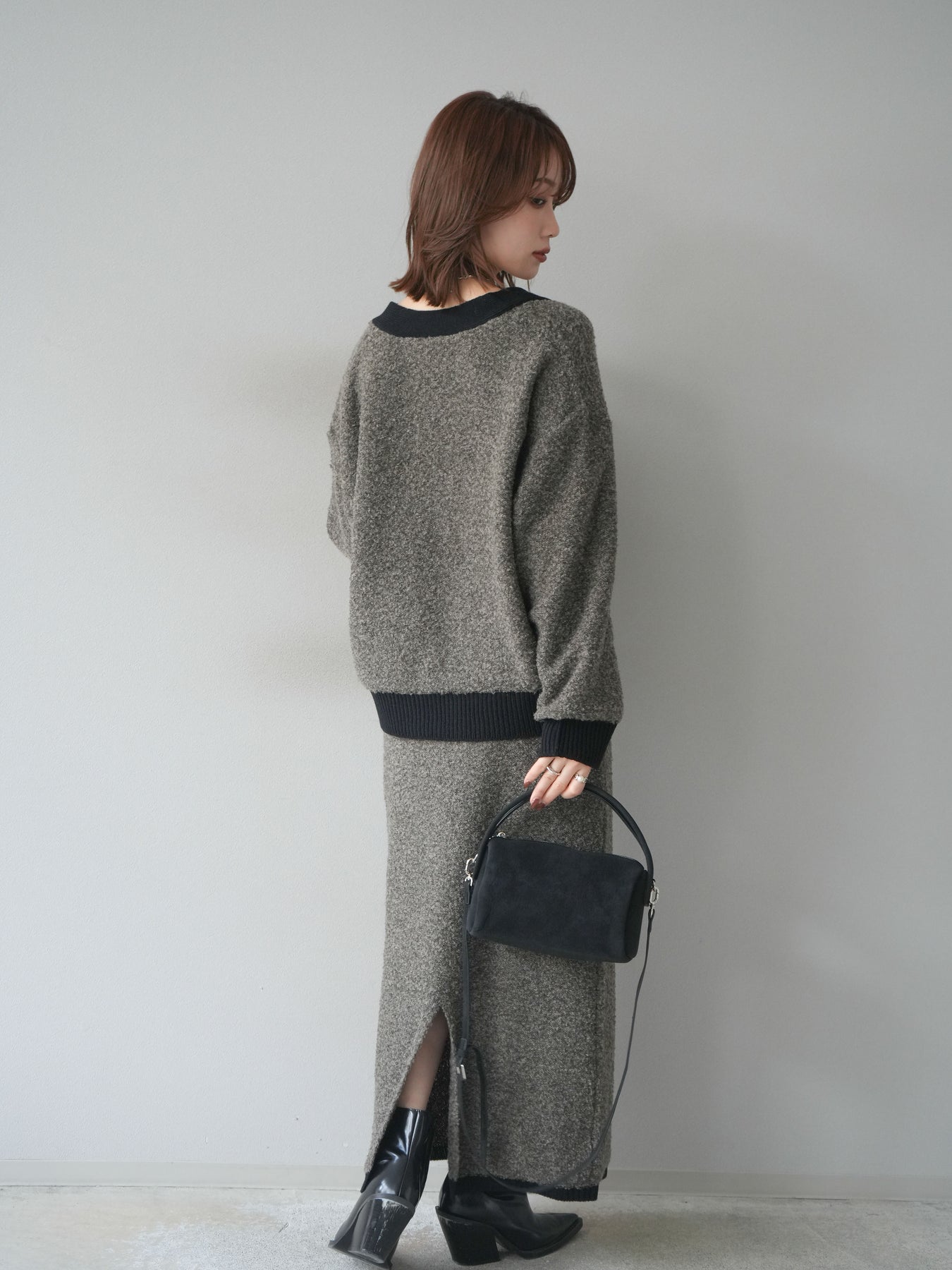 表情のあるブークレ素材を使用したタイトニットスカート。シンプルなシルエットながらも、ウエストと裾に施されたバイカラーの切り替えがスタイリングにアクセントを加えます。すっきりとしたIラインで縦のラインを強調し、スタイルアップ効果も期待できる一着。柔らかな風合いで着心地が良く、デイリー使いはもちろん、合わせるトップス次第でモードにもフェミニンにも印象を変えて楽しめます。同素材のベストと合わせたセットアップスタイルもおすすめ。