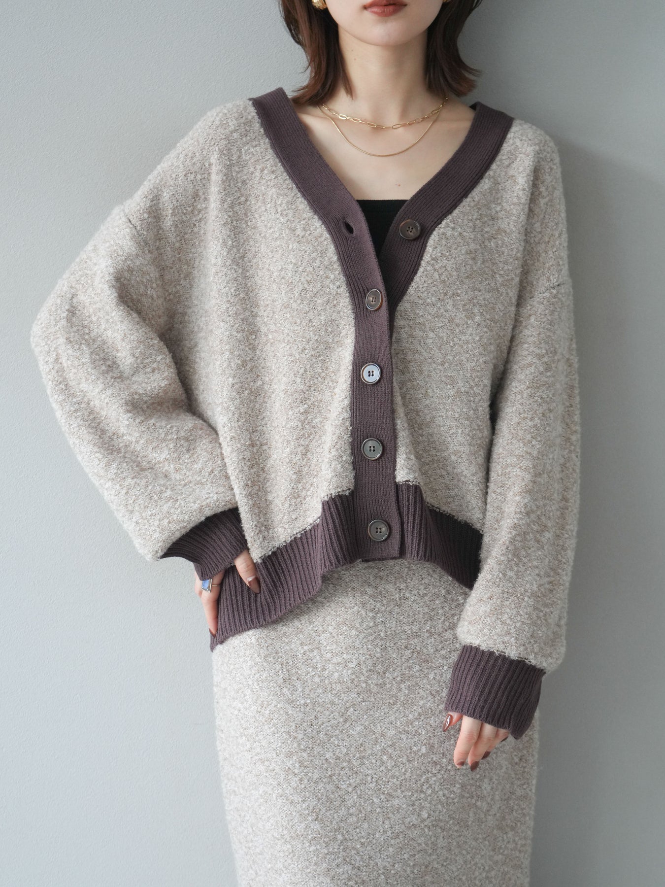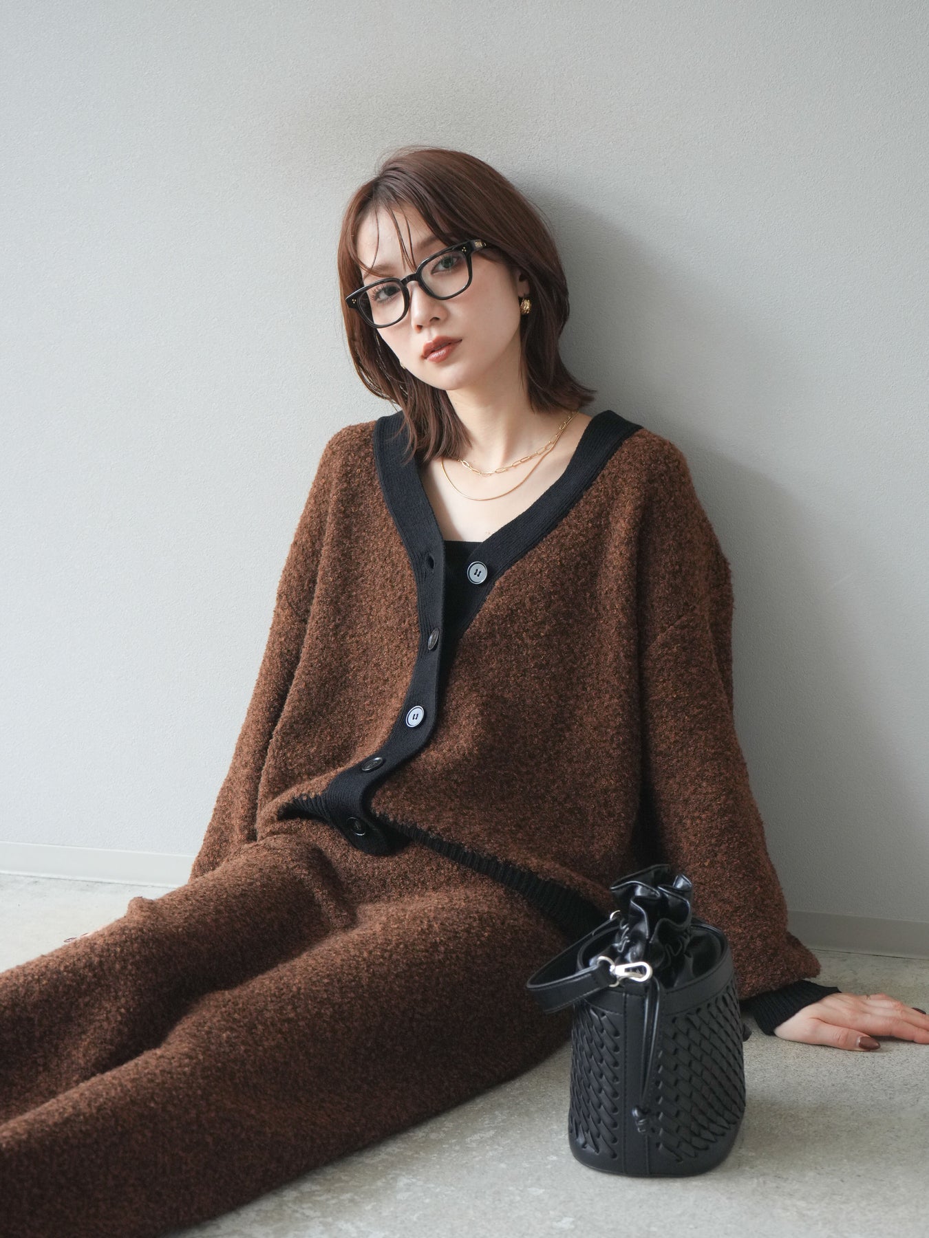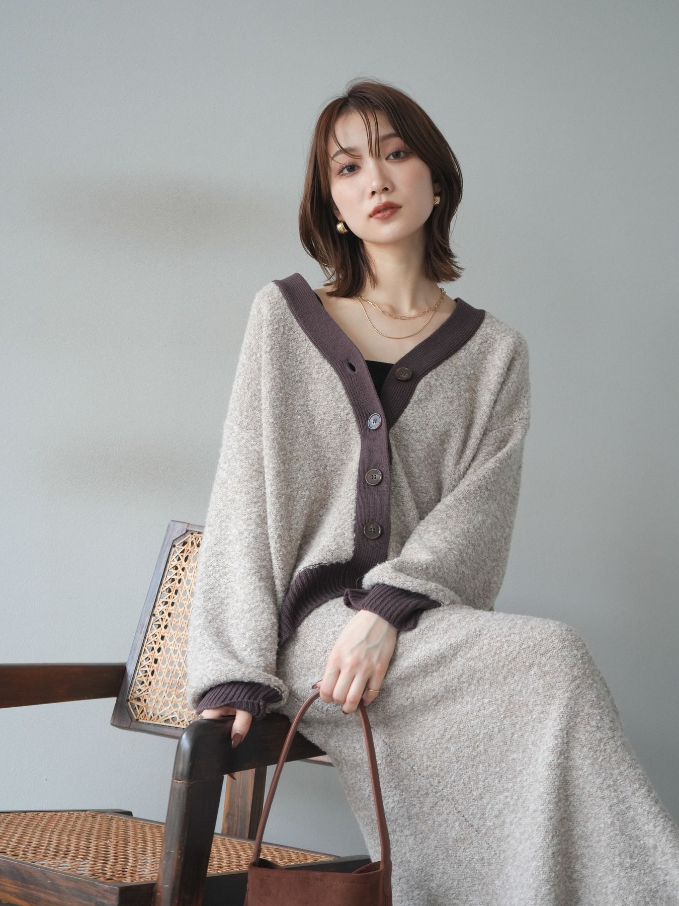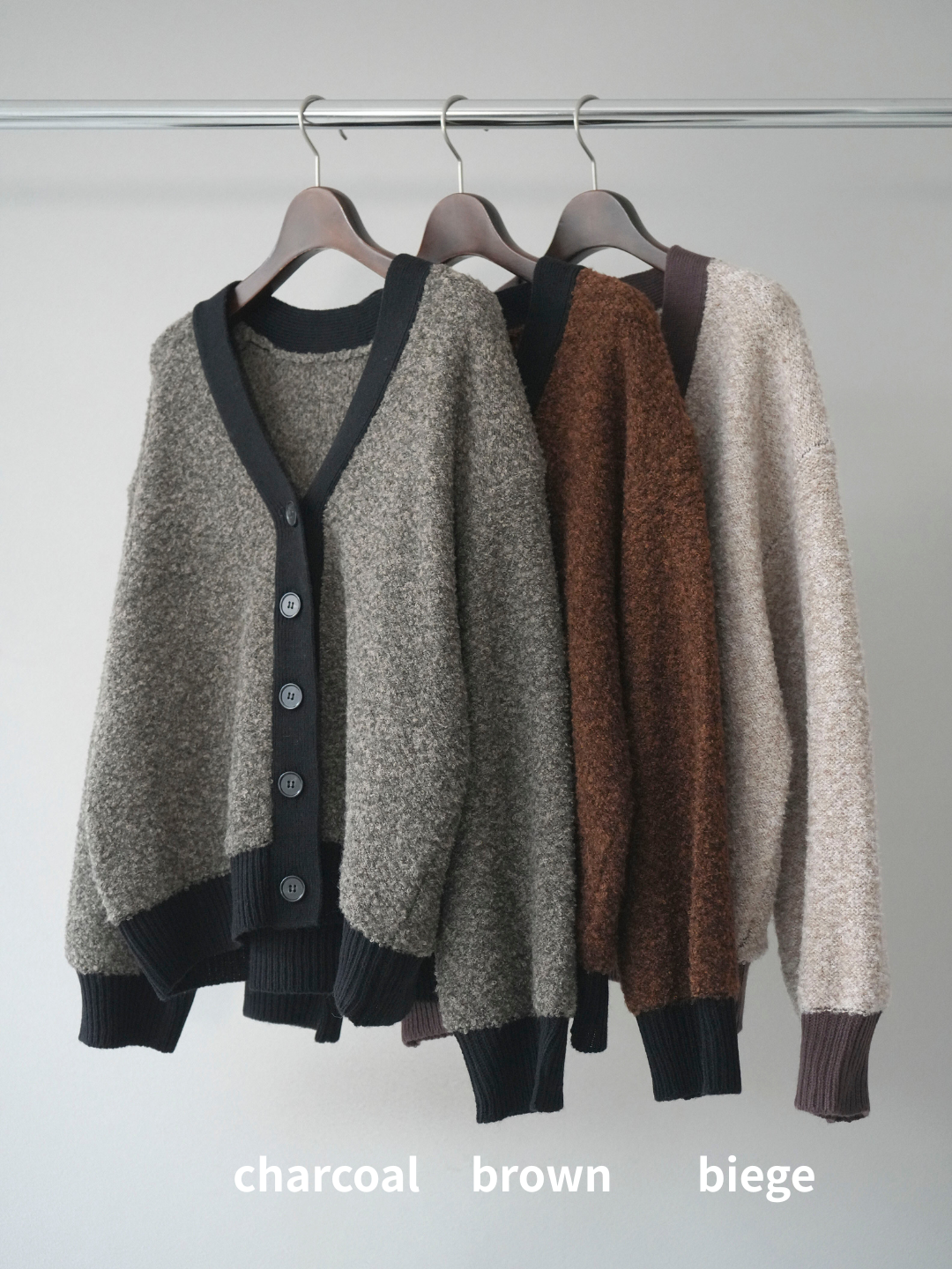 柔らかなブークレ素材で仕上げたニットカーディガン。もこもことした独特の表面感が季節感を引き立て、見た目にも着心地にもあたたかみを添えてくれます。フロントや裾、袖口には配色のリブ編みを効かせ、シンプルながらもバイカラーのデザインがさりげないアクセントに。ゆったりとしたドロップショルダーと程よいオーバーシルエットで、カジュアルにも女性らしくも着こなせる万能アイテムです。ボタンを閉じてトップス風に着ても、開けて羽織としてもバランス良く決まる1着。