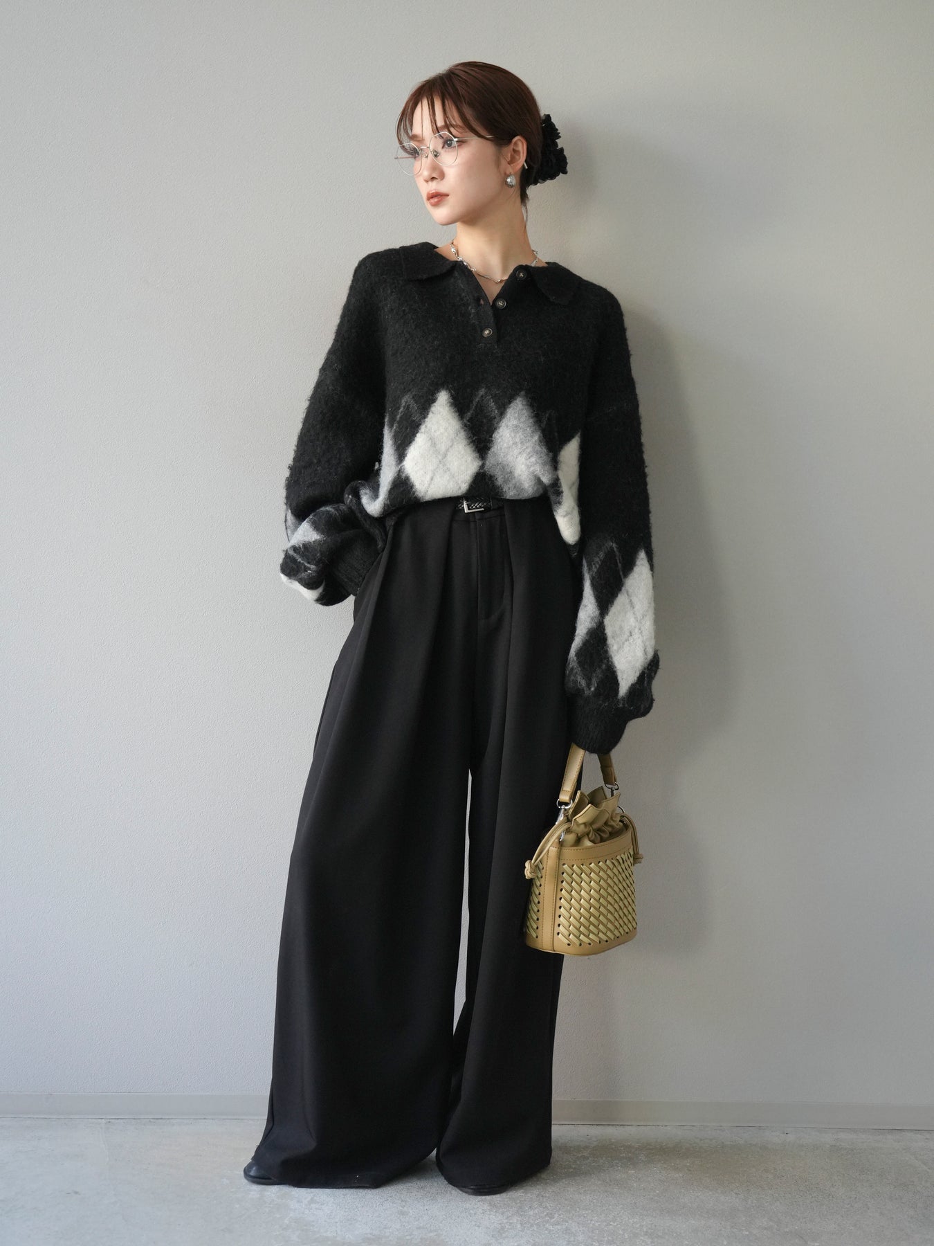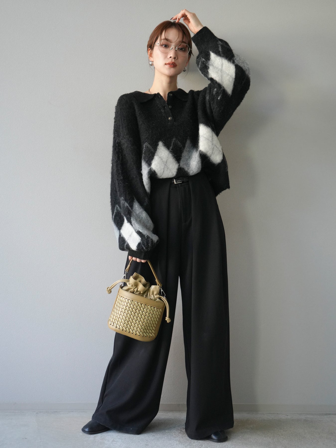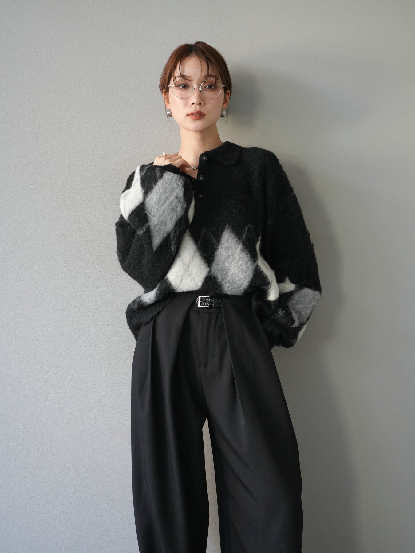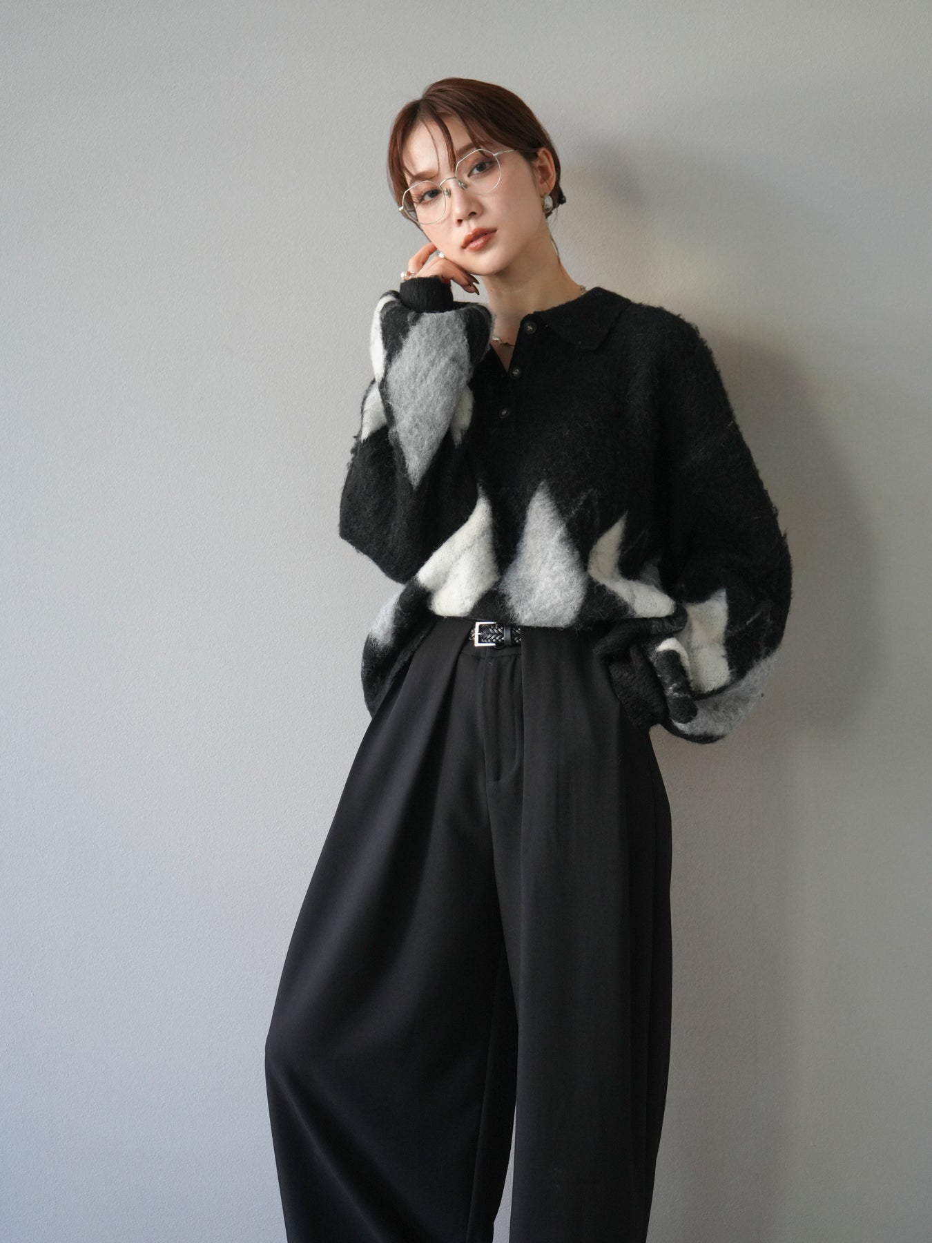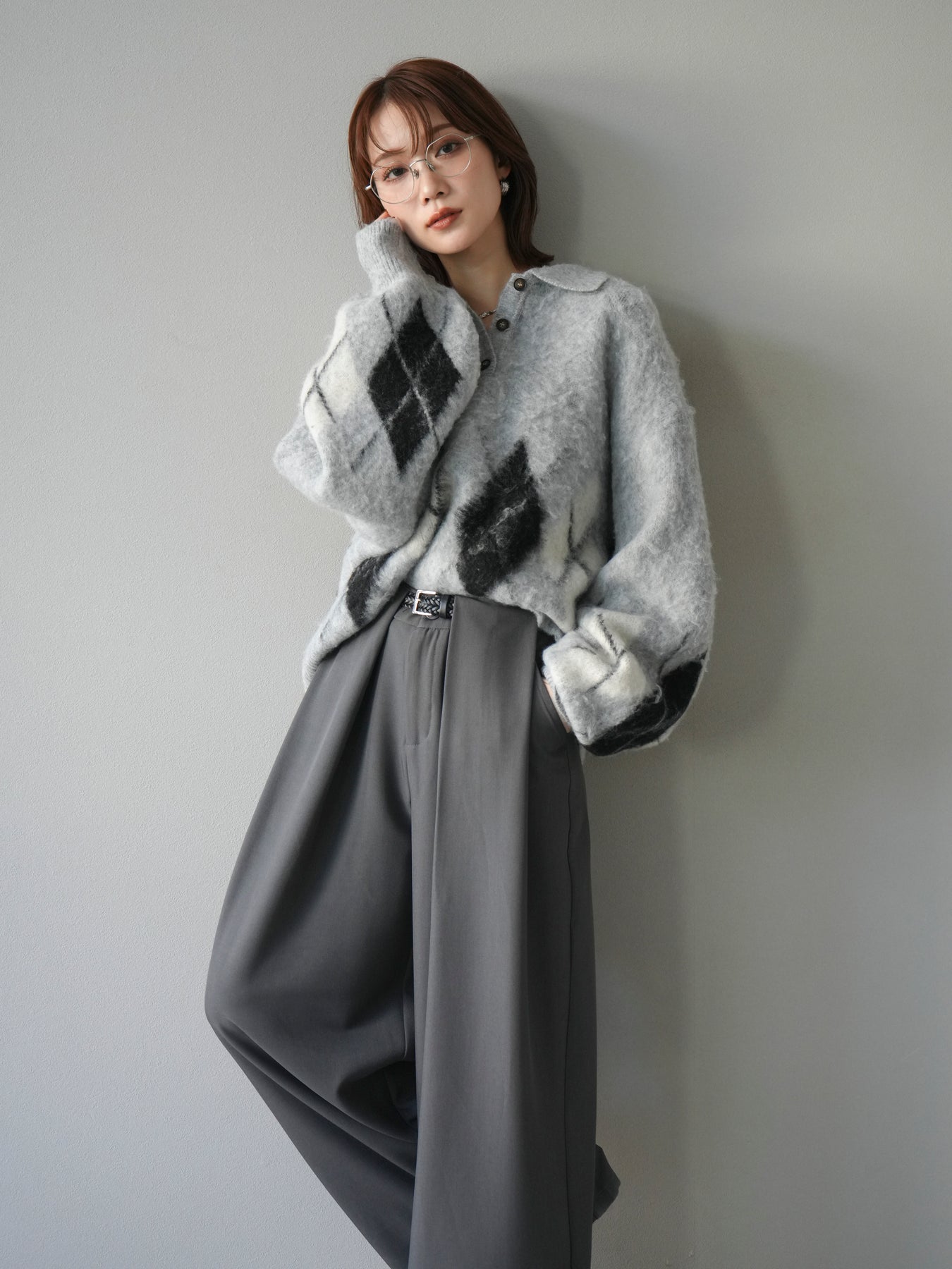 [SET]アーガイル柄ルーズポロニットプルオーバー+ベルトループデザインワイドパンツ(2set)