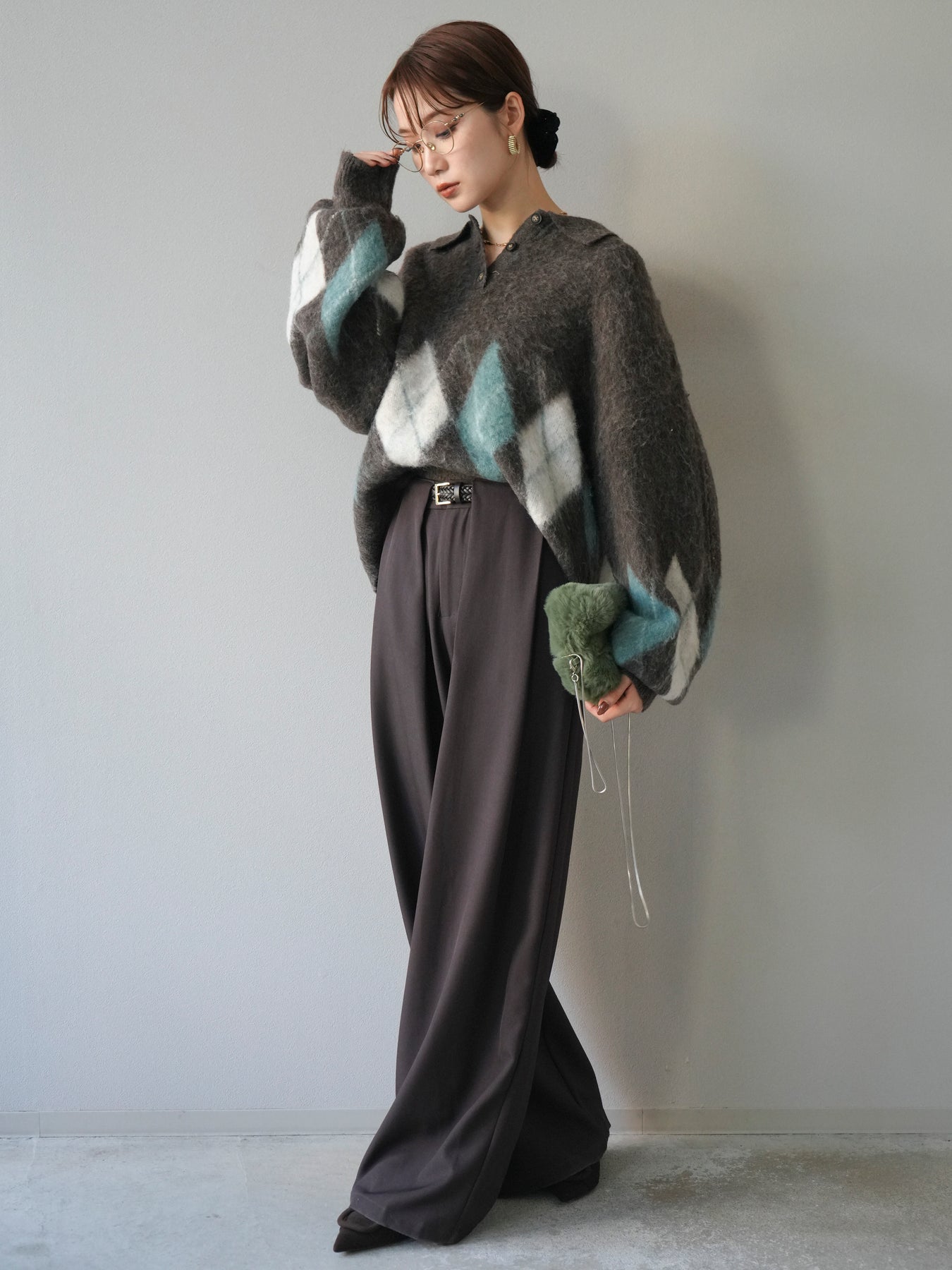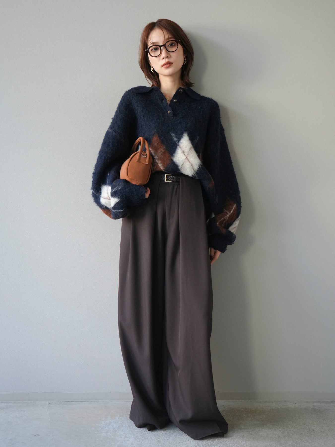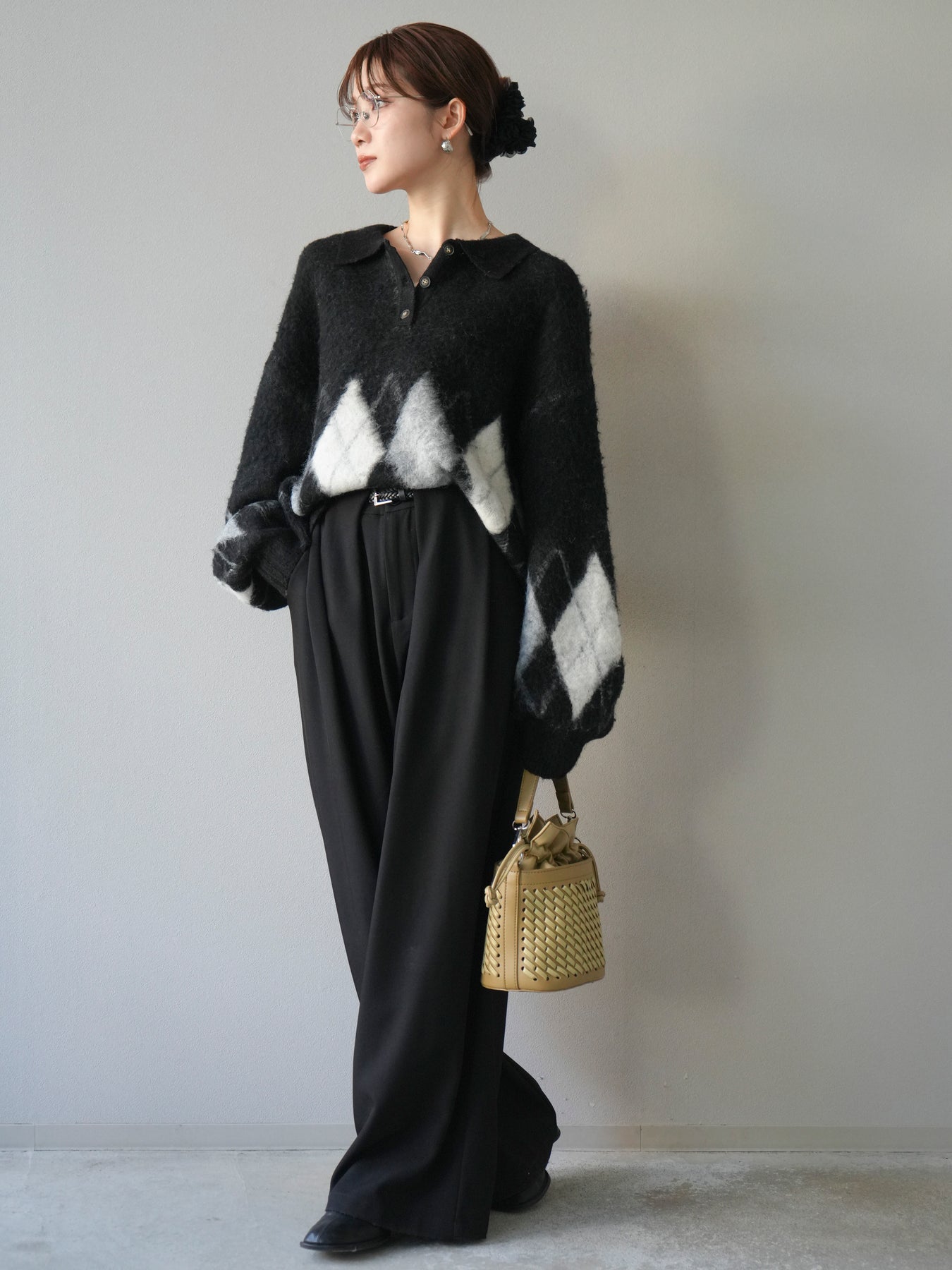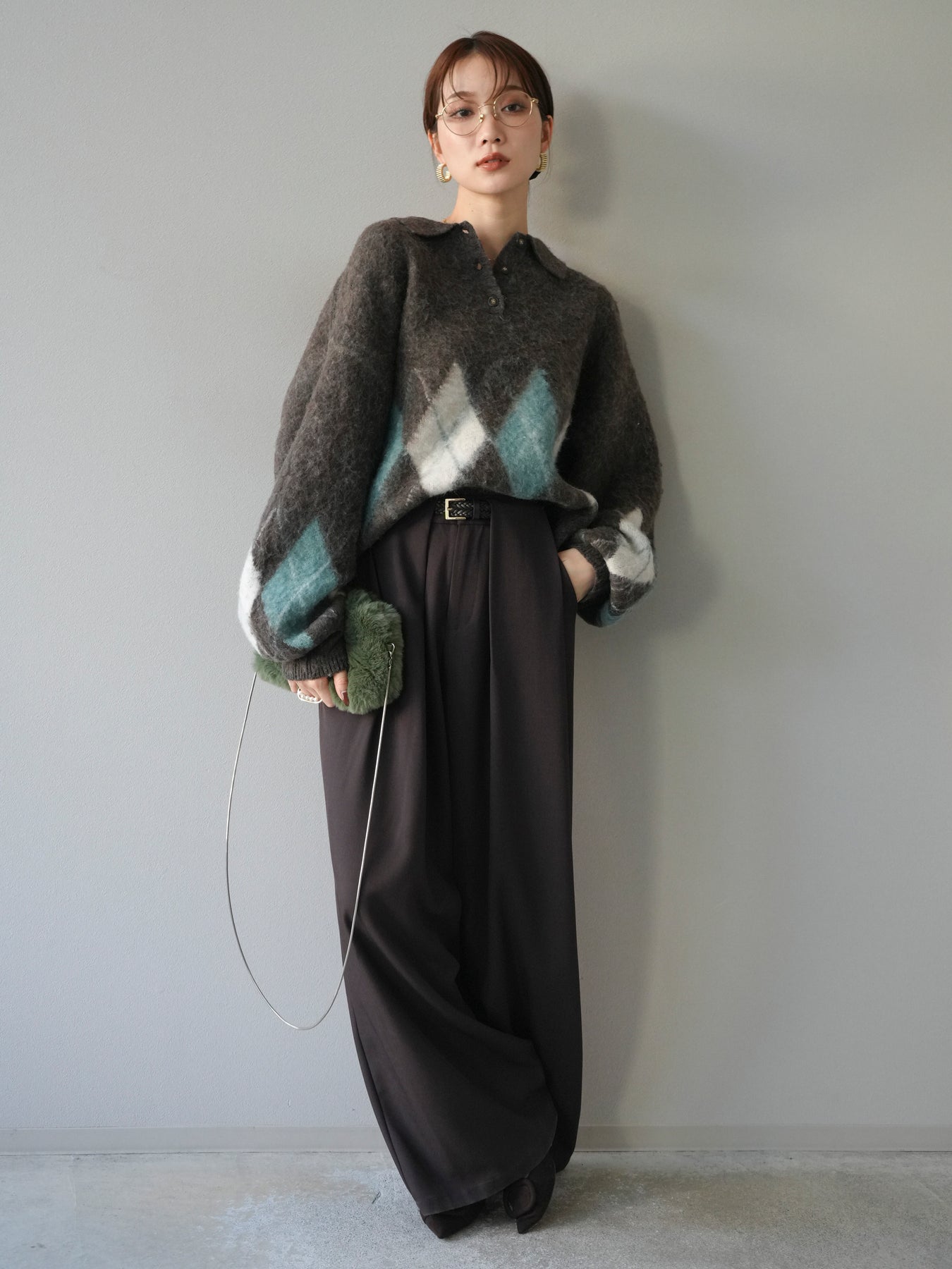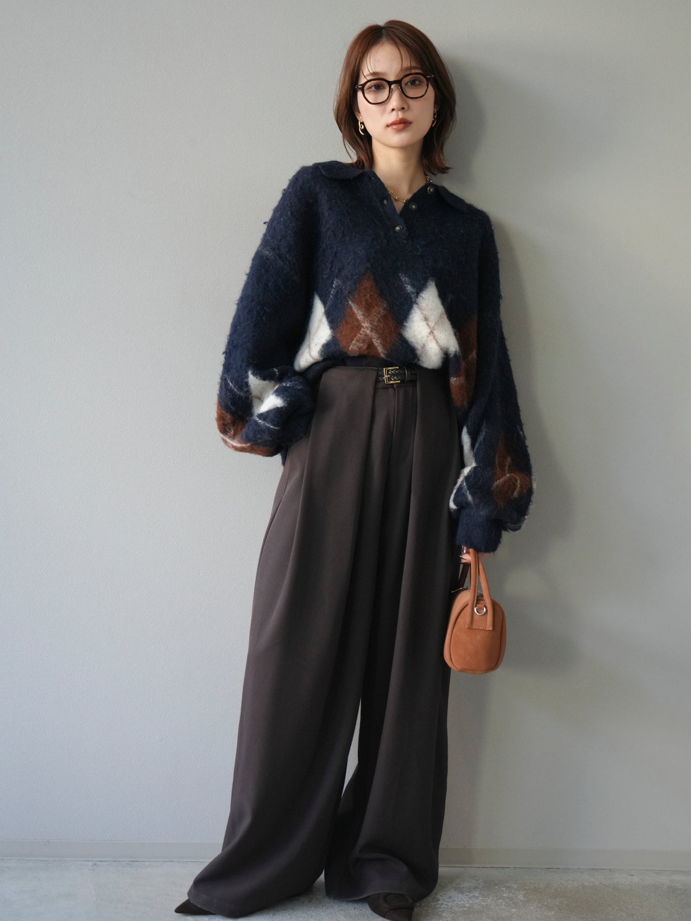[SET]アーガイル柄ルーズポロニットプルオーバー+ベルトループデザインワイドパンツ(2set)