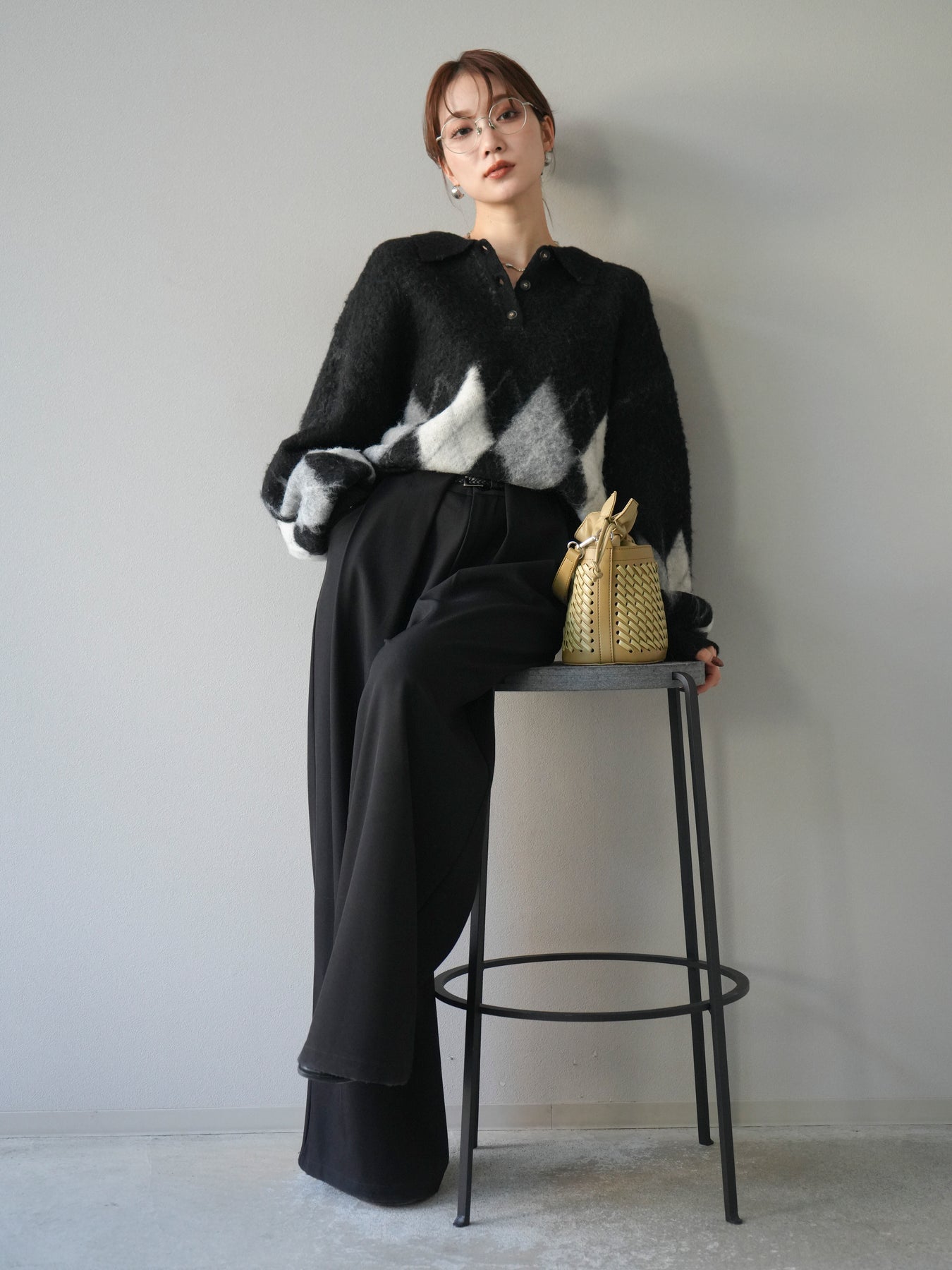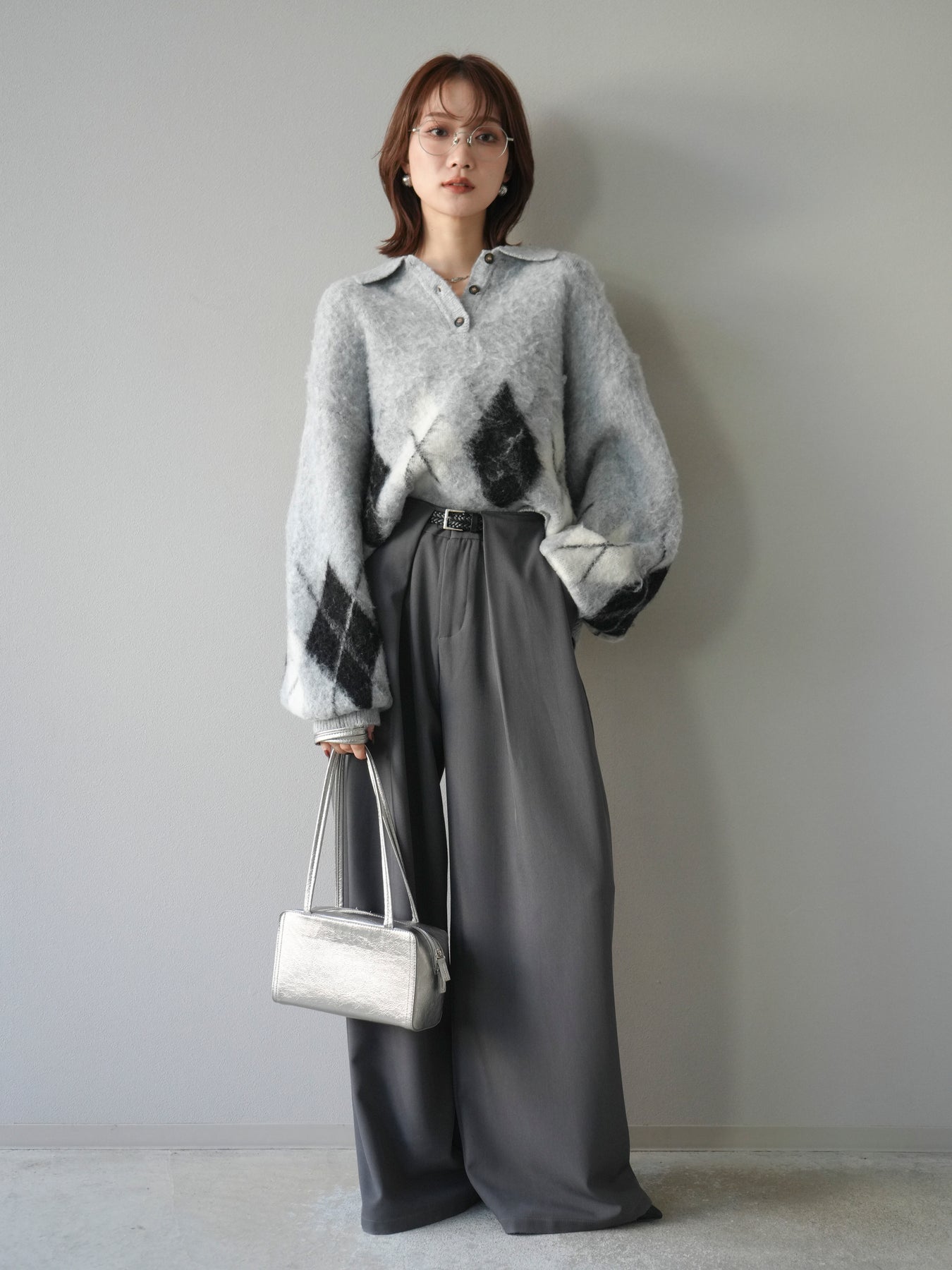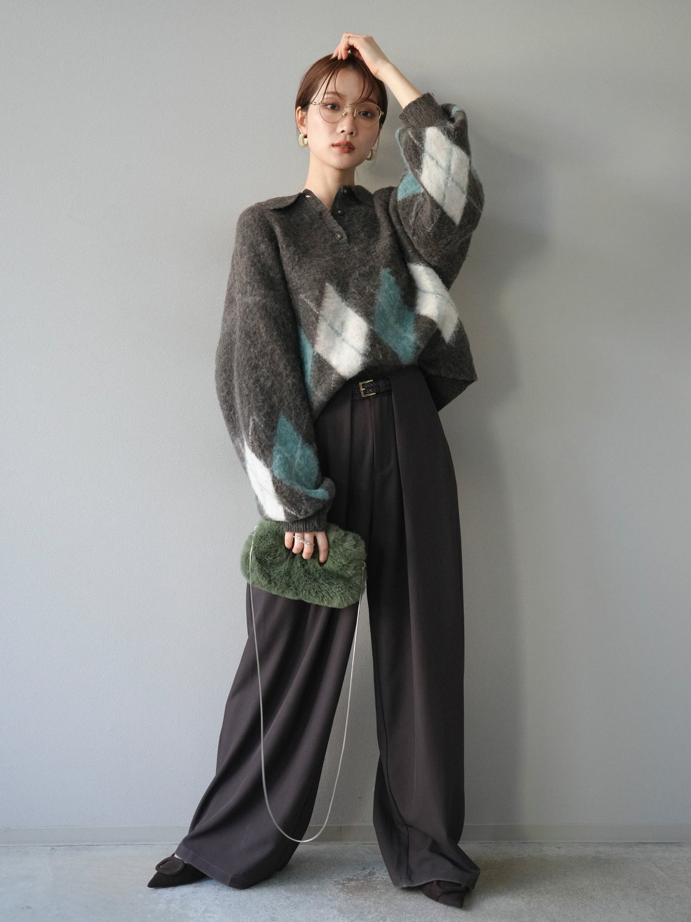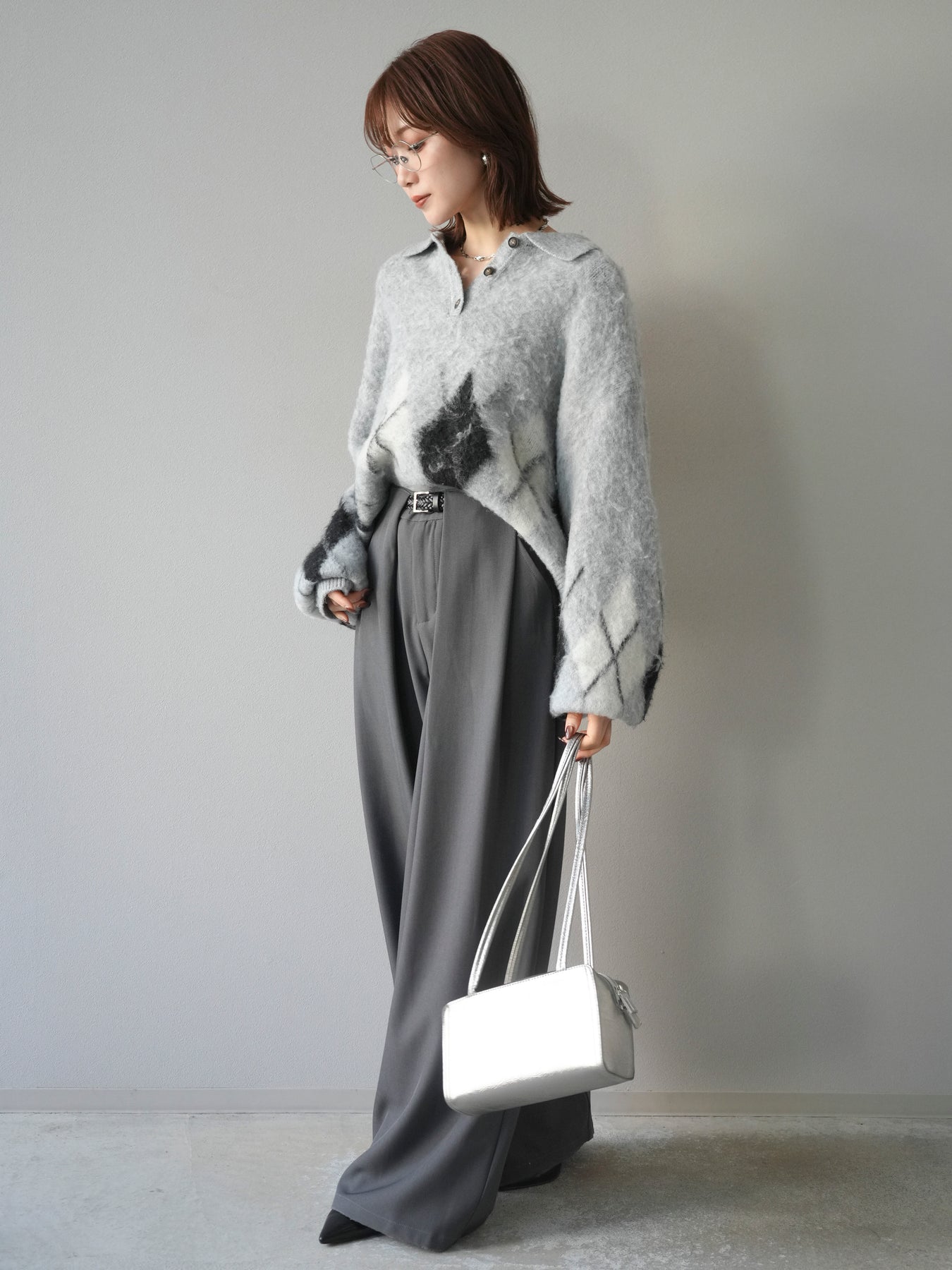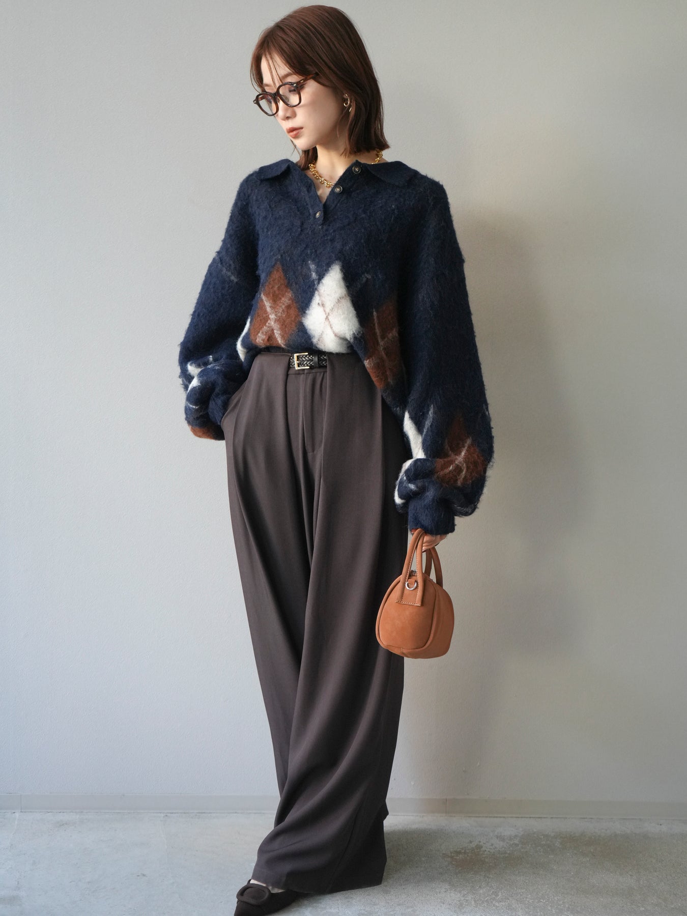 [SET]アーガイル柄ルーズポロニットプルオーバー+ベルトループデザインワイドパンツ(2set)