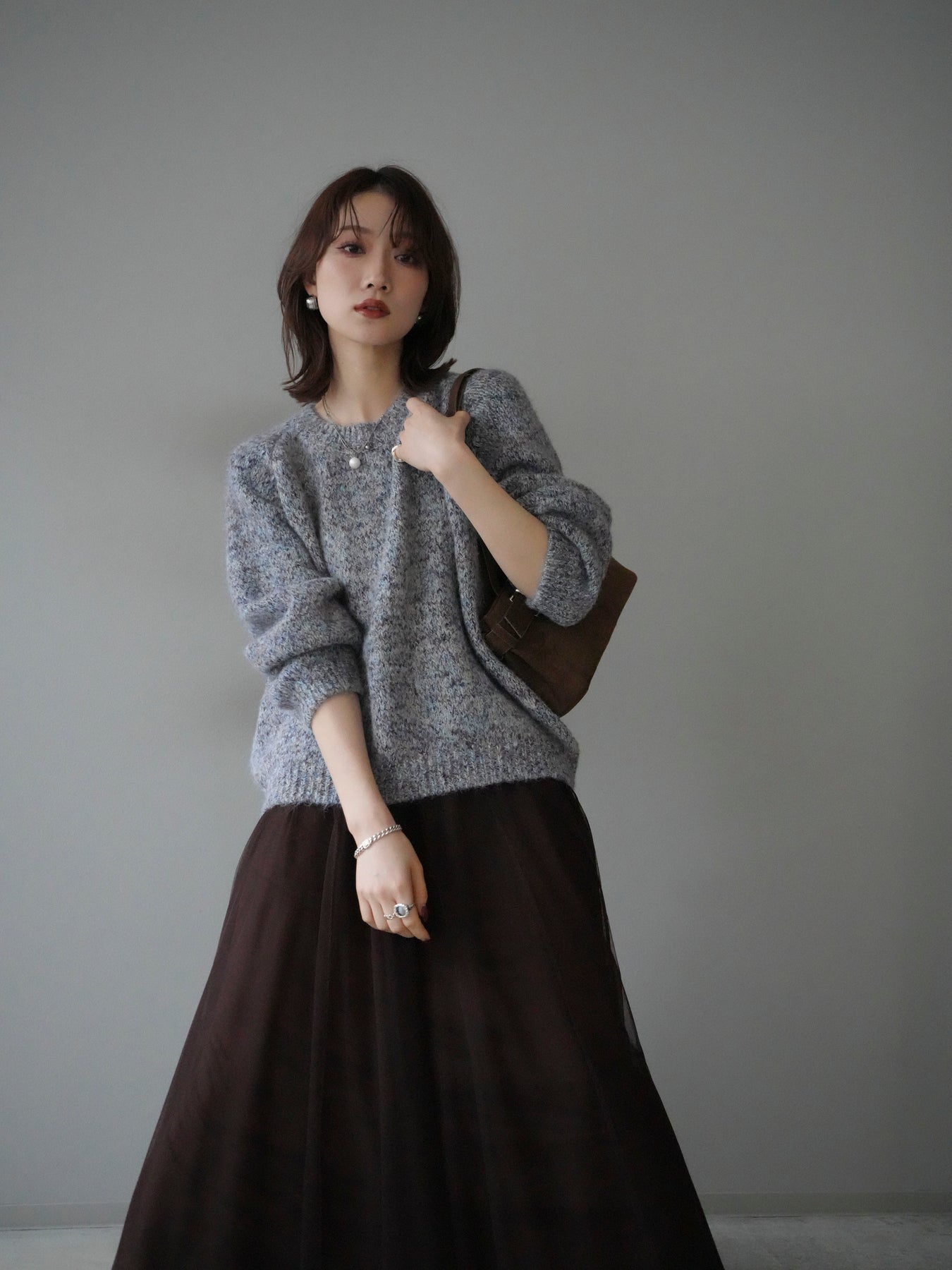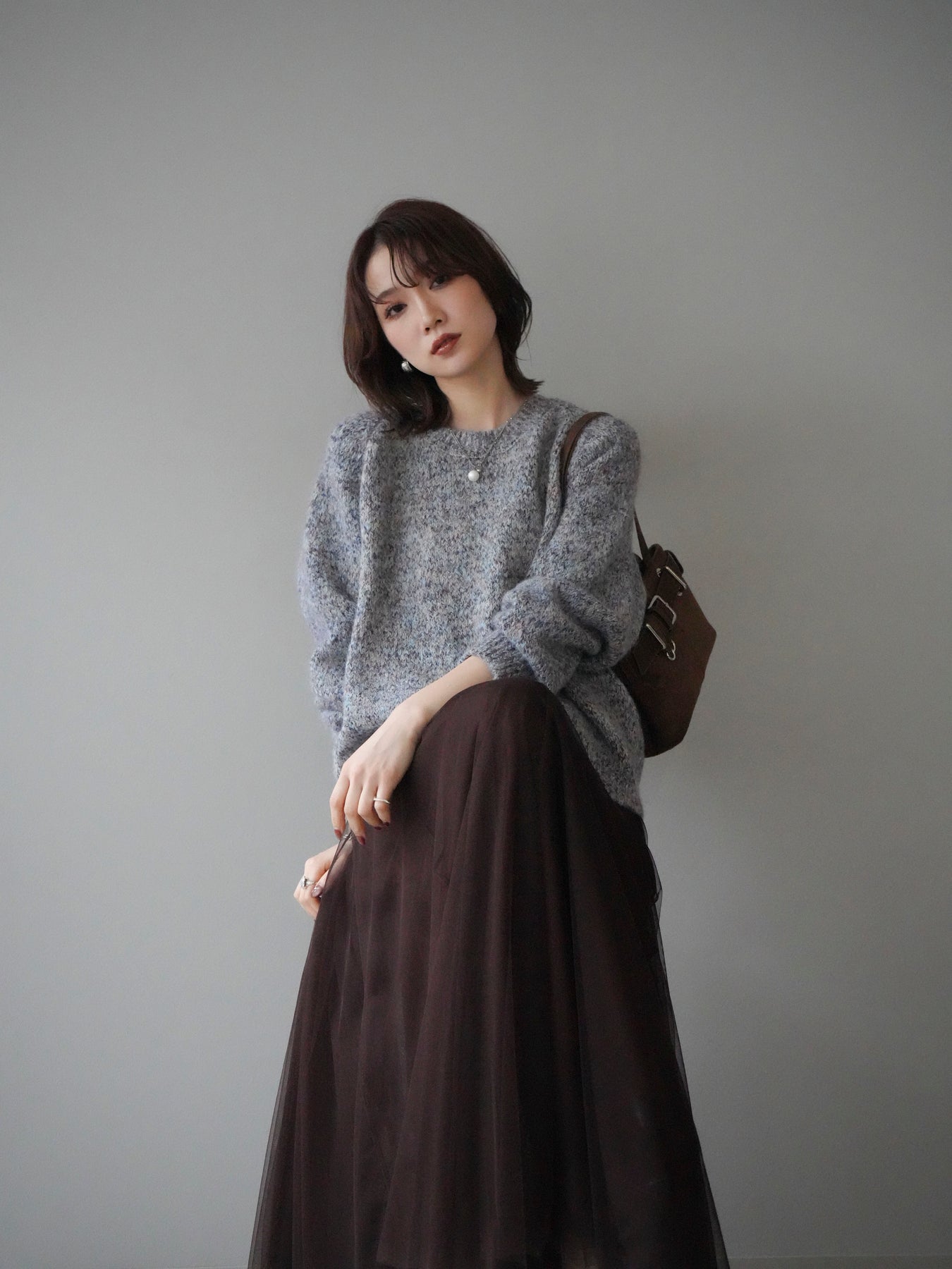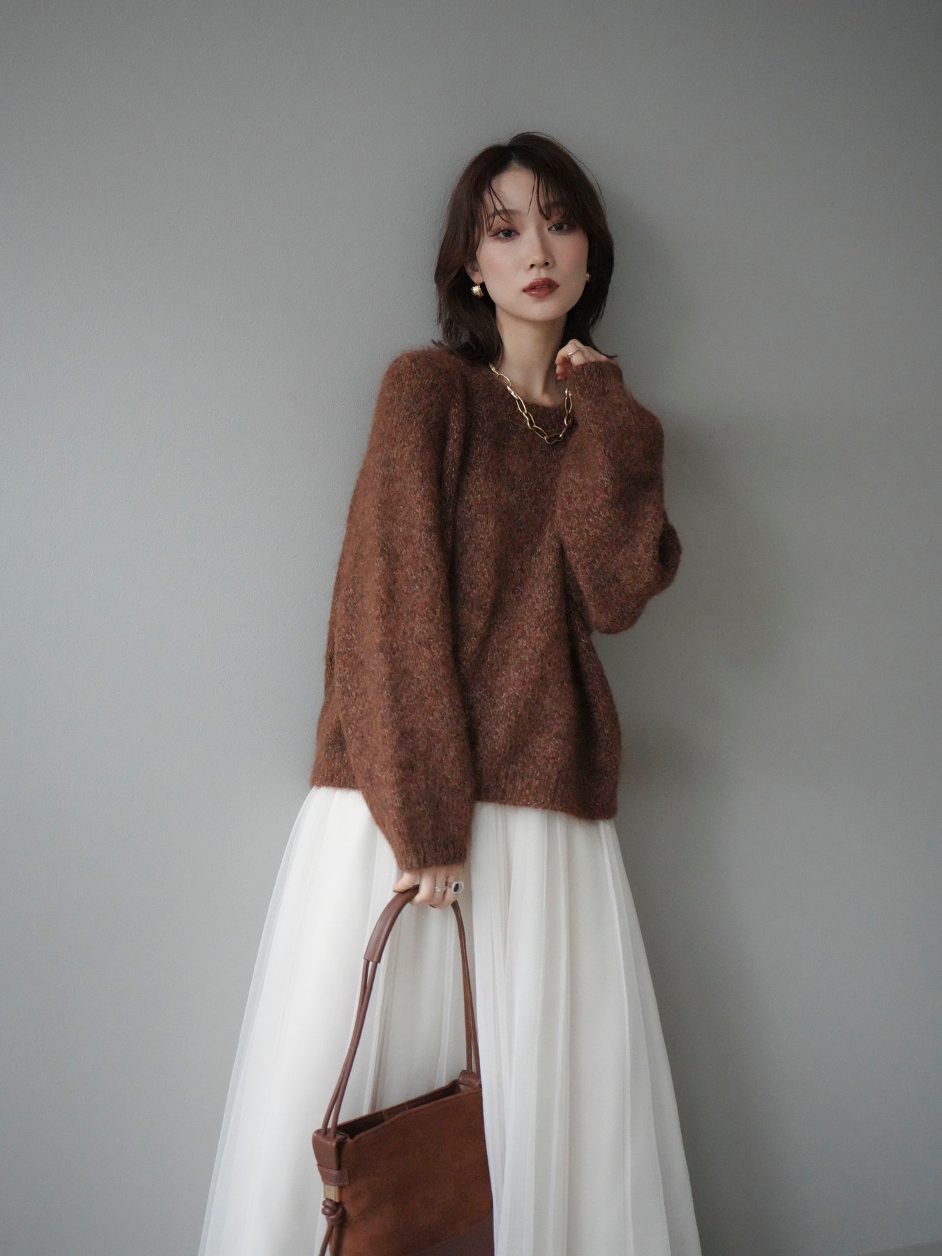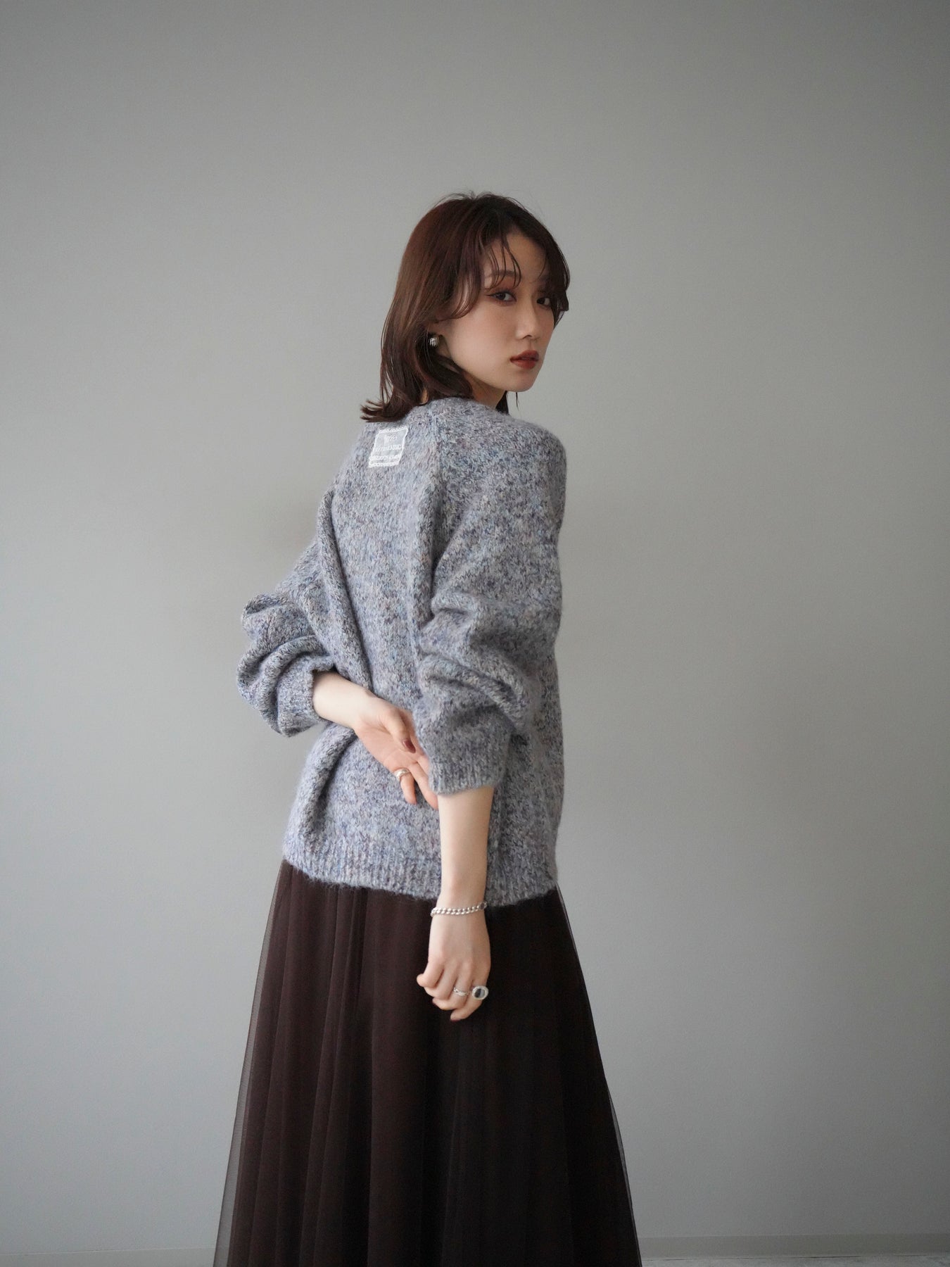 表情豊かなミックスヤーンで編み立てた、あたたかみのあるニットプルオーバー。 背中のロゴラベルがさりげないアクセントになり、シンプルながらもこなれ感のあるデザインです。 ふんわりとした柔らかな風合いで着心地が良く、シーズンムードを引き立てます。 ゆったりとしたシルエットが抜け感を演出し、デイリーコーデに程よいリラックス感をプラス。 パンツにもスカートにも合わせやすく、1枚で主役になる万能ニットです。 ※ボトムス、キャミソール(インナー)以外の商品は一律でインナーは付属していません。