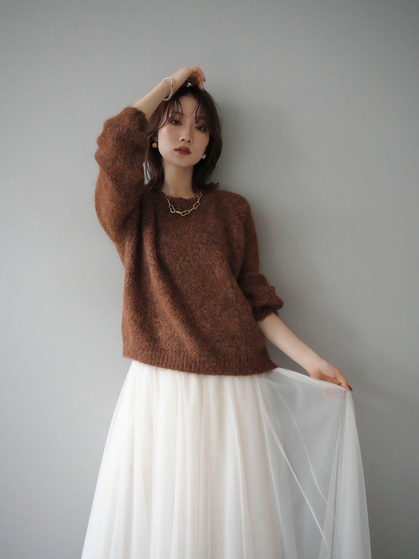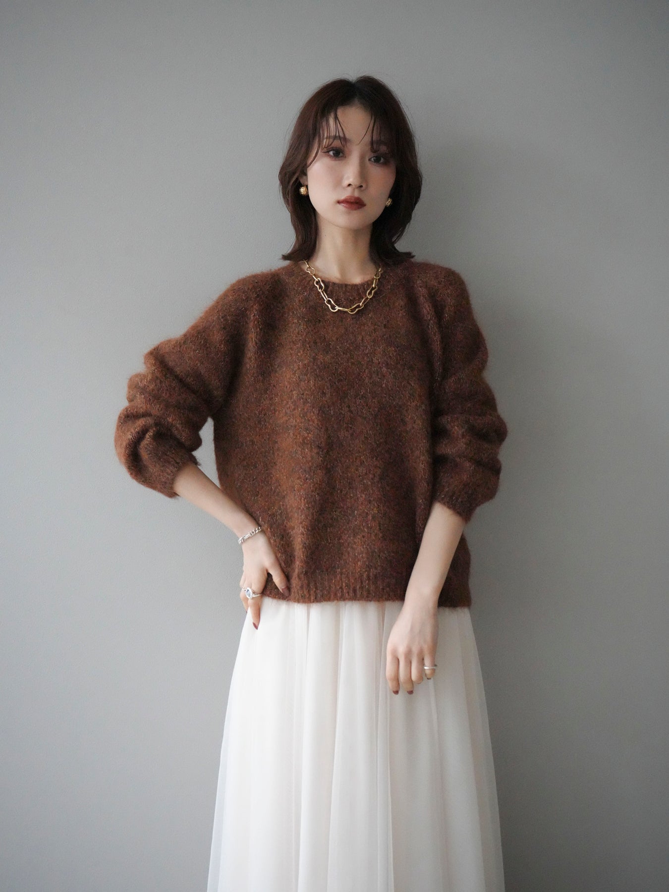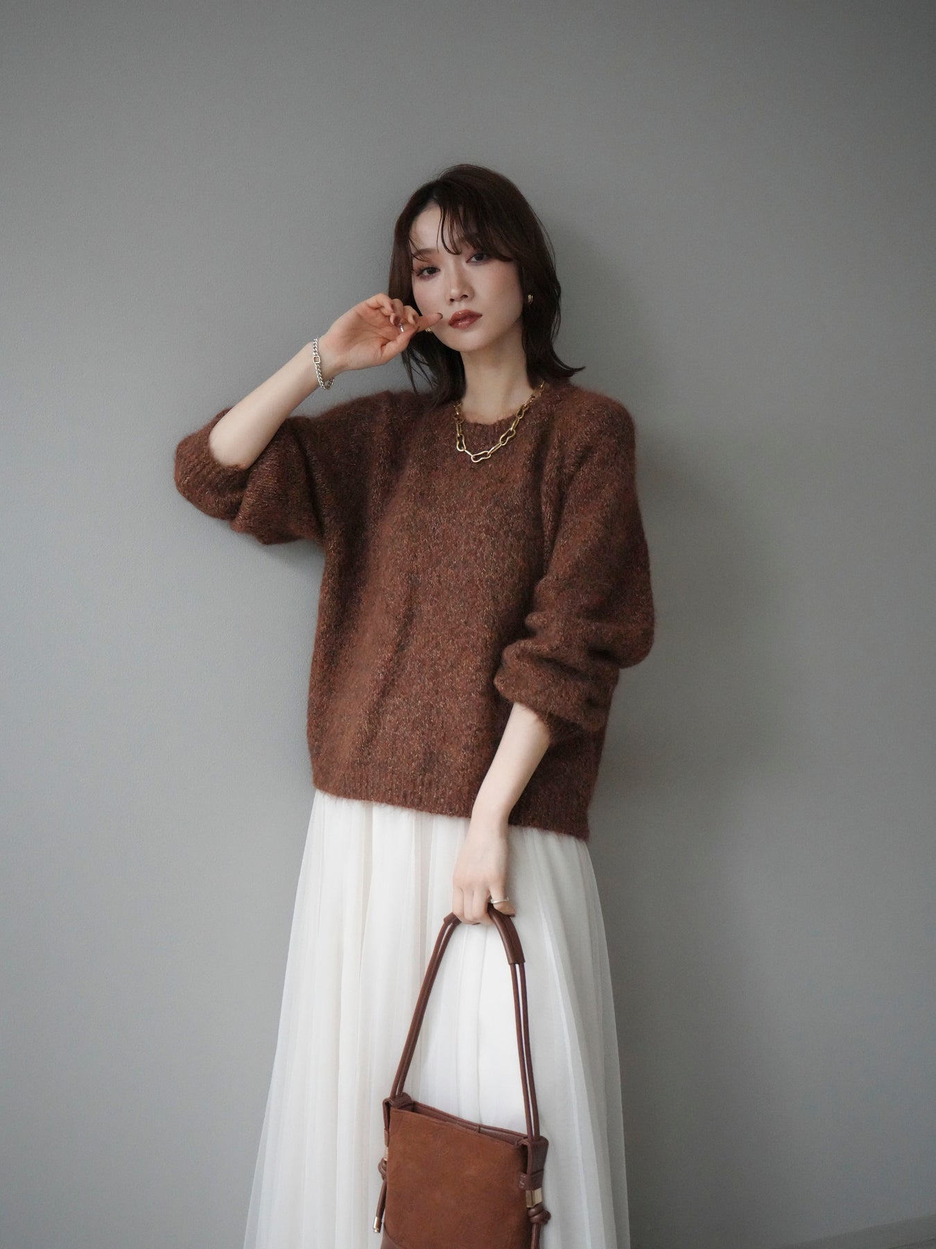 表情豊かなミックスヤーンで編み立てた、あたたかみのあるニットプルオーバー。 背中のロゴラベルがさりげないアクセントになり、シンプルながらもこなれ感のあるデザインです。 ふんわりとした柔らかな風合いで着心地が良く、シーズンムードを引き立てます。 ゆったりとしたシルエットが抜け感を演出し、デイリーコーデに程よいリラックス感をプラス。 パンツにもスカートにも合わせやすく、1枚で主役になる万能ニットです。 ※ボトムス、キャミソール(インナー)以外の商品は一律でインナーは付属していません。