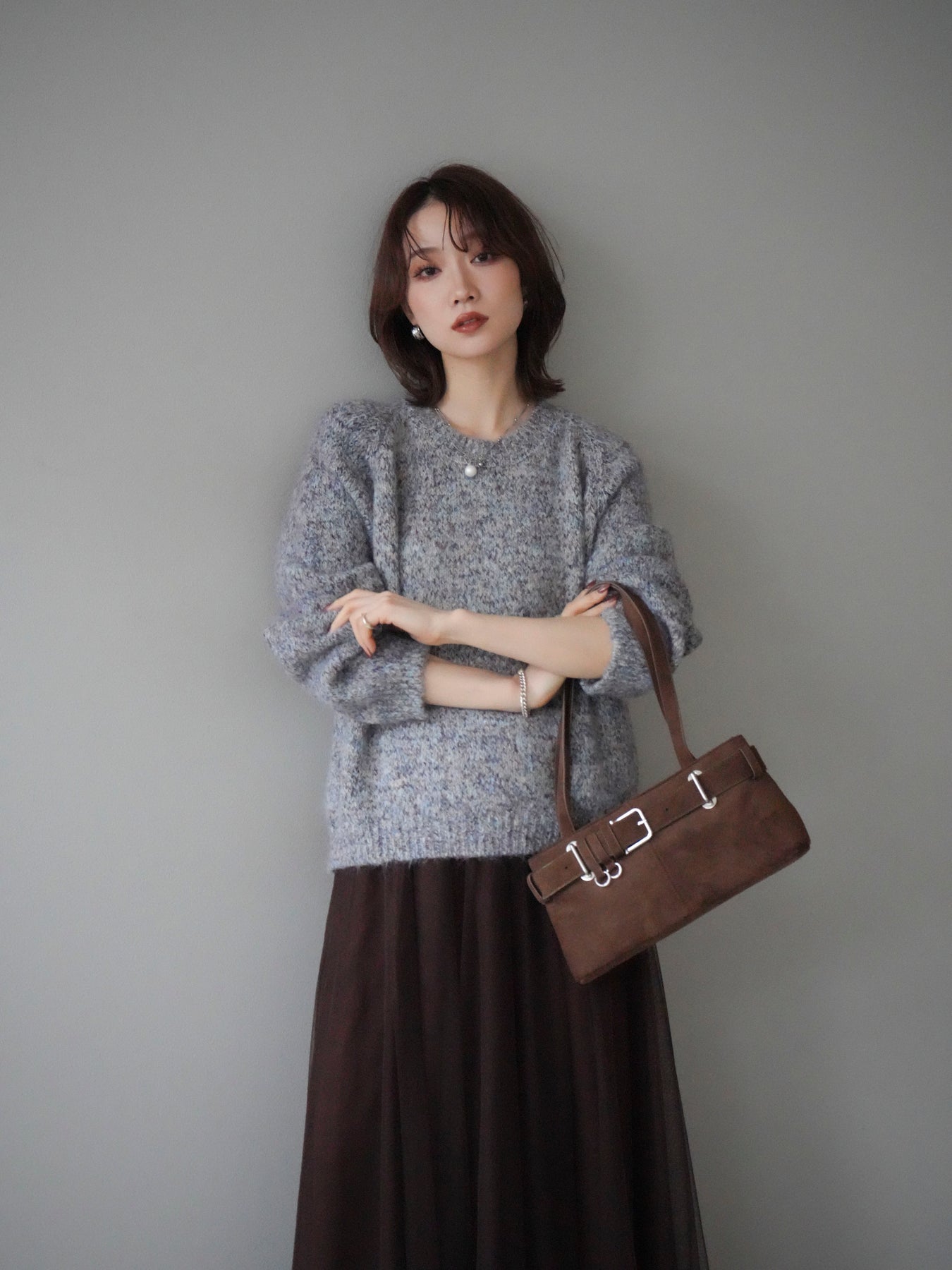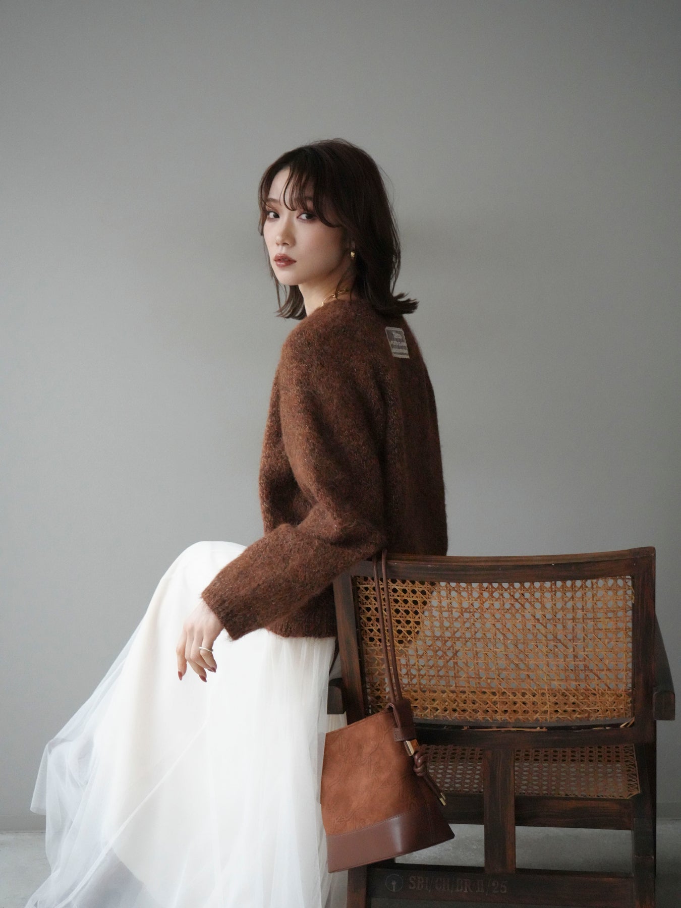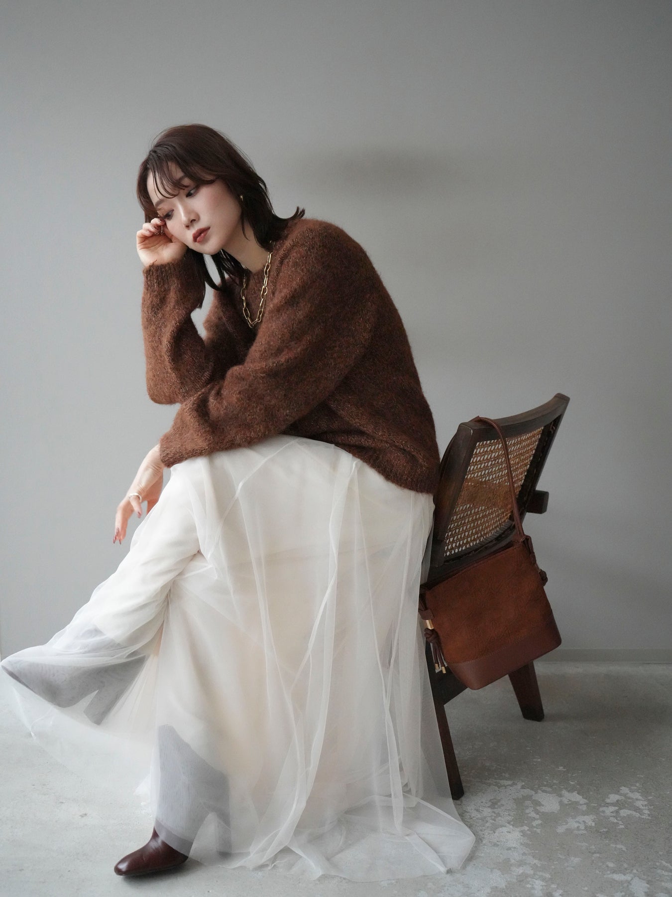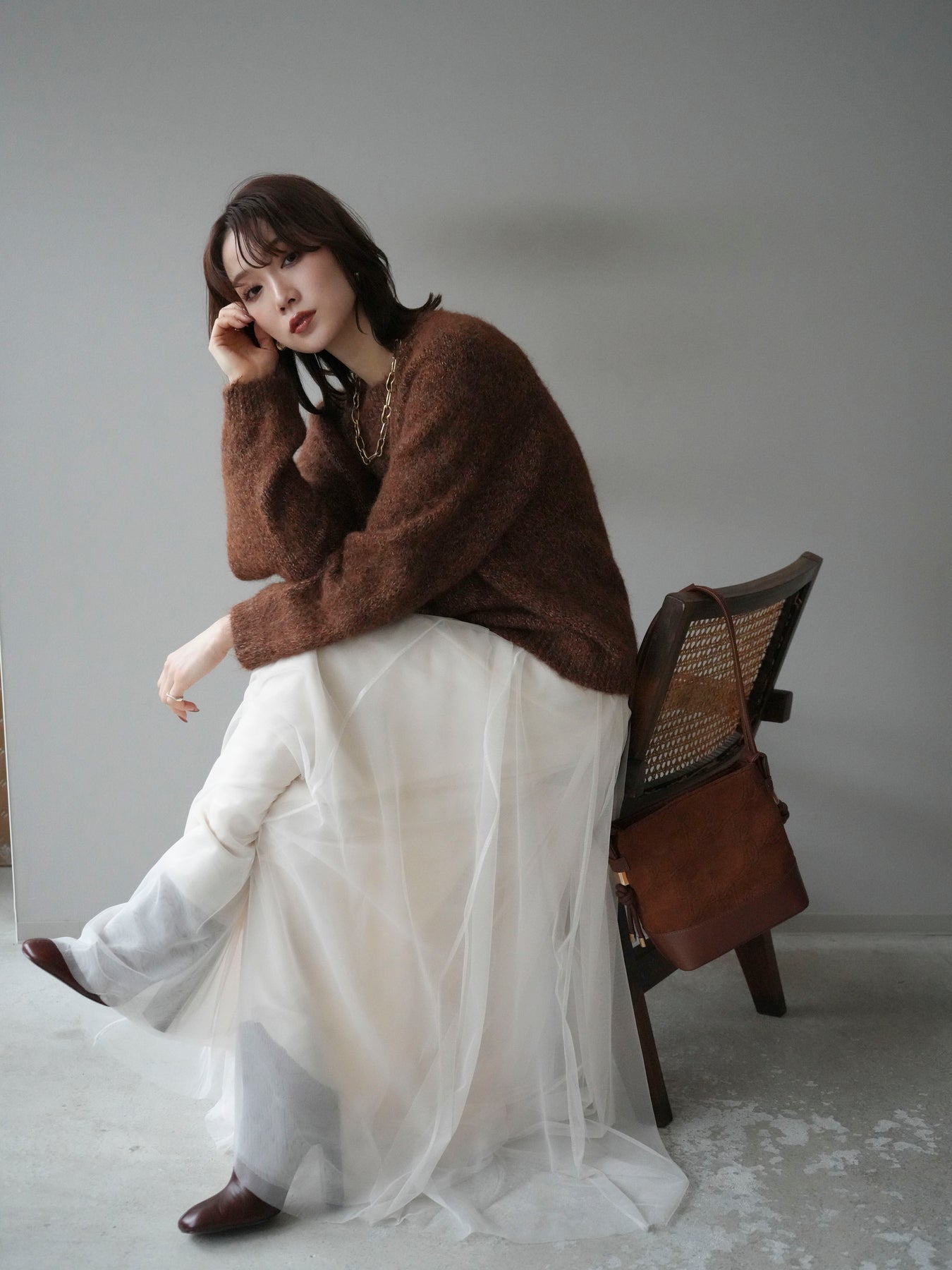 表情豊かなミックスヤーンで編み立てた、あたたかみのあるニットプルオーバー。 背中のロゴラベルがさりげないアクセントになり、シンプルながらもこなれ感のあるデザインです。 ふんわりとした柔らかな風合いで着心地が良く、シーズンムードを引き立てます。 ゆったりとしたシルエットが抜け感を演出し、デイリーコーデに程よいリラックス感をプラス。 パンツにもスカートにも合わせやすく、1枚で主役になる万能ニットです。 ※ボトムス、キャミソール(インナー)以外の商品は一律でインナーは付属していません。