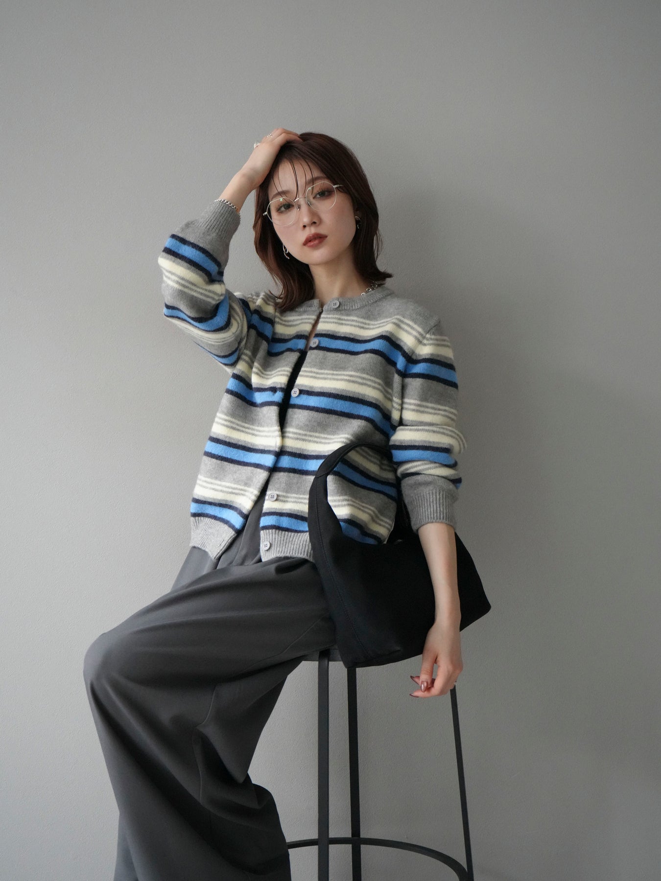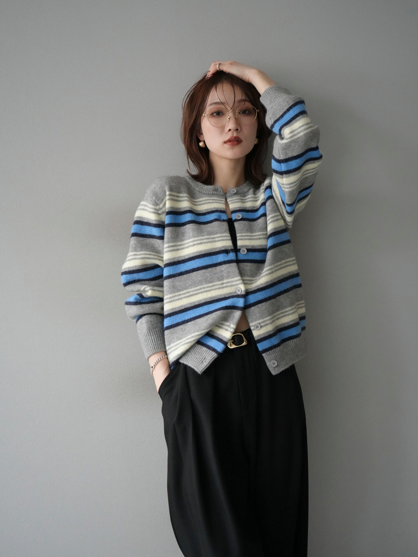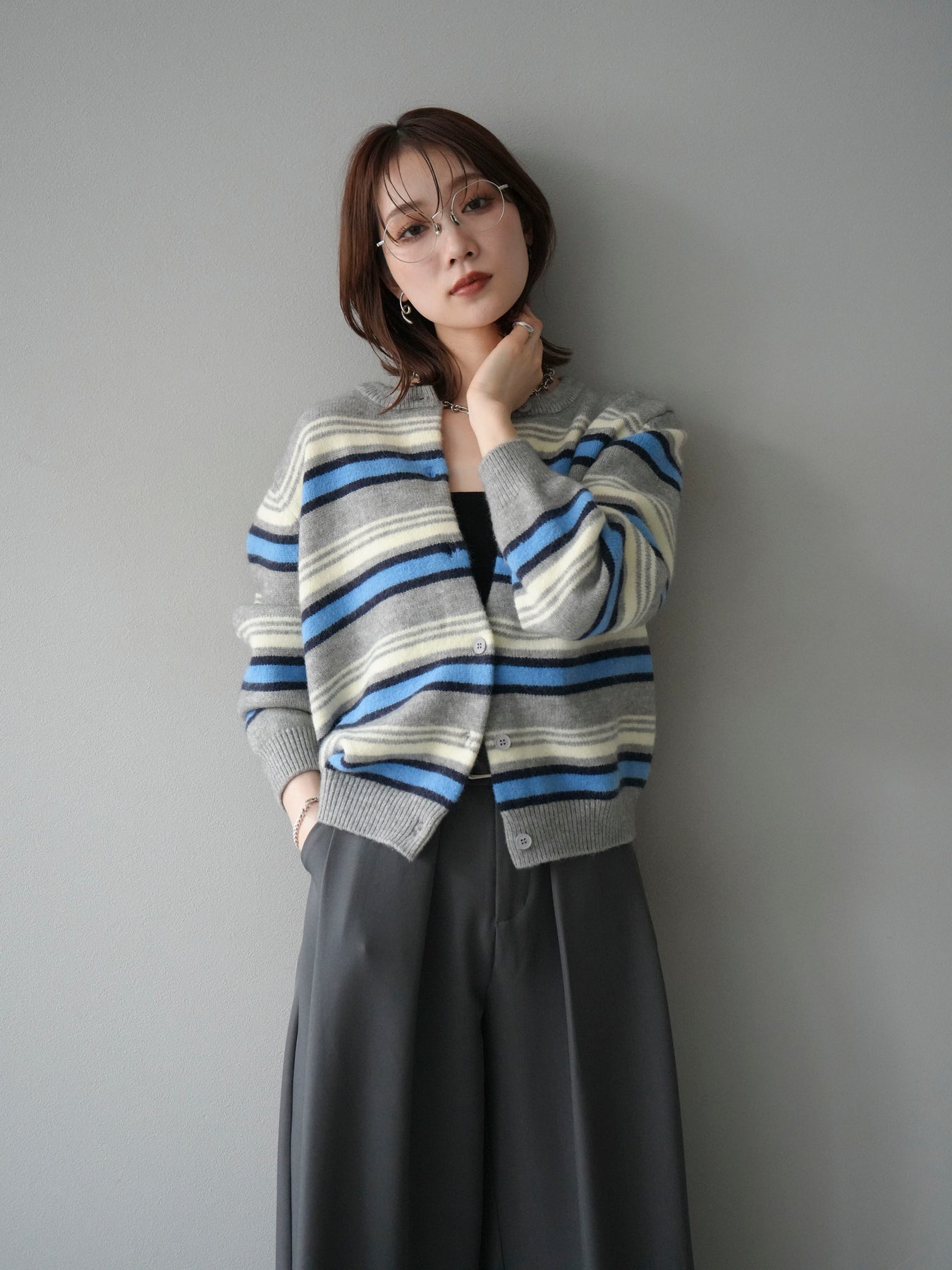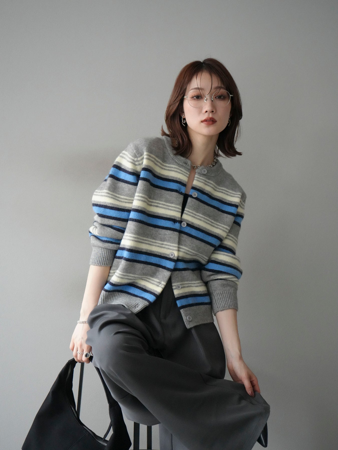 鮮やかな配色ボーダーが目を惹くニットカーディガン。 柔らかくふんわりとした肌触りで、シーズンムードを高めてくれる1枚です。 コンパクトなシルエットとラウンドネックが女性らしい印象を演出し、カジュアルながらも上品に着こなせます。 1枚で主役になる存在感があり、羽織りとしてはもちろん、ボタンを留めてプルオーバー風に着るのもおすすめ。 デニムやスカートなど、幅広いアイテムと相性抜群の万能ニットです。 ※ボトムス、キャミソール(インナー)以外の商品は一律でインナーは付属していません。