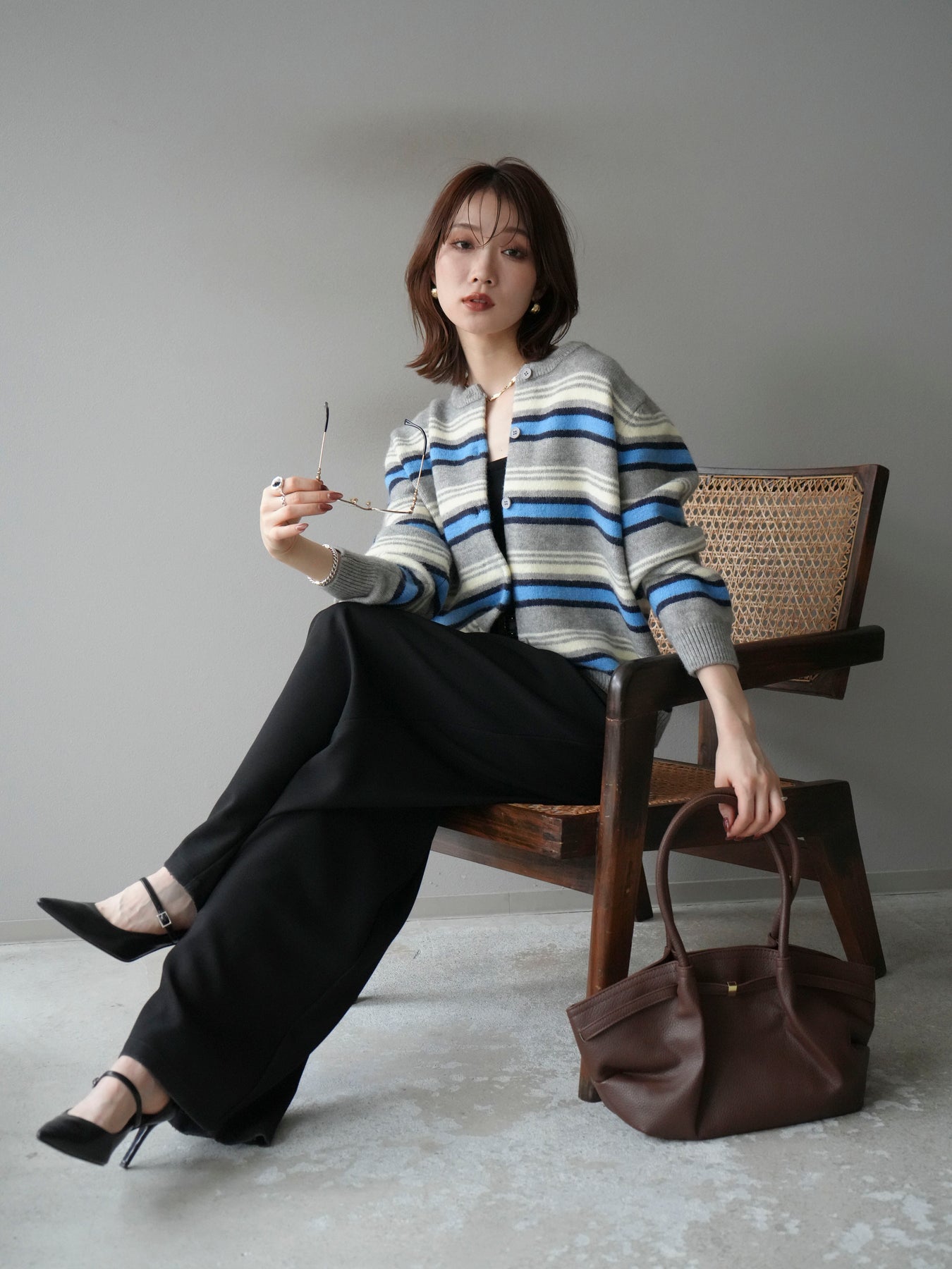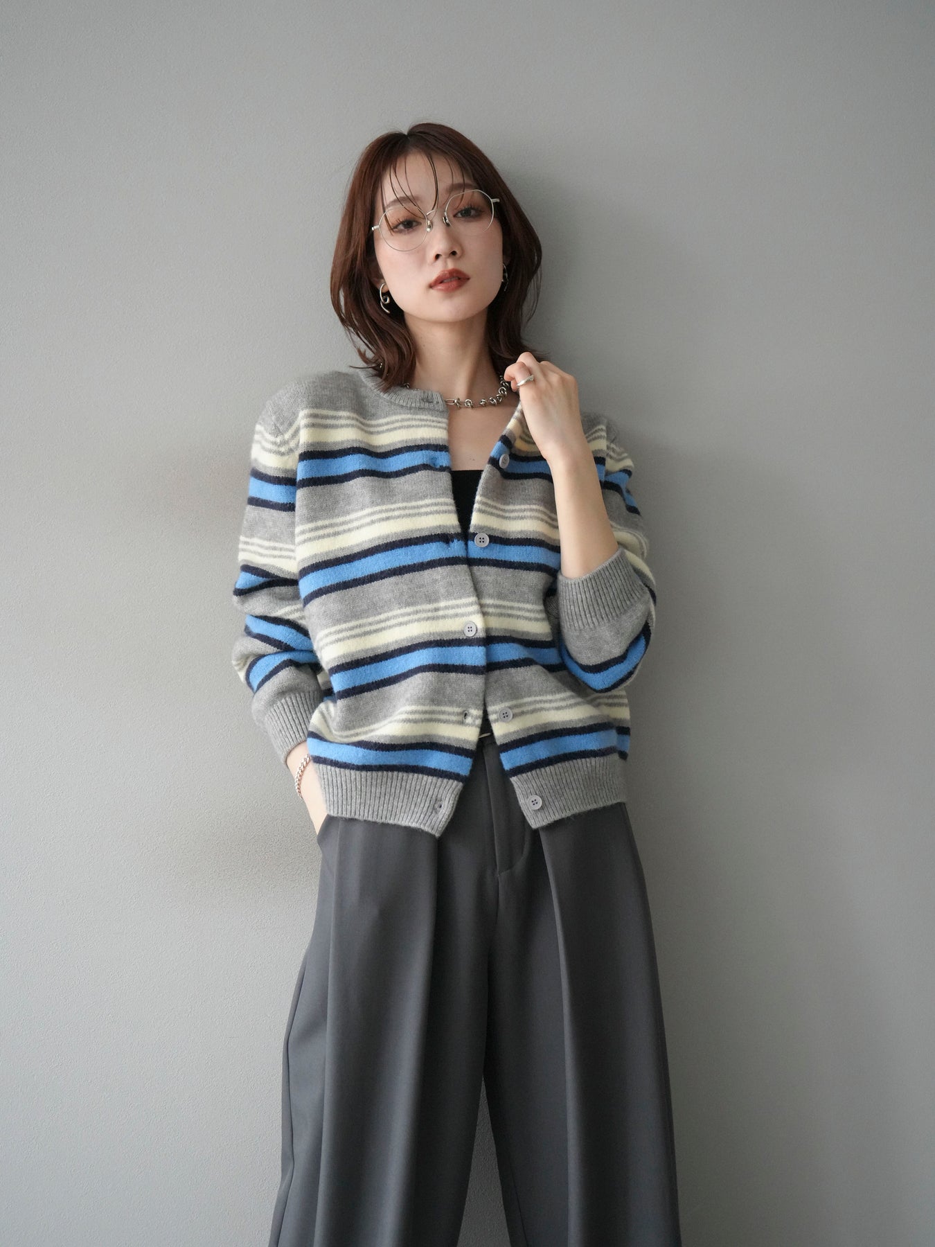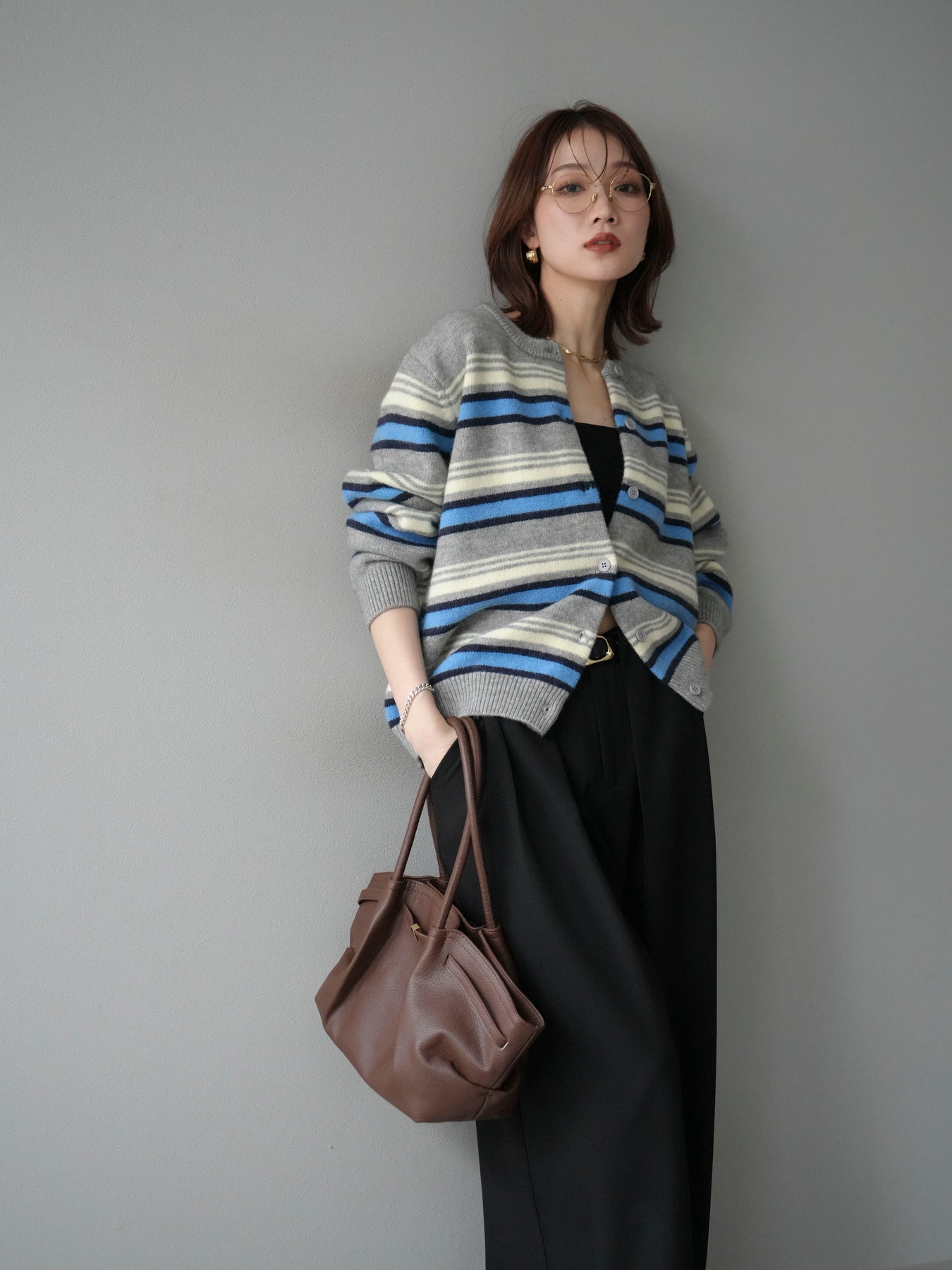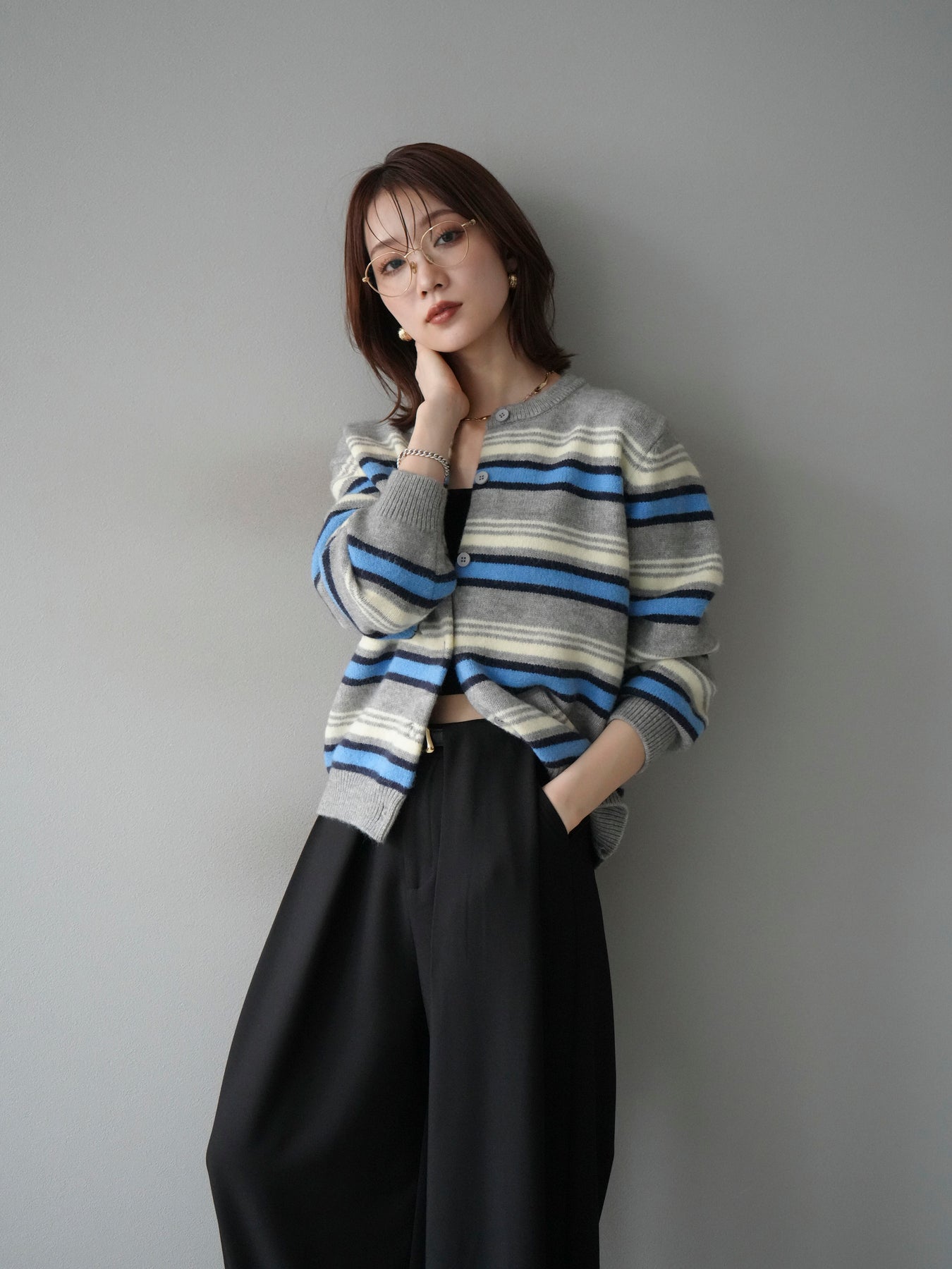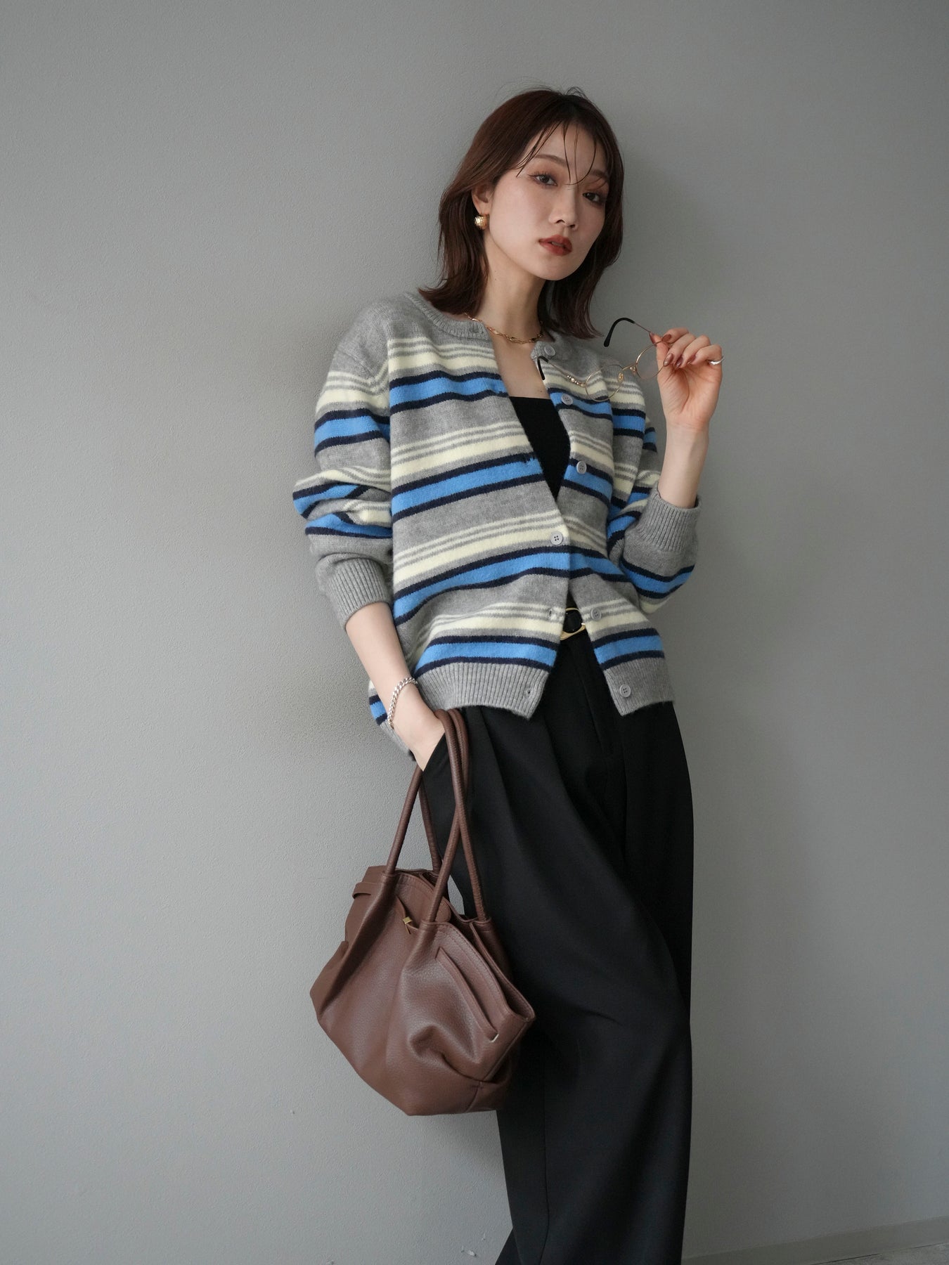 鮮やかな配色ボーダーが目を惹くニットカーディガン。 柔らかくふんわりとした肌触りで、シーズンムードを高めてくれる1枚です。 コンパクトなシルエットとラウンドネックが女性らしい印象を演出し、カジュアルながらも上品に着こなせます。 1枚で主役になる存在感があり、羽織りとしてはもちろん、ボタンを留めてプルオーバー風に着るのもおすすめ。 デニムやスカートなど、幅広いアイテムと相性抜群の万能ニットです。 ※ボトムス、キャミソール(インナー)以外の商品は一律でインナーは付属していません。
