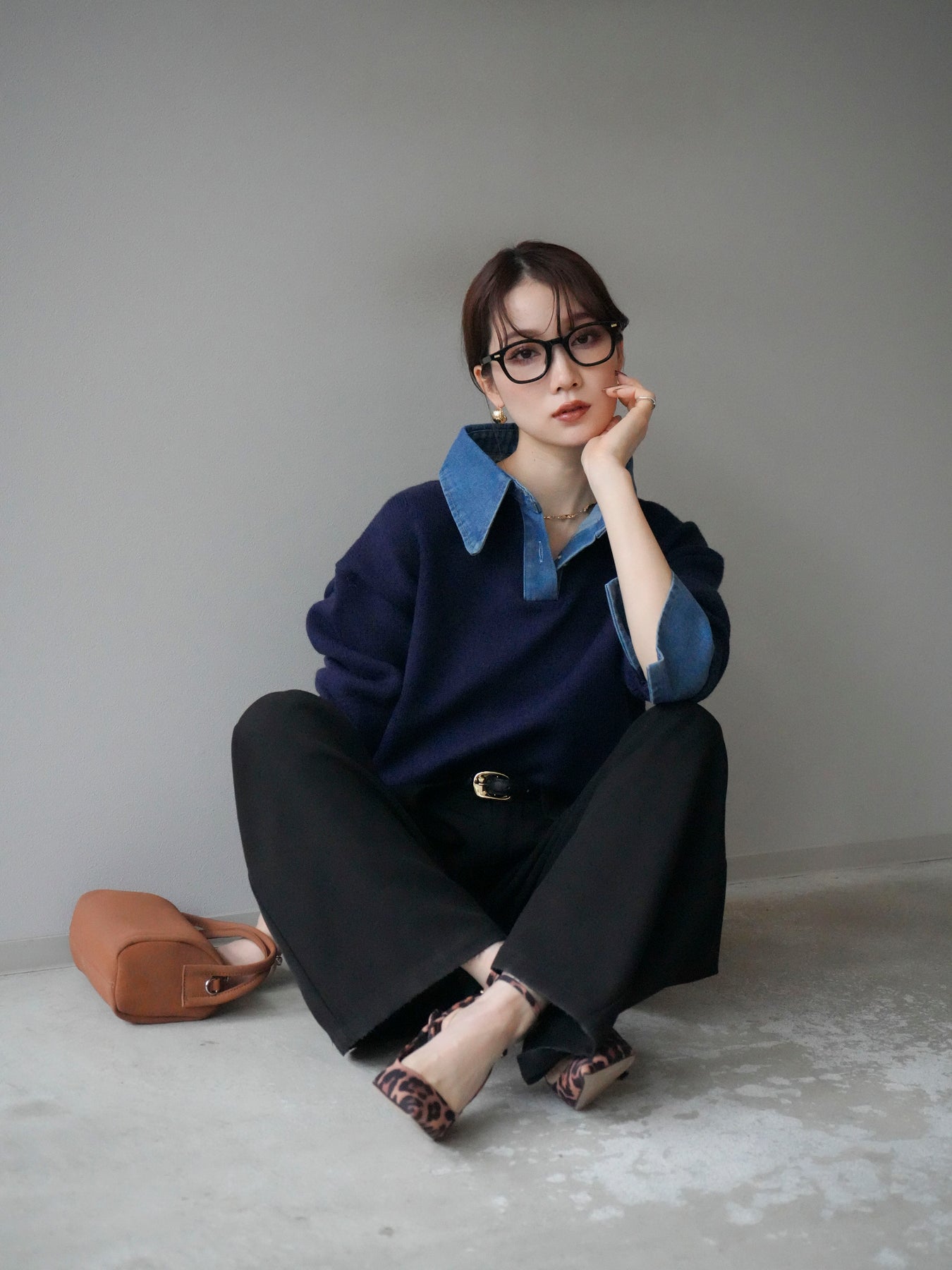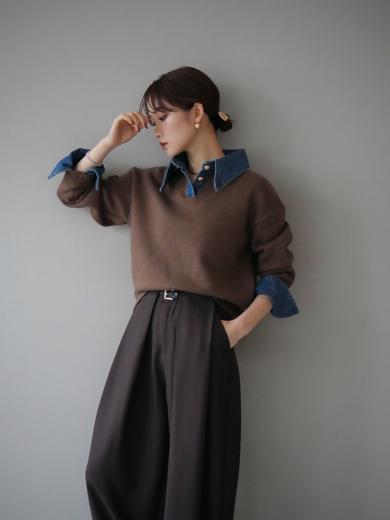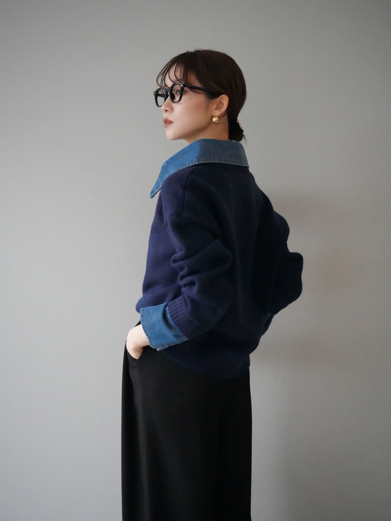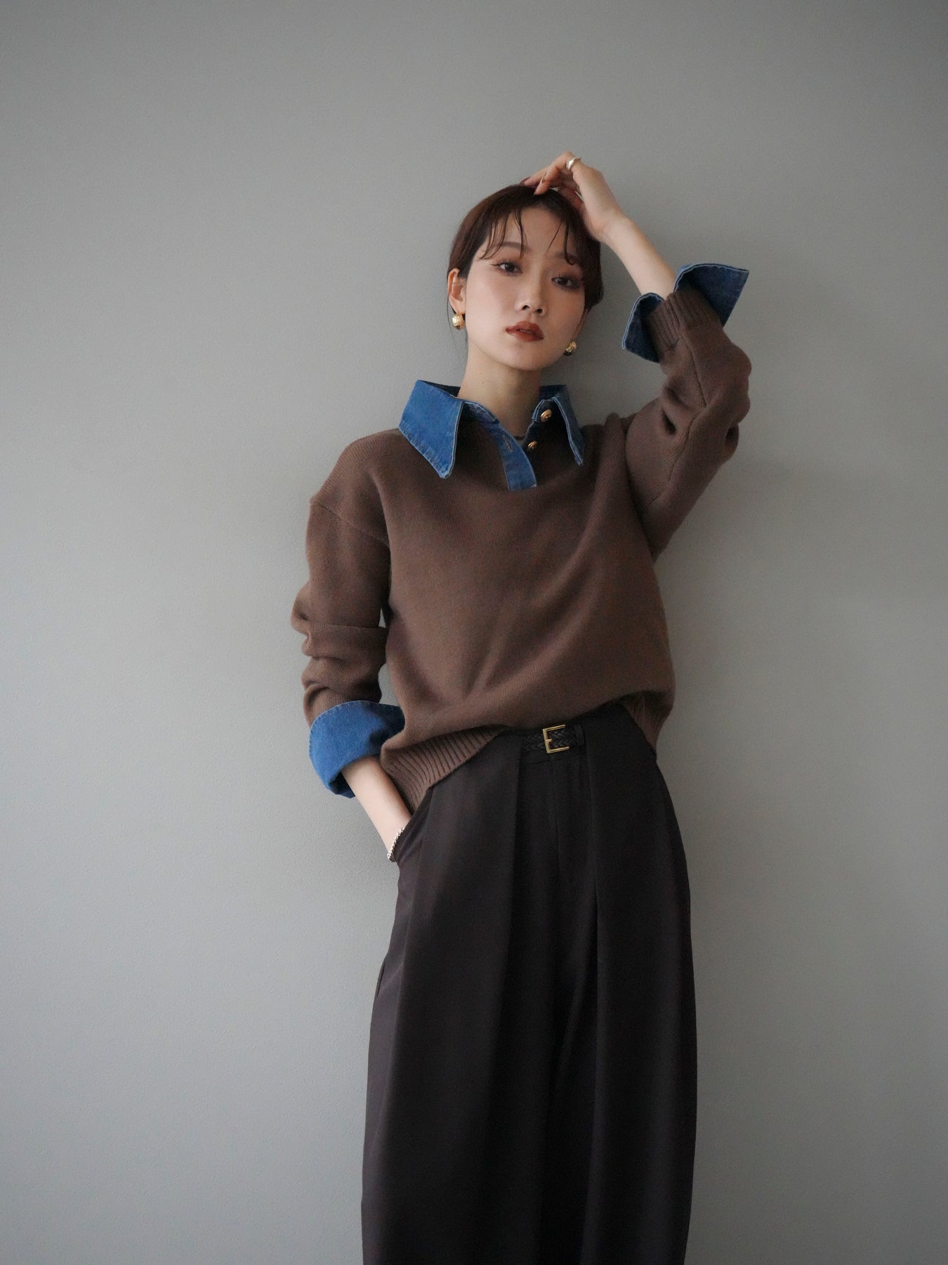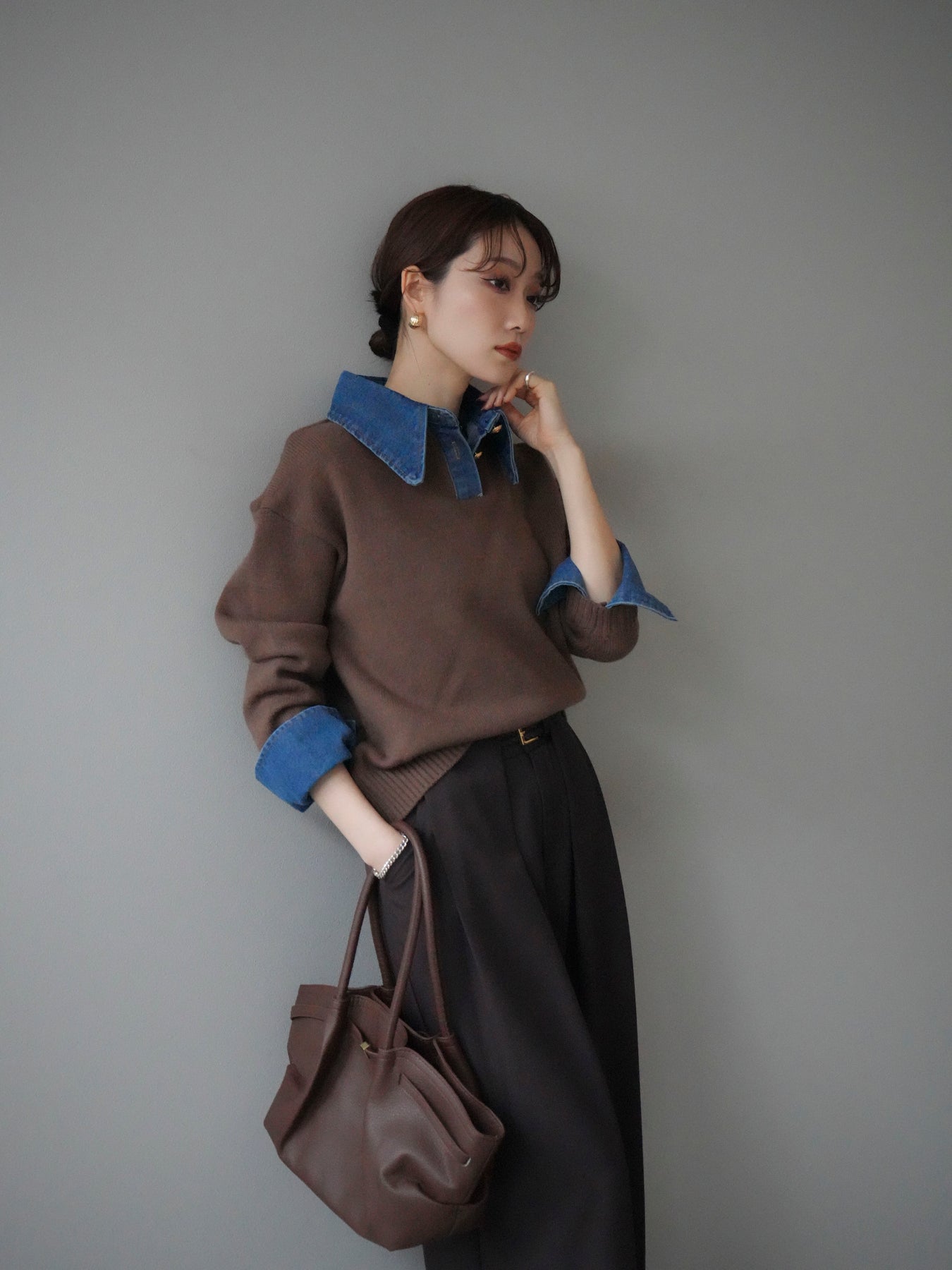 デニム素材の襟と袖口がアクセントになったポロニットプルオーバー。 異素材の組み合わせがこなれた印象を与え、1枚でスタイリングが決まるデザインです。 程よくゆとりのあるシルエットでリラックス感がありながらも、デニムディテールが全体を引き締めます。 柔らかなニット素材で着心地が良く、カジュアルからきれいめまで幅広く着回せる万能アイテム。 ボタンを開けて抜け感を出したり、閉じて上品にまとめたりと、アレンジも楽しめます。 ※ボトムス、キャミソール(インナー)以外の商品は一律でインナーは付属していません。