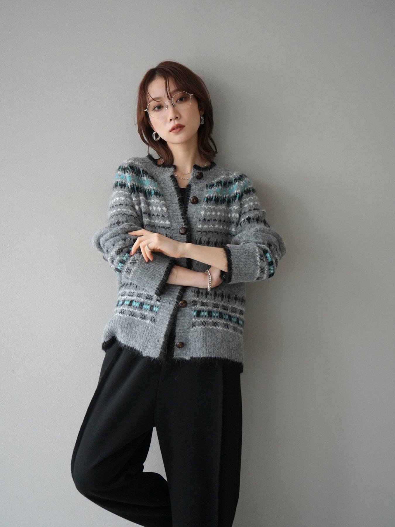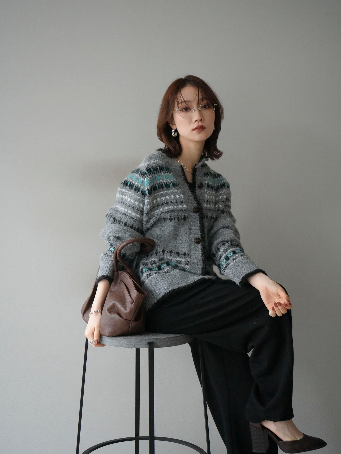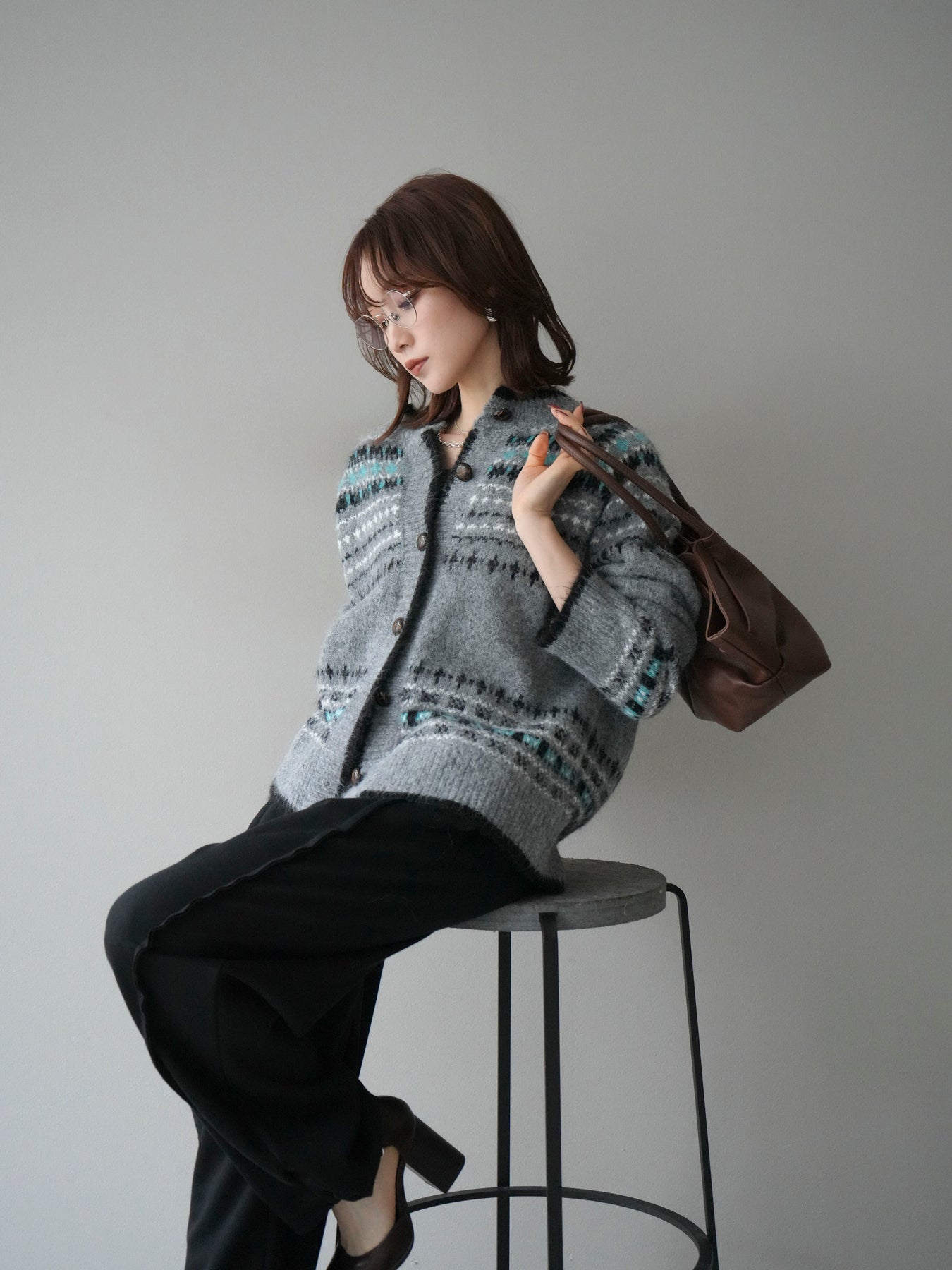 シーズンライクな求心柄デザインが目を惹くウッドボタンニットカーディガン。 ふんわりと柔らかな風合いのニット素材で、暖かみのある優しい着心地が魅力です。 ナチュラルなウッドボタンがアクセントとなり、クラシカルな中にも程よい抜け感をプラス。 ゆったりとしたシルエットでリラックス感があり、羽織るだけでこなれた印象に仕上がります。 デニムやスカートなど、幅広いアイテムと好相性で、デイリー使いにぴったりな一枚です。 ※ボトムス、キャミソール(インナー)以外の商品は一律でインナーは付属していません。