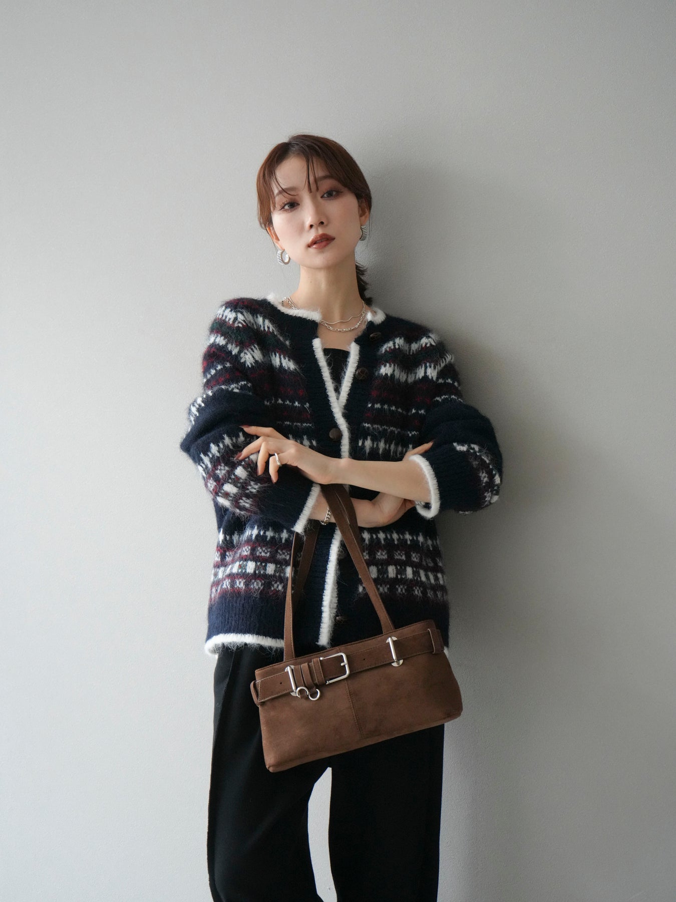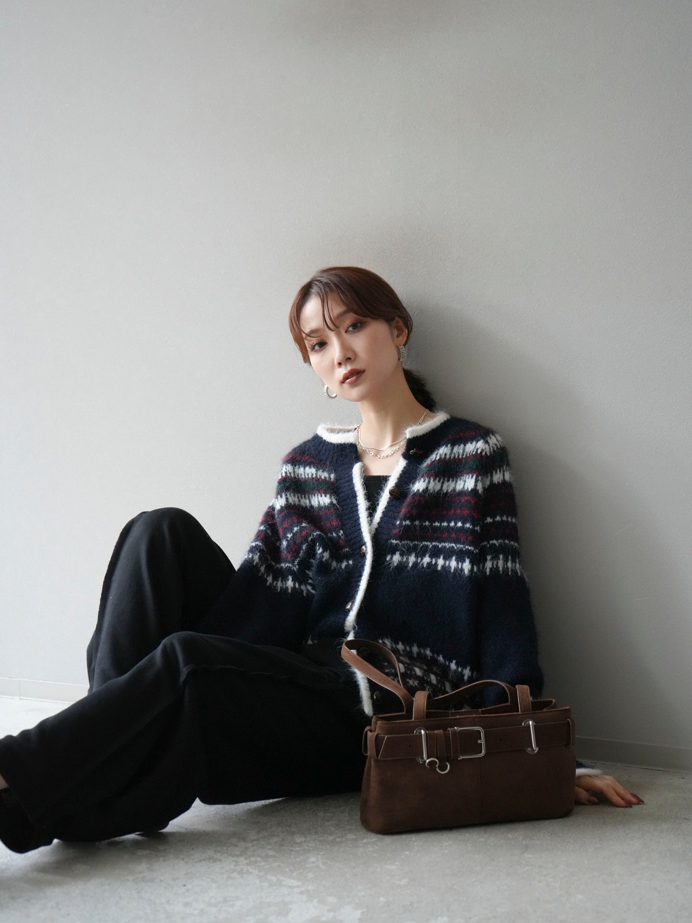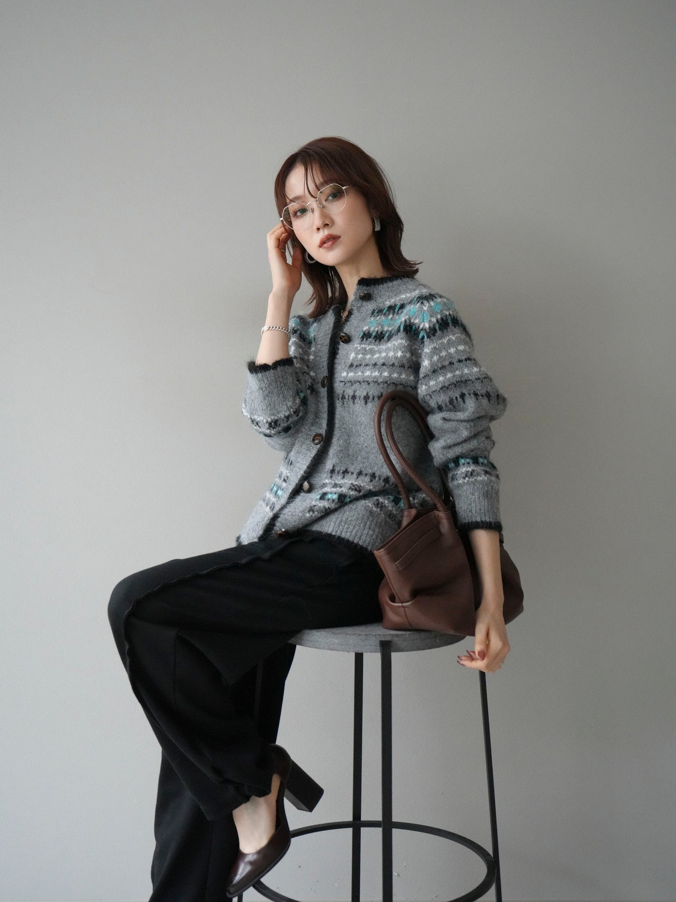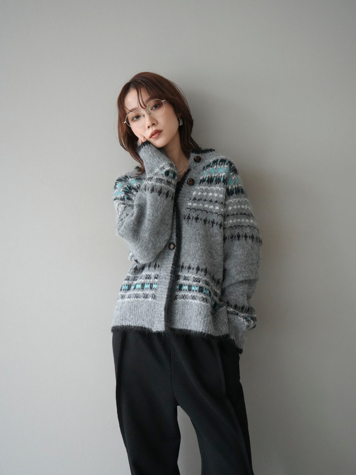 シーズンライクな求心柄デザインが目を惹くウッドボタンニットカーディガン。 ふんわりと柔らかな風合いのニット素材で、暖かみのある優しい着心地が魅力です。 ナチュラルなウッドボタンがアクセントとなり、クラシカルな中にも程よい抜け感をプラス。 ゆったりとしたシルエットでリラックス感があり、羽織るだけでこなれた印象に仕上がります。 デニムやスカートなど、幅広いアイテムと好相性で、デイリー使いにぴったりな一枚です。 ※ボトムス、キャミソール(インナー)以外の商品は一律でインナーは付属していません。