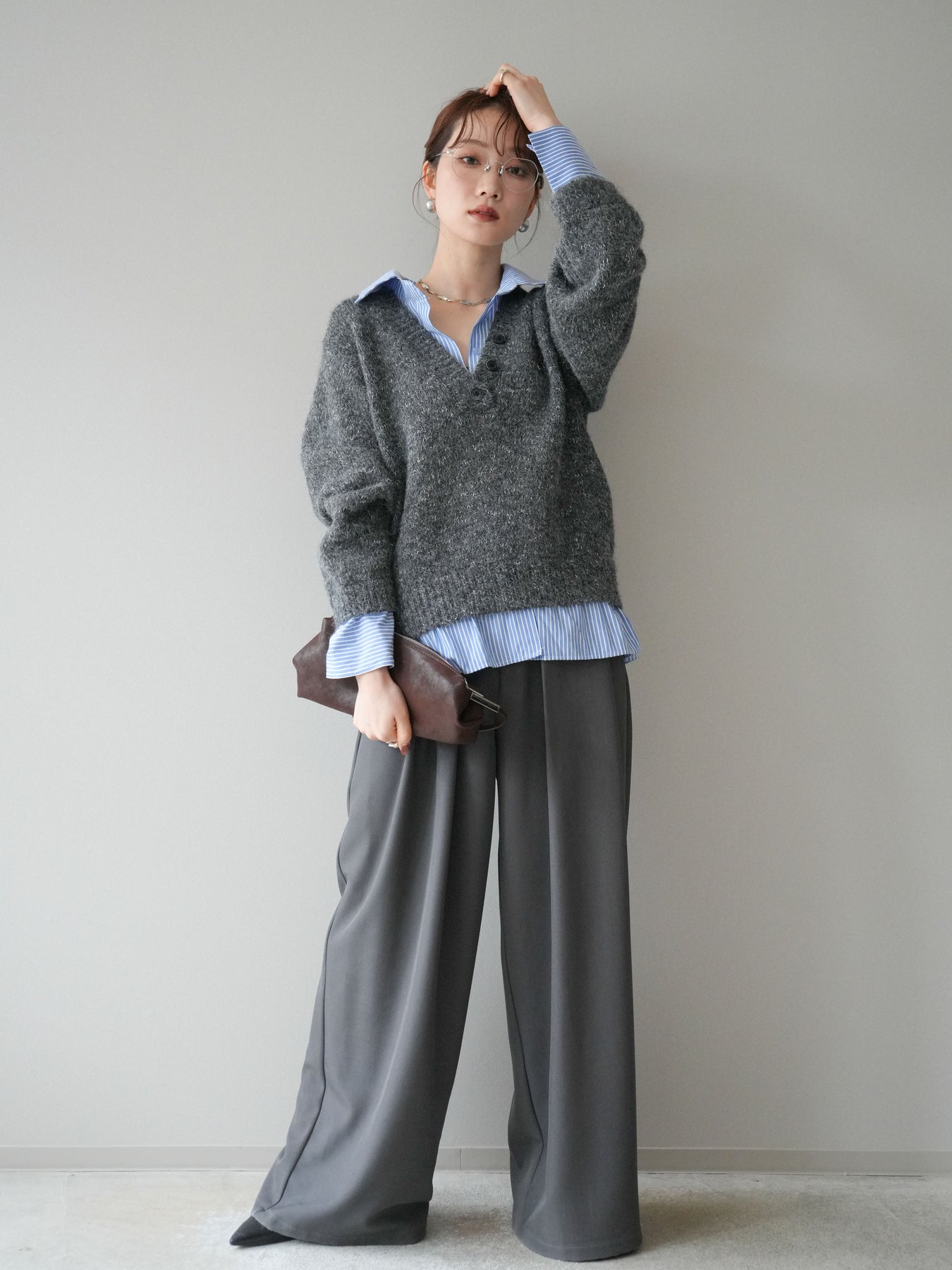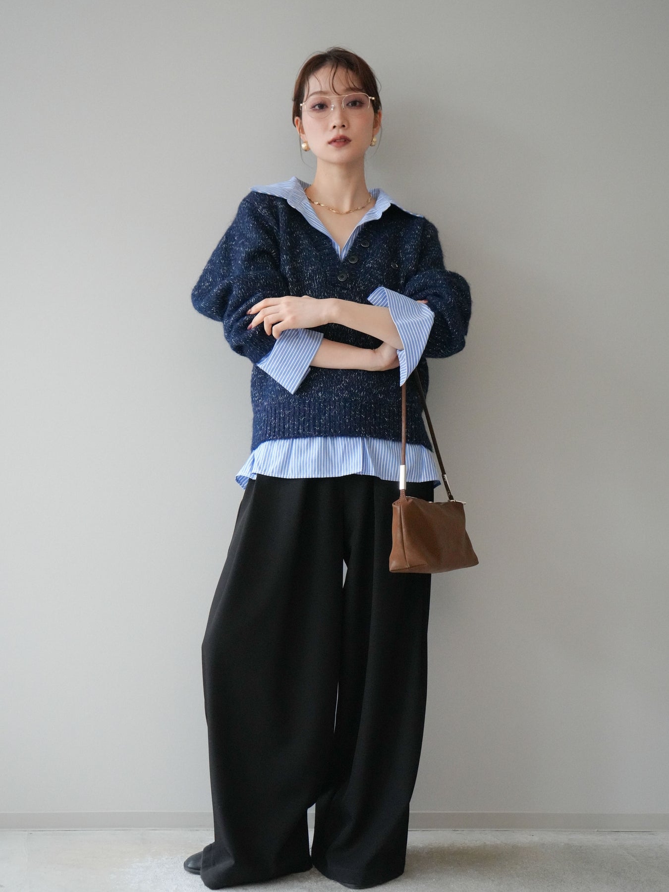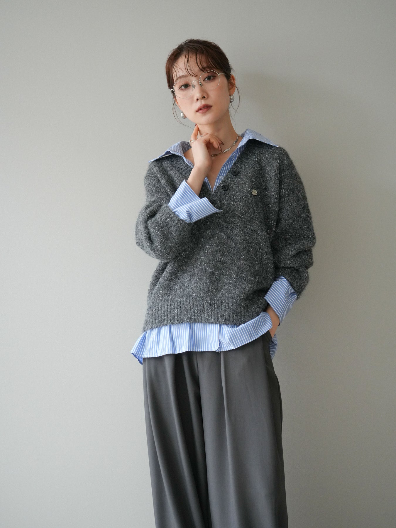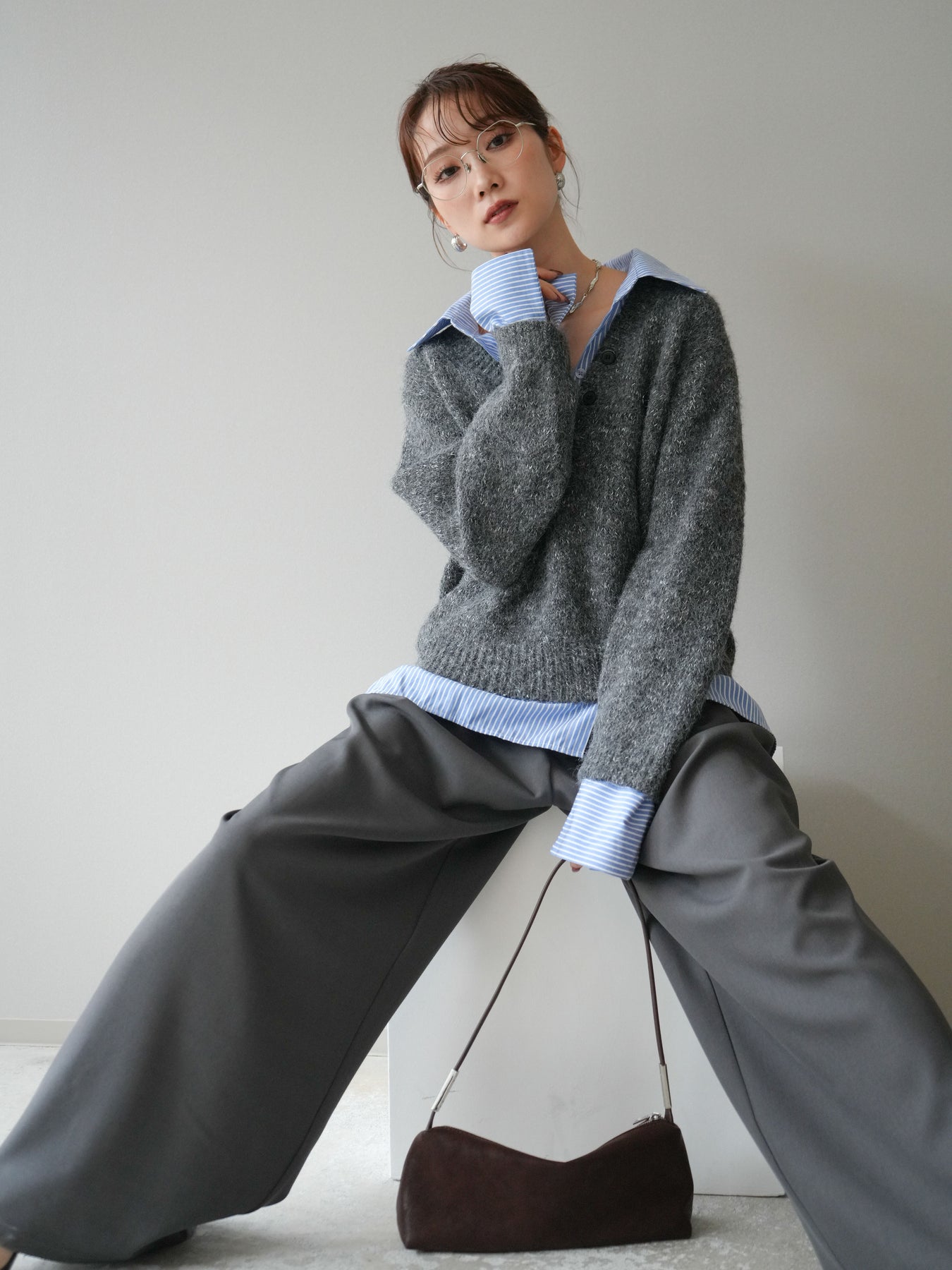 [SET]ストライプシャツドッキングMIXヤーンニットプルオーバー+ベルトループデザインワイドパンツ(2set)