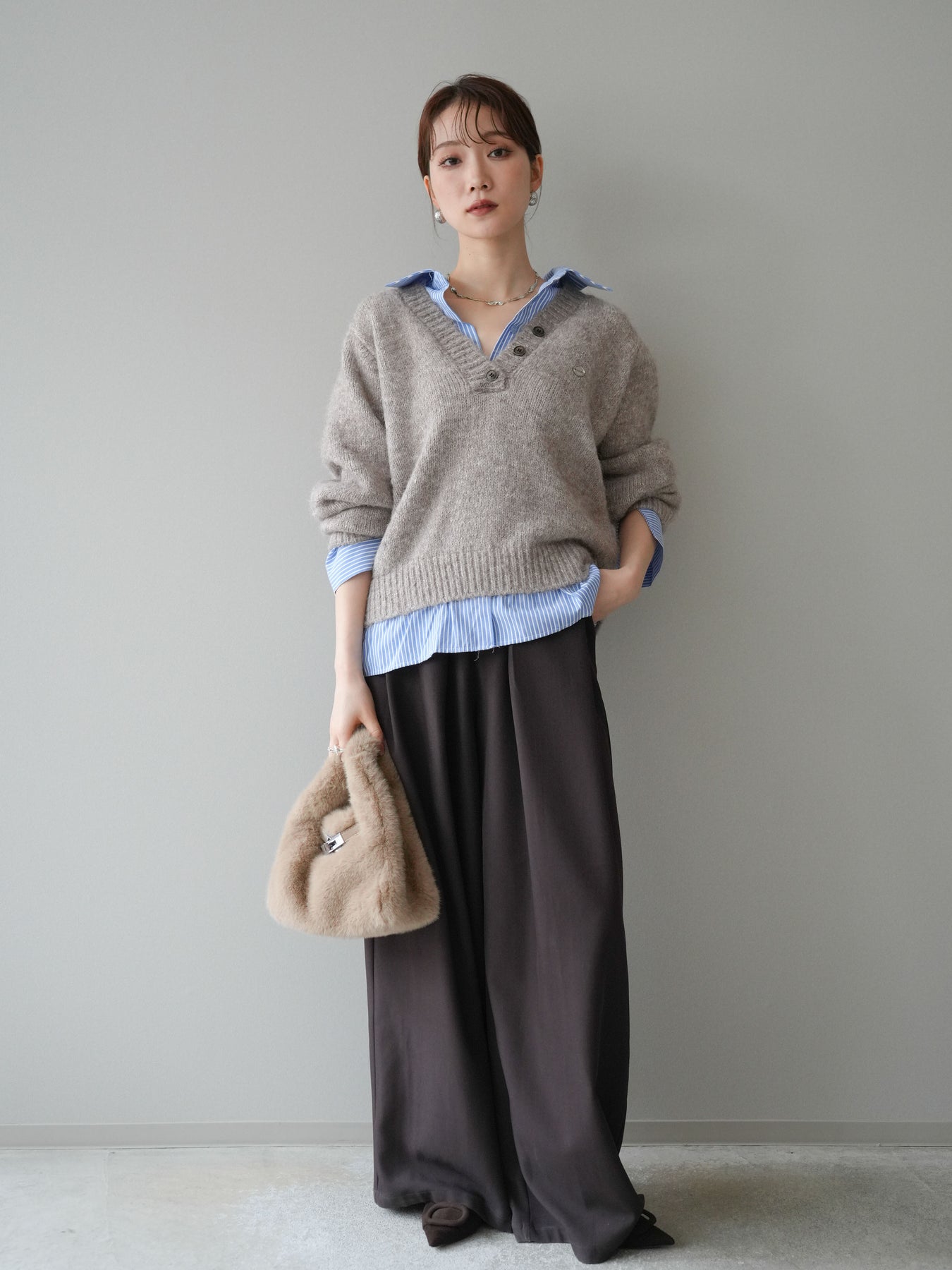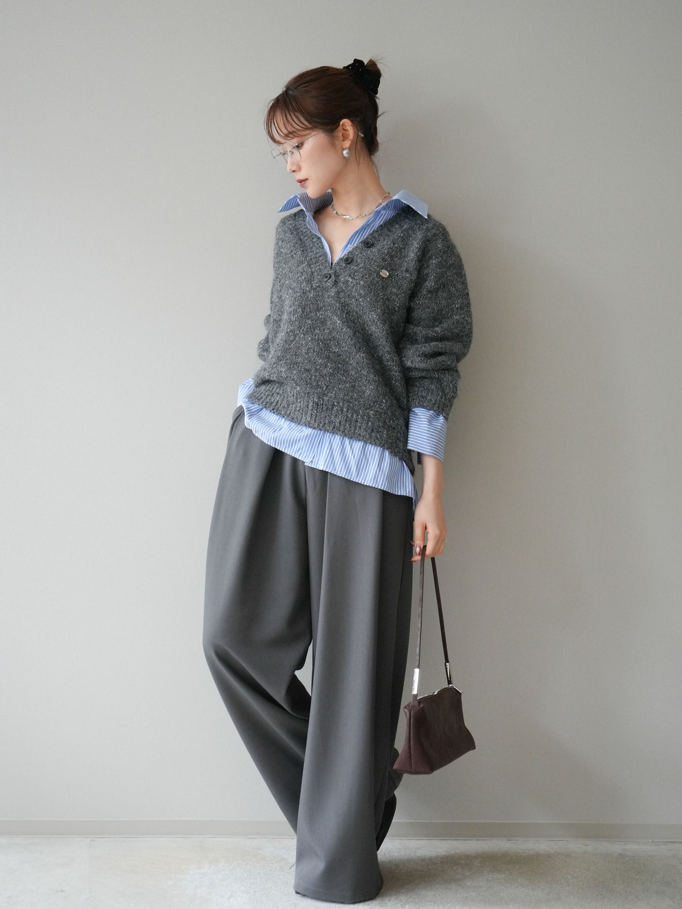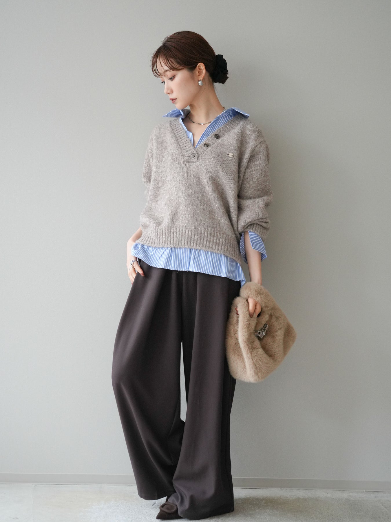 [SET]ストライプシャツドッキングMIXヤーンニットプルオーバー+ベルトループデザインワイドパンツ(2set)