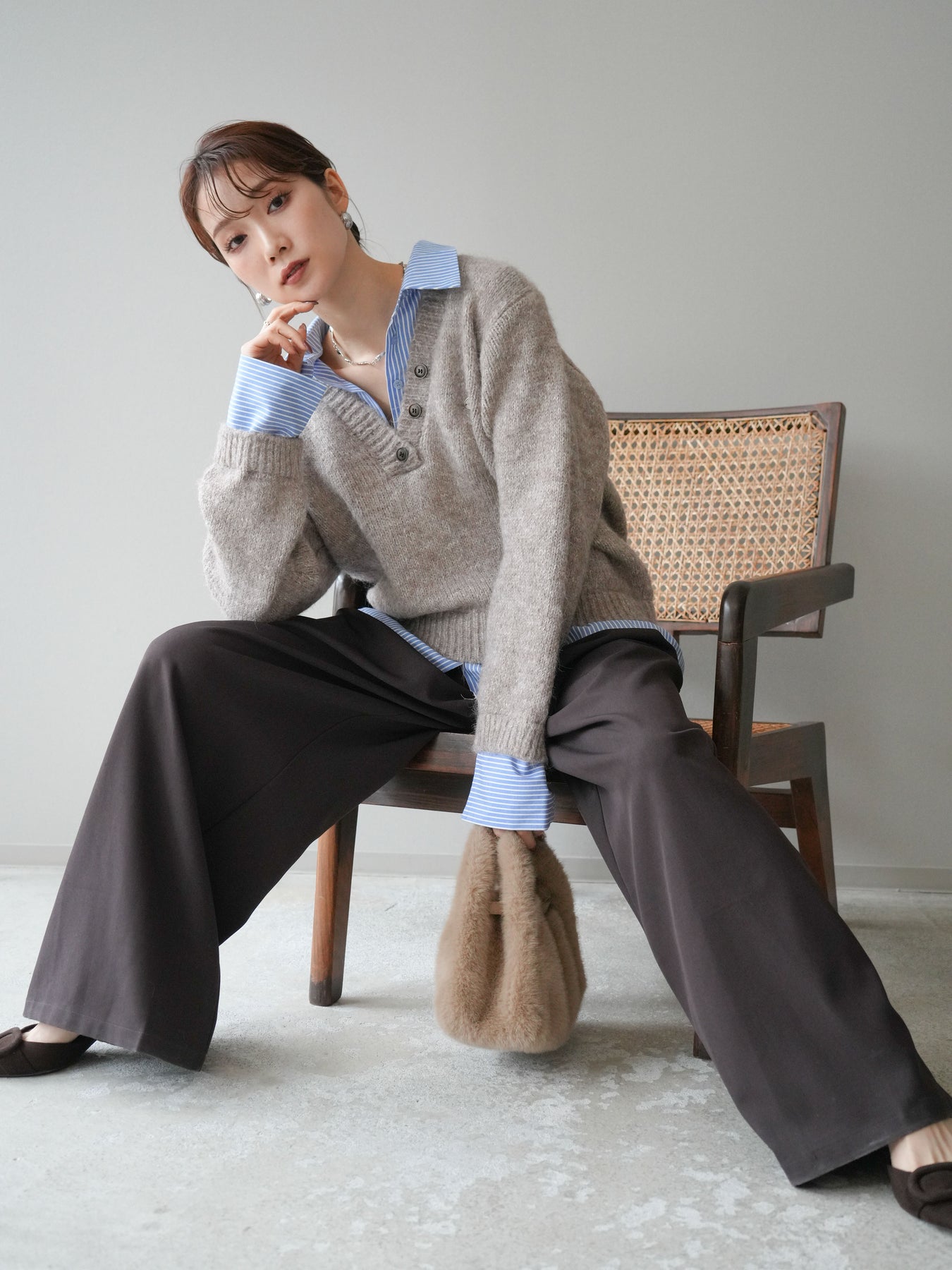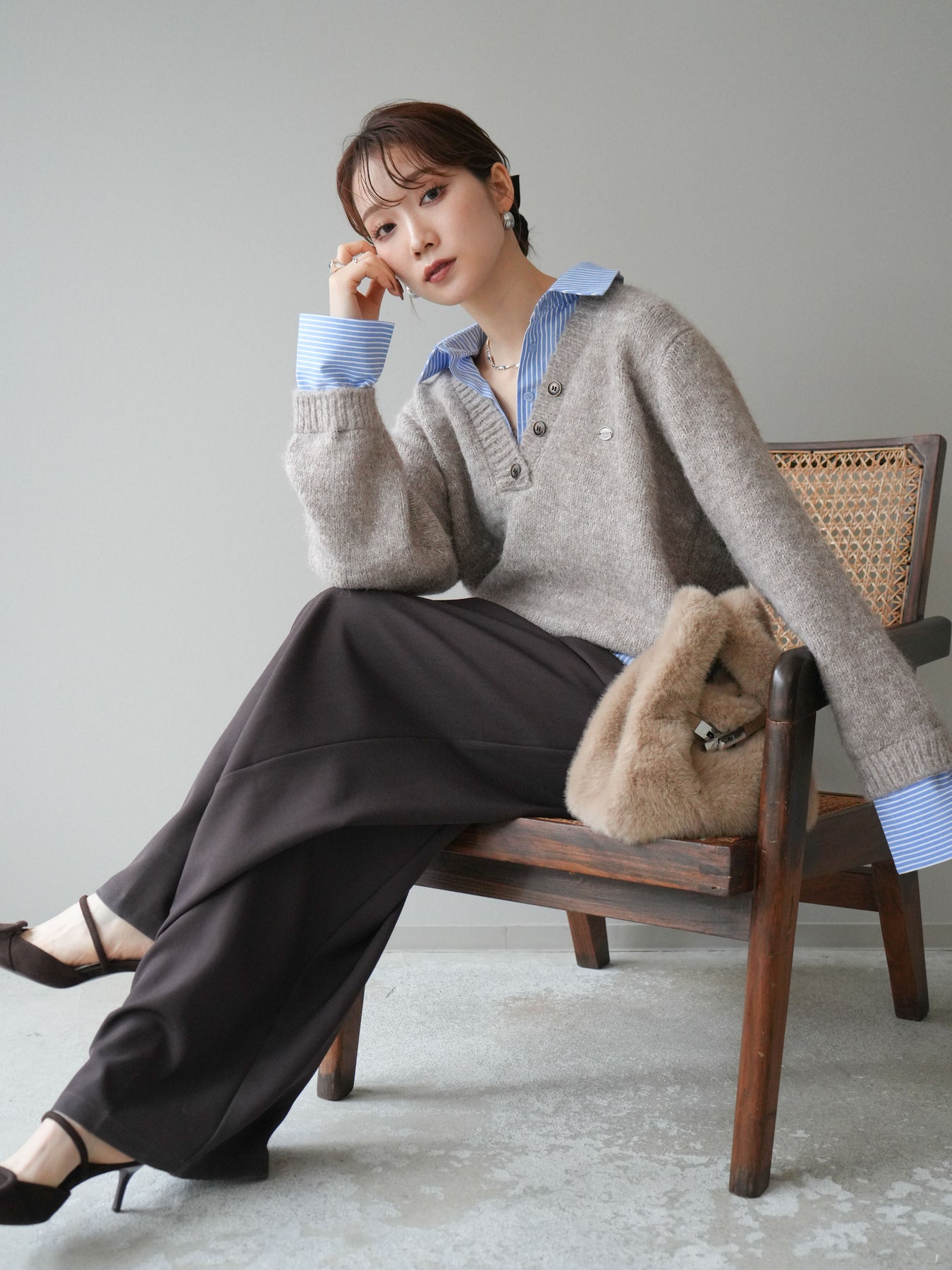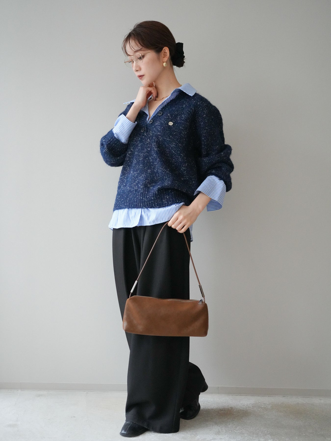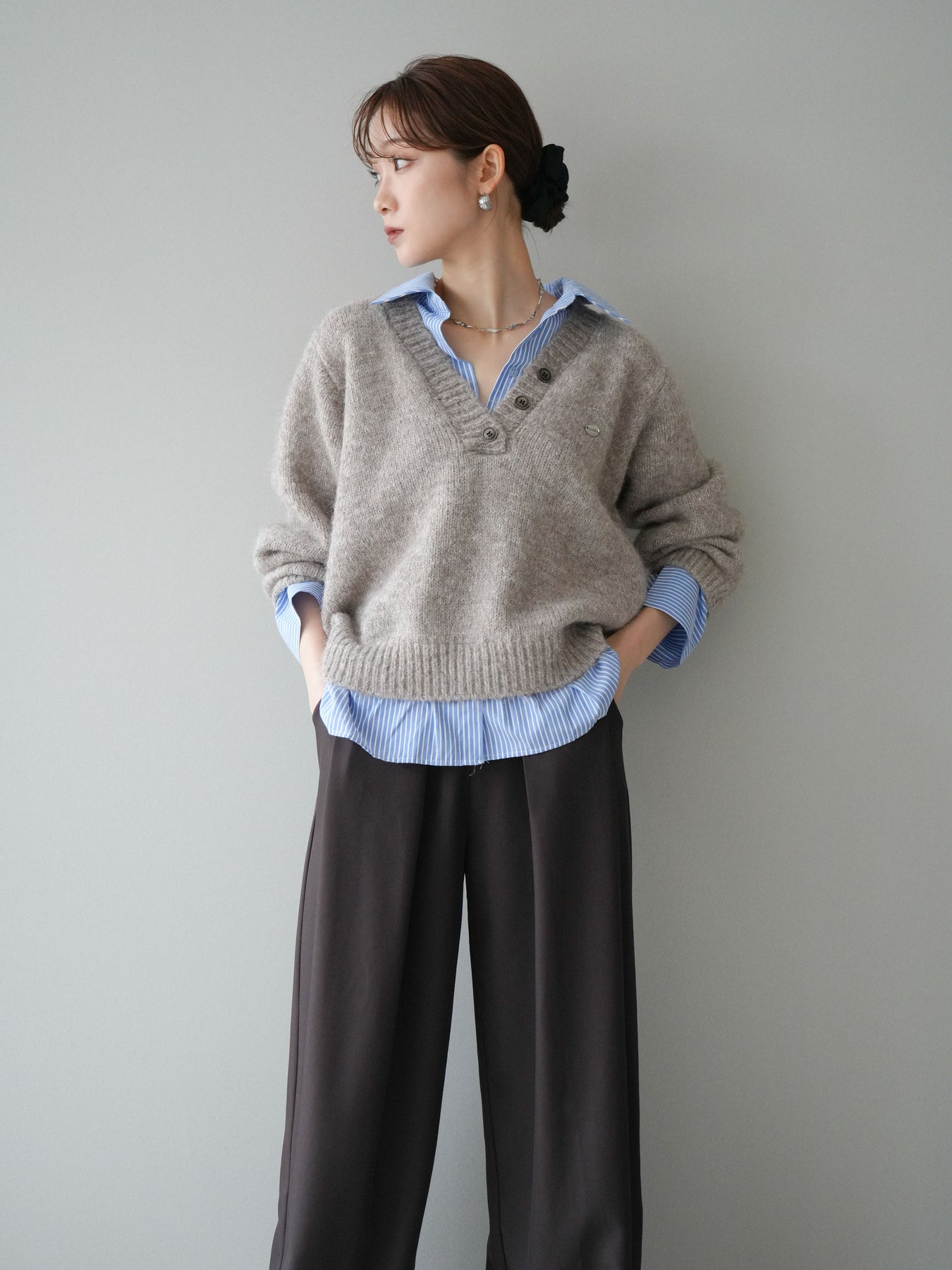[SET]ストライプシャツドッキングMIXヤーンニットプルオーバー+ベルトループデザインワイドパンツ(2set)