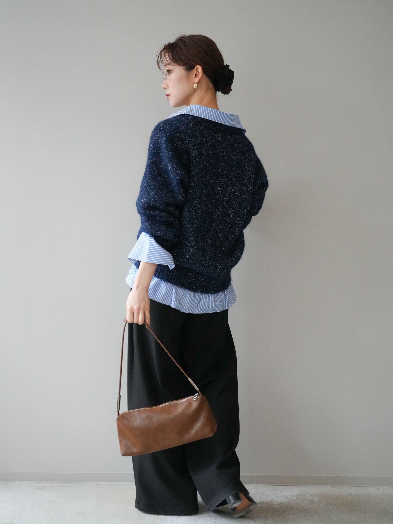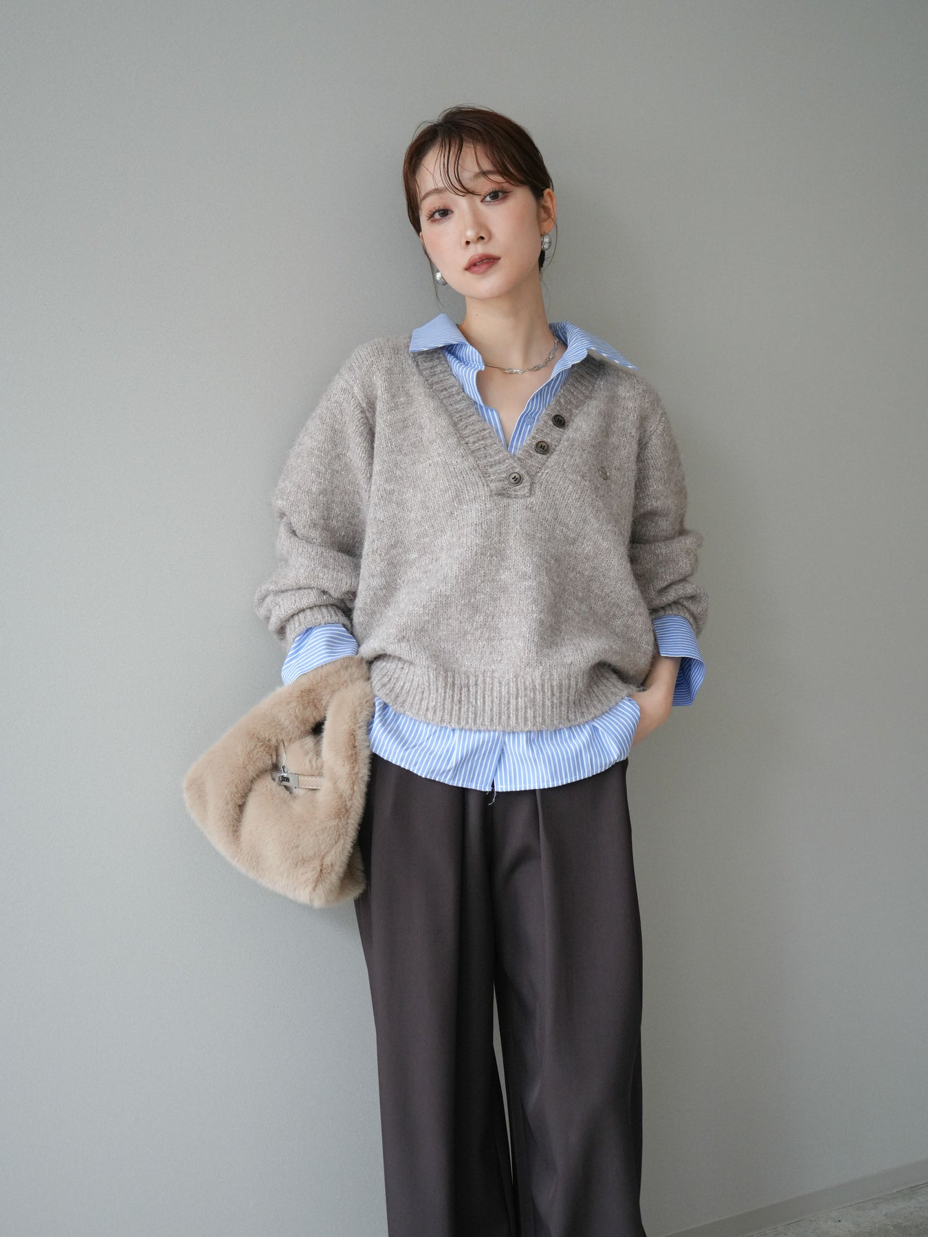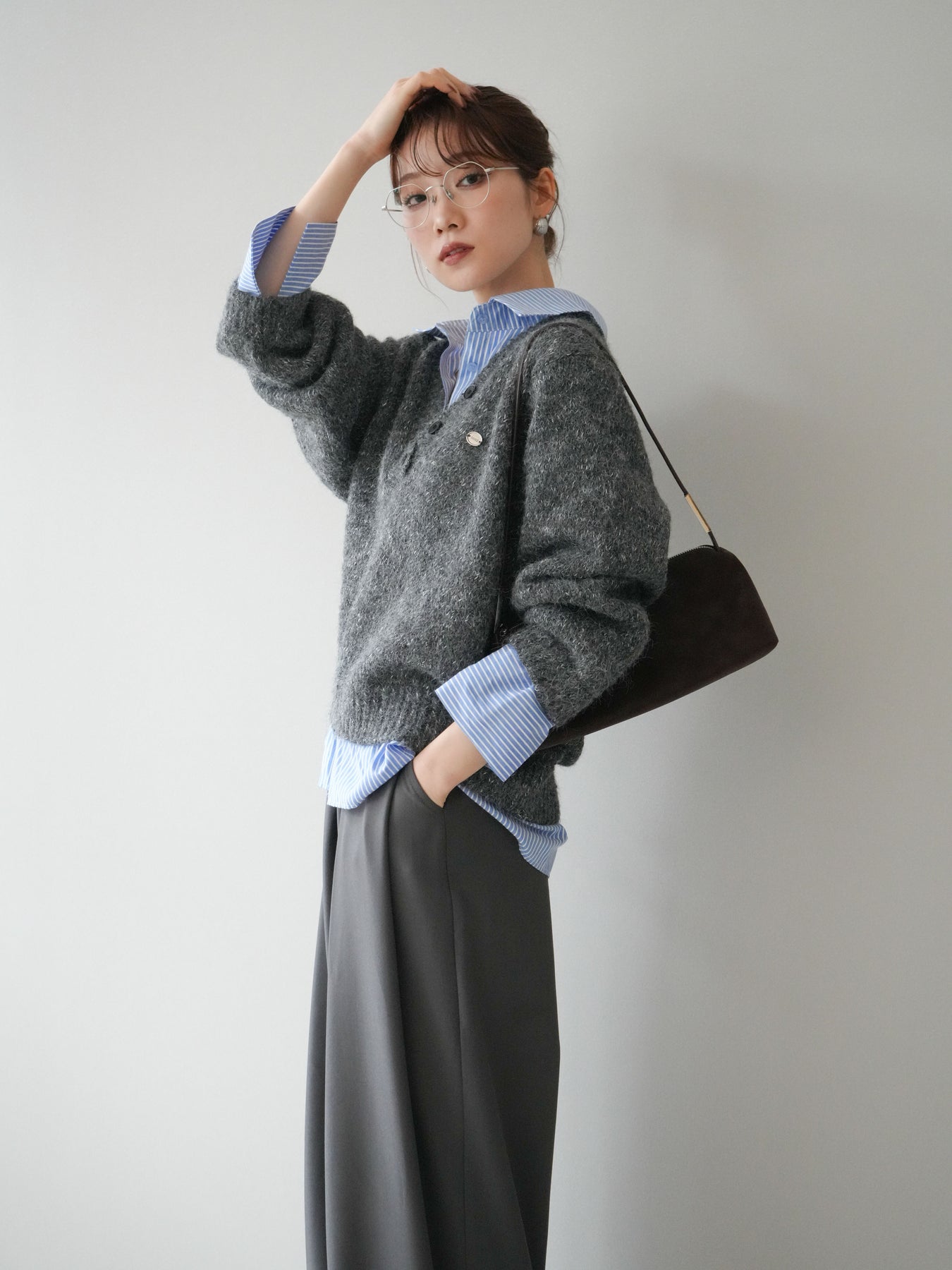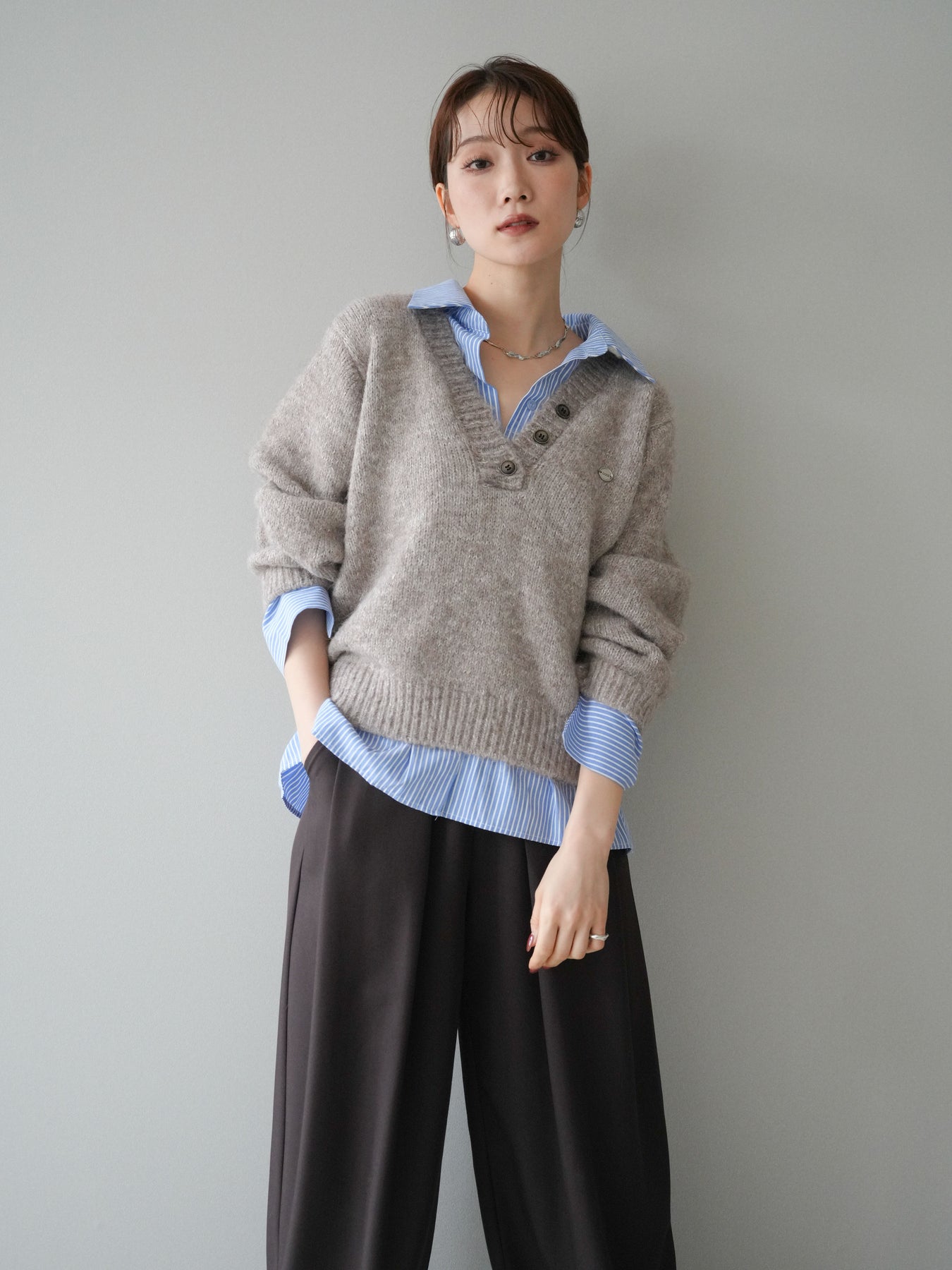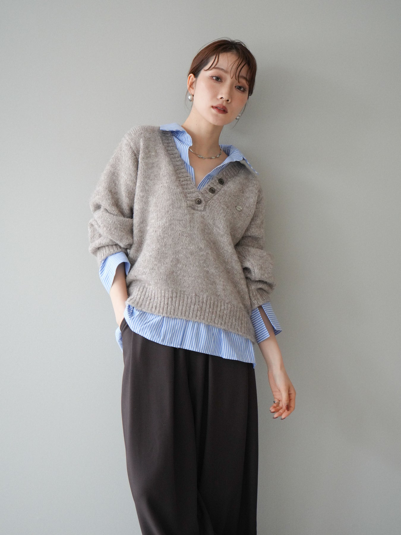 ストライプシャツをレイヤードしたようなデザインが魅力のドッキングニットプルオーバー。 表情豊かなミックスヤーン素材がシーズンムードを高め、着るだけでこなれた印象に仕上がります。 シャツの襟元や裾、袖口から覗くストライプがアクセントとなり、上品な抜け感を演出。 ゆったりとしたシルエットでリラックス感がありながらも、程よいきちんと感を兼ね備えています。 デニムやスカートなど、カジュアルからフェミニンまで幅広く着回せる万能トップスです。 ※ボトムス、キャミソール(インナー)以外の商品は一律でインナーは付属していません。