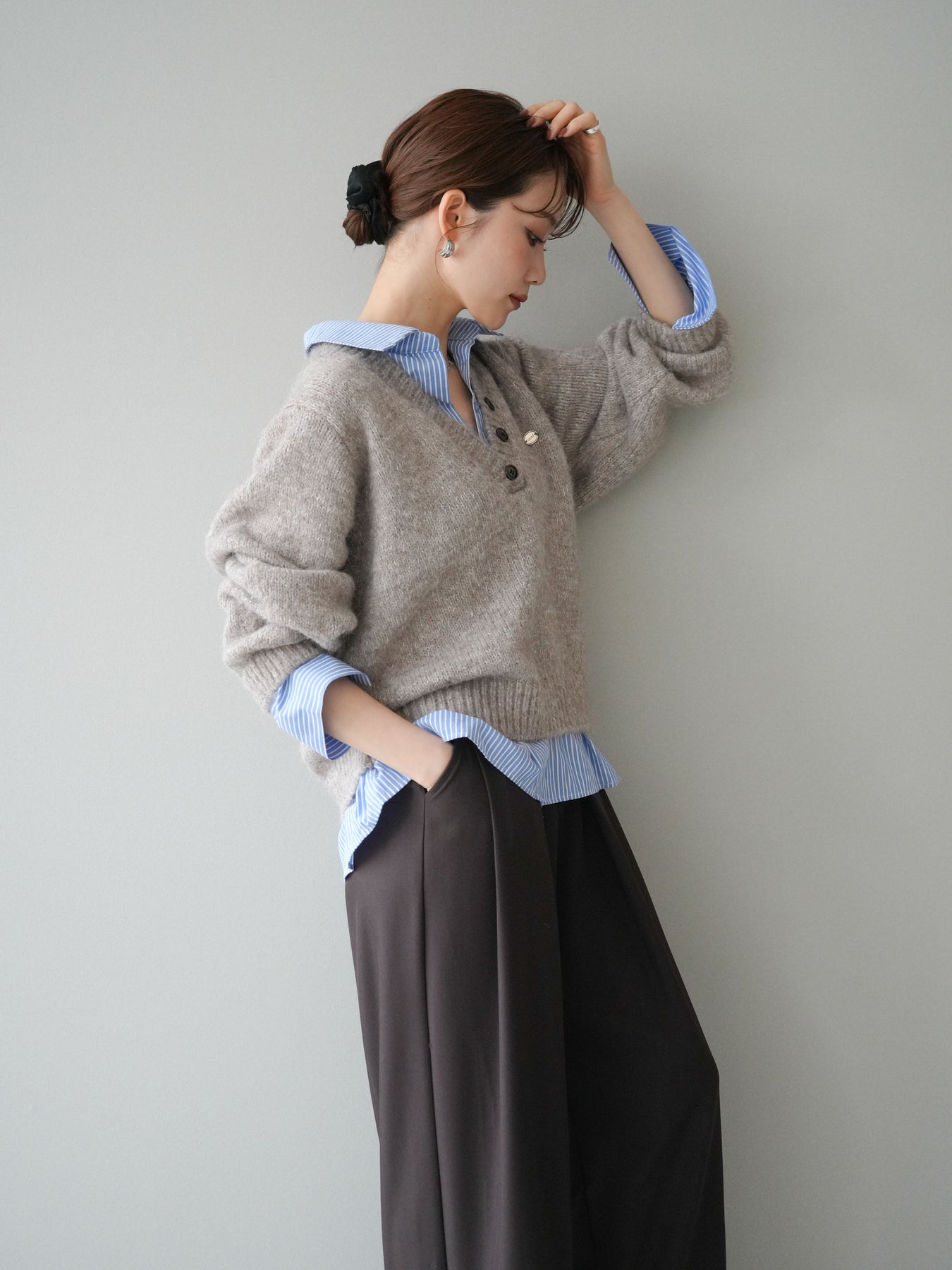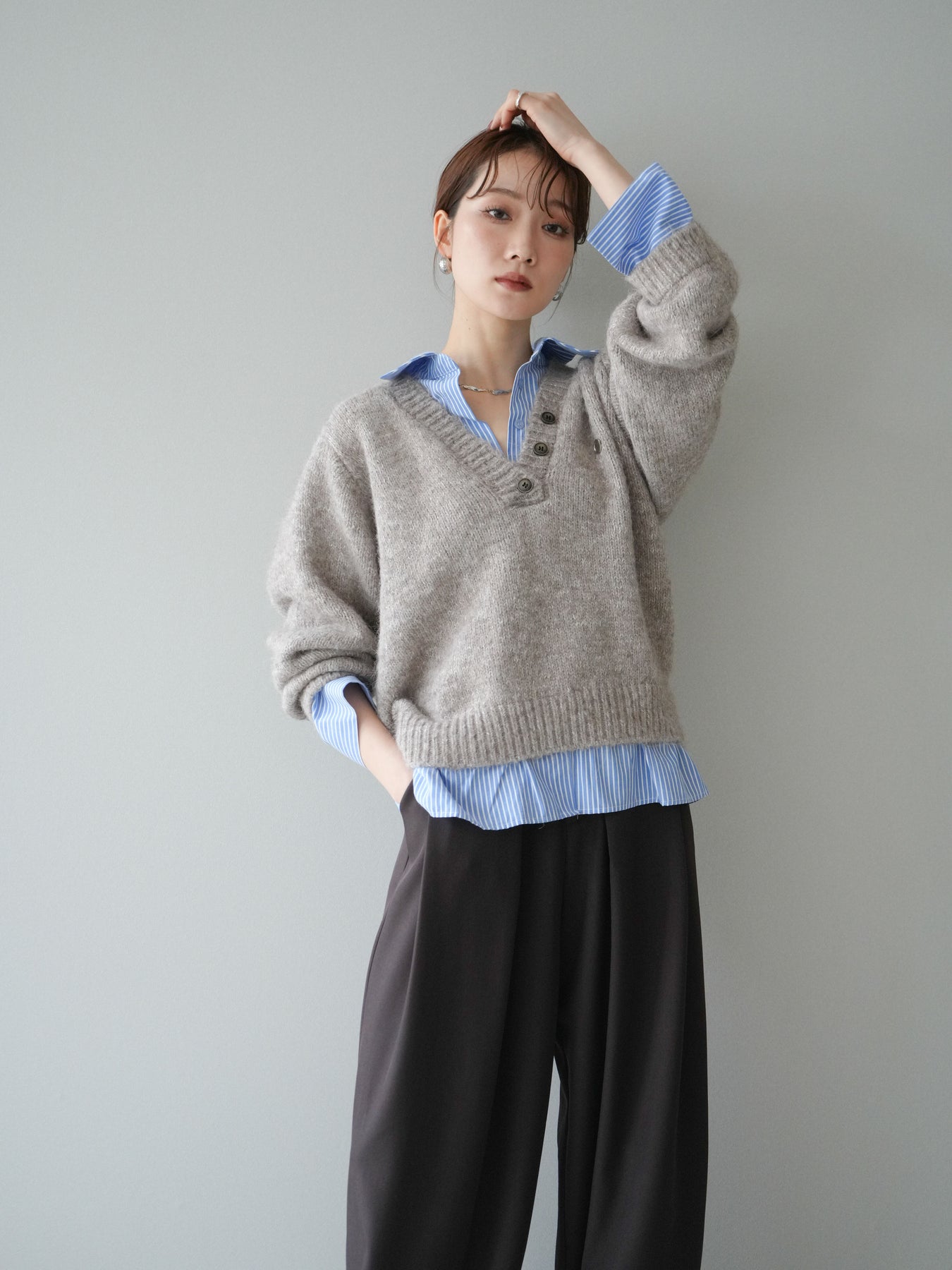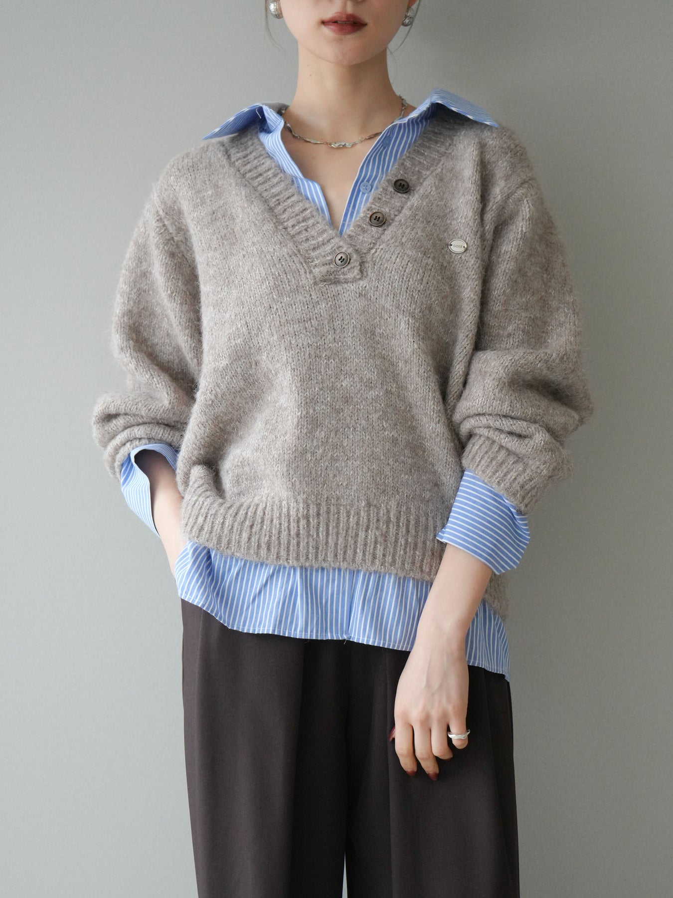 ◆ [予約]ストライプシャツドッキングMIXヤーンニットプルオーバー